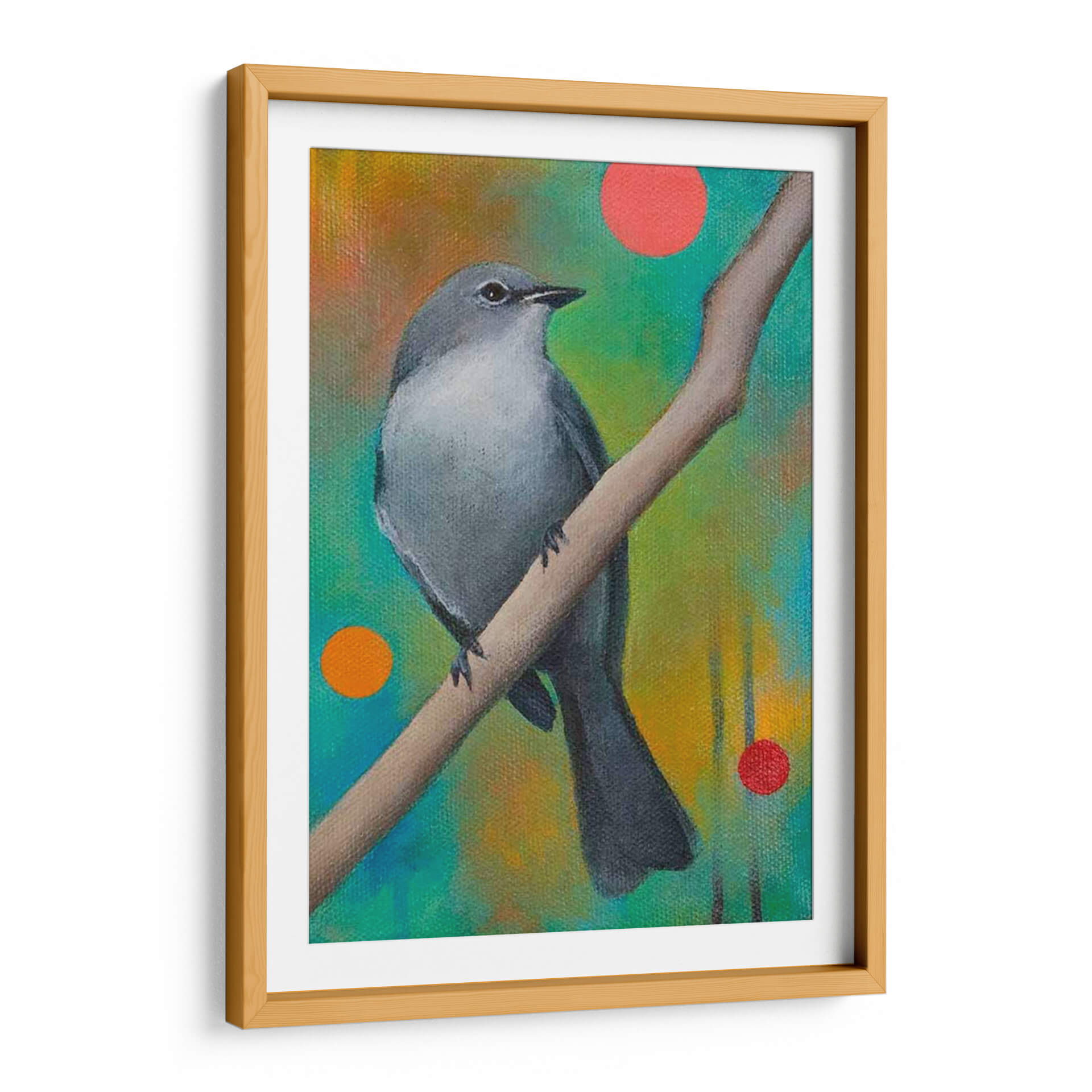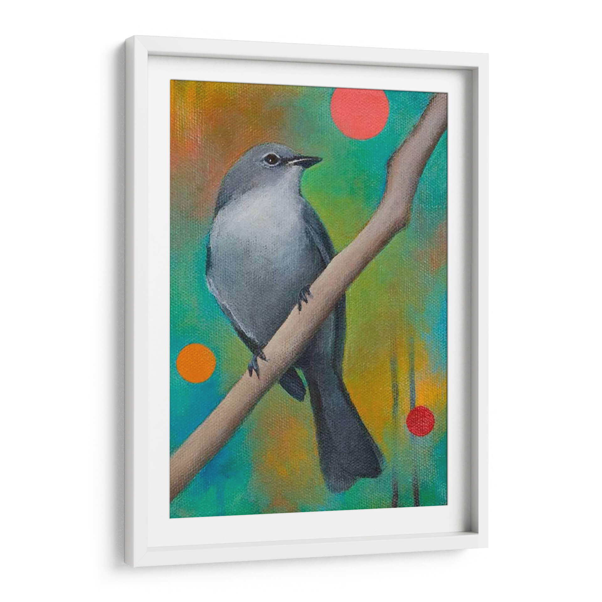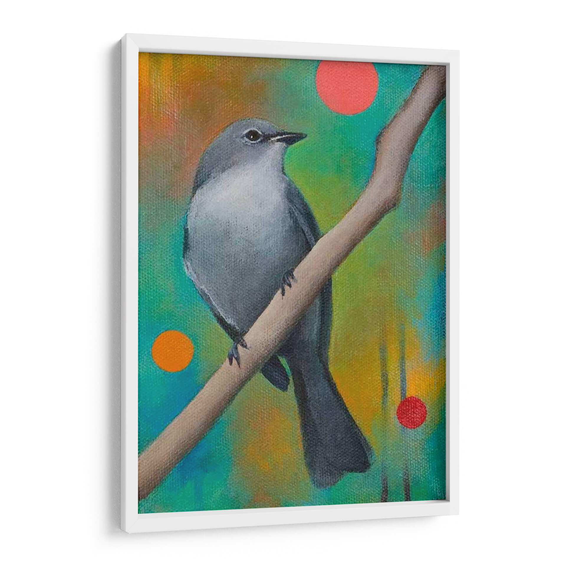 Sumérgete en la serenidad y el encanto de "Misterios Del Universo Xiv", una cautivadora obra de arte de Bridget G. Evans que captura la delicadeza de un ave posada en una rama. La vibrante paleta de colores, con un fondo que evoca la transición del día a la noche con tonos turquesas, verdes, naranjas y amarillos, crea una atmósfera etérea y enigmática. Los toques de color rojo y naranja en forma de círculos añaden un elemento lúdico y moderno a la composición. El ave, representada con trazos suaves y una paleta de grises y blancos, irradia calma y contemplación, convirtiéndose en el punto focal de la pieza. Este cuadro decorativo abstracto, con su estilo único y evocador, es perfecto para infundir paz y un toque de naturaleza estilizada en cualquier espacio de tu hogar u oficina. Ideal para salones modernos, dormitorios tranquilos o incluso como pieza de acento en una entrada. Transforma tu pared en una ventana a un universo de calma y belleza sutil con este impresionante cuadro de pájaro.