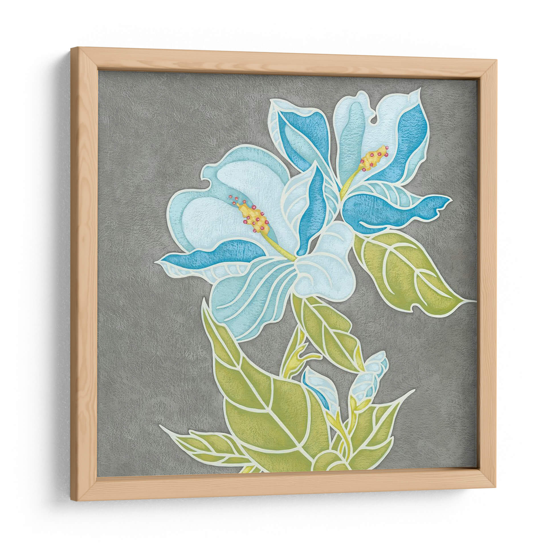 Embellece tu espacio con la serenidad de "Moonglow II", una obra de arte floral que captura la delicadeza de la naturaleza. Este cuadro decorativo presenta un par de flores en tonos celestes y azules profundos, con pétalos suavemente definidos y estambres amarillos vibrantes que aportan un toque de luz. Las hojas verde claro, contorneadas con finas líneas blancas, añaden un contraste orgánico y fresco al fondo texturizado en gris. La composición, centrada en la belleza efímera de la floración, evoca una sensación de calma y contemplación, ideal para crear un ambiente pacífico en tu dormitorio, sala de estar o estudio. El estilo distintivo de Chariklia Zarris se manifiesta en la forma en que las formas florales parecen casi esculpidas, añadiendo una dimensión táctil a la pieza visual. "Moonglow II" es más que una simple decoración; es una invitación a la introspección y a la apreciación de los detalles sutiles de la vida, transformando cualquier pared en un oasis de tranquilidad y elegancia contemporánea. Añade esta pieza única a tu colección y deja que su suave resplandor ilumine tu hogar.
