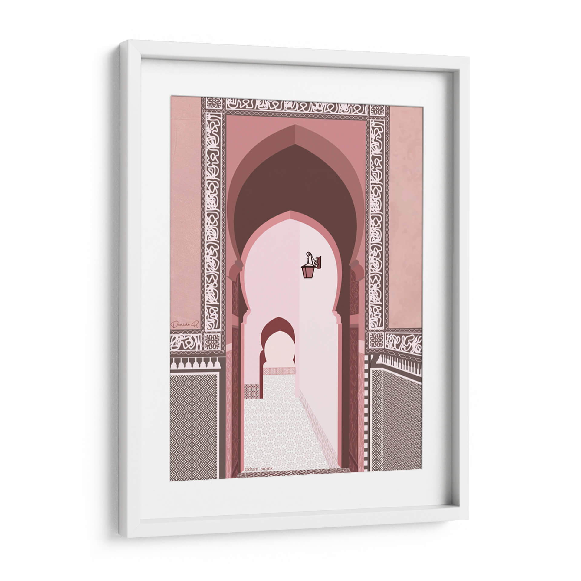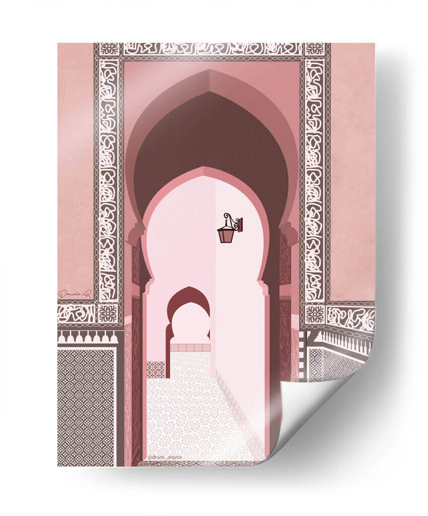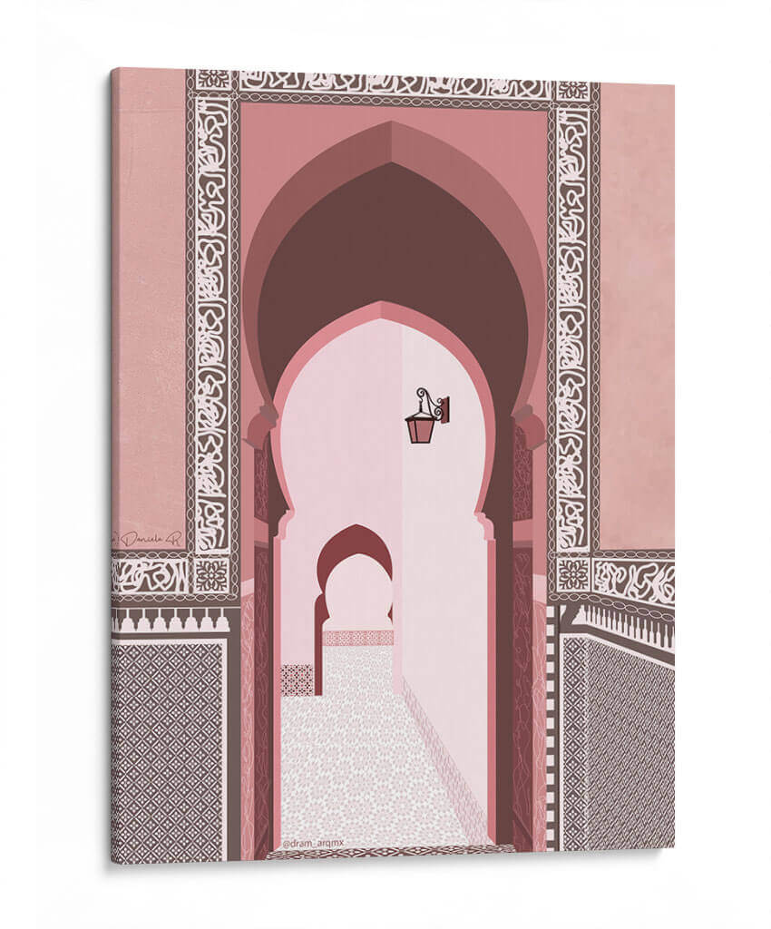 Transporta tus sentidos al corazón de Marruecos con este cautivador cuadro decorativo, 'Morocco' de DRAM. Esta obra de arte digital captura la esencia de la arquitectura marroquí con sus icónicos arcos de herradura y patrones intrincados que adornan las paredes. La paleta de colores, dominada por tonos rosados, terracota y marrones cálidos, crea una atmósfera serena y exótica, evocando la calidez del sol del desierto y la riqueza cultural de la región. La perspectiva nos invita a adentrarnos en un pasaje tradicional, donde la luz tenue y los detalles arquitectónicos crean una sensación de profundidad y misterio. Cada elemento, desde los mosaicos geométricos hasta la lámpara antigua suspendida, está representado con un estilo limpio y moderno, fusionando lo clásico con lo contemporáneo. Este cuadro decorativo es ideal para añadir un toque de sofisticación y un aire de escapada a cualquier espacio, ya sea una sala de estar, un dormitorio o un estudio. Su diseño evocador y su paleta de colores armoniosa lo convierten en una pieza de conversación perfecta para quienes aprecian la belleza del diseño islámico y los paisajes culturales.