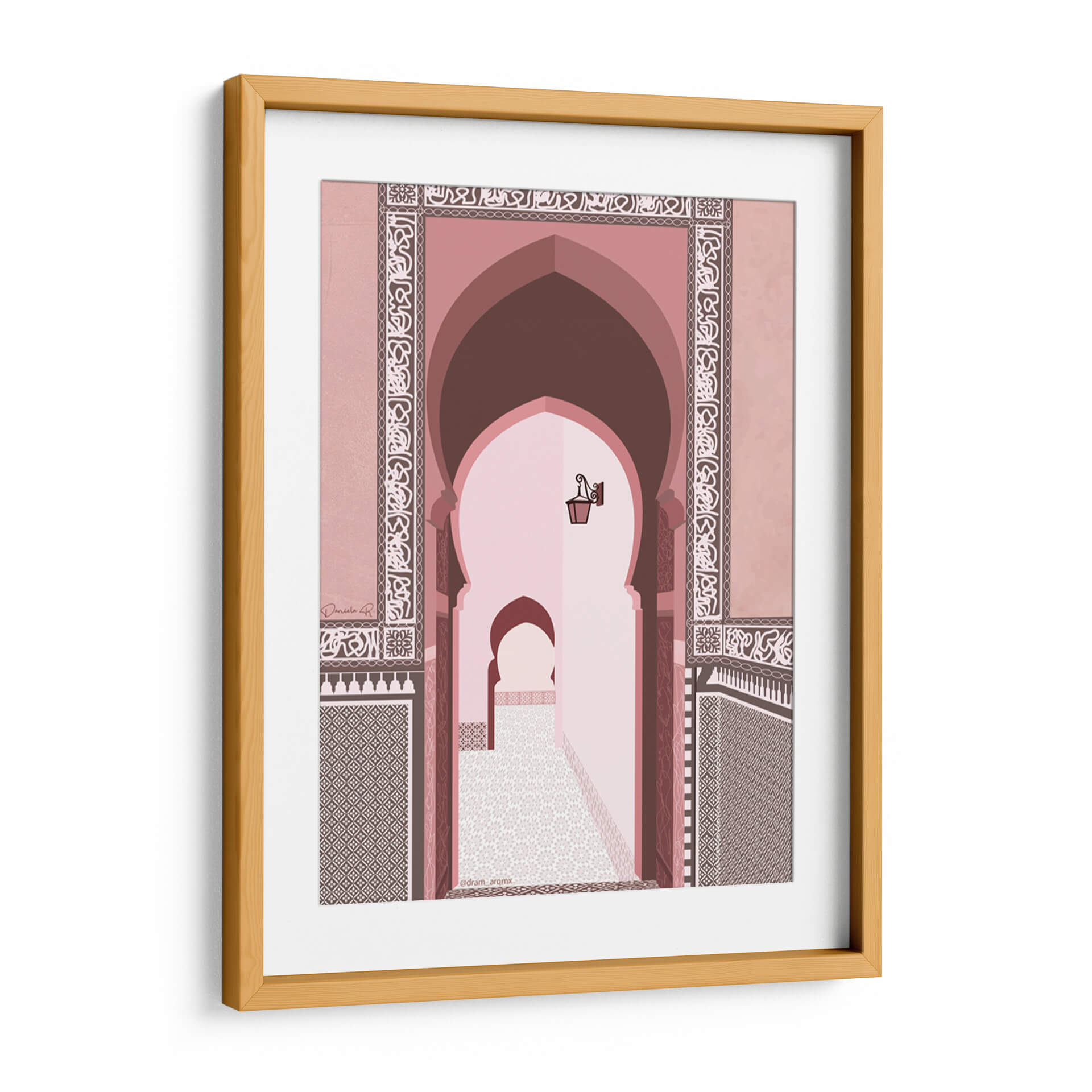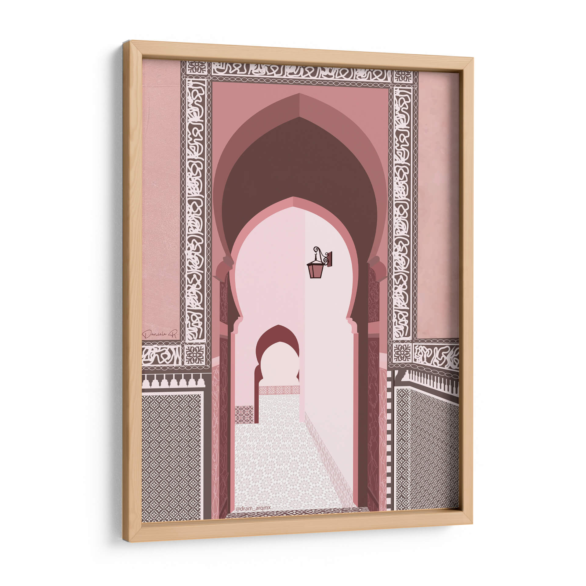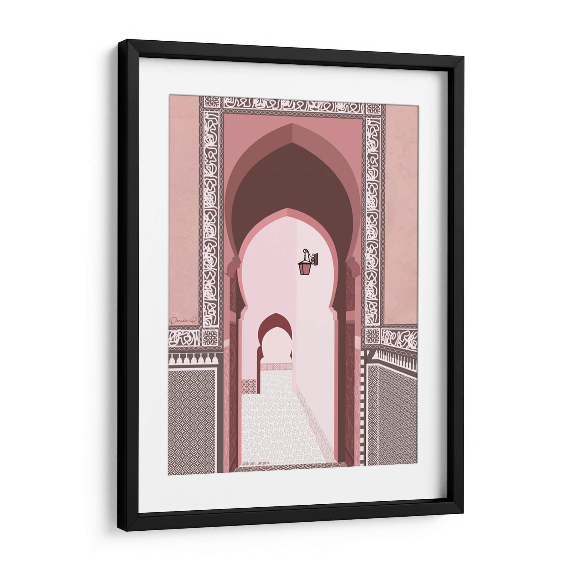 Transporta tus sentidos al corazón de Marruecos con este cautivador cuadro decorativo, 'Morocco' de DRAM. Esta obra de arte digital captura la esencia de la arquitectura marroquí con sus icónicos arcos de herradura y patrones intrincados que adornan las paredes. La paleta de colores, dominada por tonos rosados, terracota y marrones cálidos, crea una atmósfera serena y exótica, evocando la calidez del sol del desierto y la riqueza cultural de la región. La perspectiva nos invita a adentrarnos en un pasaje tradicional, donde la luz tenue y los detalles arquitectónicos crean una sensación de profundidad y misterio. Cada elemento, desde los mosaicos geométricos hasta la lámpara antigua suspendida, está representado con un estilo limpio y moderno, fusionando lo clásico con lo contemporáneo. Este cuadro decorativo es ideal para añadir un toque de sofisticación y un aire de escapada a cualquier espacio, ya sea una sala de estar, un dormitorio o un estudio. Su diseño evocador y su paleta de colores armoniosa lo convierten en una pieza de conversación perfecta para quienes aprecian la belleza del diseño islámico y los paisajes culturales.