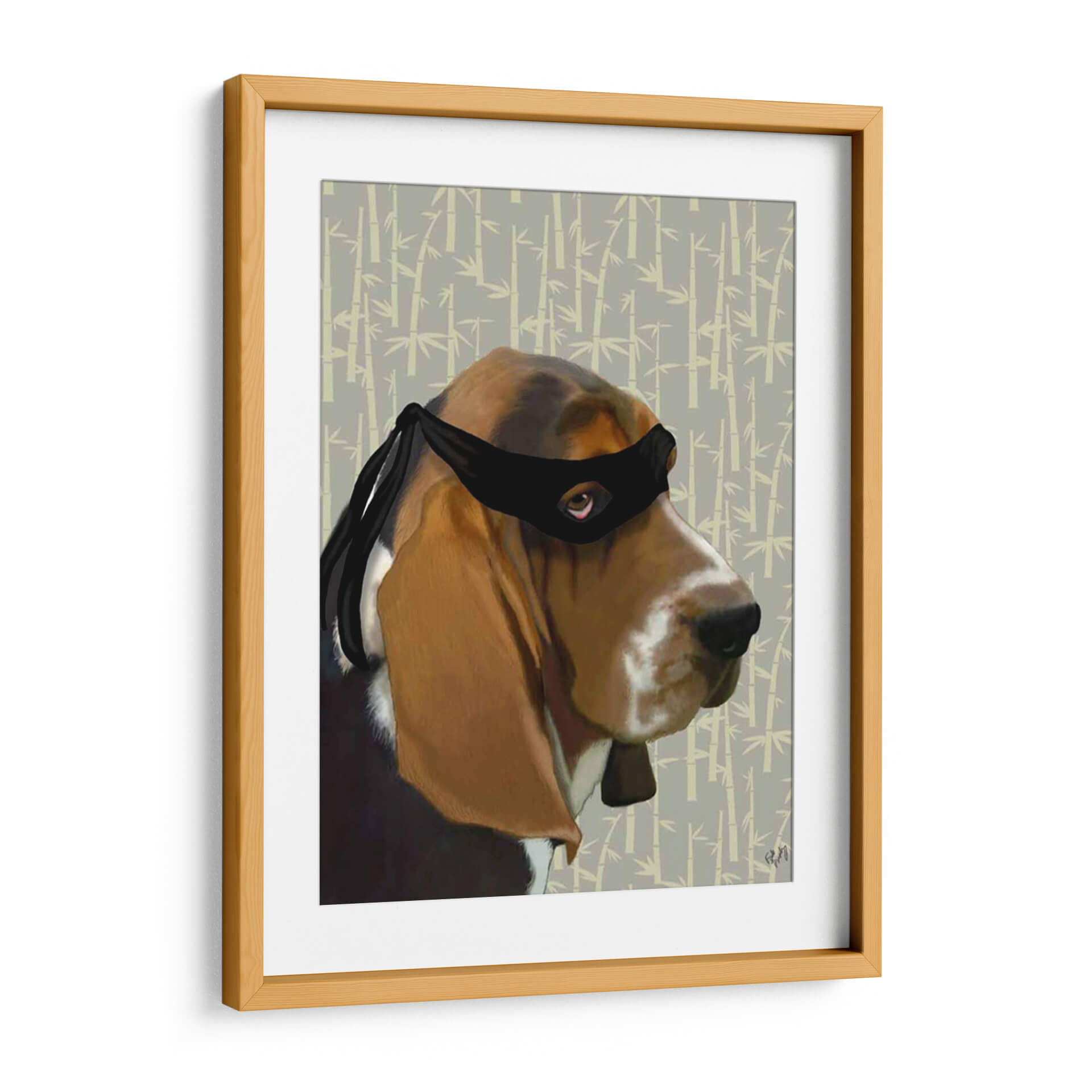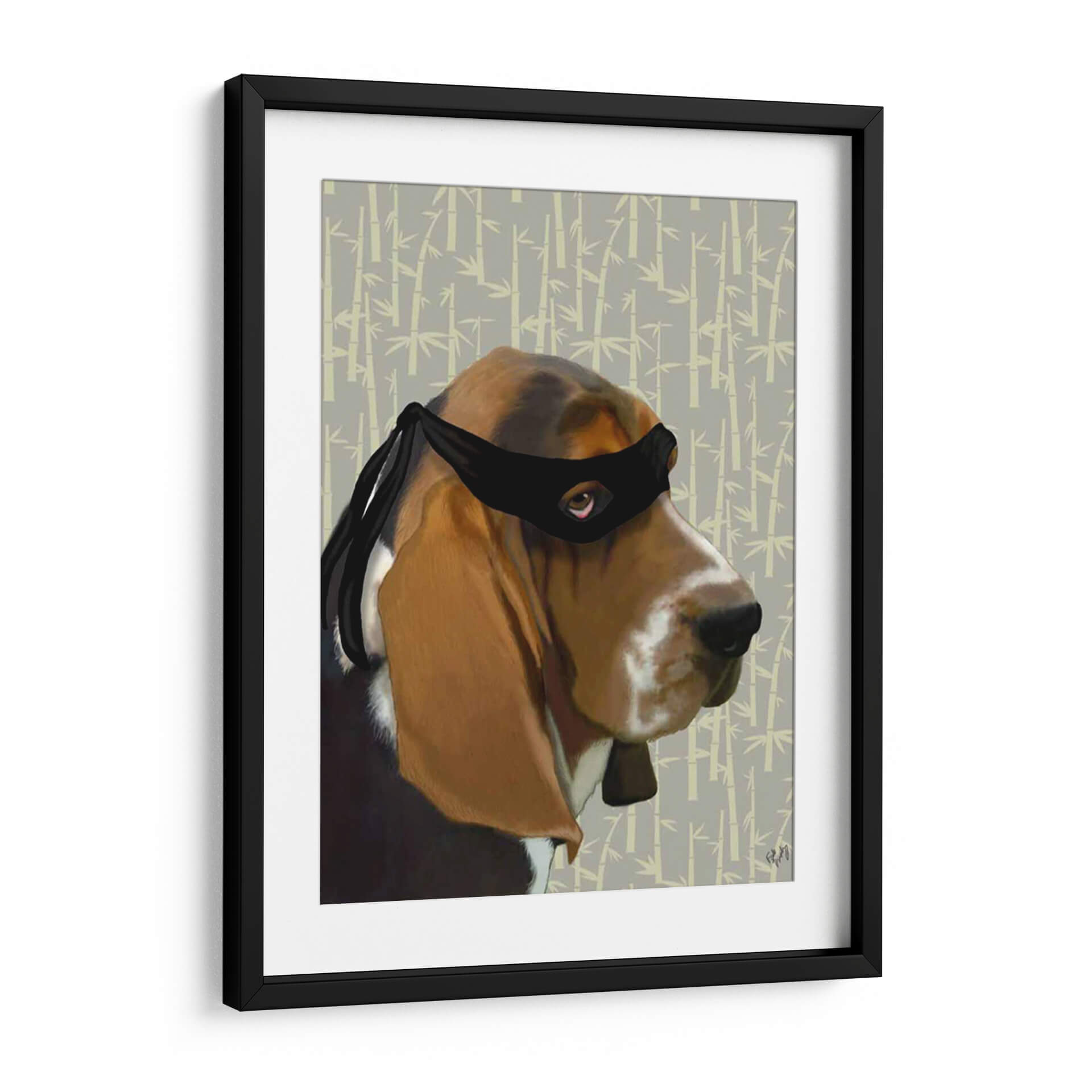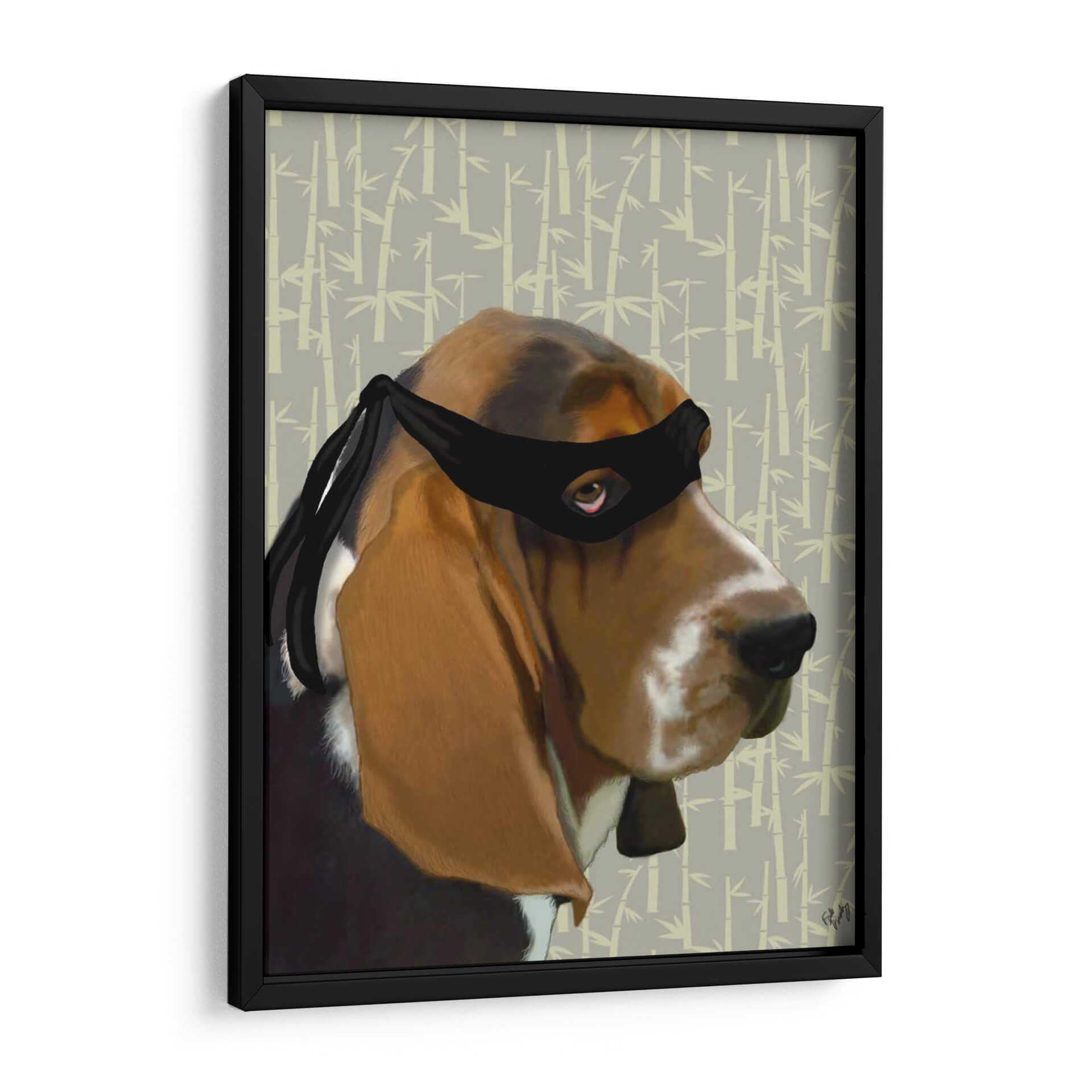 Inyecta un toque de humor y carácter a tu espacio con "Ninja Basset Hound Dog", una obra de arte digital cautivadora del artista Fab Funky. Esta pieza presenta un entrañable Basset Hound ataviado con una máscara de ninja, creando una yuxtaposición inesperada y encantadora. El fondo sutil, con un patrón repetitivo de bambú en tonos grises y beige, complementa a la perfección la figura del perro, aportando una sensación de calma y orden oriental. La expresión del perro, con su mirada penetrante a través de la máscara, añade un aire de misterio y picardía. Los colores cálidos y terrosos del pelaje del perro contrastan maravillosamente con la paleta más fría del fondo, logrando un equilibrio visual armonioso. Este cuadro decorativo es perfecto para los amantes de los perros, los entusiastas de la cultura pop o cualquiera que busque una pieza de conversación única y divertida. Ideal para añadir personalidad a salas de estar, oficinas o incluso habitaciones infantiles, "Ninja Basset Hound Dog" es una elección vibrante y memorable para quienes aprecian el arte contemporáneo con un toque de originalidad. Transforma tus paredes con esta obra que combina la ternura canina con la intriga de un ninja.