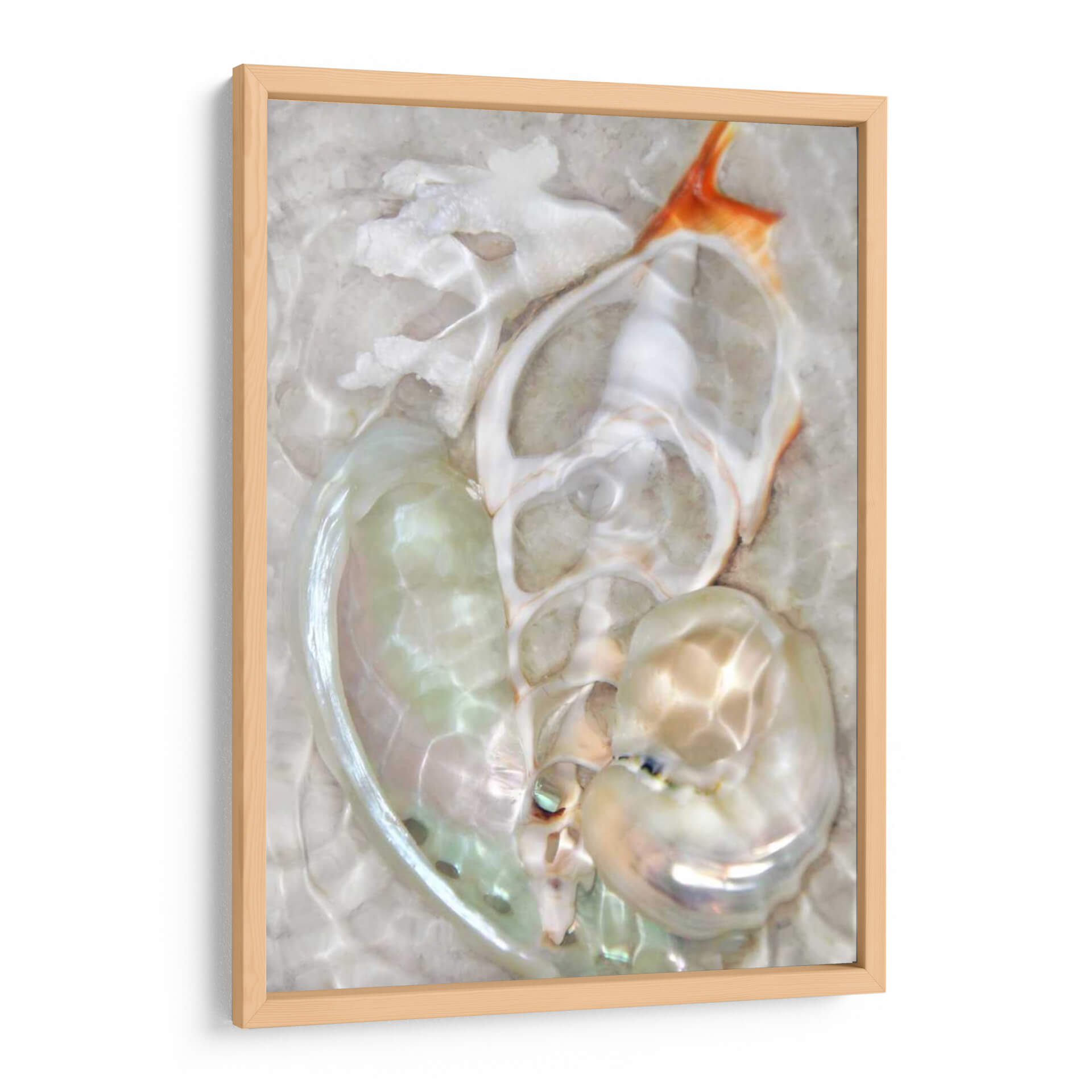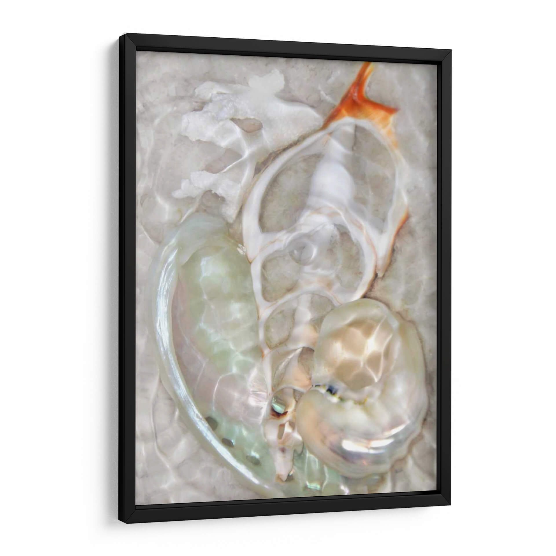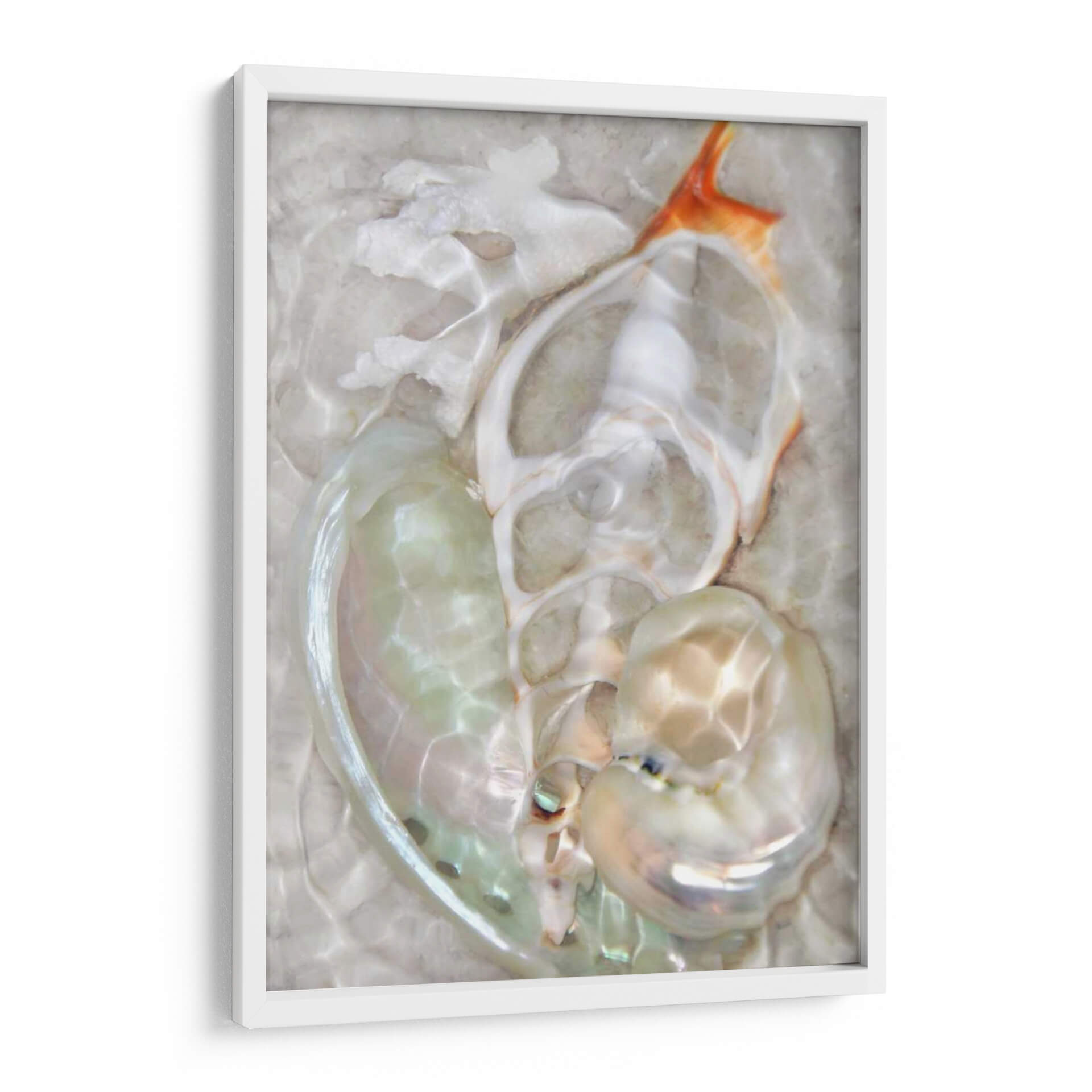 Sumérgete en la serena belleza de 'Ondas Ligeras Submarinas VIII', una obra de arte de Leda Robertson que captura la delicadeza y el misterio del mundo acuático. Esta pieza abstracta evoca la sensación de movimiento suave y las formas fluidas que se encuentran bajo la superficie del mar. La paleta de colores, dominada por tonos nacarados, blancos cremosos y sutiles toques de coral anaranjado, crea una atmósfera de calma y elegancia. Las formas orgánicas y translúcidas invitan a la contemplación, sugiriendo la presencia de conchas marinas o formaciones coralinas vistas a través del agua. La composición juega con la luz y la sombra, creando reflejos y refracciones que añaden profundidad y dinamismo a la pieza. Este cuadro decorativo es ideal para espacios que buscan transmitir tranquilidad y sofisticación, como dormitorios, baños o salones de estilo contemporáneo. Añade un toque de serenidad natural a tu hogar con esta evocadora obra de arte que te transportará a las profundidades pacíficas del océano.