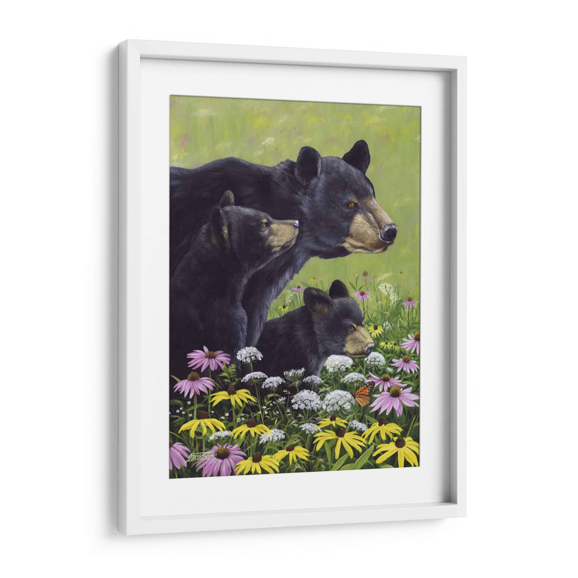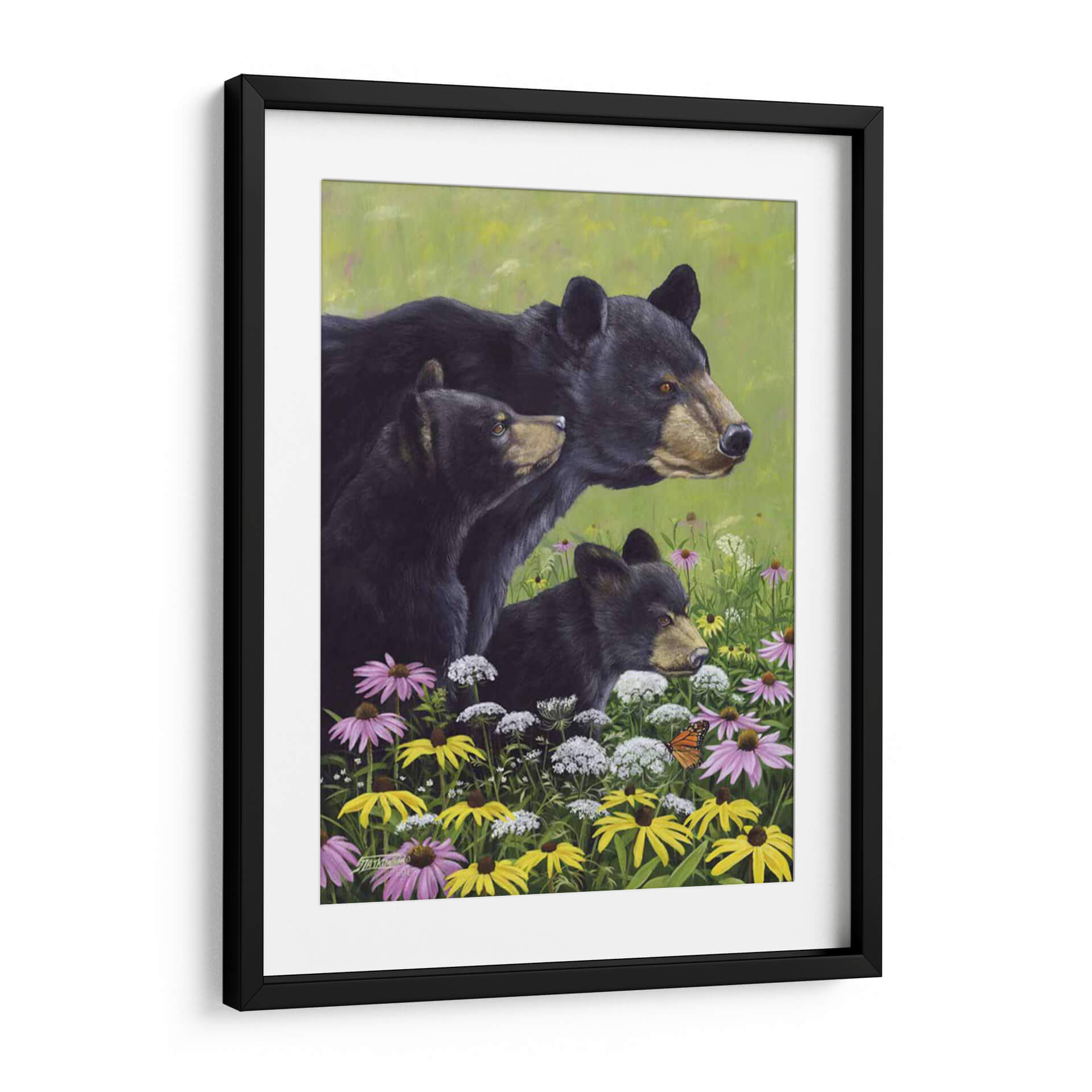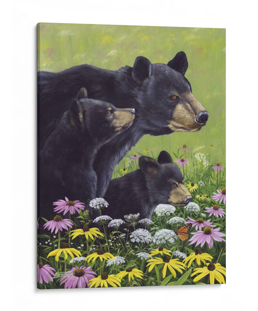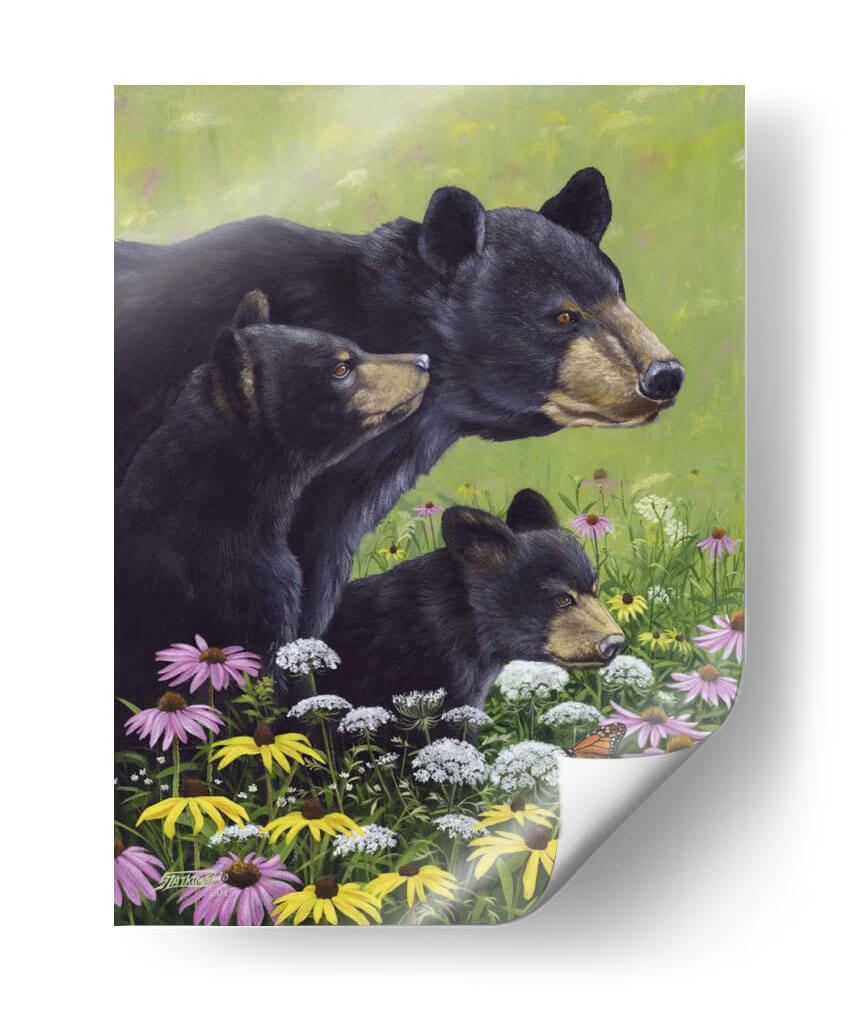 Sumérgete en la serenidad de la naturaleza con este cautivador cuadro decorativo "Osos Negros" del artista Fred Szatkowski. La obra presenta una tierna escena familiar de osos negros emergiendo de un vibrante campo de flores silvestres, pintado con un estilo realista y detallado que captura la esencia de la vida salvaje. La paleta de colores, dominada por verdes exuberantes y salpicada de flores en tonos violeta, amarillo y blanco, crea una atmósfera de paz y armonía natural. La composición, centrada en la mirada atenta de los osos, evoca sentimientos de protección, curiosidad y conexión con el entorno. Este cuadro es ideal para añadir un toque de calidez y belleza natural a cualquier hogar u oficina, convirtiéndose en un punto focal que inspira tranquilidad y admiración por la fauna. Perfecto para amantes de la naturaleza y aquellos que buscan arte con alma.