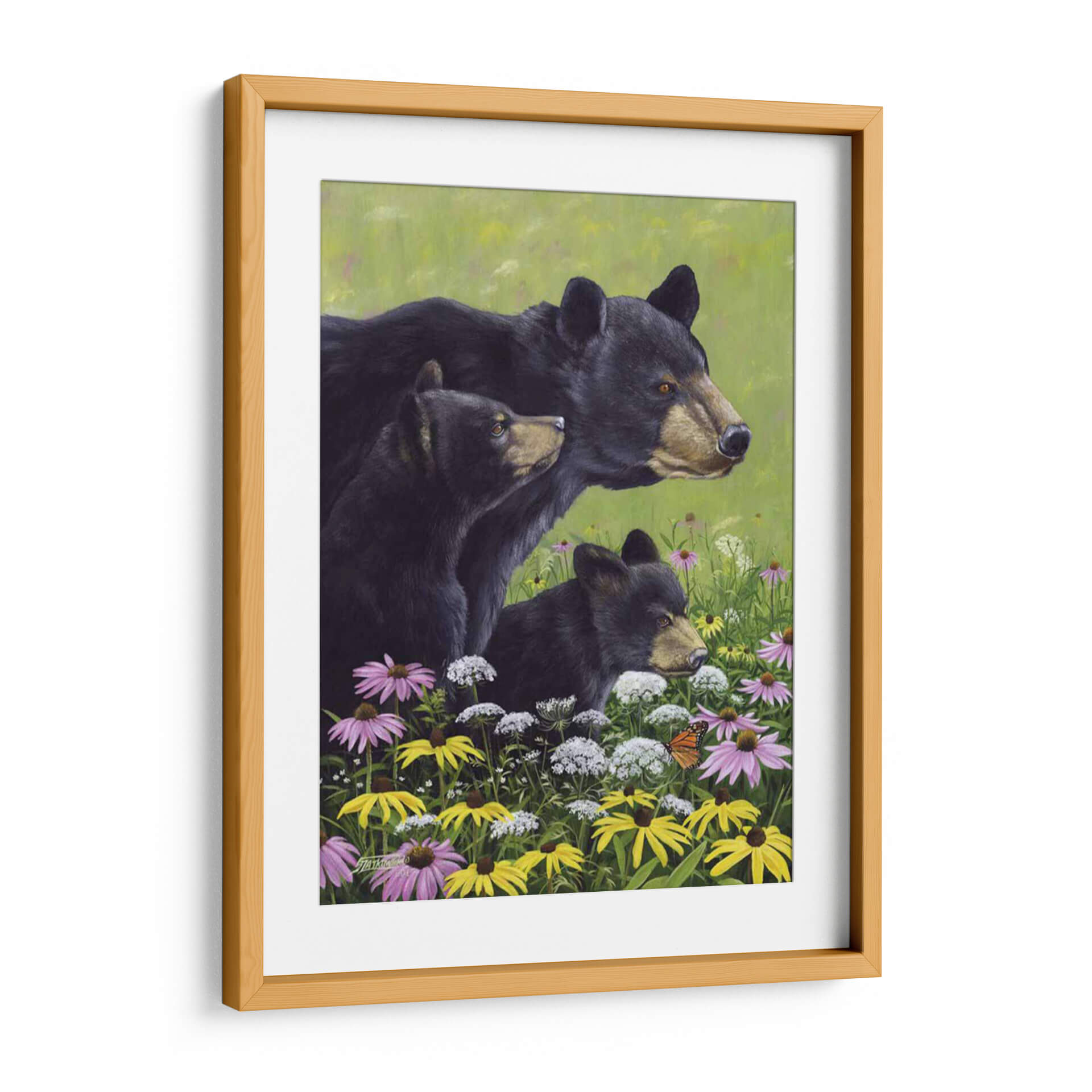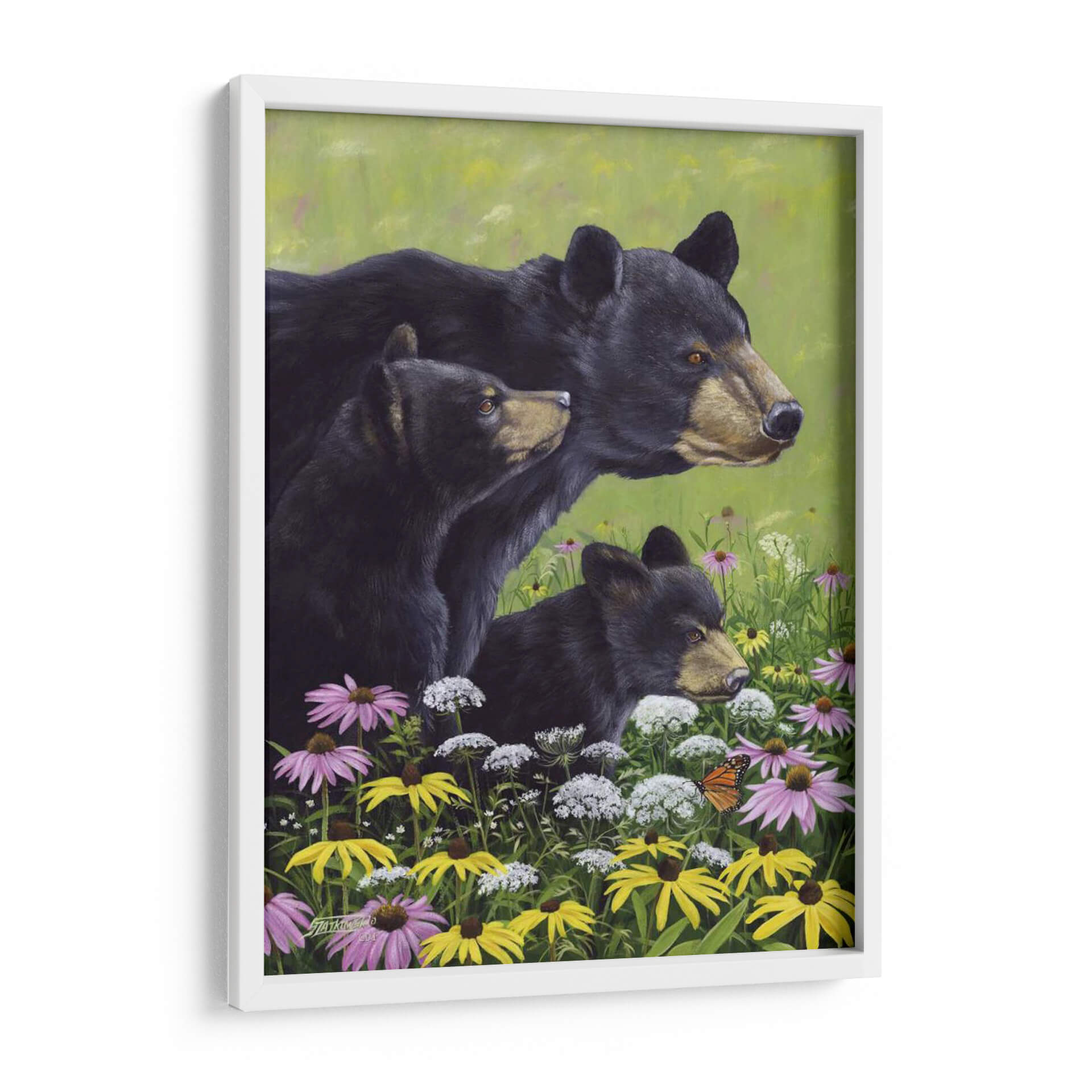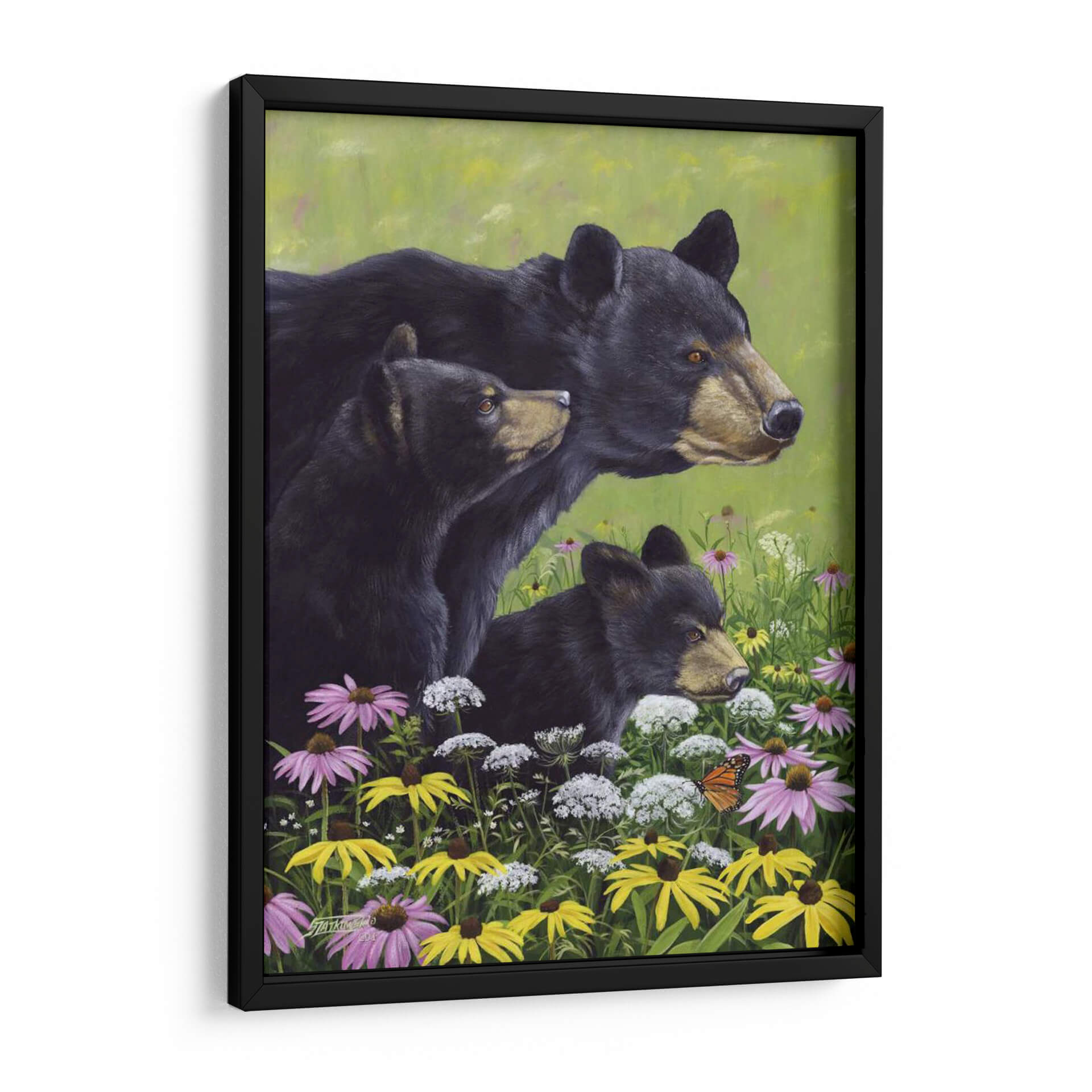 Sumérgete en la serenidad de la naturaleza con este cautivador cuadro decorativo "Osos Negros" del artista Fred Szatkowski. La obra presenta una tierna escena familiar de osos negros emergiendo de un vibrante campo de flores silvestres, pintado con un estilo realista y detallado que captura la esencia de la vida salvaje. La paleta de colores, dominada por verdes exuberantes y salpicada de flores en tonos violeta, amarillo y blanco, crea una atmósfera de paz y armonía natural. La composición, centrada en la mirada atenta de los osos, evoca sentimientos de protección, curiosidad y conexión con el entorno. Este cuadro es ideal para añadir un toque de calidez y belleza natural a cualquier hogar u oficina, convirtiéndose en un punto focal que inspira tranquilidad y admiración por la fauna. Perfecto para amantes de la naturaleza y aquellos que buscan arte con alma.