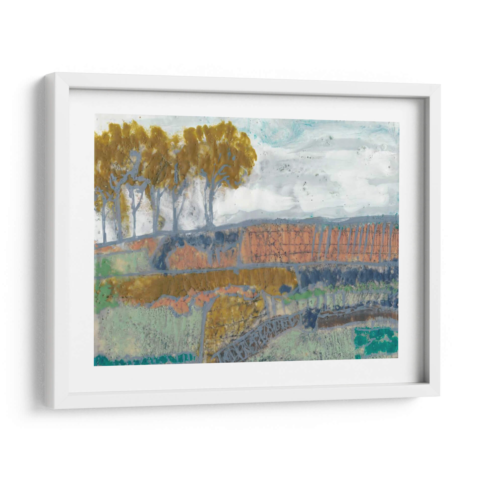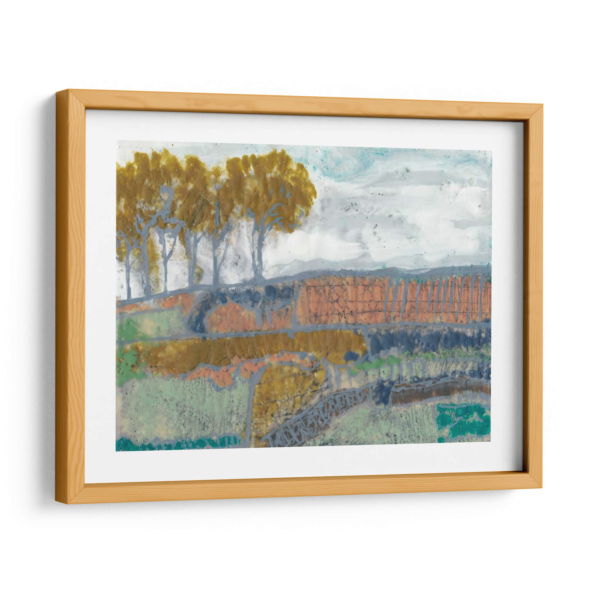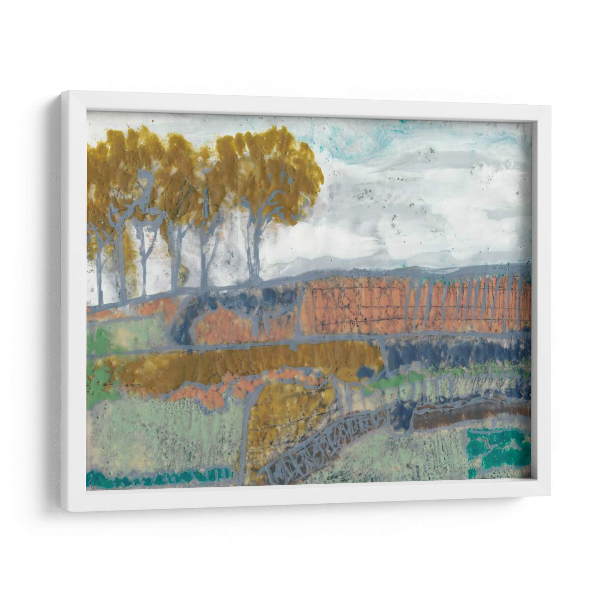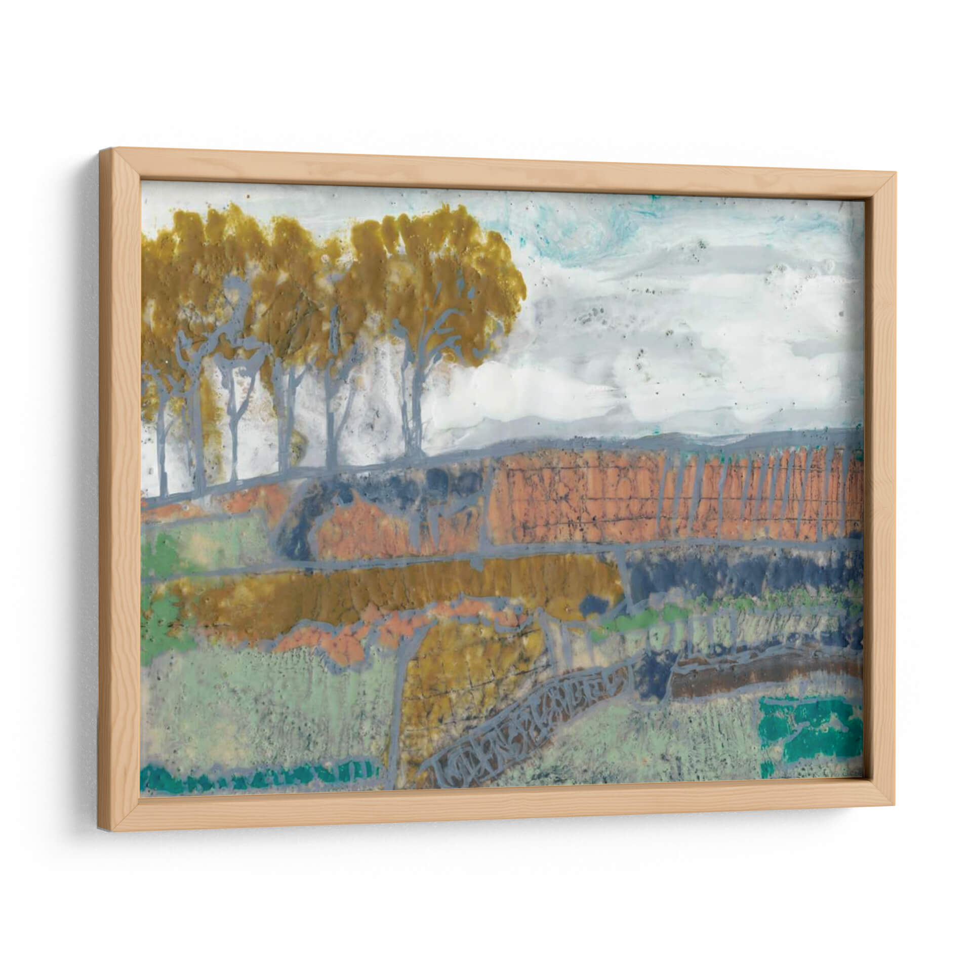 Sumérgete en la evocadora obra de arte 'Paisaje De Remiendo I' de Jennifer Goldberger, una pieza que captura la esencia de la naturaleza con un toque abstracto y moderno. Los tonos tierra, verdes musgo y toques de naranja y azul se entrelazan para crear una composición rica y texturizada que evoca la serenidad de un campo otoñal o un paisaje rural. La técnica mixta utilizada por la artista añade profundidad y un carácter único, invitando a la contemplación y al descubrimiento de nuevos detalles en cada mirada. Las siluetas estilizadas de árboles se alzan sobre un terreno escalonado, creando un ritmo visual cautivador. Este cuadro decorativo es perfecto para añadir un toque de sofisticación y calidez a cualquier espacio, ya sea una sala de estar, un comedor o una oficina. Su estilo abstracto contemporáneo lo convierte en un punto focal ideal para interiores modernos, rústicos o eclécticos, aportando una atmósfera de calma y conexión con la naturaleza. Descubre la belleza sutil y la profundidad emocional de 'Paisaje De Remiendo I', una obra que transformará tu hogar en una galería de arte personal.