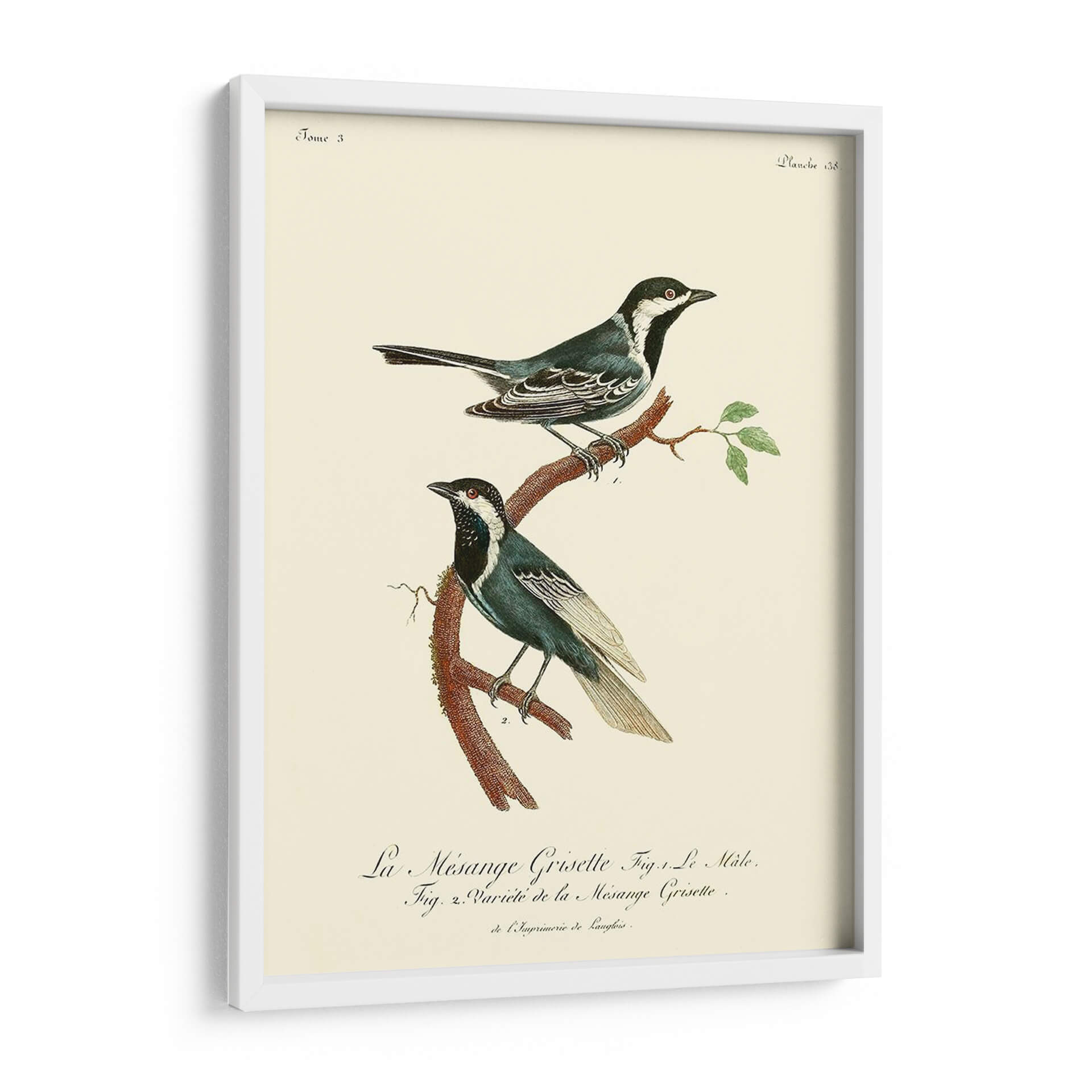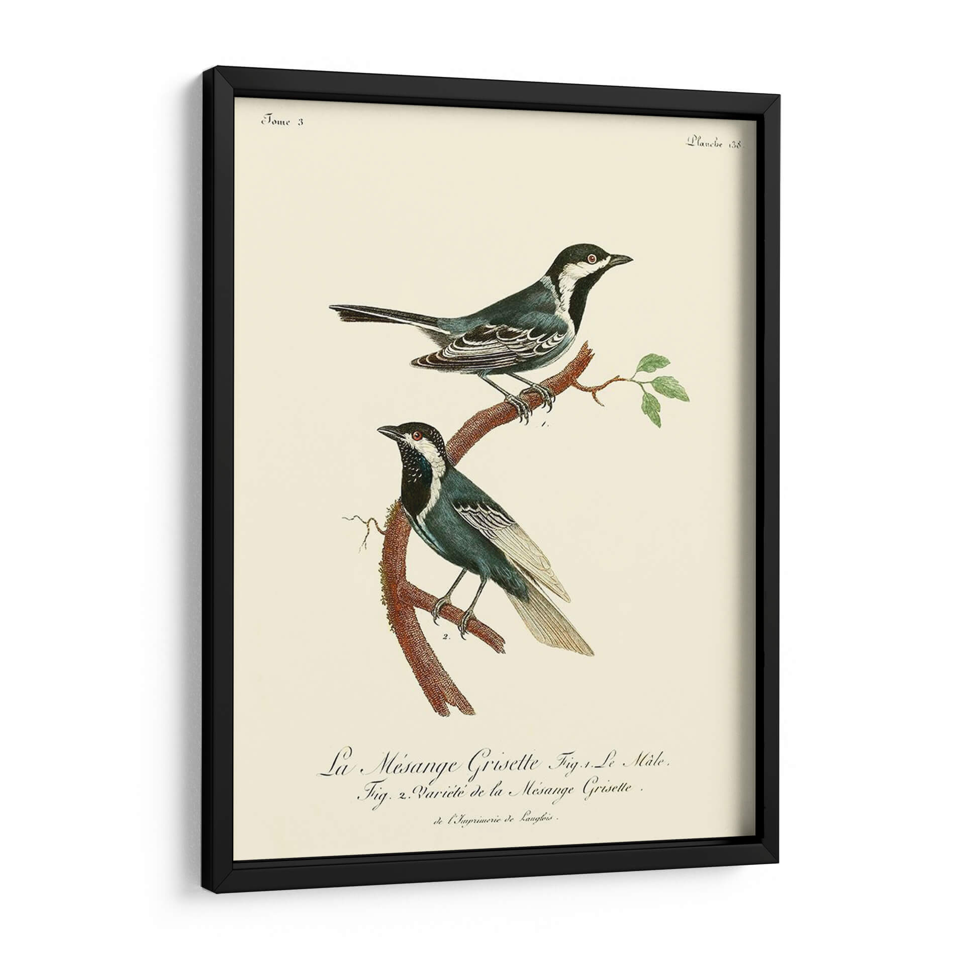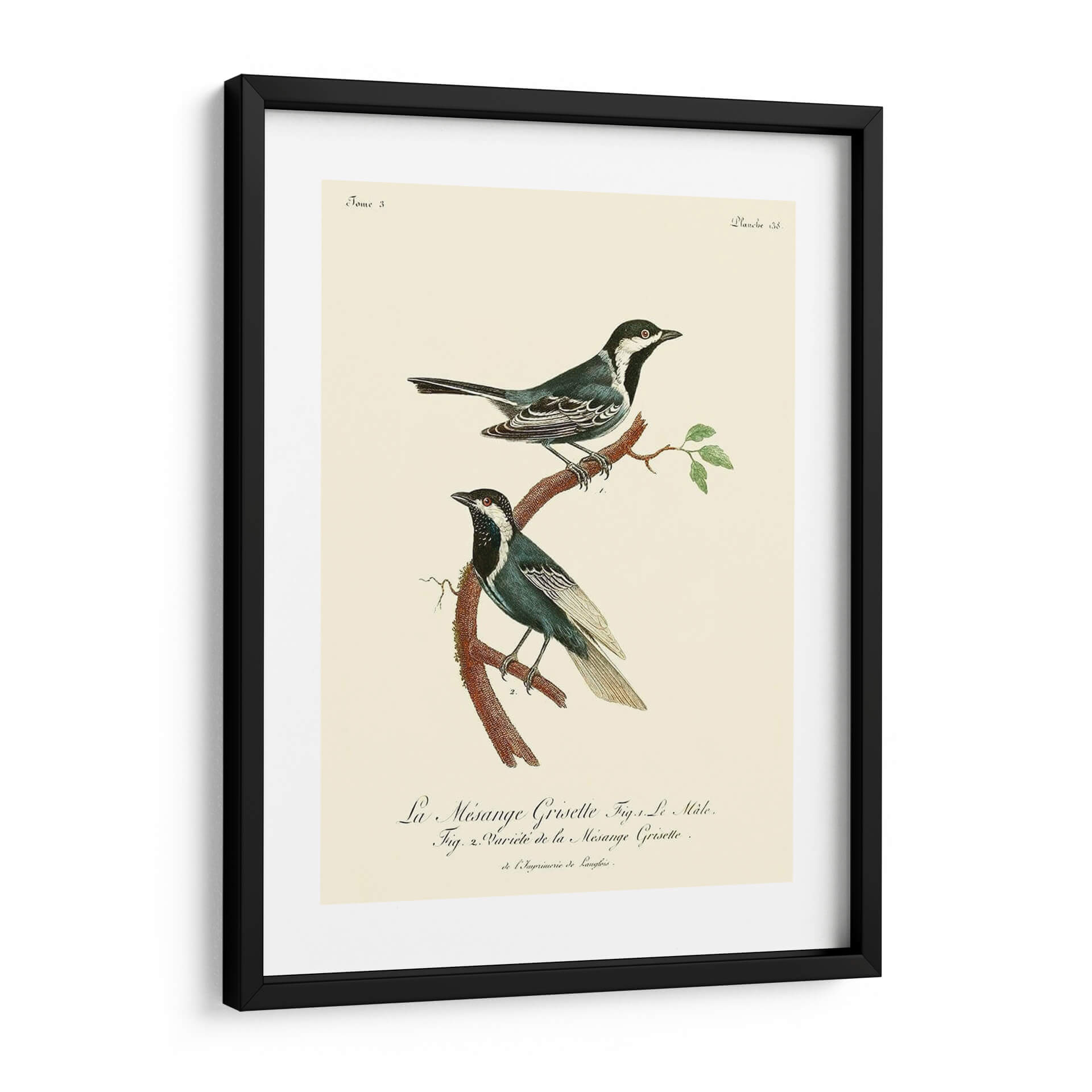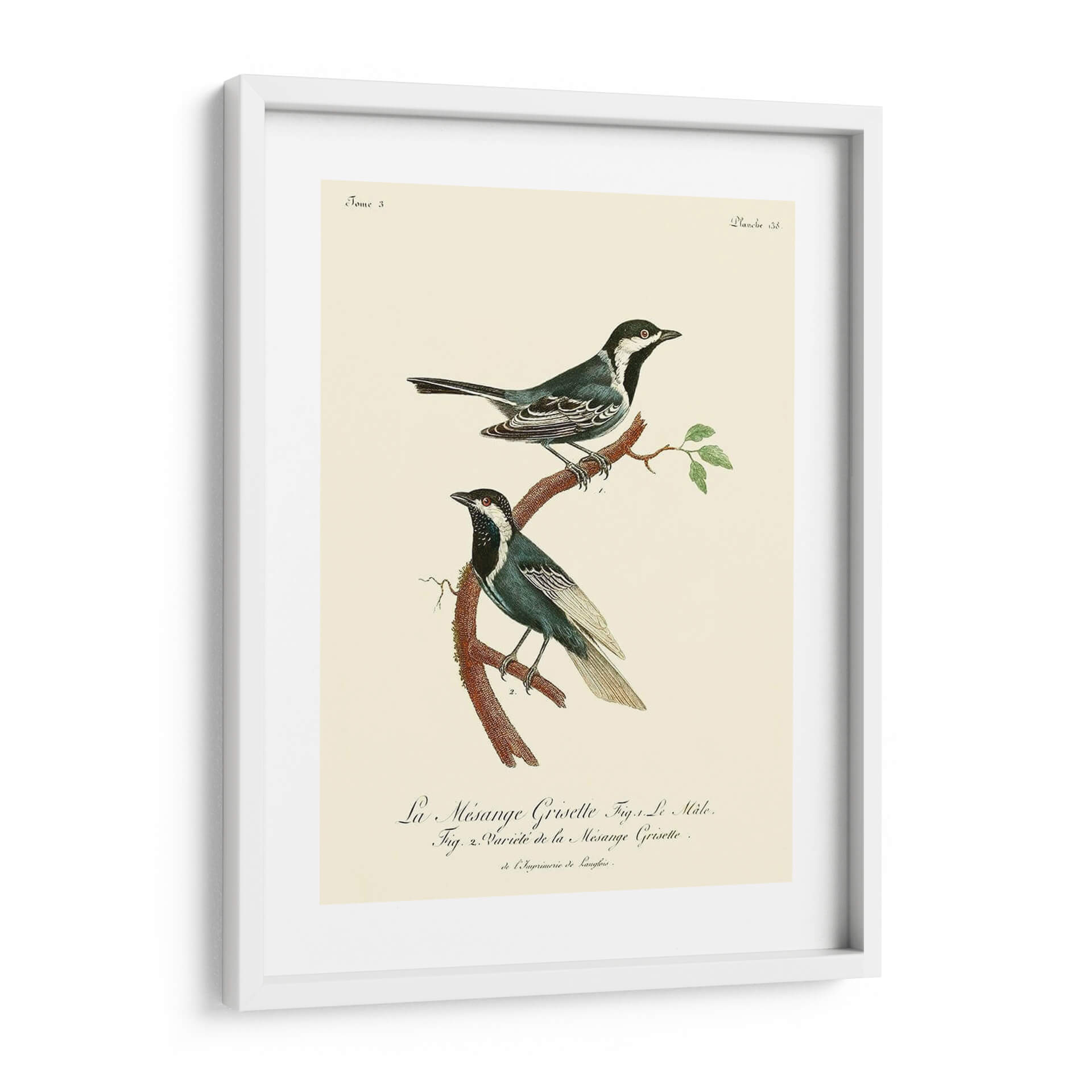 Este encantador cuadro decorativo de pájaros, titulado 'Pájaros Franceses Vintage III' por el artista de Langlois, captura la belleza atemporal de la ornitología con un estilo que evoca la elegancia clásica. La obra presenta dos aves detalladamente ilustradas posadas en una rama rústica, con un fondo de color crema que resalta sus plumajes en tonos azules, blancos y negros. Los sutiles toques de rojo en sus ojos añaden un punto de interés vibrante. La composición es delicada y equilibrada, perfecta para añadir un toque de sofisticación natural a cualquier espacio. Su estética vintage y su temática de la naturaleza la convierten en una pieza ideal para salones, dormitorios o estudios que buscan una atmósfera serena y culta. Integra este cuadro decorativo para infundir calma y un aire de coleccionismo ilustrado en tu hogar.