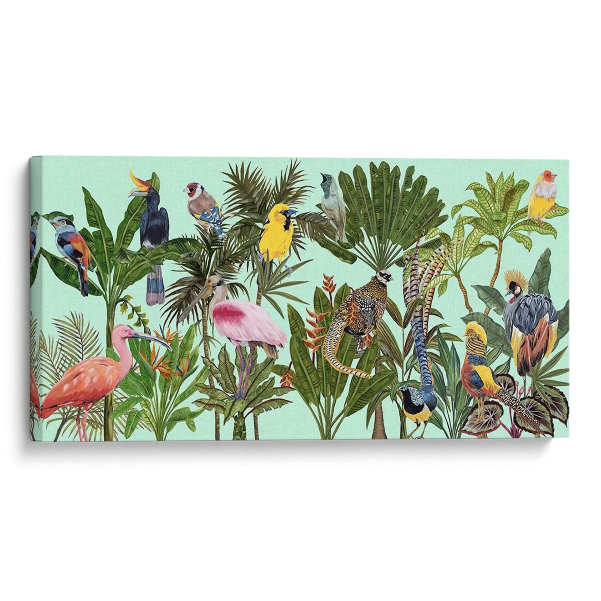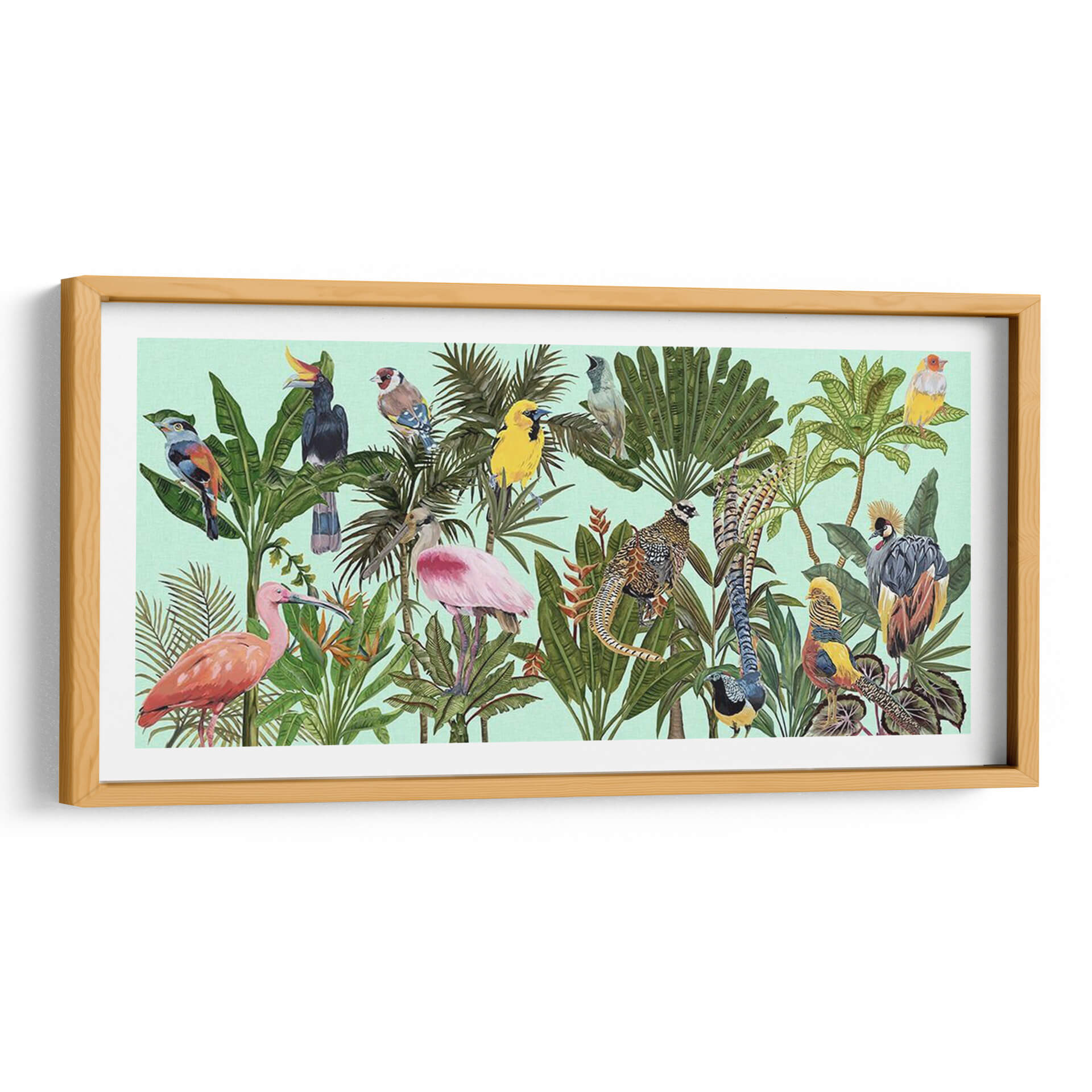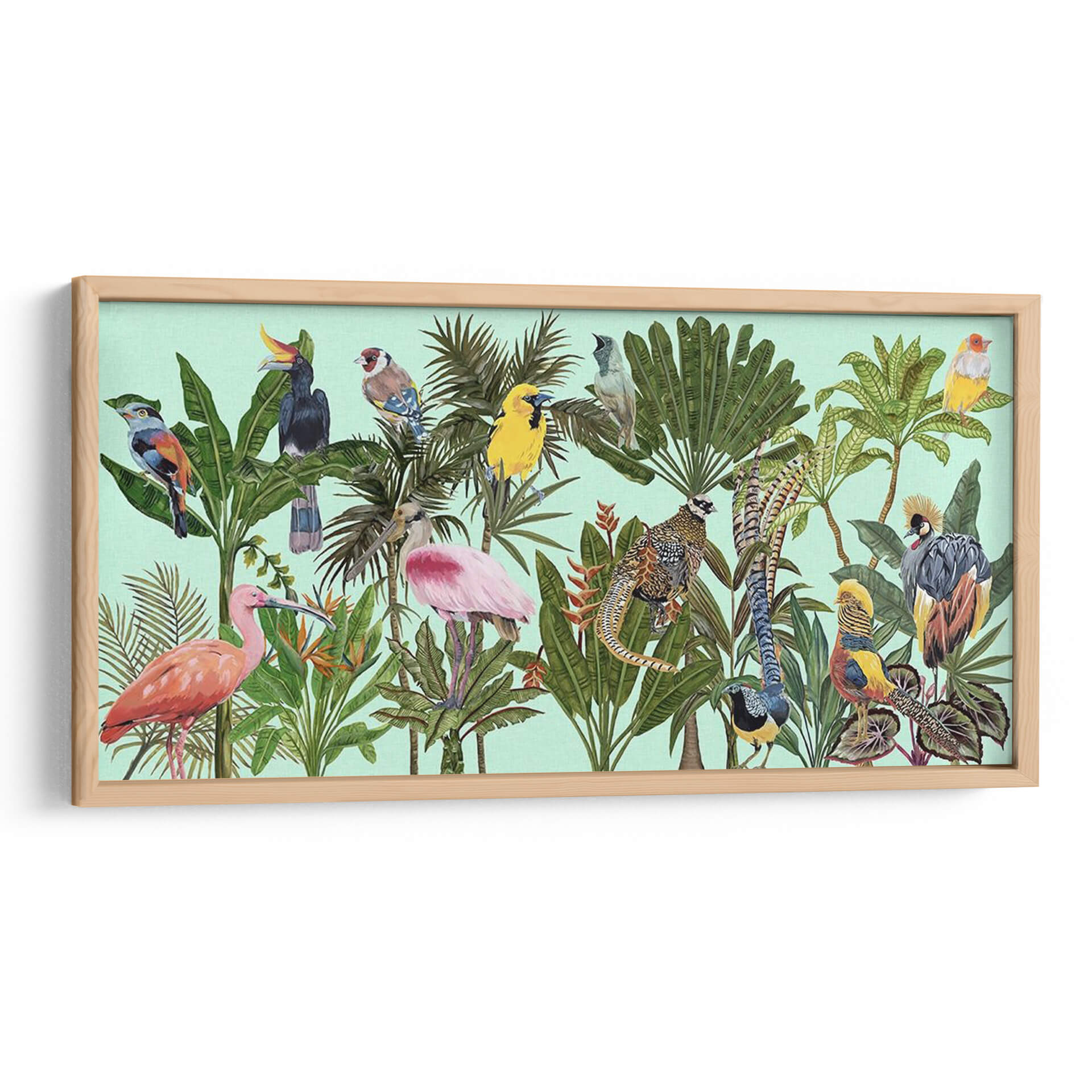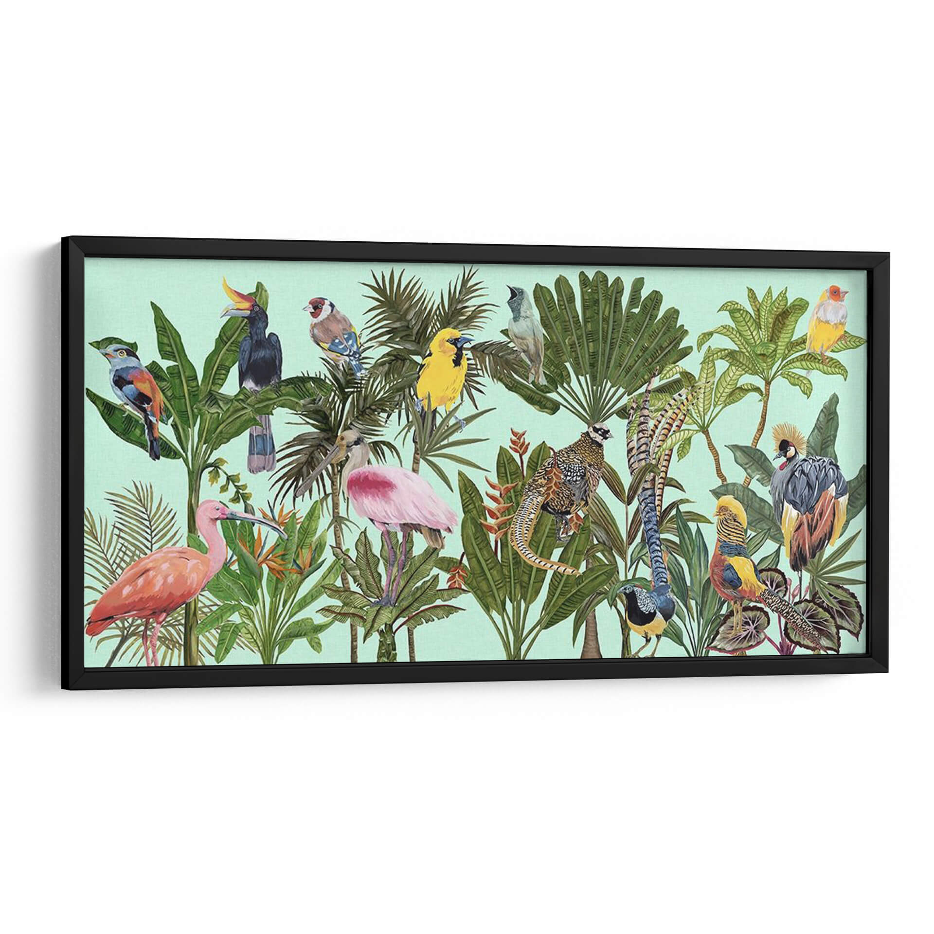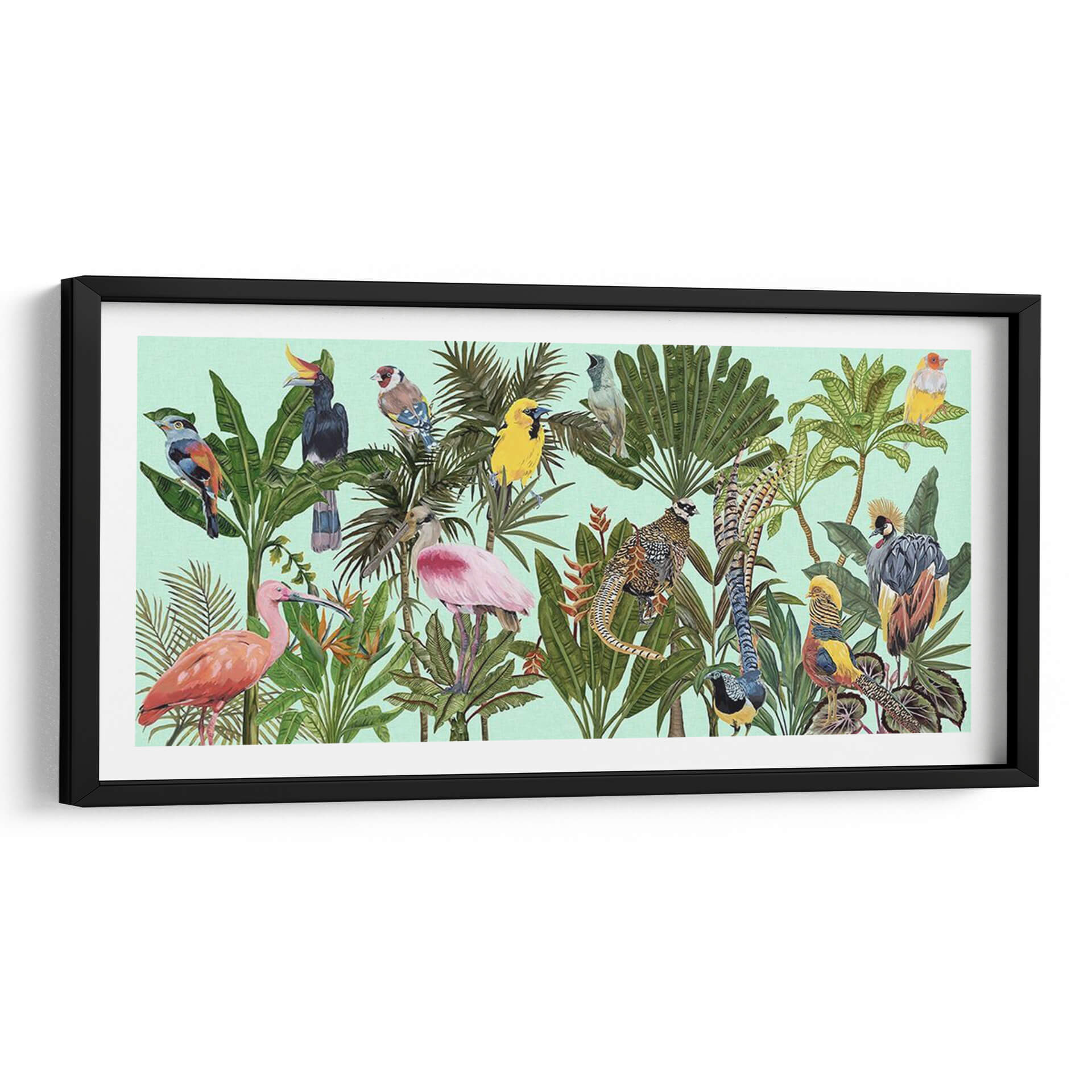 Sumérgete en la exuberancia tropical con "Pájaros Paraíso V", una obra de arte vibrante y detallada de Melissa Wang. Este cuadro decorativo te transporta a un edén exótico, donde una colección de aves exóticas y exuberante vegetación se despliegan en un lienzo lleno de vida y color. Cada pájaro, desde el majestuoso flamenco rosado hasta el emplumado faisán, está representado con una delicadeza que realza su belleza natural. La paleta de colores, dominada por verdes intensos de las hojas tropicales y los tonos vivos de las aves, crea una atmósfera de alegría y vitalidad, contrastando suavemente con el fondo aguamarina pálido. La composición, rica en detalles y texturas, invita a explorar cada rincón de la escena, descubriendo nuevas maravillas con cada mirada. "Pájaros Paraíso V" es ideal para añadir un toque de naturaleza salvaje y sofisticación a tu salón, dormitorio u oficina. Es una pieza que no solo decora, sino que inspira y evoca la sensación de estar en un paraíso terrenal, convirtiéndose en un punto focal que atrae todas las miradas y genera conversaciones. Perfecto para amantes de la naturaleza y el arte contemporáneo que buscan una decoración única y llena de personalidad.