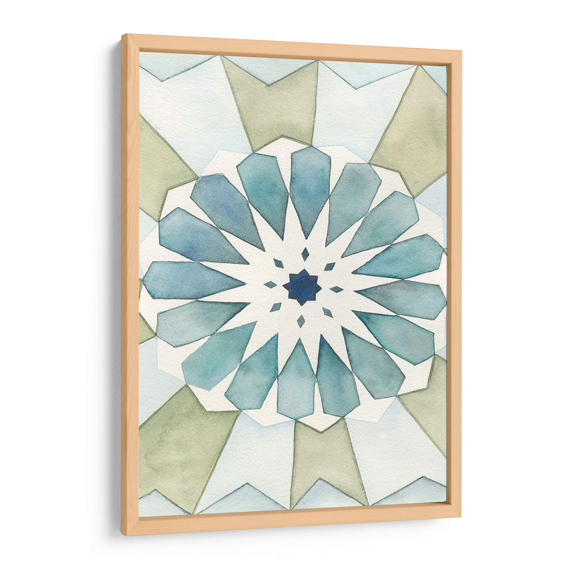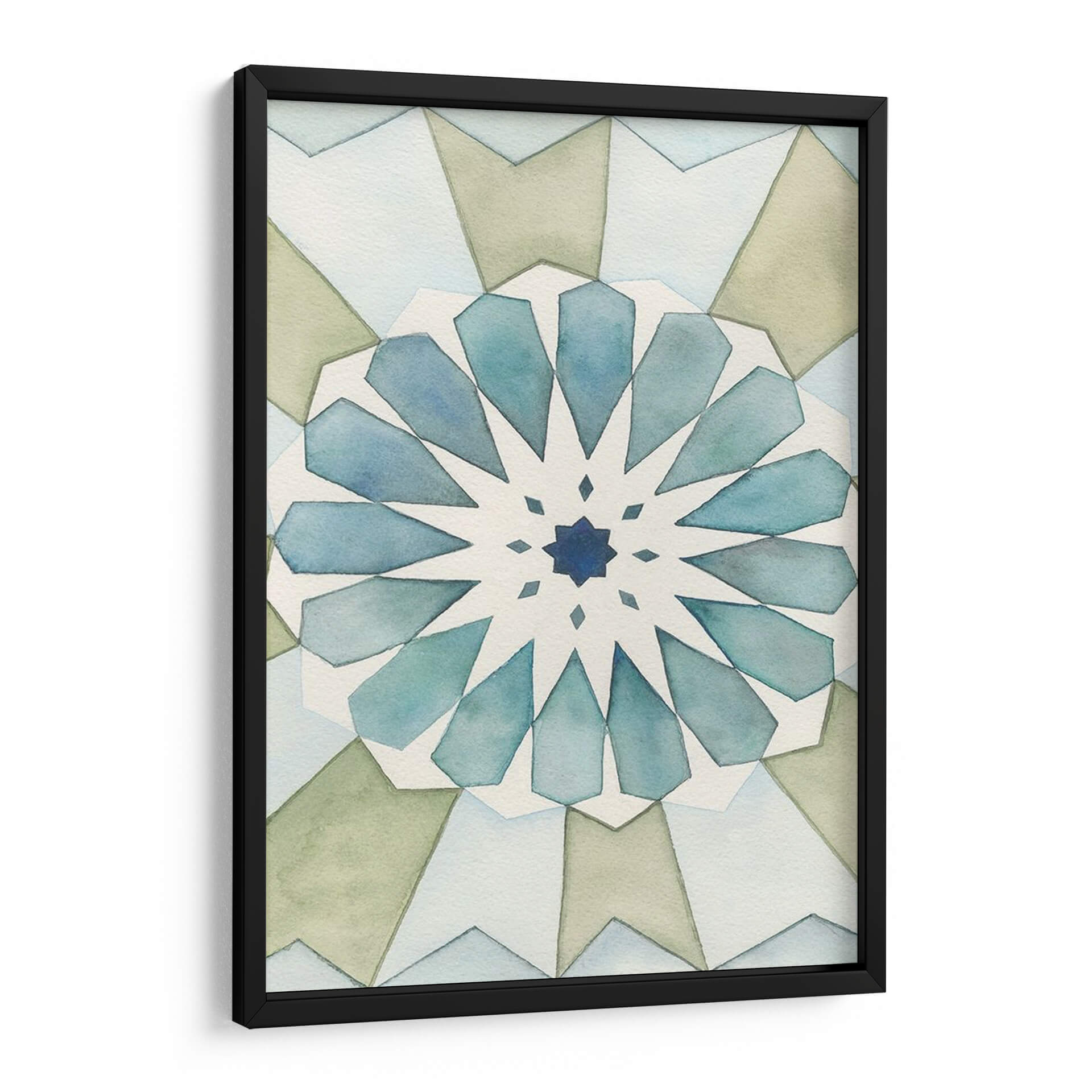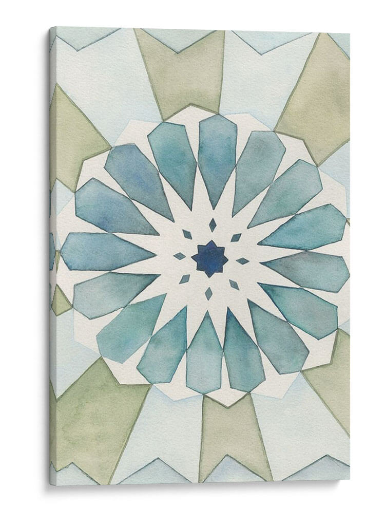 Sumérgete en la serenidad geométrica de "Panel Morisco I", una obra de arte contemporáneo de Natasha Chabot que evoca la belleza atemporal de los patrones islámicos. Este cuadro decorativo presenta una intrincada composición simétrica, radiante desde un centro azul profundo, con pétalos estilizados en tonos acuosos de azul y verde pálido que se despliegan hacia el exterior. La paleta de colores suaves y terrosos, complementada con delicados toques de azul, crea una atmósfera de calma y armonía, perfecta para cualquier espacio que busque un toque de elegancia sutil y contemplativa. La técnica de acuarela, con sus bordes difuminados y su ligereza, aporta una cualidad etérea y relajante a la pieza. "Panel Morisco I" es ideal para añadir un punto de interés visual y una sensación de paz a tu sala de estar, dormitorio, o incluso un espacio de meditación o estudio. Su diseño abstracto y geométrico lo convierte en una adición versátil para interiores modernos, minimalistas o de inspiración bohemia, invitando a la reflexión y al disfrute estético. Descubre cómo esta pieza puede transformar tu hogar en un santuario de estilo y tranquilidad.