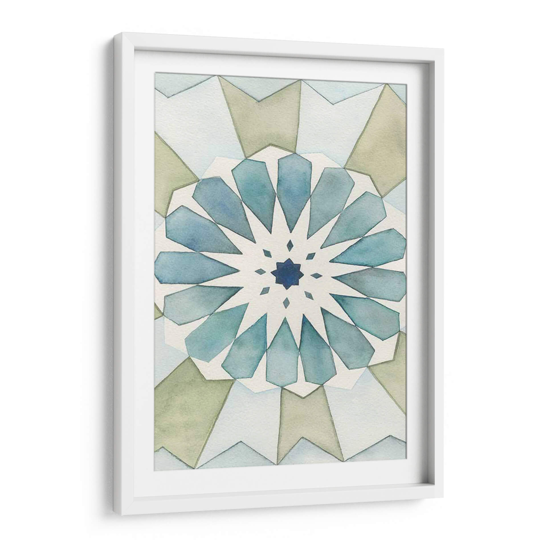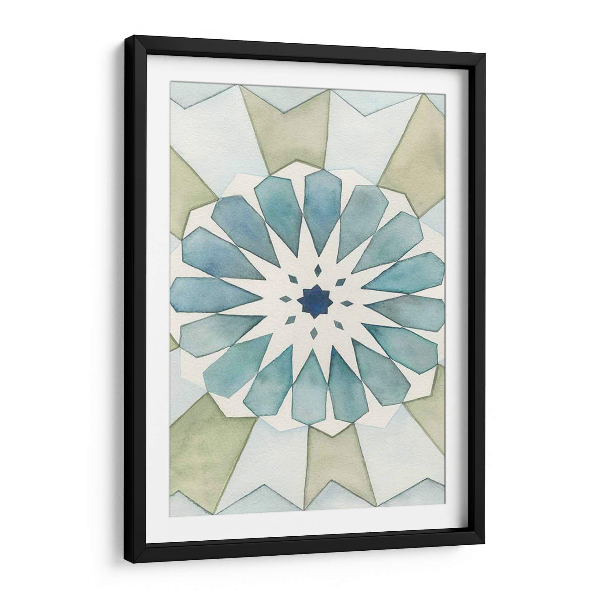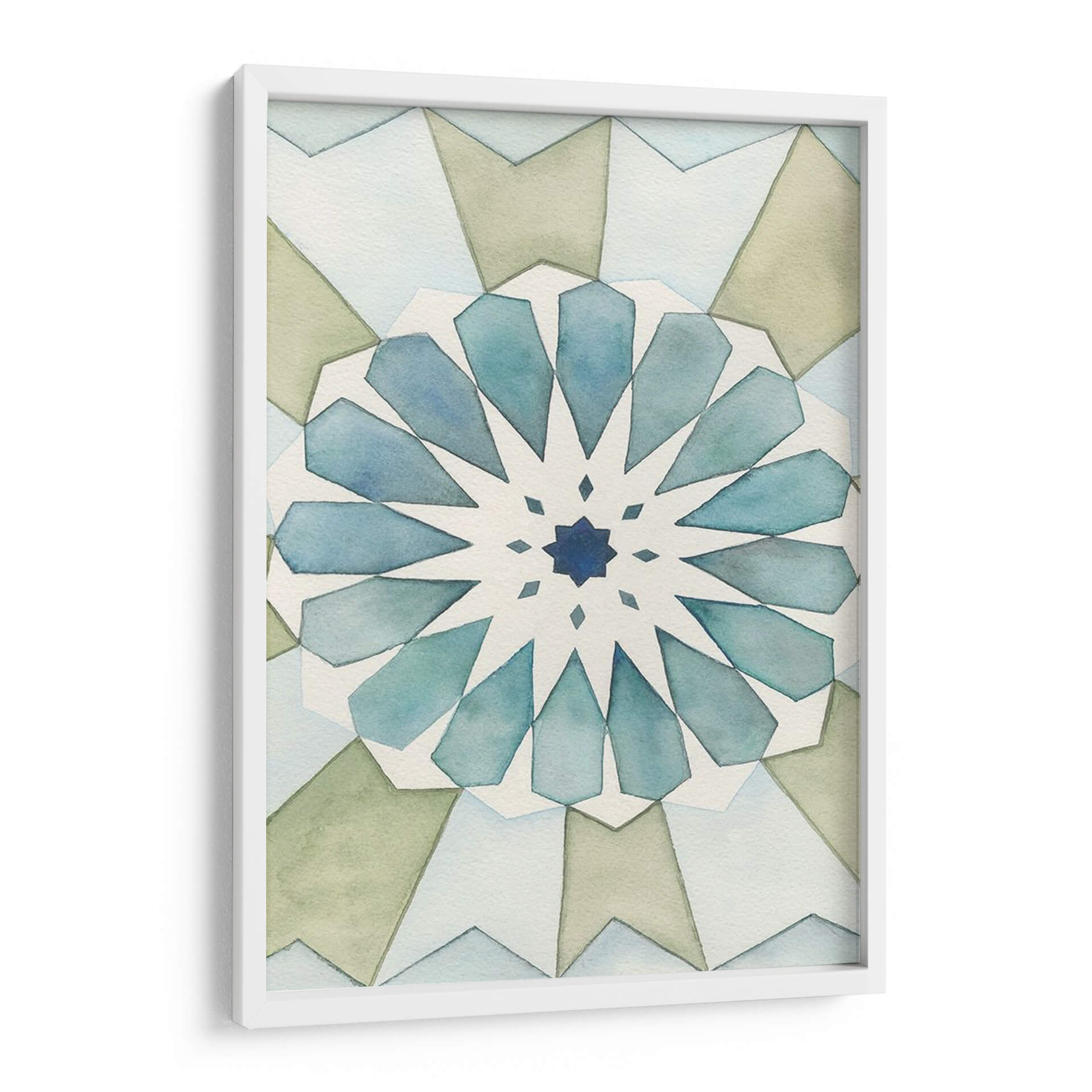 Sumérgete en la serenidad geométrica de "Panel Morisco I", una obra de arte contemporáneo de Natasha Chabot que evoca la belleza atemporal de los patrones islámicos. Este cuadro decorativo presenta una intrincada composición simétrica, radiante desde un centro azul profundo, con pétalos estilizados en tonos acuosos de azul y verde pálido que se despliegan hacia el exterior. La paleta de colores suaves y terrosos, complementada con delicados toques de azul, crea una atmósfera de calma y armonía, perfecta para cualquier espacio que busque un toque de elegancia sutil y contemplativa. La técnica de acuarela, con sus bordes difuminados y su ligereza, aporta una cualidad etérea y relajante a la pieza. "Panel Morisco I" es ideal para añadir un punto de interés visual y una sensación de paz a tu sala de estar, dormitorio, o incluso un espacio de meditación o estudio. Su diseño abstracto y geométrico lo convierte en una adición versátil para interiores modernos, minimalistas o de inspiración bohemia, invitando a la reflexión y al disfrute estético. Descubre cómo esta pieza puede transformar tu hogar en un santuario de estilo y tranquilidad.