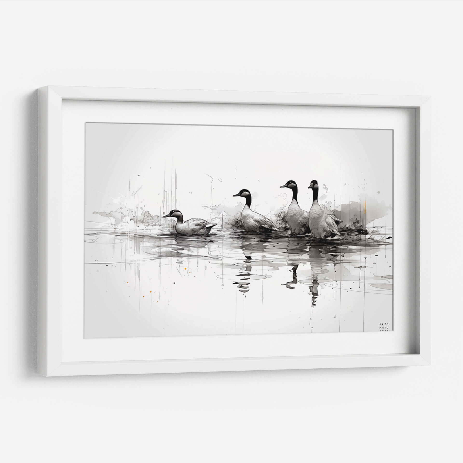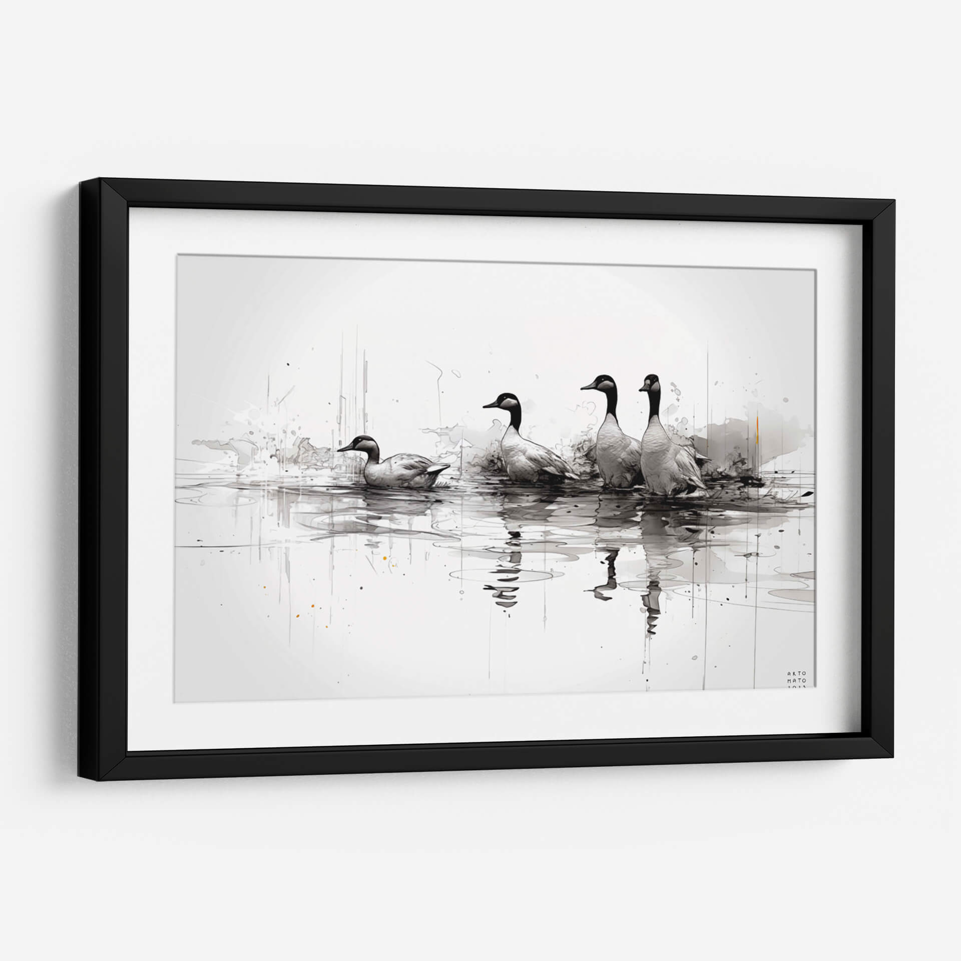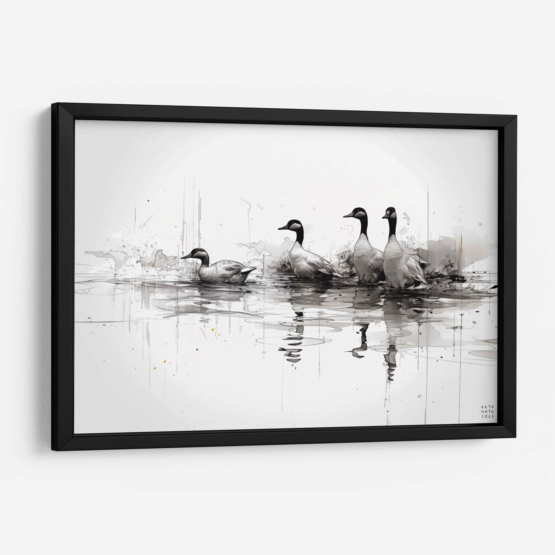 Captura la serenidad y el movimiento del mundo natural con este cautivador cuadro decorativo titulado 'Paseo', una obra de arte que evoca calma y reflexión. La pieza presenta una delicada composición de cuatro aves acuáticas navegando en aguas tranquilas, renderizadas con un estilo que combina trazos de lápiz nítidos con salpicaduras de acuarela etéreas. La paleta de colores, predominantemente en blanco y negro con sutiles toques de sepia y naranja quemado, crea una atmósfera sofisticada y atemporal. Los reflejos en el agua añaden una capa de profundidad y realismo, contrastando suavemente con las líneas más abstractas y sugerentes del fondo. Este cuadro es ideal para infundir paz y elegancia en cualquier espacio, ya sea un dormitorio tranquilo, un estudio sereno o una sala de estar moderna que busca un punto focal con carácter. 'Paseo' no es solo una obra de arte, sino una invitación a la contemplación, perfecta para quienes aprecian la belleza sutil de la vida silvestre y el arte contemporáneo con un toque minimalista y expresivo. Su diseño versátil se adapta a diversos estilos decorativos, aportando una sensación de conexión con la naturaleza y un aire de distinción.