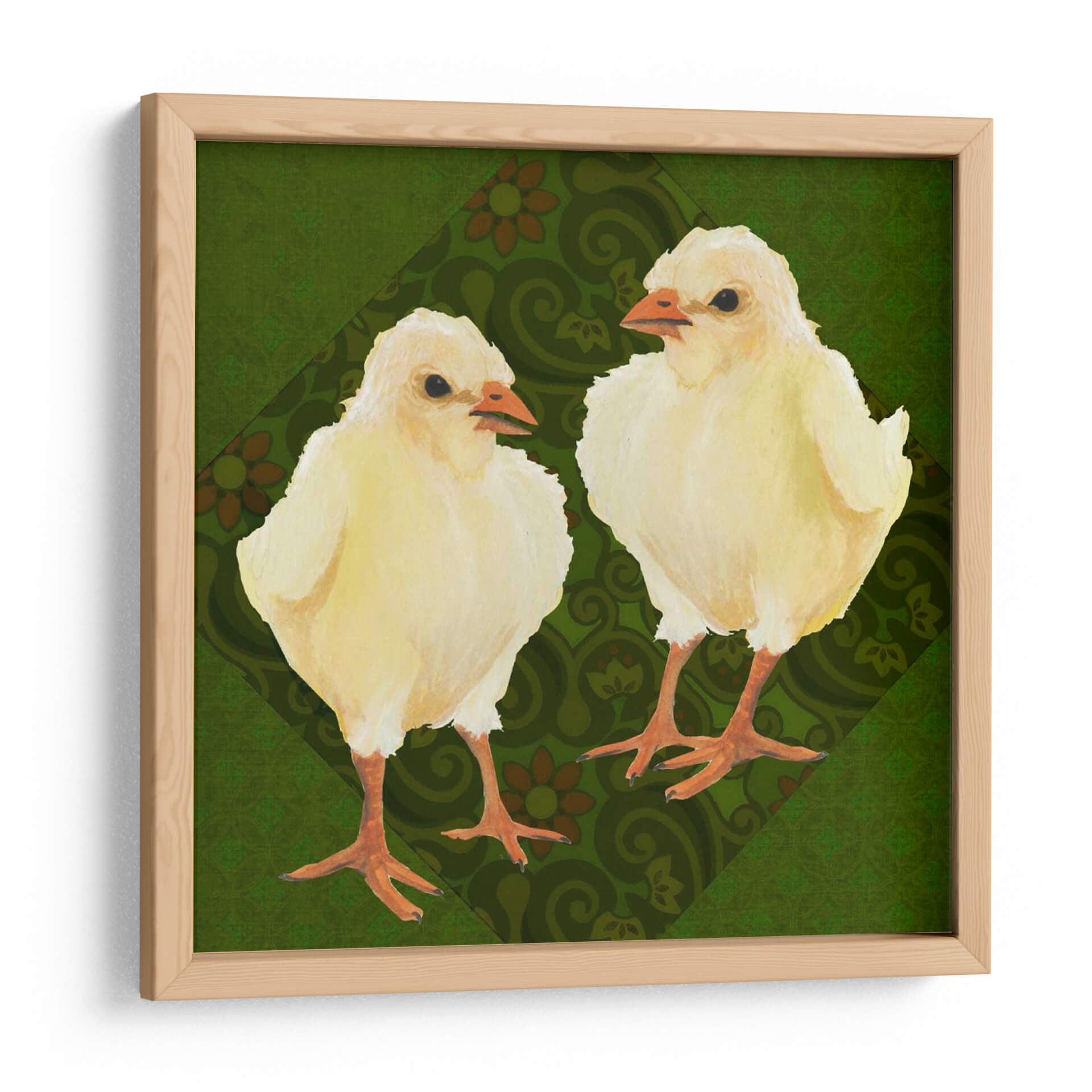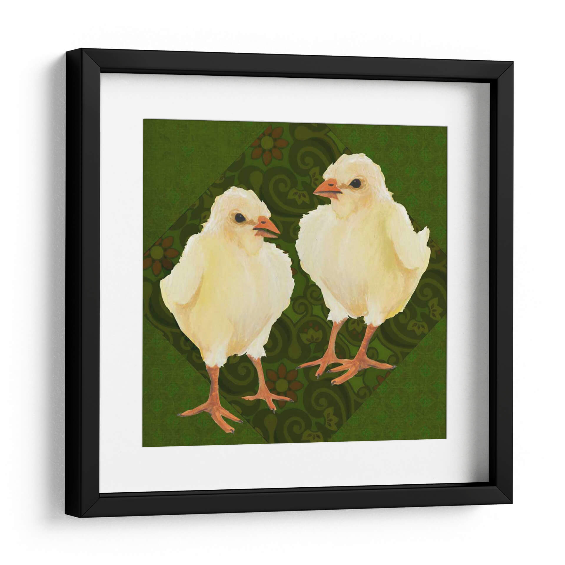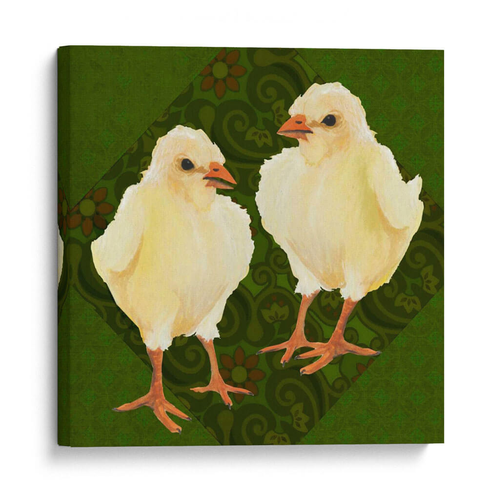 Inyecta una dosis de ternura y encanto primaveral a tu hogar con "Patio Pájaro III", una obra de arte cautivadora de Grace Popp. Este cuadro decorativo presenta a dos adorables polluelos amarillos, capturados con una delicadeza que evoca la inocencia y la vitalidad de la vida nueva. El fondo, una rica y texturizada paleta de verdes profundos, se adorna con un patrón sutil de motivos florales y arabescos en tonos tierra, creando un contraste visual que realza la suavidad de los protagonistas emplumados. La composición se centra en la relación entre los dos pajarillos, sugiriendo una conexión tierna y curiosa. El estilo artístico, con toques de acuarela y una pincelada suave, transmite una sensación de calidez y familiaridad. Ideal para añadir un punto focal alegre y acogedor a la decoración de una habitación infantil, un salón luminoso o incluso un rincón de estudio que necesite un toque de naturaleza y optimismo. "Patio Pájaro III" no es solo una pieza decorativa, sino una invitación a la alegría y a la celebración de los pequeños momentos.