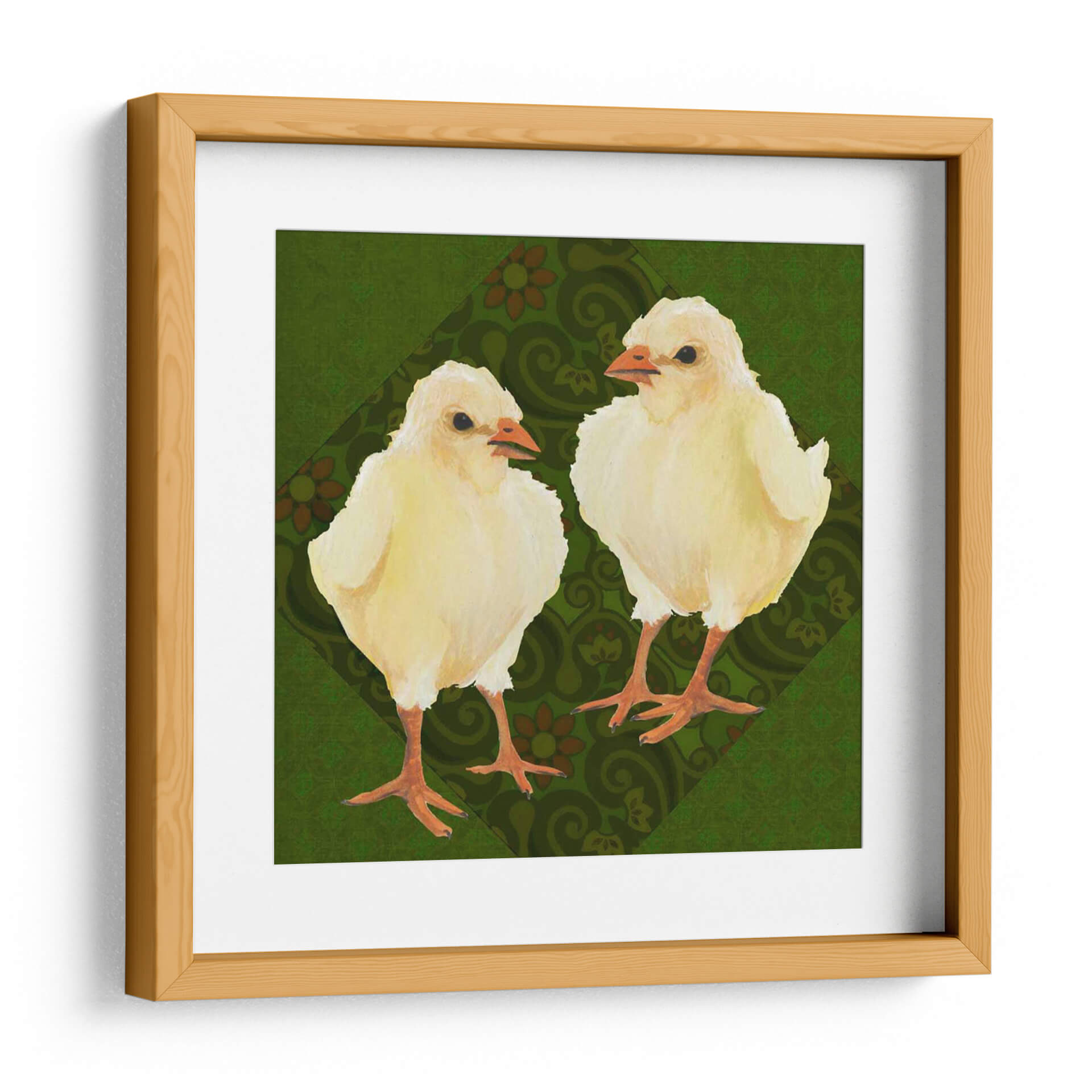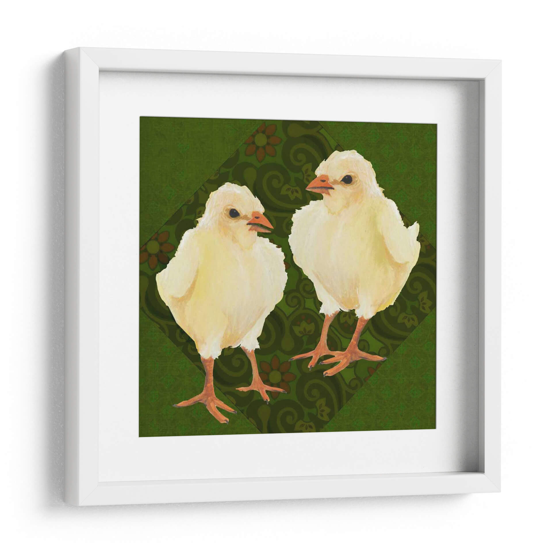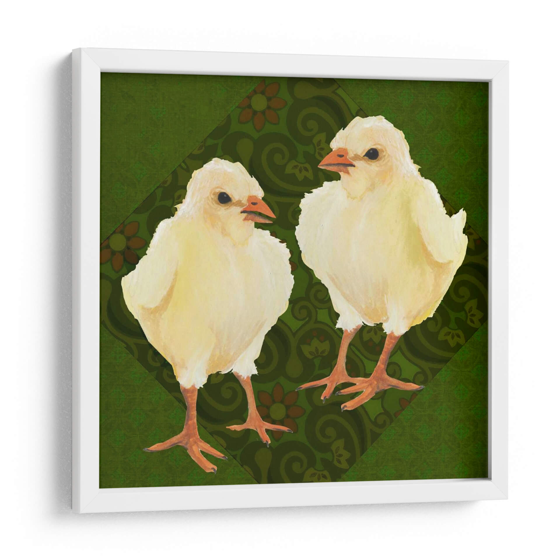 Inyecta una dosis de ternura y encanto primaveral a tu hogar con "Patio Pájaro III", una obra de arte cautivadora de Grace Popp. Este cuadro decorativo presenta a dos adorables polluelos amarillos, capturados con una delicadeza que evoca la inocencia y la vitalidad de la vida nueva. El fondo, una rica y texturizada paleta de verdes profundos, se adorna con un patrón sutil de motivos florales y arabescos en tonos tierra, creando un contraste visual que realza la suavidad de los protagonistas emplumados. La composición se centra en la relación entre los dos pajarillos, sugiriendo una conexión tierna y curiosa. El estilo artístico, con toques de acuarela y una pincelada suave, transmite una sensación de calidez y familiaridad. Ideal para añadir un punto focal alegre y acogedor a la decoración de una habitación infantil, un salón luminoso o incluso un rincón de estudio que necesite un toque de naturaleza y optimismo. "Patio Pájaro III" no es solo una pieza decorativa, sino una invitación a la alegría y a la celebración de los pequeños momentos.