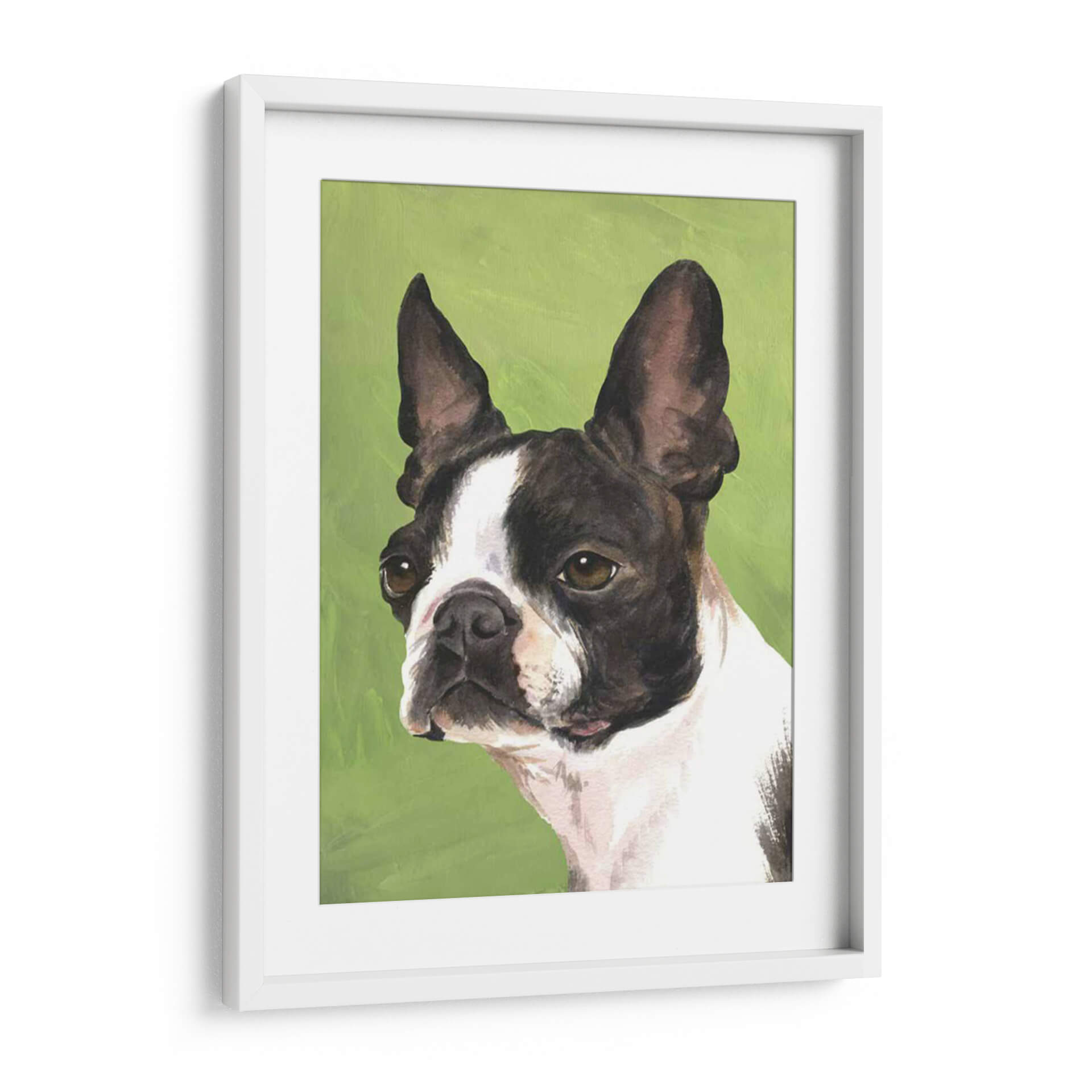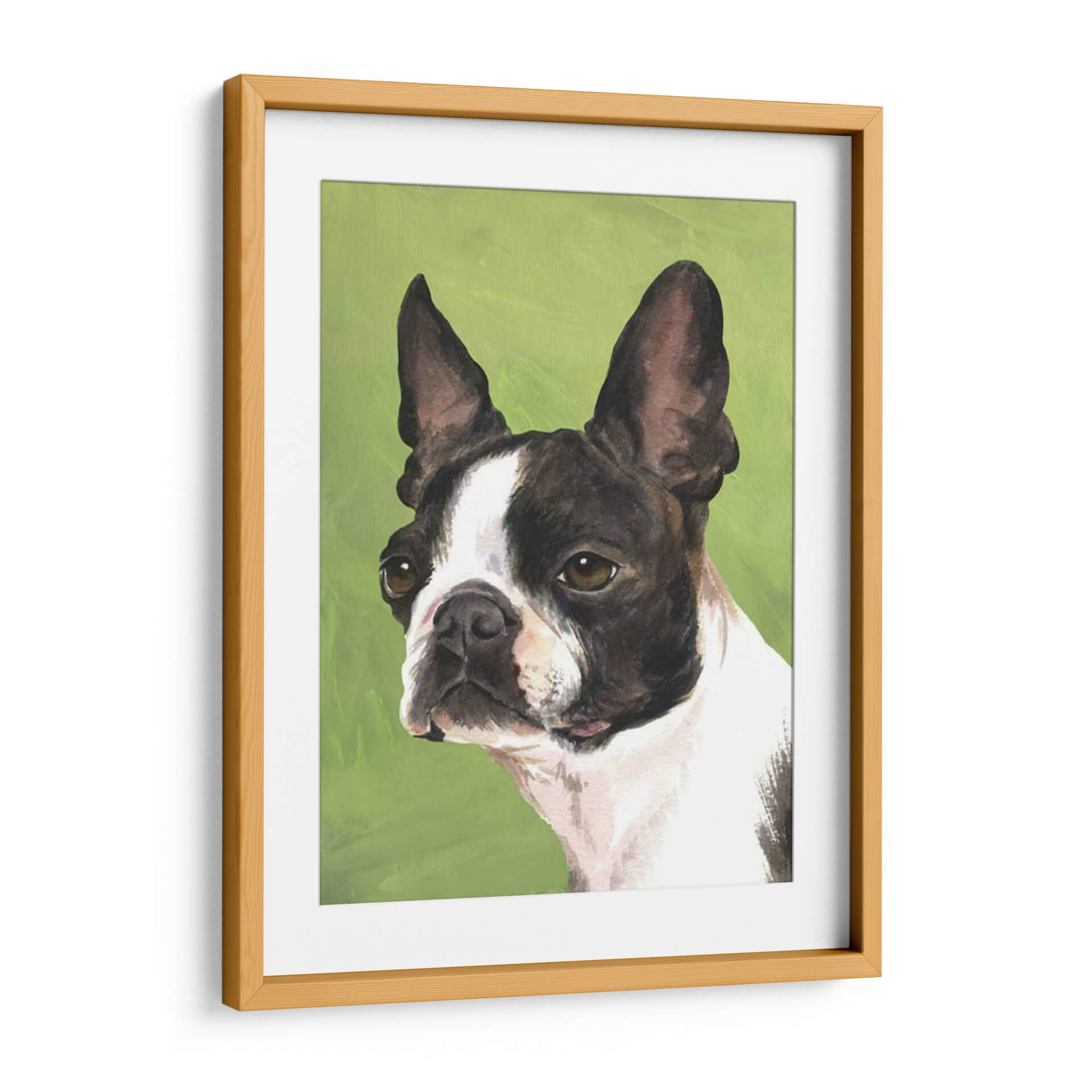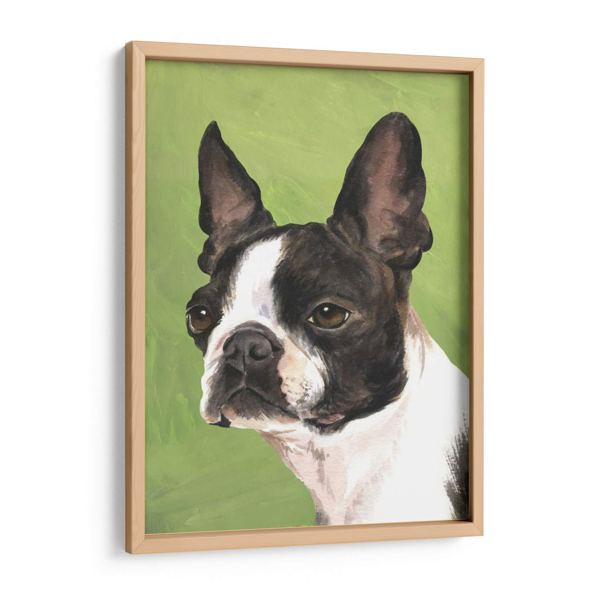 Este cautivador cuadro decorativo de un Boston Terrier, titulado 'Perro Retrato-Boston' y creado por Jill Sands, captura la esencia juguetona y leal de esta querida raza. La obra presenta un primer plano del distintivo rostro del perro, con sus orejas erguidas y una mirada inteligente y atenta que parece conectar directamente con el espectador. La paleta de colores se centra en el contraste entre el pelaje blanco y negro del terrier y un vibrante fondo verde pistacho, que aporta una energía fresca y moderna a la composición. El estilo artístico, aunque figurativo, posee una cualidad expresiva y ligeramente texturizada en el fondo, lo que sugiere una técnica de pintura contemporánea. Este retrato de perro es ideal para los amantes de los animales y para quienes buscan añadir un toque de personalidad y calidez a su hogar u oficina. Quedará perfecto en una sala de estar, un dormitorio o incluso como punto focal en una entrada. Un cuadro decorativo que evoca alegría y compañerismo, aportando vida a cualquier espacio con su encanto único. Añade esta pieza a tu colección de arte de pared para un toque distintivo.