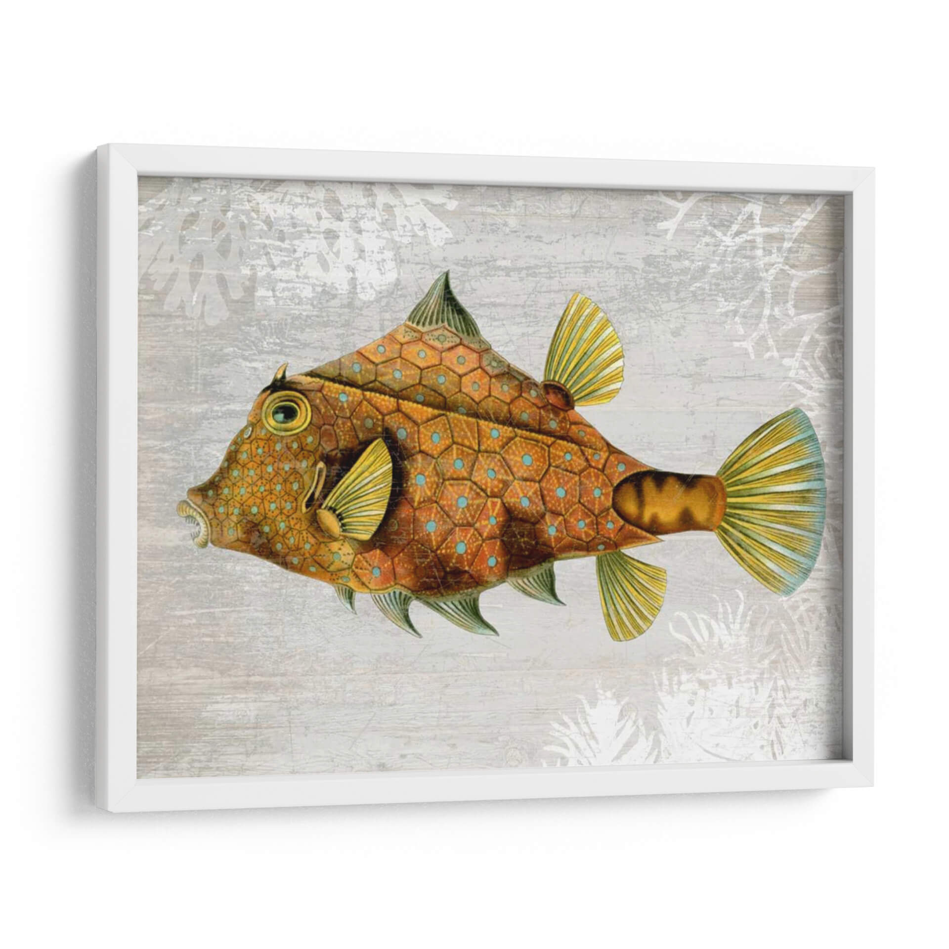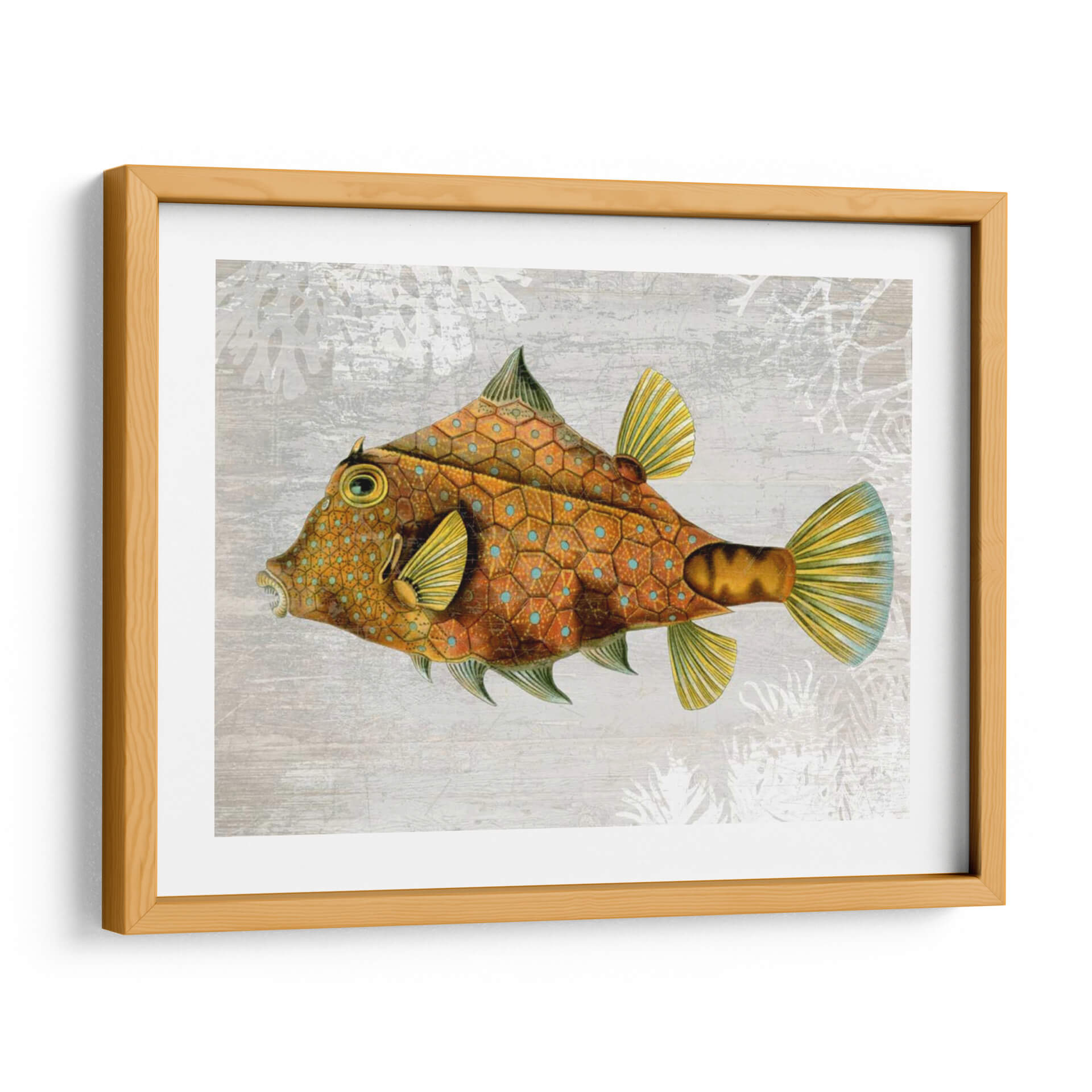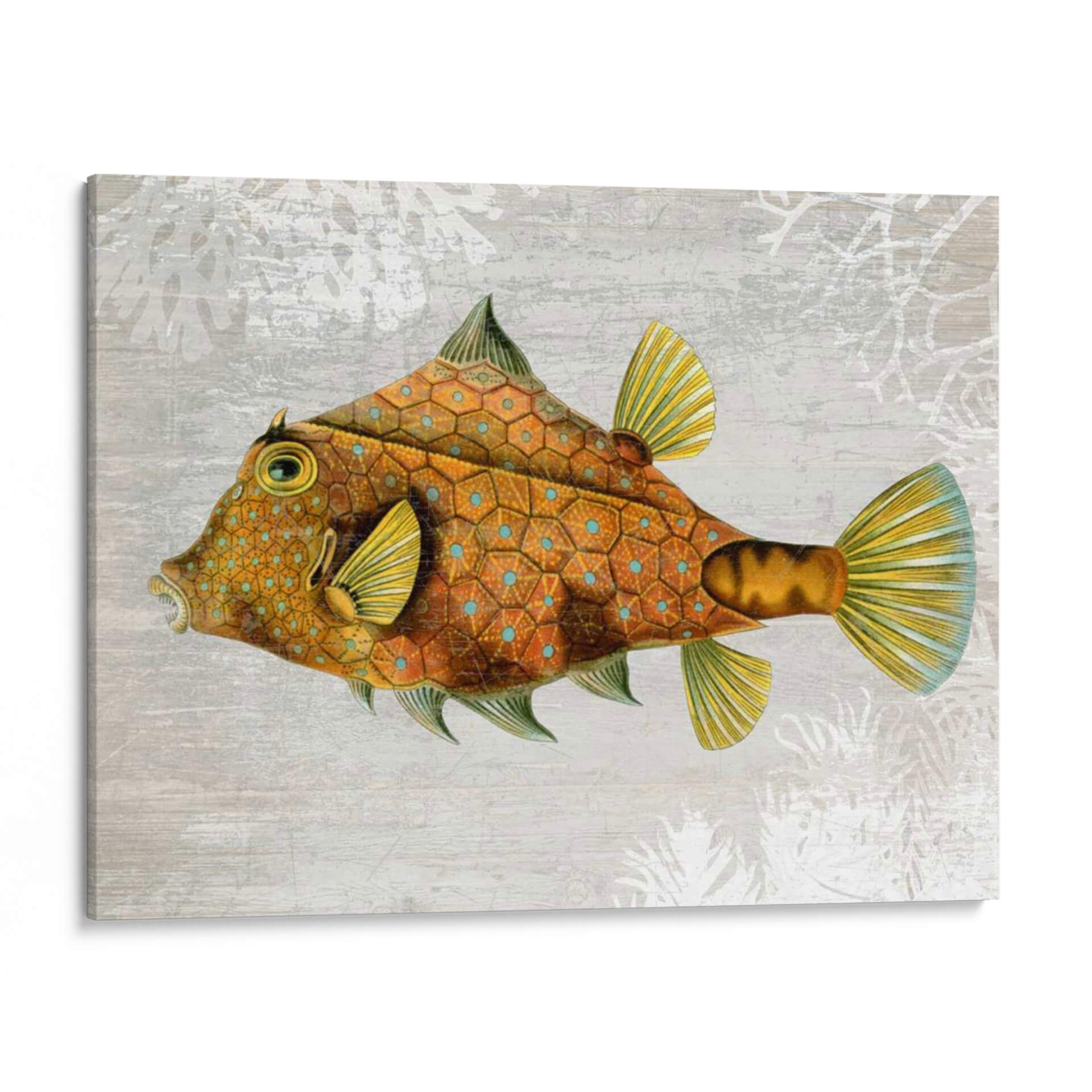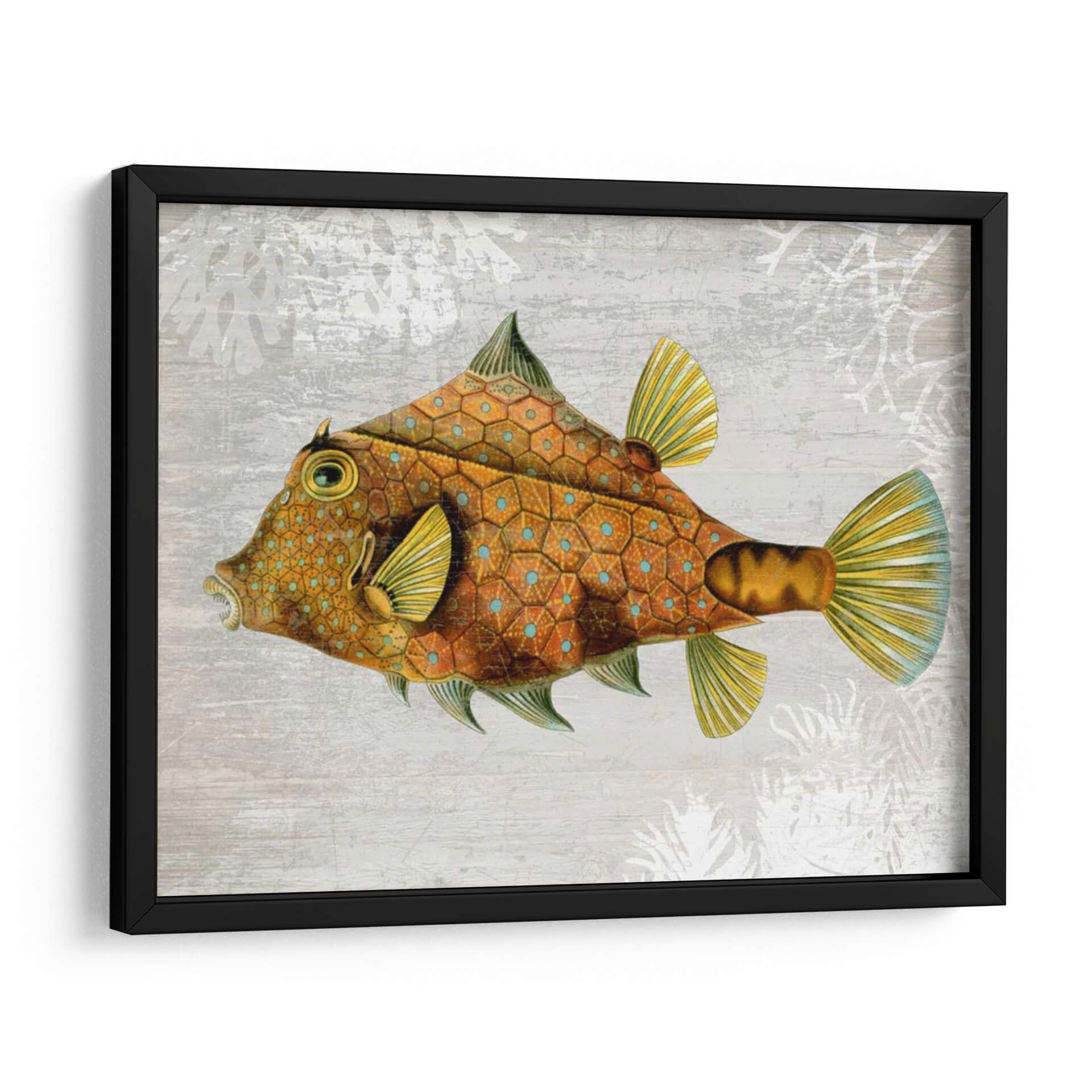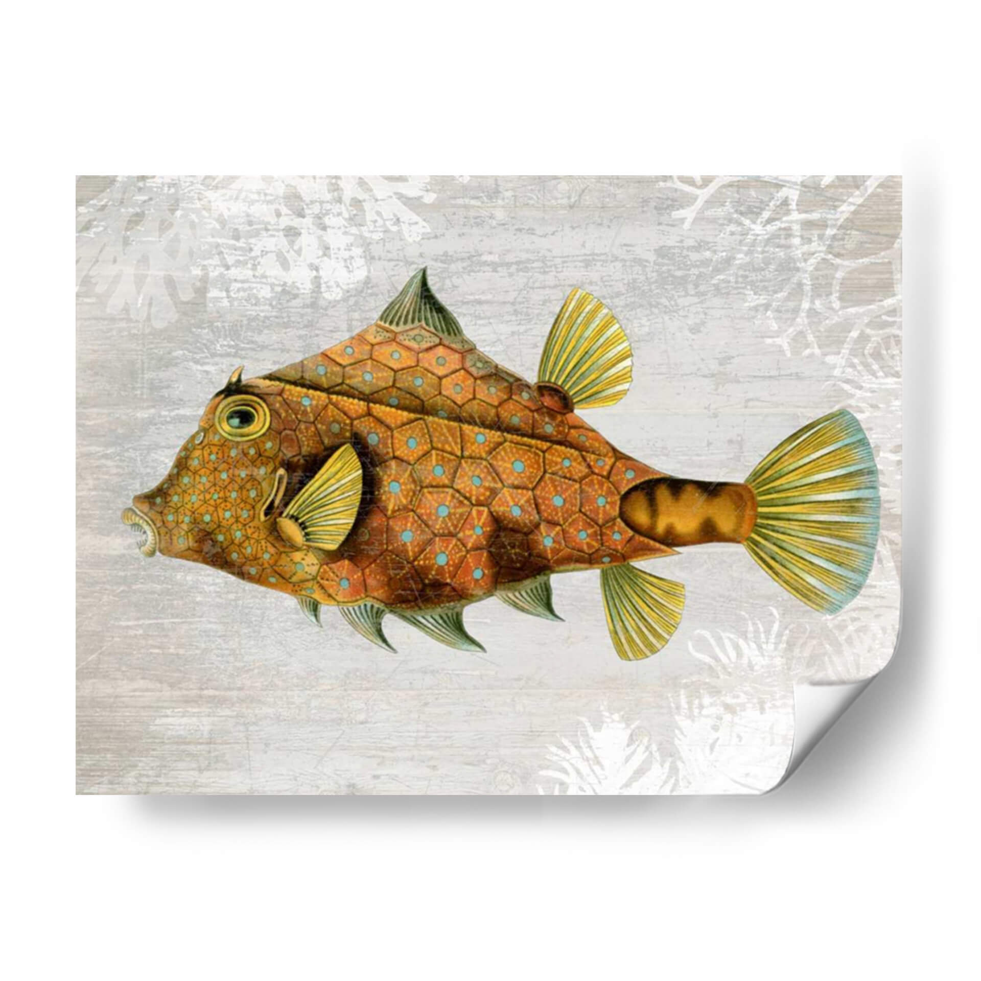 Sumérgete en las profundidades marinas con "Pescado de Torreta de Oro", una obra de arte que captura la fascinación de la vida acuática con un toque contemporáneo. Este cuadro decorativo presenta un pez detallado en tonos cálidos de naranja y amarillo, adornado con sutiles toques de azul que añaden profundidad y vitalidad. La textura hexagonal que recubre el cuerpo del pez, junto con sus aletas radiantes, crea un patrón visual cautivador que atrae la mirada. El fondo, con su sutil textura de madera desgastada y delicadas formas de coral en tonos grises, proporciona un contraste elegante que realza la figura central sin sobrecargar la composición. El estilo, que fusiona elementos de la ilustración naturalista con un enfoque moderno y casi geométrico, confiere a la pieza un carácter único y sofisticado. "Pescado de Torreta de Oro" es ideal para añadir un acento de color y un aire de misterio marino a cualquier espacio, desde una sala de estar moderna hasta un estudio o incluso un baño con temática costera. Su atmósfera tranquila pero vibrante lo convierte en una pieza versátil que inspira contemplación y admiración, perfecta para aquellos que buscan una decoración de pared distintiva que hable de la belleza del océano y el ingenio artístico. Este cuadro decorativo es una invitación a traer la serenidad y la maravilla del mundo submarino a tu hogar, convirtiendo cualquier pared en una ventana a la imaginación.