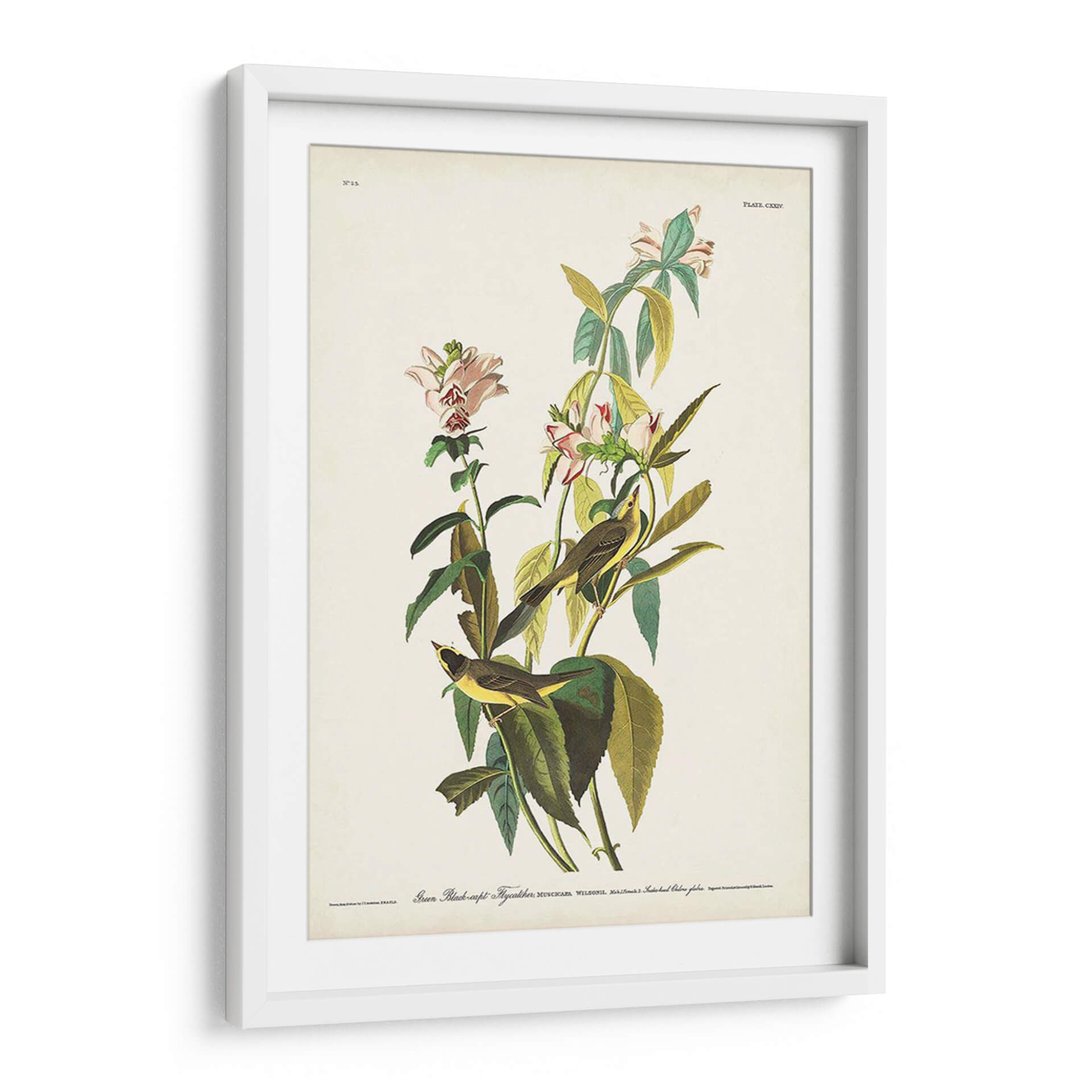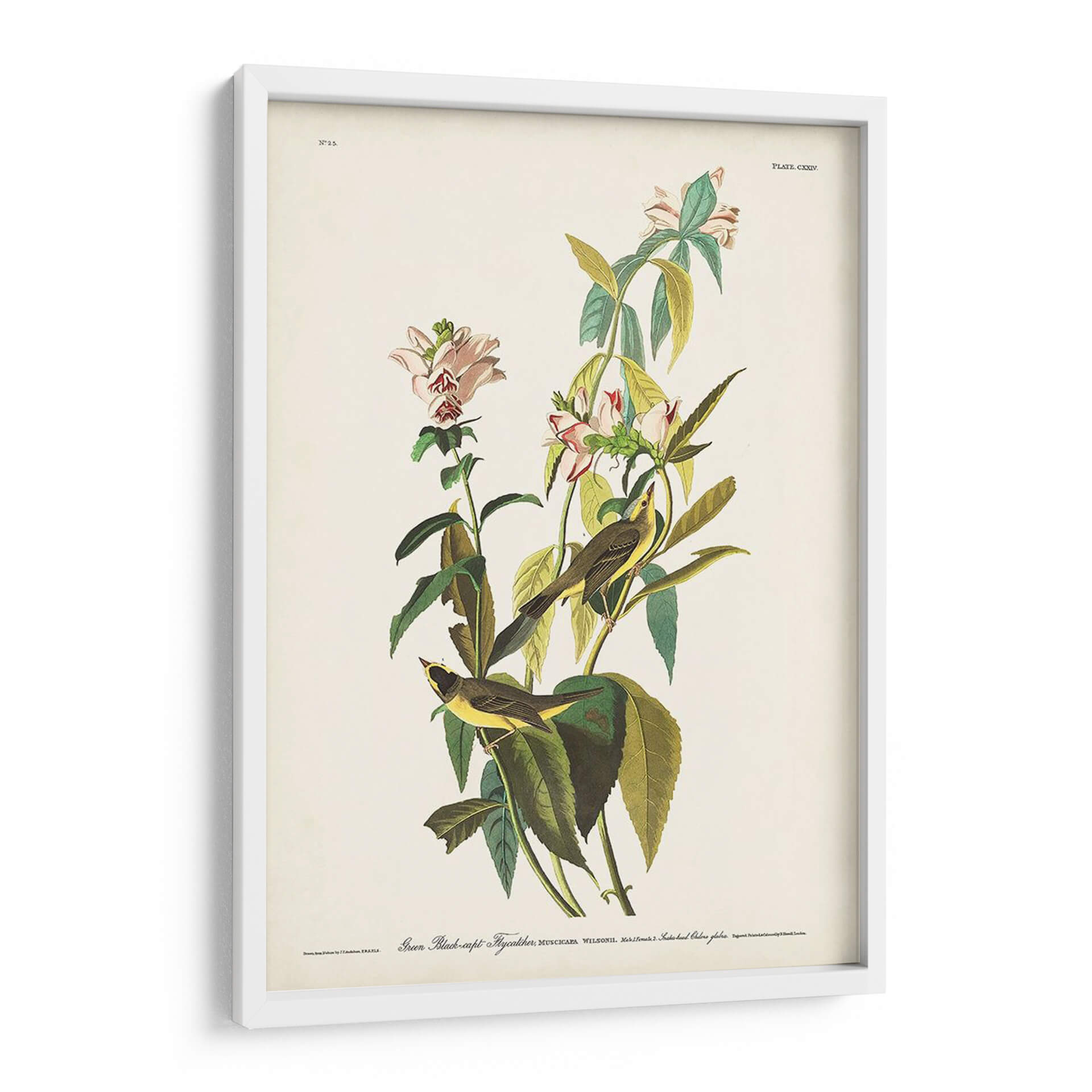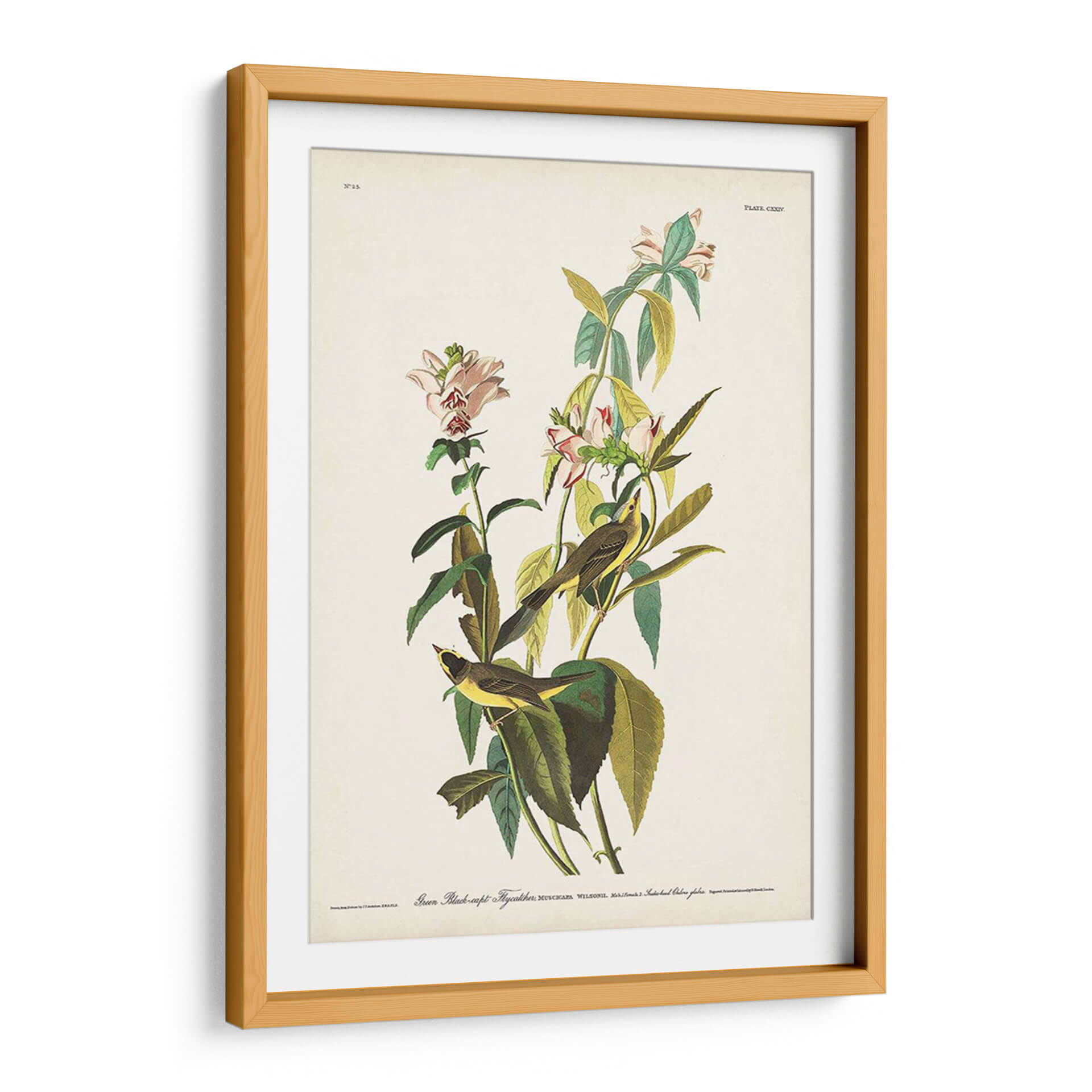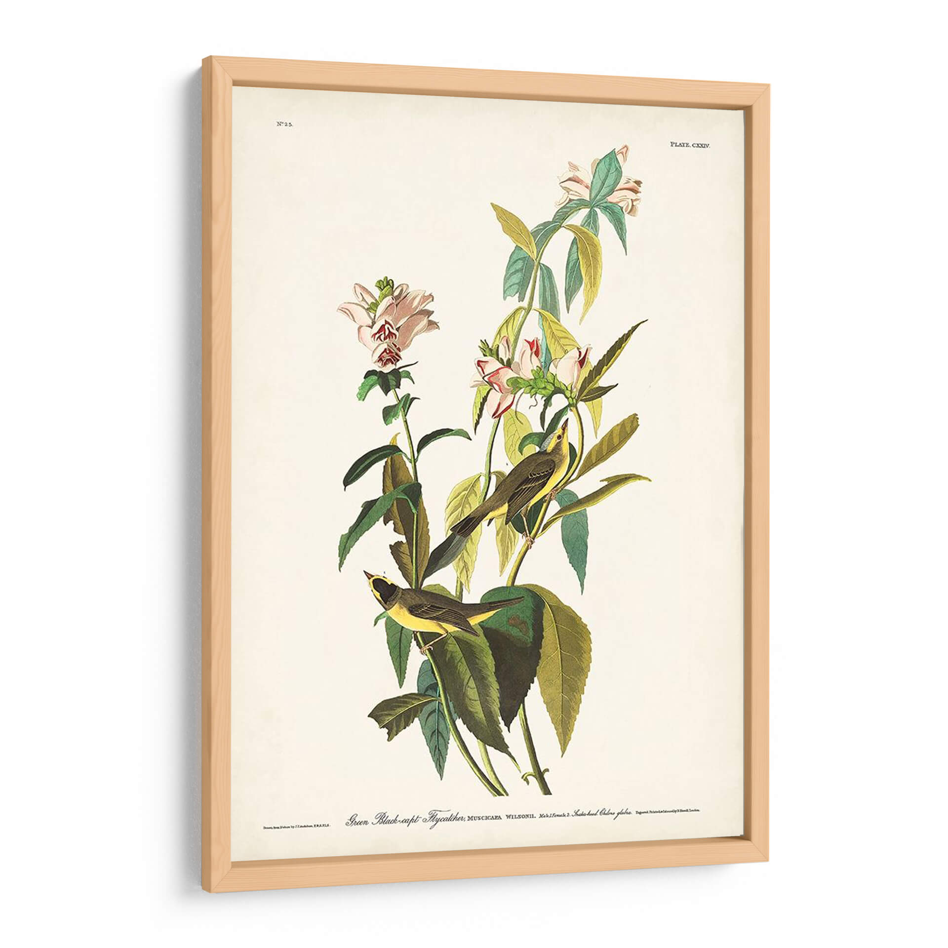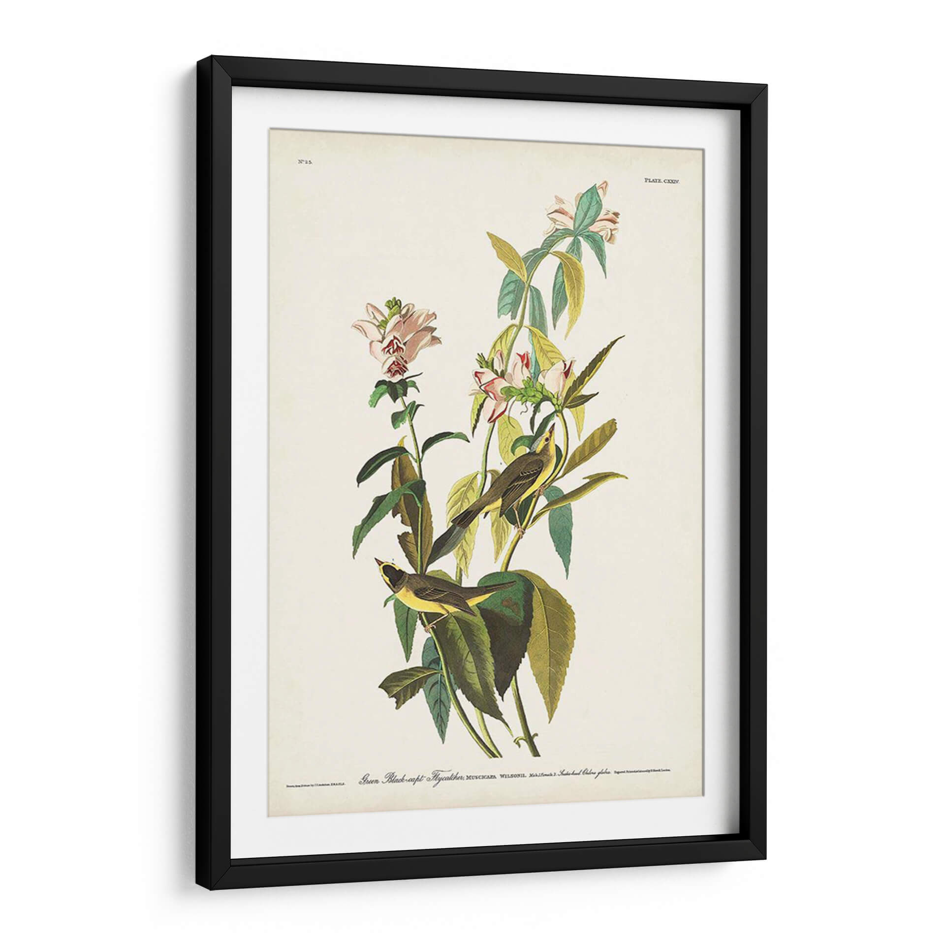 Embellece tu espacio con este exquisito cuadro decorativo inspirado en la obra maestra de John James Audubon, 'Pl. 124 Green Black-Capt Flycatcher'. Esta pieza captura la delicadeza de la naturaleza con una representación detallada de dos pájaros posados entre flores y follaje exuberante. La paleta de colores, dominada por tonos verdes profundos, amarillos vibrantes de las aves y toques sutiles de rosa en las flores, crea una atmósfera de serenidad y conexión con el mundo natural. La composición, con un fondo neutro, permite que los detalles de la fauna y la flora sean los protagonistas, aportando un aire de elegancia clásica y refinamiento a cualquier habitación. Ideal para salones, dormitorios u oficinas que buscan un toque de vida y belleza atemporal. Este cuadro decorativo es perfecto para quienes aprecian el arte de la ilustración científica y desean infundir a su hogar la tranquilidad y la majestuosidad del entorno natural. Añade una pieza de historia natural a tu decoración y disfruta de la armonía que aporta.