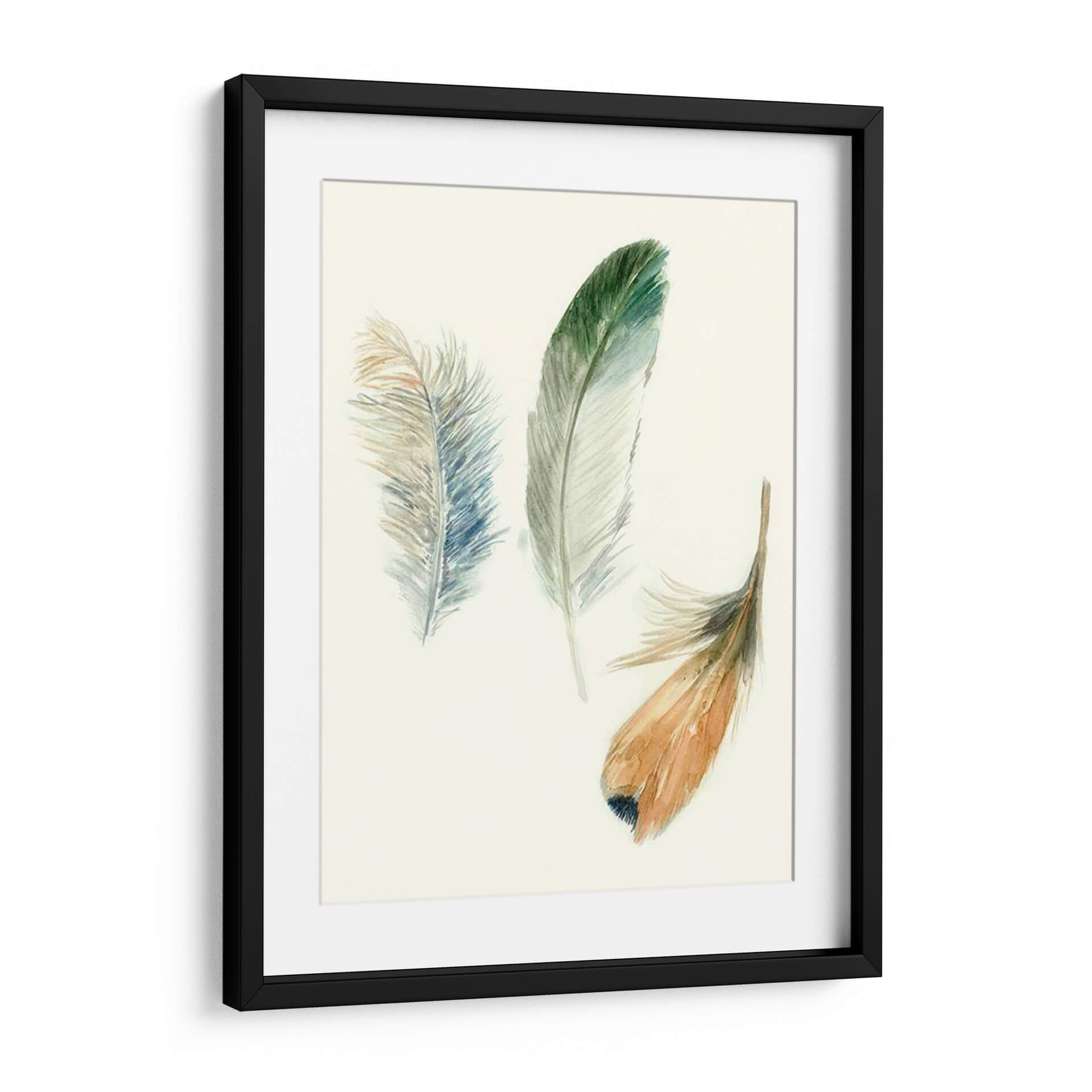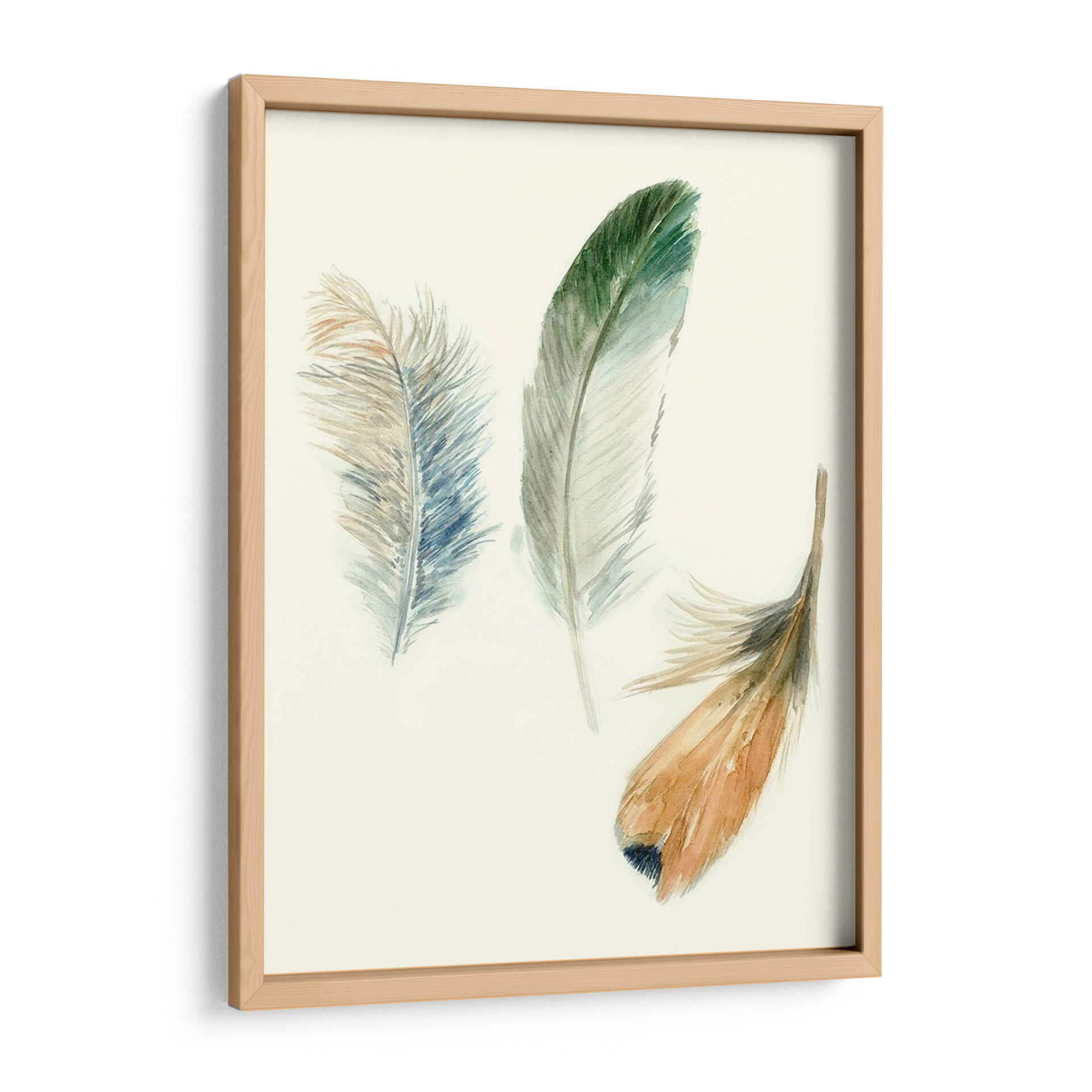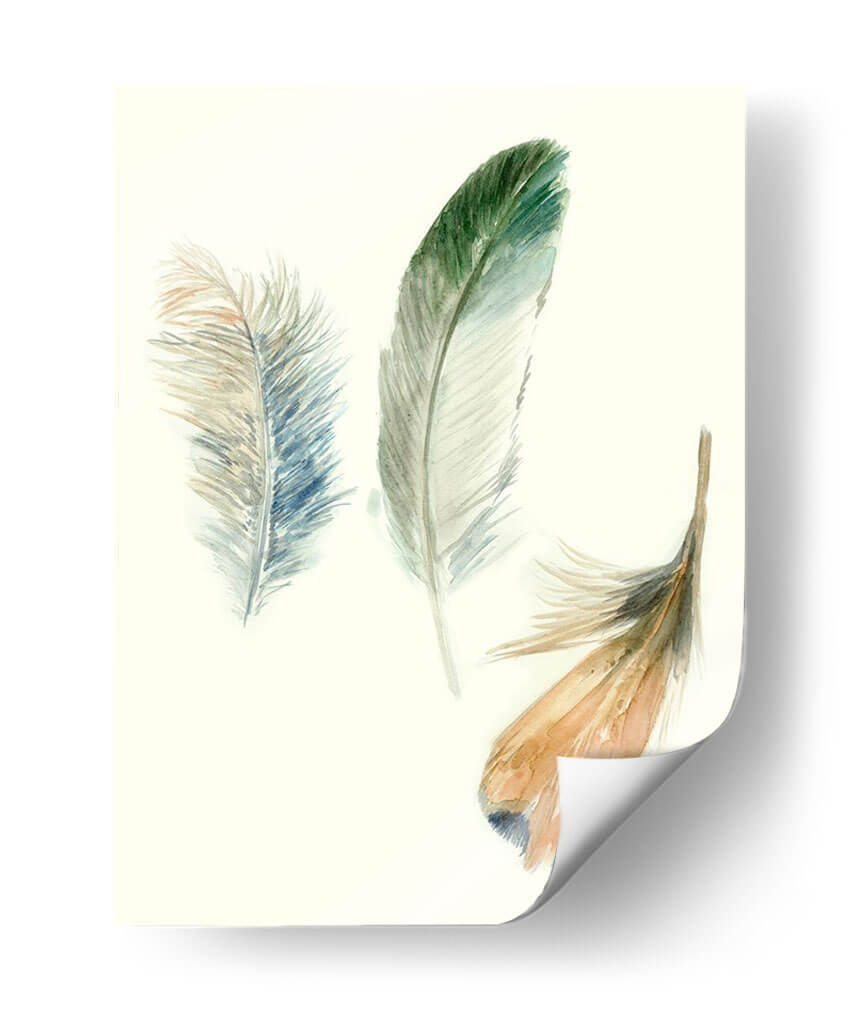 Sumérgete en la delicadeza y la ligereza de "Plumas de Acuarela II", una obra de arte contemporáneo que captura la esencia etérea de la naturaleza. Esta pieza, creada por Megan Meagher, presenta tres delicadas plumas, cada una con una paleta de colores sutil y evocadora. Una pluma se despliega en tonos verdes y azulados, recordando la frescura del bosque y el cielo. Otra, en tonos tierra y dorados, evoca la calidez del sol poniente, mientras que una tercera, de un azul pálido con matices cobrizos, añade un toque de melancolía serena. La técnica de acuarela aporta una fluidez y transparencia únicas, creando una atmósfera de calma y serenidad. Perfecta para espacios que buscan un toque de elegancia natural, este cuadro decorativo es ideal para salones, dormitorios o estudios, aportando una sensación de paz y conexión con lo orgánico. Su composición minimalista y su paleta de colores suaves la convierten en una adición versátil que complementa una amplia gama de estilos decorativos, desde el escandinavo hasta el bohemio.