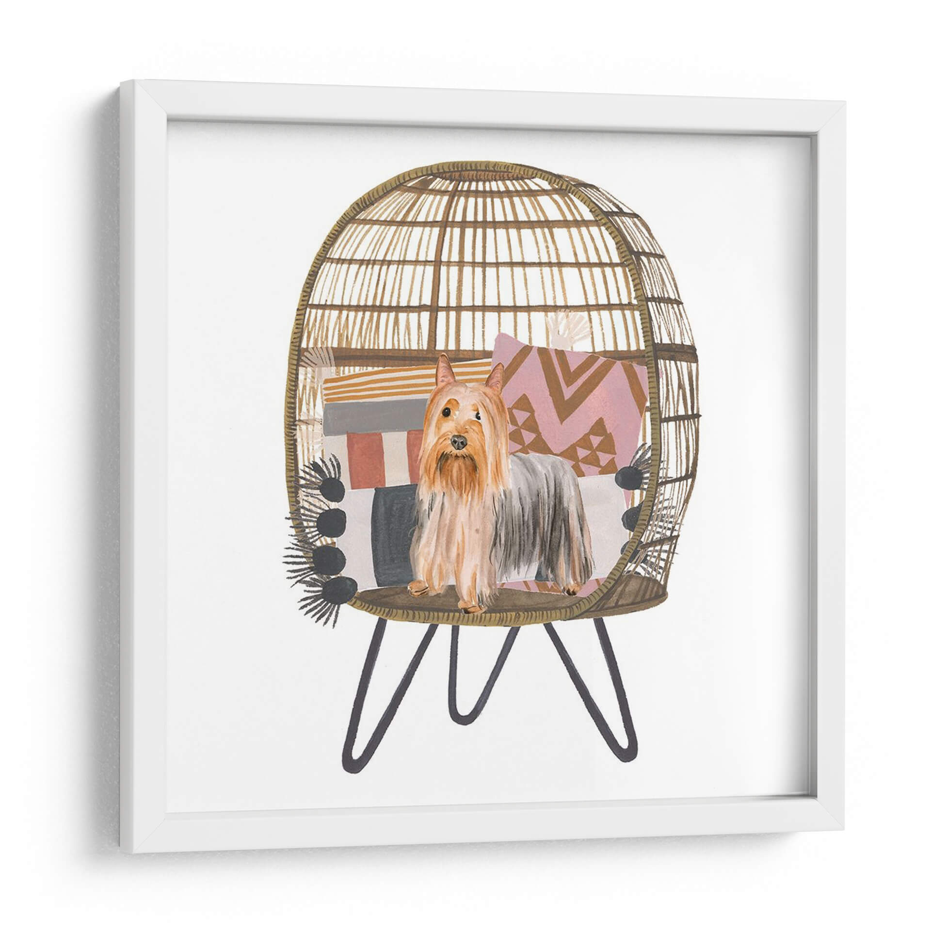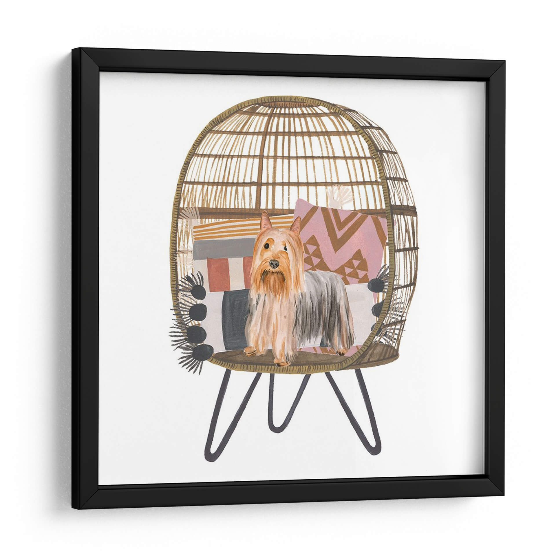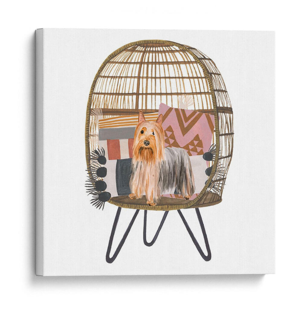 Aporta un toque de encanto y calidez a tu hogar con este cautivador cuadro decorativo de un "Pom Pom Cachorro I", obra de la talentosa artista Melissa Wang. Esta pieza, realizada con una delicada técnica de acuarela, captura la esencia juguetona y adorable de un terrier de raza pequeña, posado con elegancia dentro de una acogedora silla de mimbre decorada con cojines de patrones geométricos y una manta de flecos. La paleta de colores, dominada por tonos tierra, rosas pálidos y grises suaves, crea una atmósfera serena y acogedora, perfecta para cualquier rincón que necesite un acento de personalidad y dulzura. El estilo, una encantadora mezcla de ilustración y realismo, hace que este cuadro sea ideal para amantes de los animales y para quienes buscan añadir un elemento de ternura y estilo bohemio a su decoración. Imagina este cuadro aportando una sonrisa a tu sala de estar, un toque de alegría a tu oficina o un ambiente relajado a tu dormitorio. Es una pieza versátil que se integra a la perfección en estilos decorativos contemporáneos, bohemios o eclécticos, añadiendo carácter y una narrativa visual única. Un detalle perfecto para embellecer paredes y crear espacios llenos de vida y sentimiento.