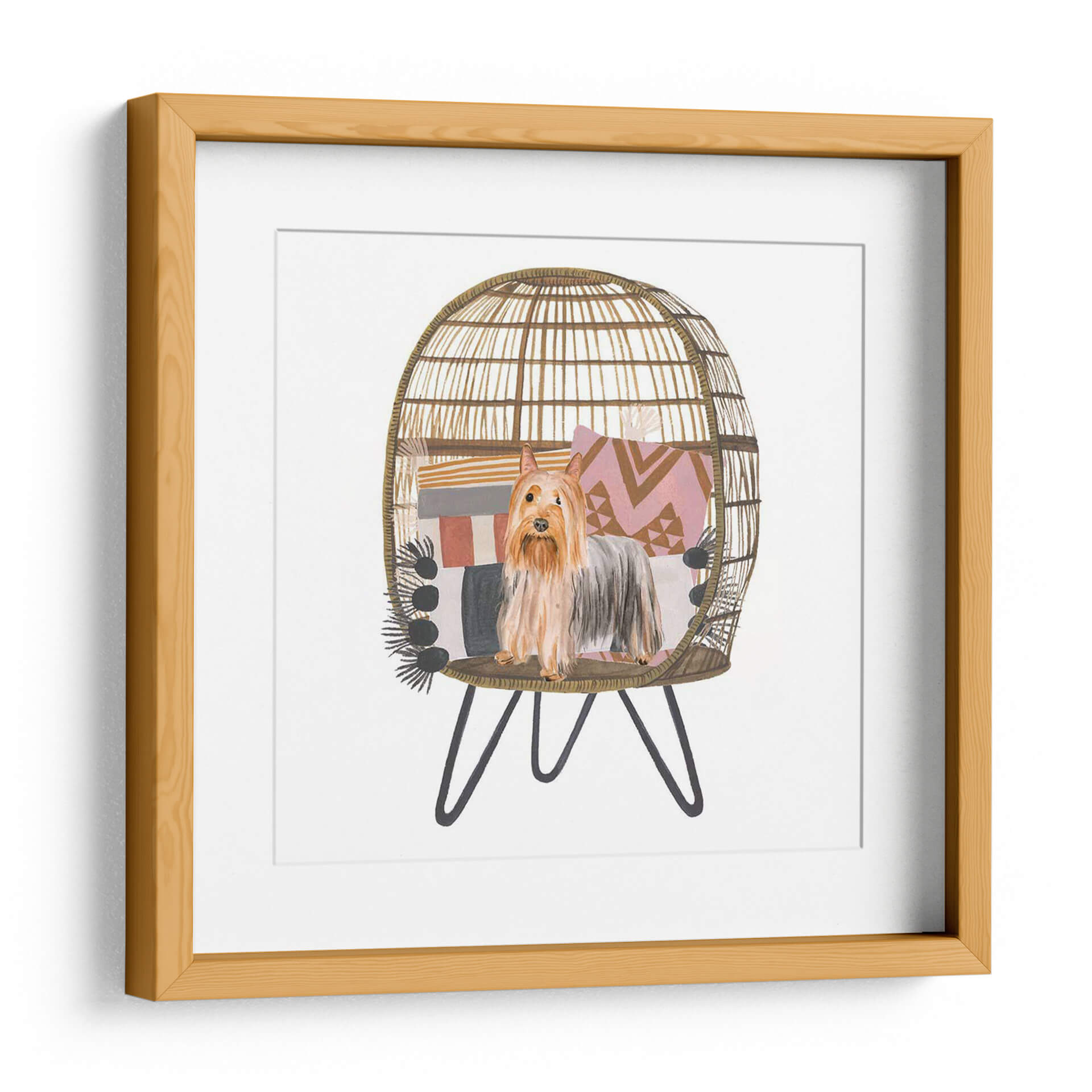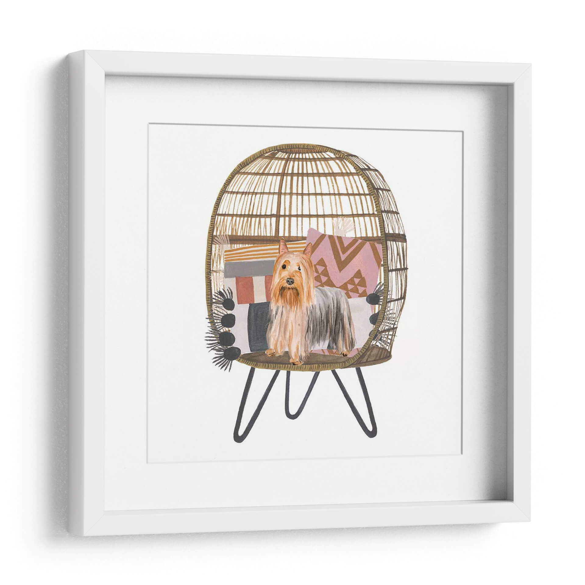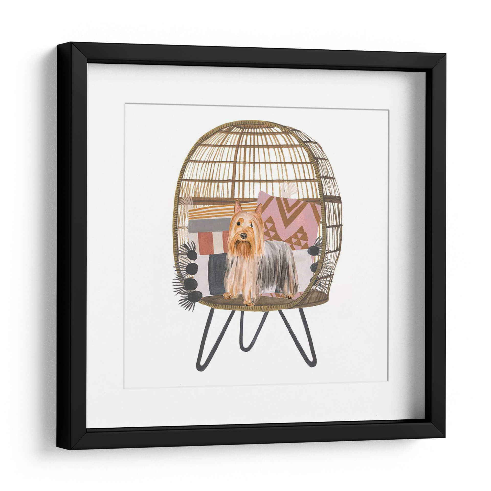 Aporta un toque de encanto y calidez a tu hogar con este cautivador cuadro decorativo de un "Pom Pom Cachorro I", obra de la talentosa artista Melissa Wang. Esta pieza, realizada con una delicada técnica de acuarela, captura la esencia juguetona y adorable de un terrier de raza pequeña, posado con elegancia dentro de una acogedora silla de mimbre decorada con cojines de patrones geométricos y una manta de flecos. La paleta de colores, dominada por tonos tierra, rosas pálidos y grises suaves, crea una atmósfera serena y acogedora, perfecta para cualquier rincón que necesite un acento de personalidad y dulzura. El estilo, una encantadora mezcla de ilustración y realismo, hace que este cuadro sea ideal para amantes de los animales y para quienes buscan añadir un elemento de ternura y estilo bohemio a su decoración. Imagina este cuadro aportando una sonrisa a tu sala de estar, un toque de alegría a tu oficina o un ambiente relajado a tu dormitorio. Es una pieza versátil que se integra a la perfección en estilos decorativos contemporáneos, bohemios o eclécticos, añadiendo carácter y una narrativa visual única. Un detalle perfecto para embellecer paredes y crear espacios llenos de vida y sentimiento.