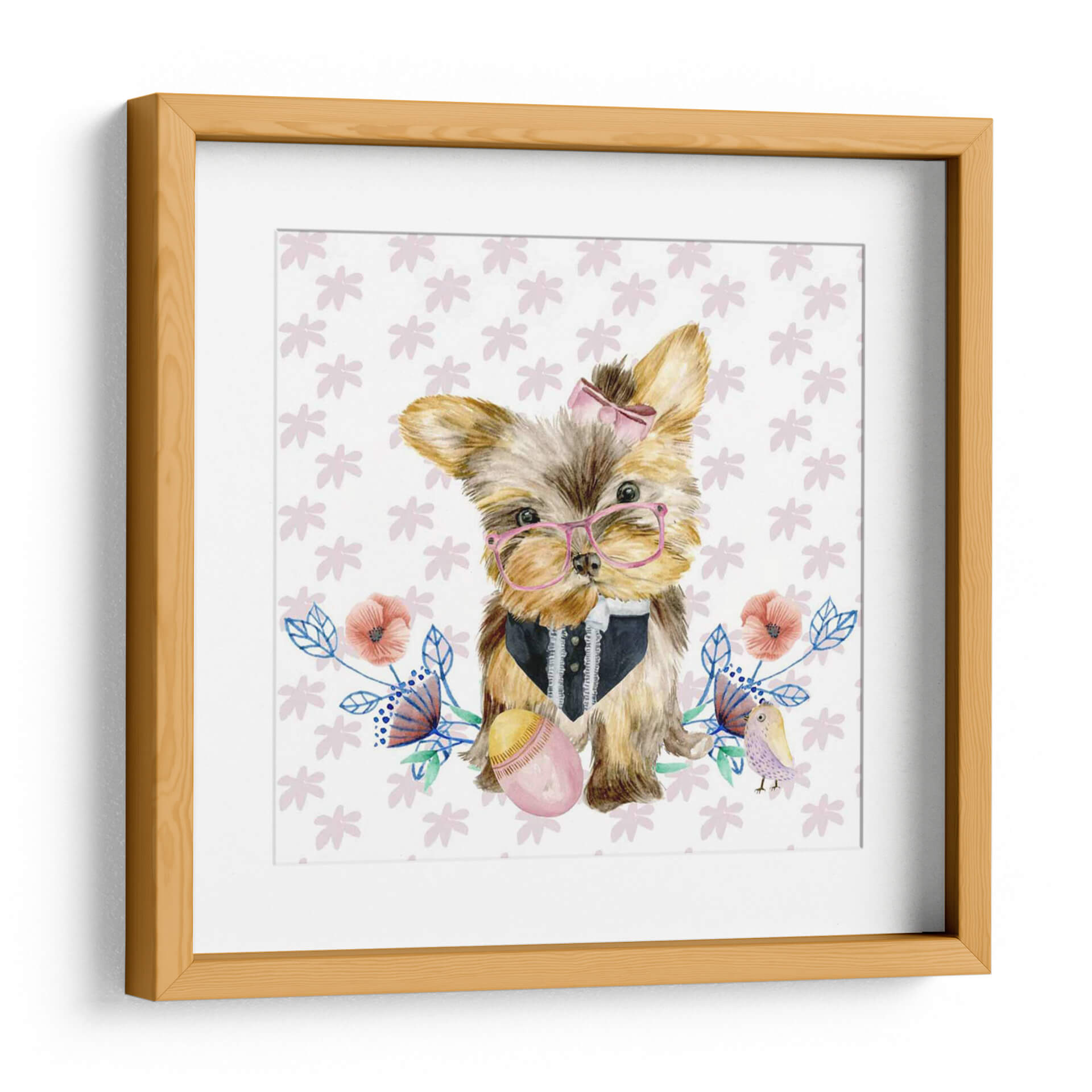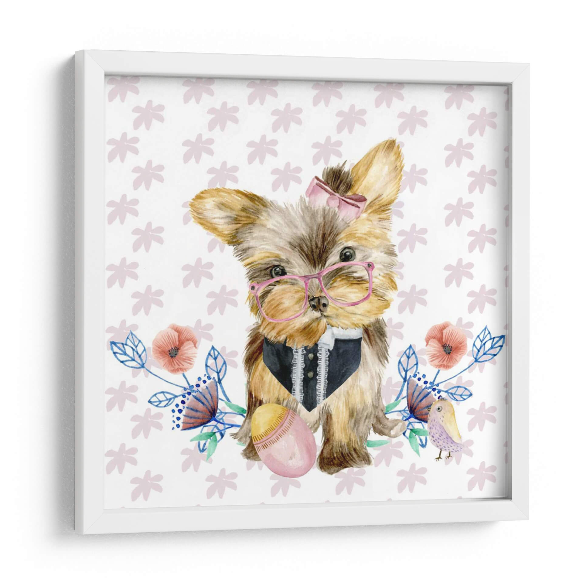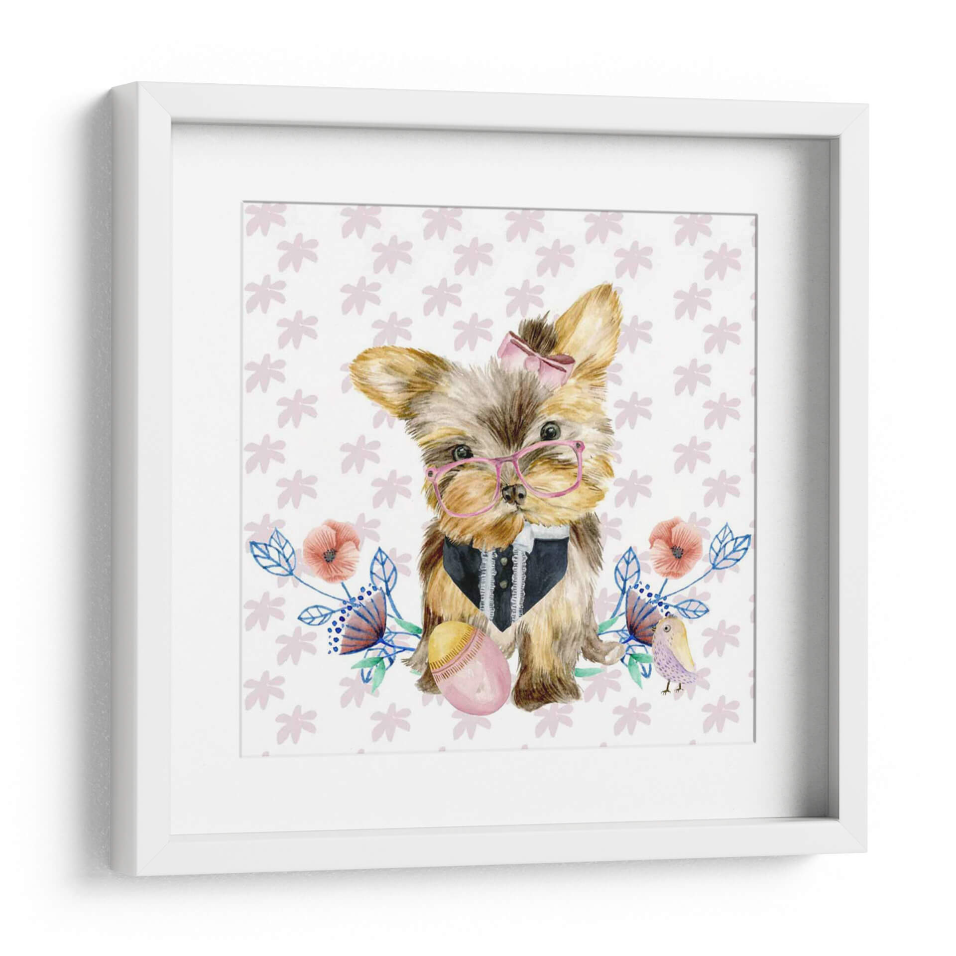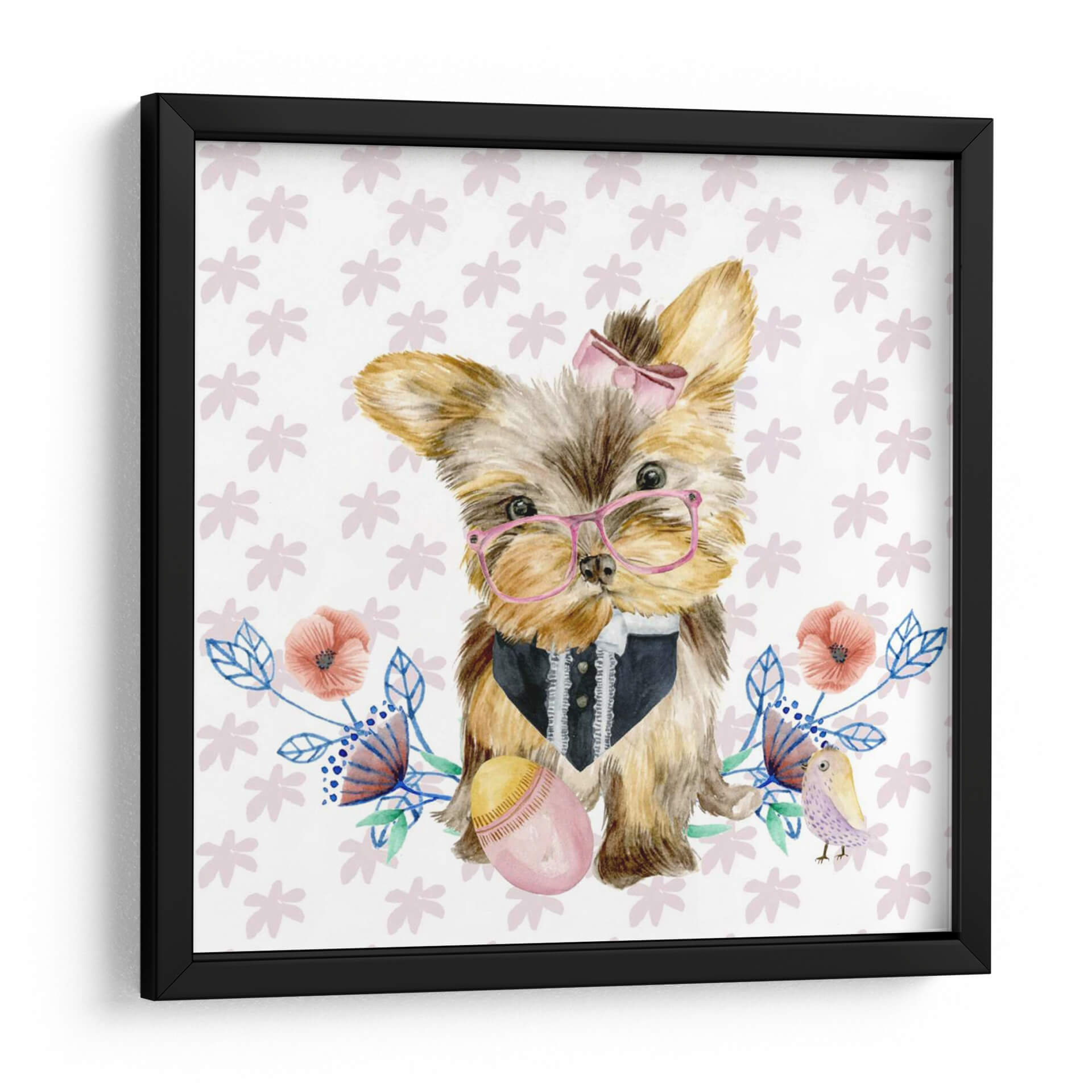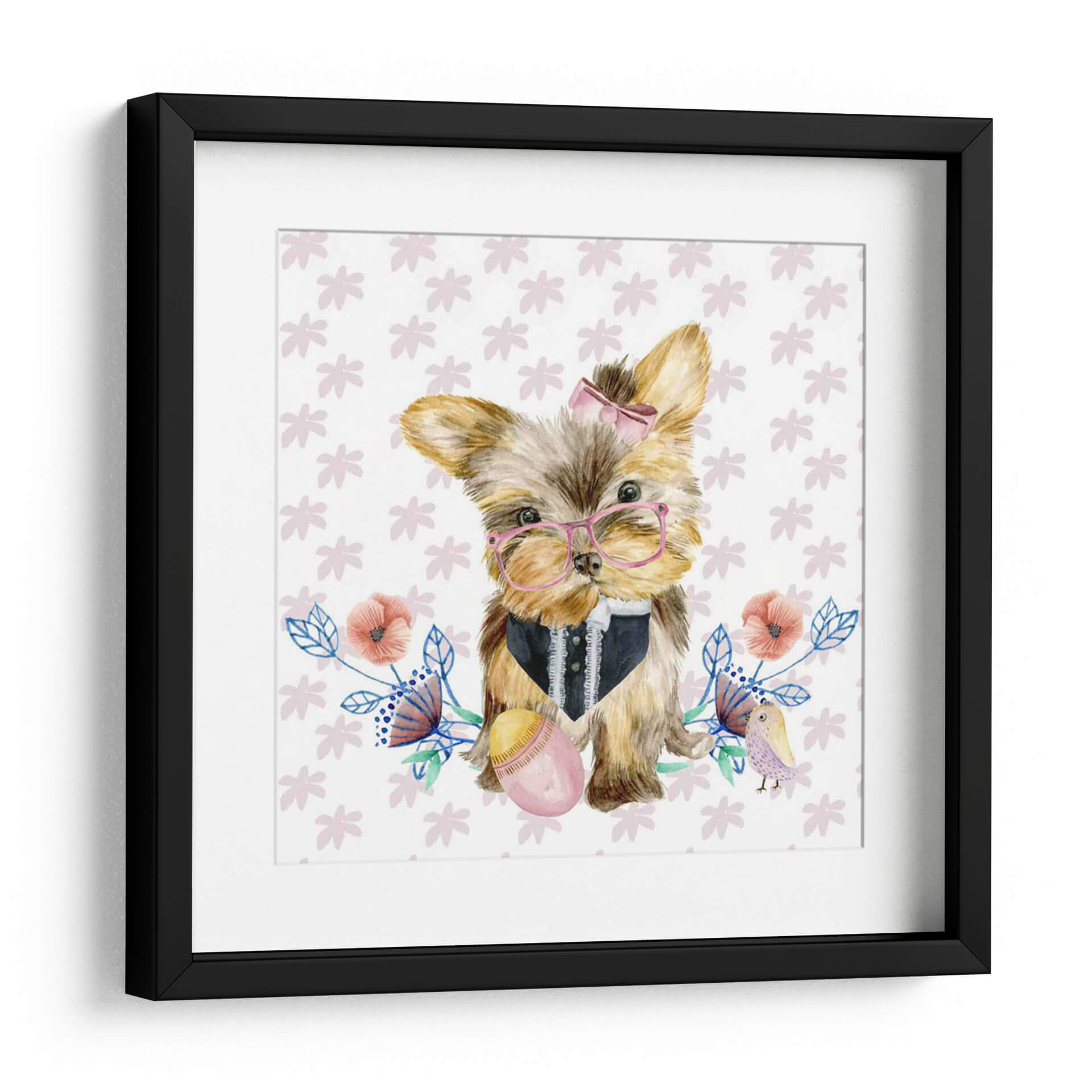 Este encantador cuadro decorativo, titulado 'Pups De Pascua Iv' y creado por Melissa Wang, captura la dulzura y la inocencia de un cachorro de Yorkshire Terrier adornado con gafas rosas y un elegante chaleco. La obra presenta una composición tierna y juguetona, con un fondo blanco salpicado de delicados motivos florales en tonos pastel y un pequeño pájaro posado cerca, evocando una atmósfera de alegría y primavera. Los colores suaves y la técnica acuarela utilizada por la artista crean una sensación de ligereza y encanto, haciendo de esta pieza una adición perfecta para cualquier espacio que busque un toque de calidez y personalidad. Ideal para decorar habitaciones infantiles, salas de estar acogedoras o incluso un espacio de trabajo que necesite una chispa de optimismo, este cuadro es una celebración de la ternura y el estilo. Su diseño único lo convierte en un punto focal adorable, capaz de arrancar sonrisas y generar conversaciones. Integra a la perfección elementos de arte contemporáneo con un toque de fantasía, asegurando que 'Pups De Pascua Iv' se convierta en un tesoro decorativo en tu hogar.