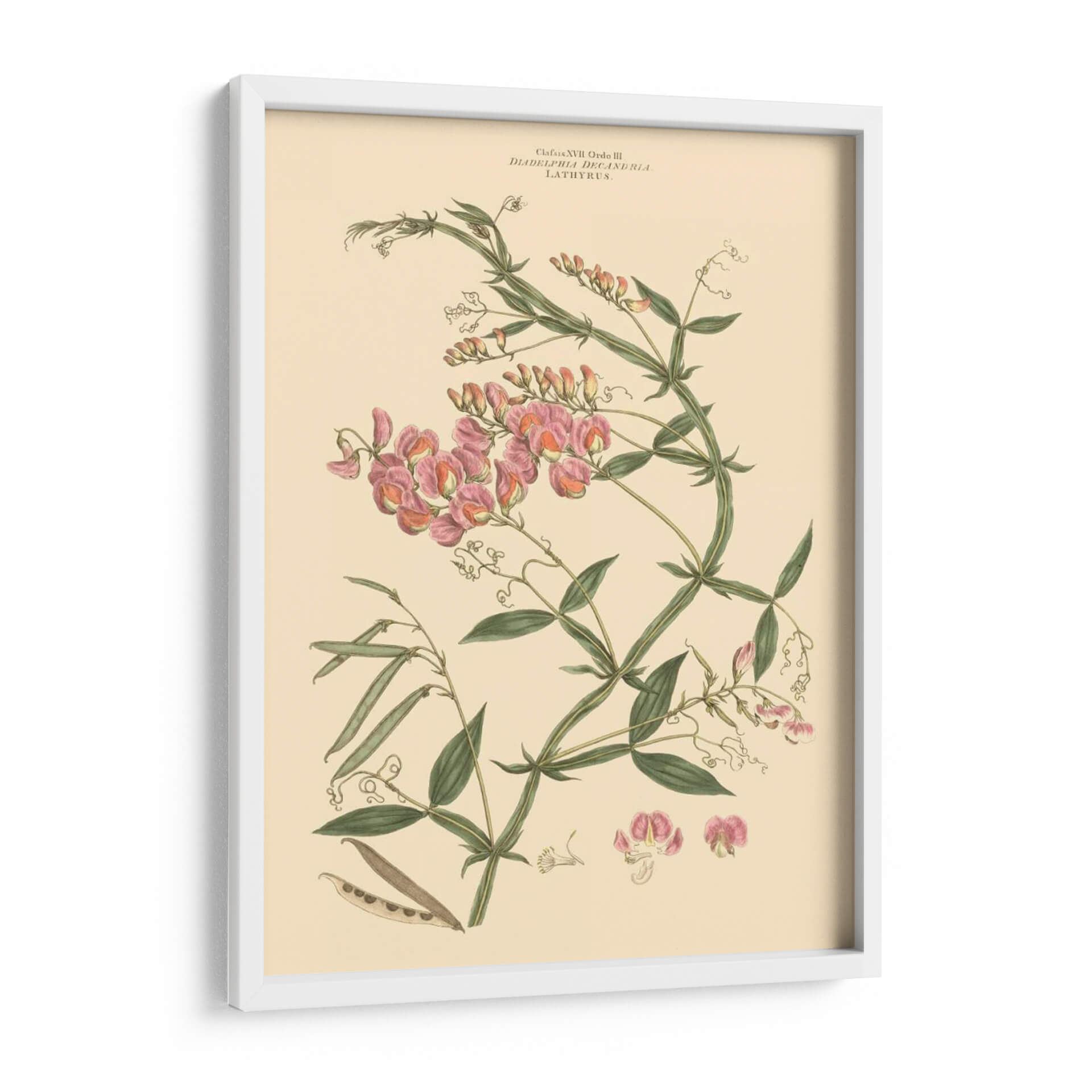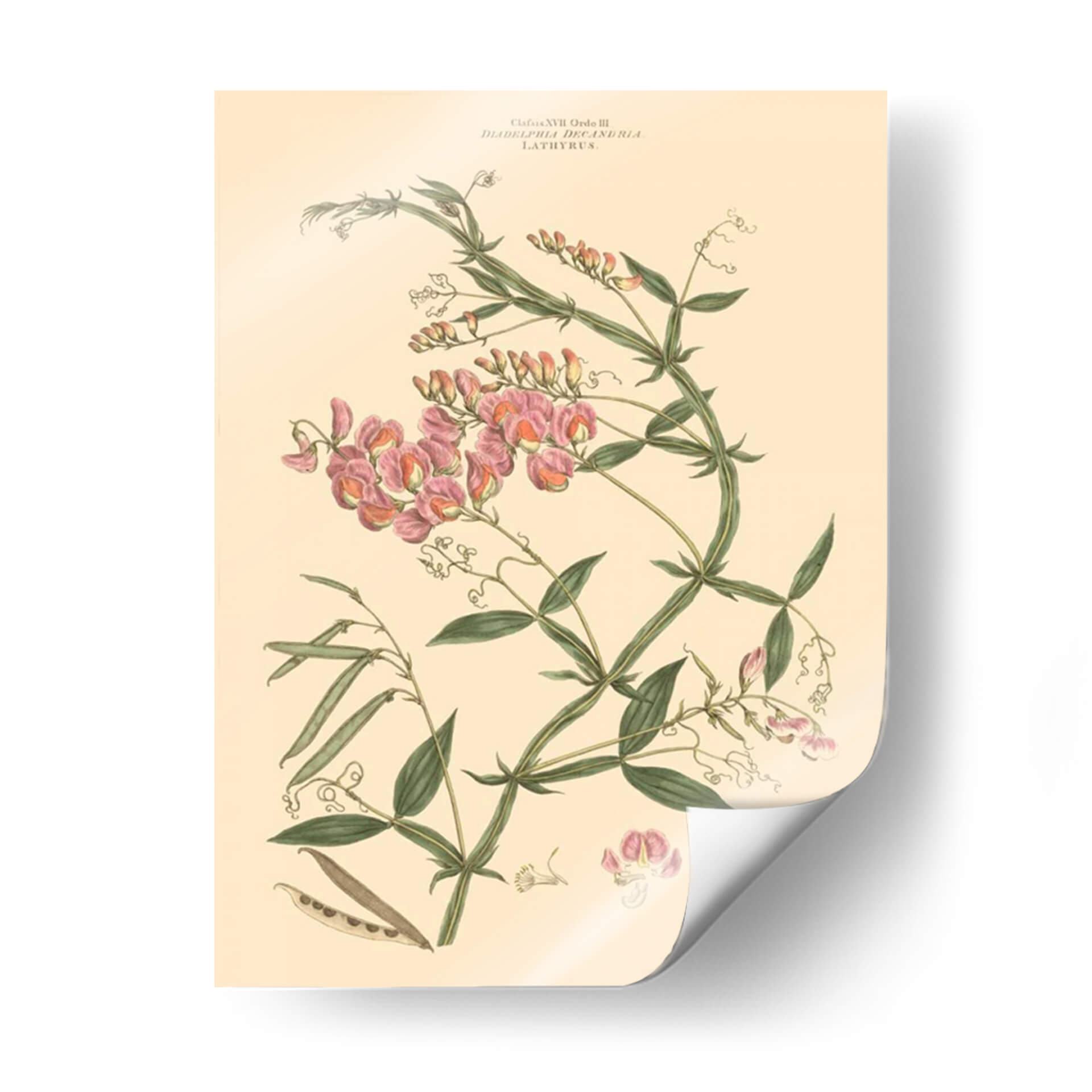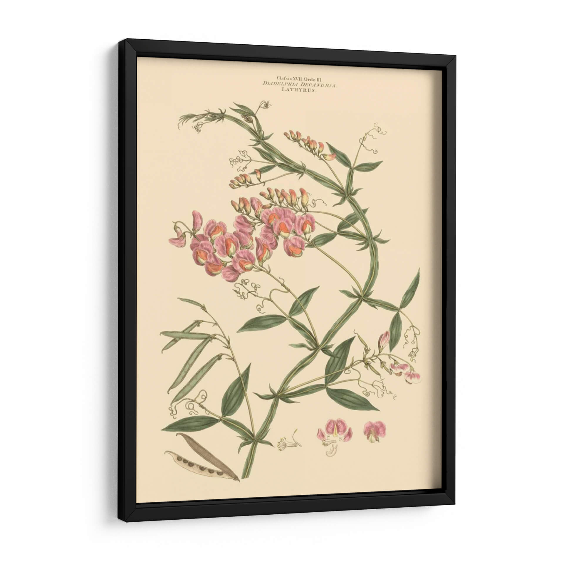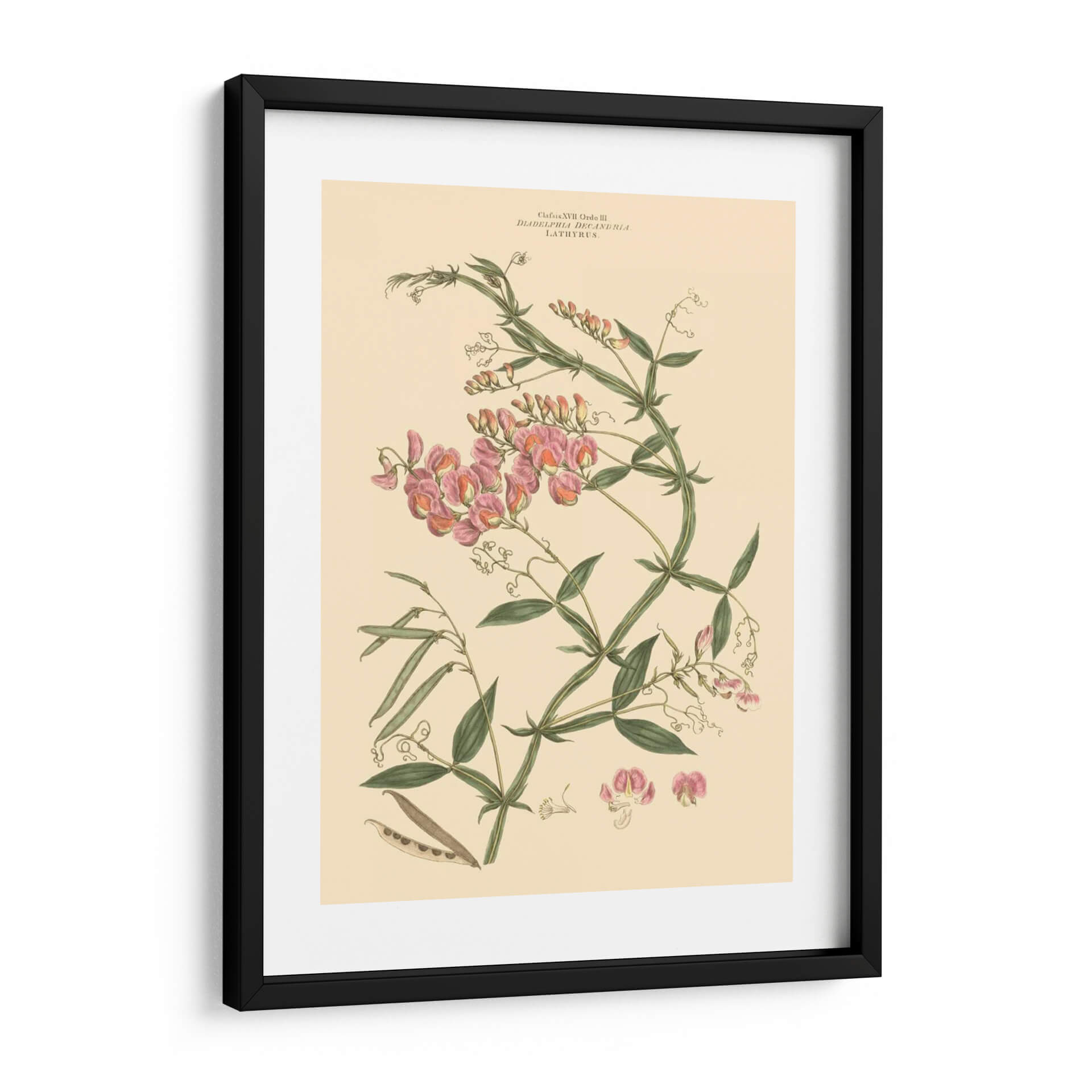 Embellece tu espacio con "Rubor Rosa Floral Vi", una exquisita obra de arte botánico que captura la delicadeza y la belleza intrínseca de la naturaleza. Esta pieza, atribuida al talentoso John Miller, presenta una detallada ilustración de flores de guisante de olor en tonos rosados y melocotón, entrelazadas con vibrantes hojas verdes y vainas. La paleta de colores suave, dominada por el crema del fondo y los matices rosados de las flores, crea una atmósfera de serenidad y elegancia, perfecta para cualquier rincón de tu hogar u oficina. Su estilo clásico, reminiscentes de las láminas botánicas vintage, añade un toque de sofisticación atemporal. Este cuadro decorativo es ideal para quienes buscan infundir calma y un aire de primavera a sus ambientes, ya sea en la sala de estar, el dormitorio o un estudio. La composición cuidadosa y los detalles finos de esta ilustración botánica la convierten en un punto focal encantador, capaz de dialogar con decoraciones tanto clásicas como contemporáneas, aportando un toque de refinamiento natural y un recordatorio de la belleza efímera de las flores.