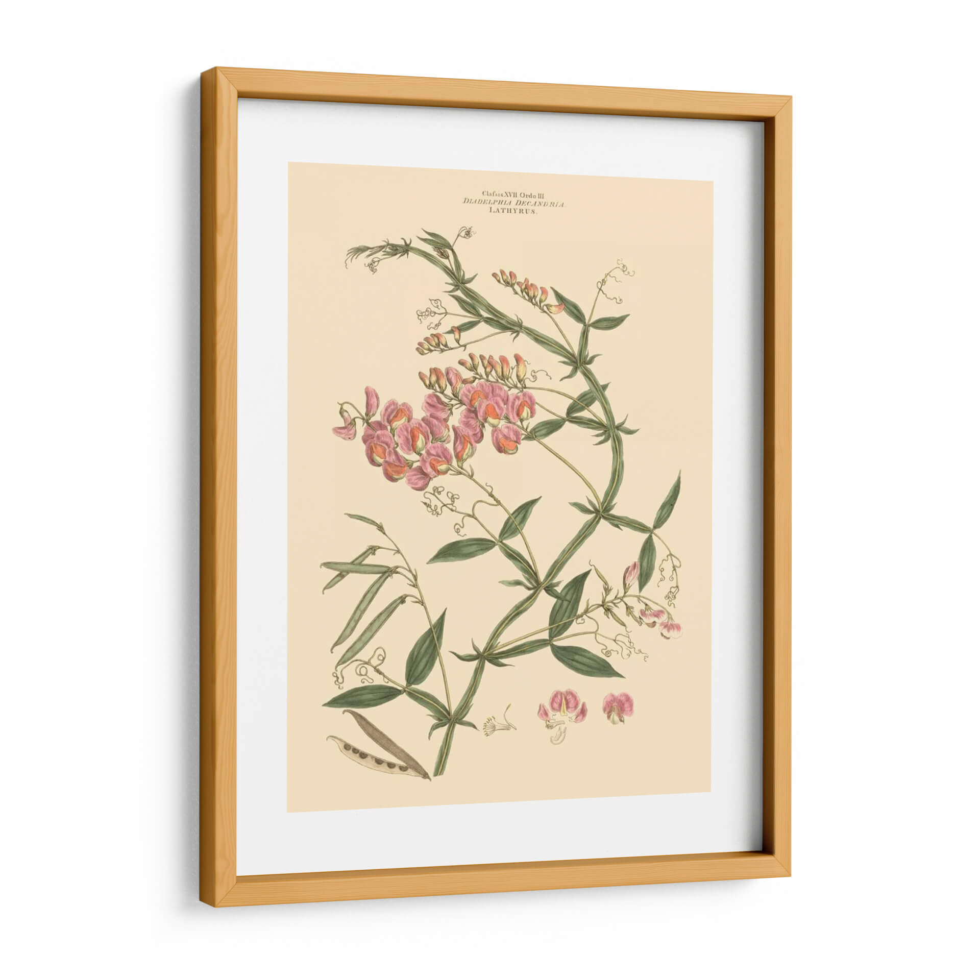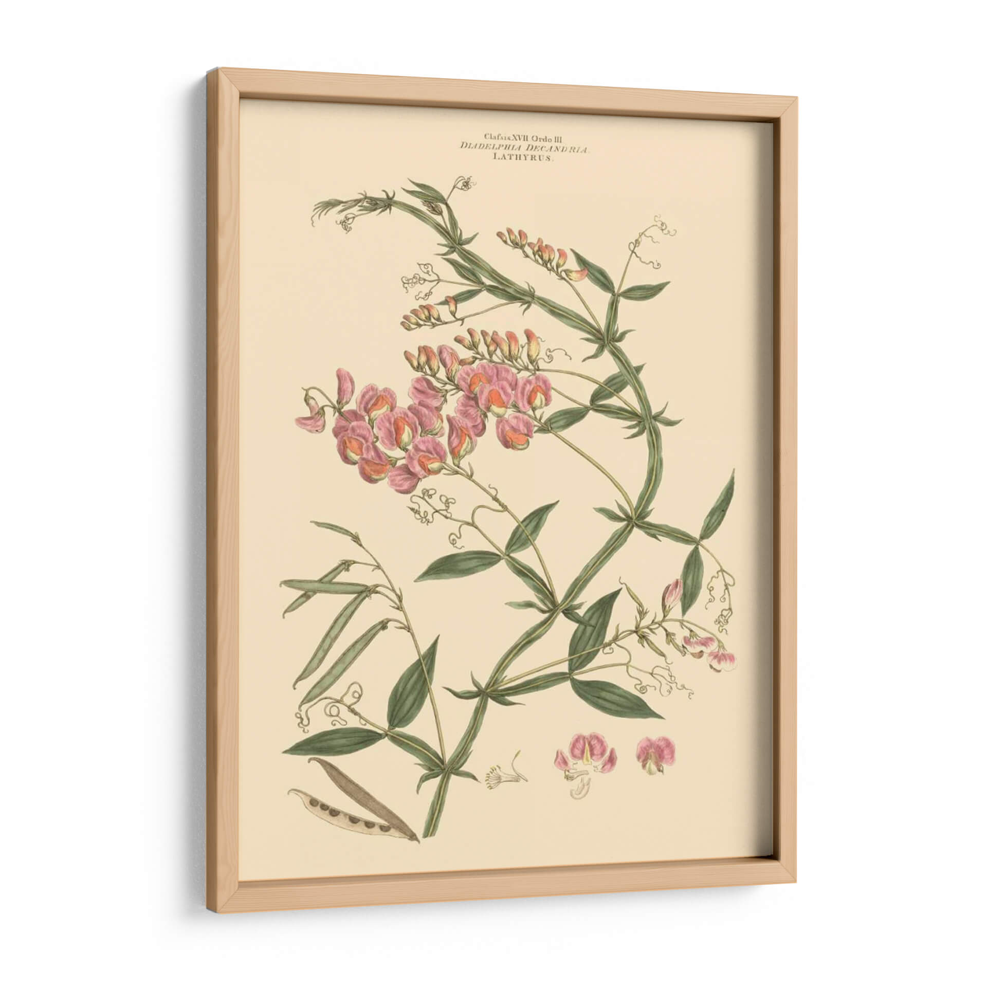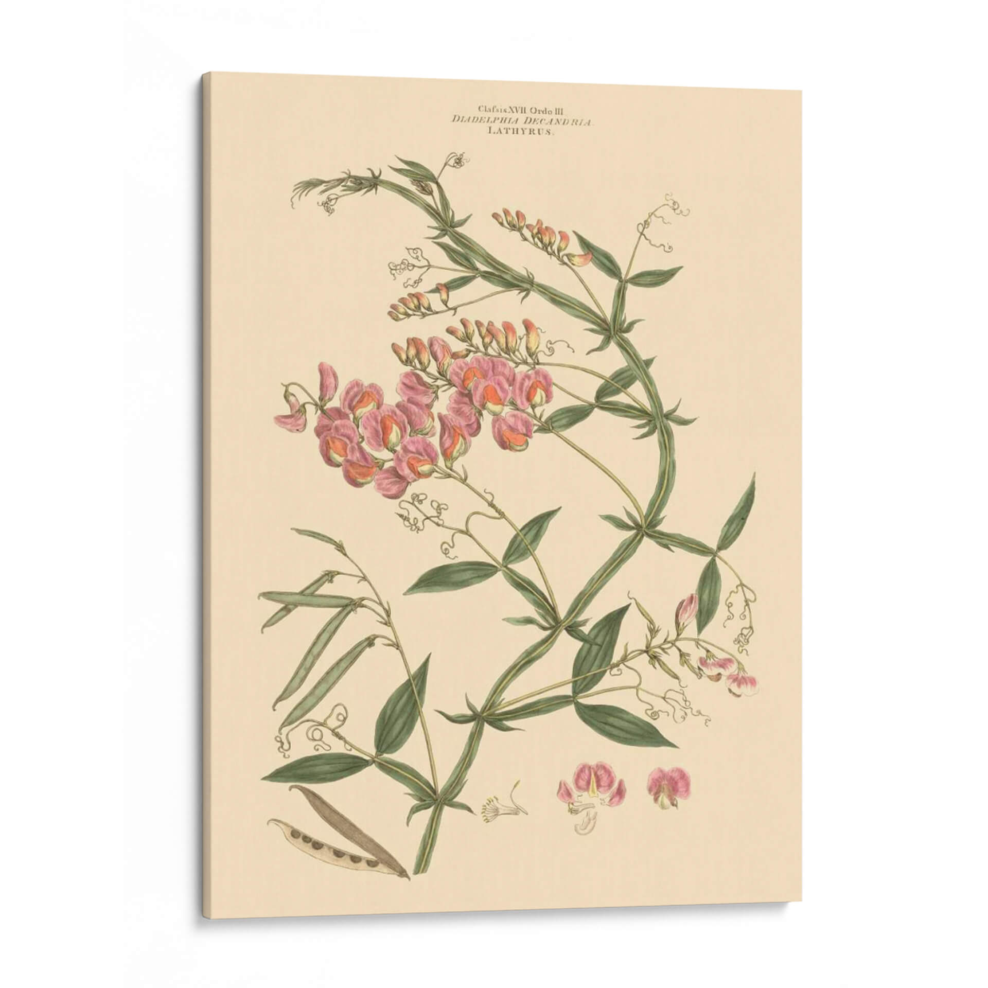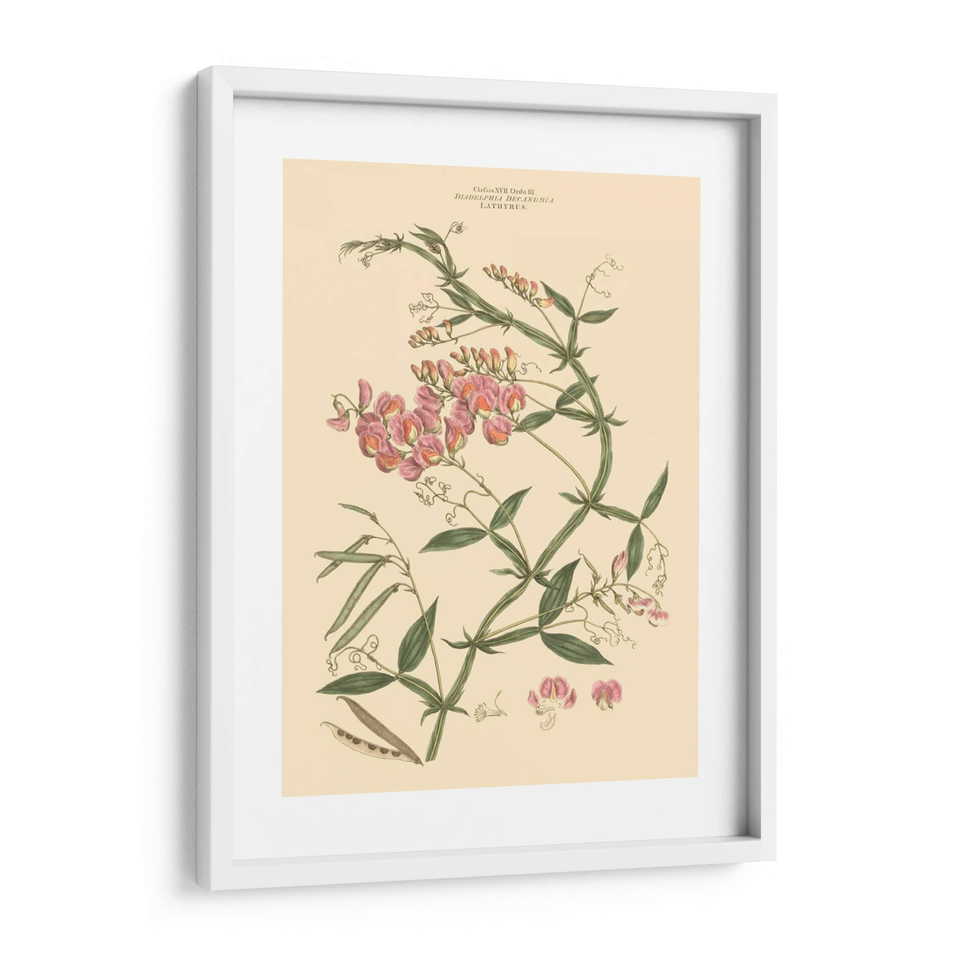 Embellece tu espacio con "Rubor Rosa Floral Vi", una exquisita obra de arte botánico que captura la delicadeza y la belleza intrínseca de la naturaleza. Esta pieza, atribuida al talentoso John Miller, presenta una detallada ilustración de flores de guisante de olor en tonos rosados y melocotón, entrelazadas con vibrantes hojas verdes y vainas. La paleta de colores suave, dominada por el crema del fondo y los matices rosados de las flores, crea una atmósfera de serenidad y elegancia, perfecta para cualquier rincón de tu hogar u oficina. Su estilo clásico, reminiscentes de las láminas botánicas vintage, añade un toque de sofisticación atemporal. Este cuadro decorativo es ideal para quienes buscan infundir calma y un aire de primavera a sus ambientes, ya sea en la sala de estar, el dormitorio o un estudio. La composición cuidadosa y los detalles finos de esta ilustración botánica la convierten en un punto focal encantador, capaz de dialogar con decoraciones tanto clásicas como contemporáneas, aportando un toque de refinamiento natural y un recordatorio de la belleza efímera de las flores.