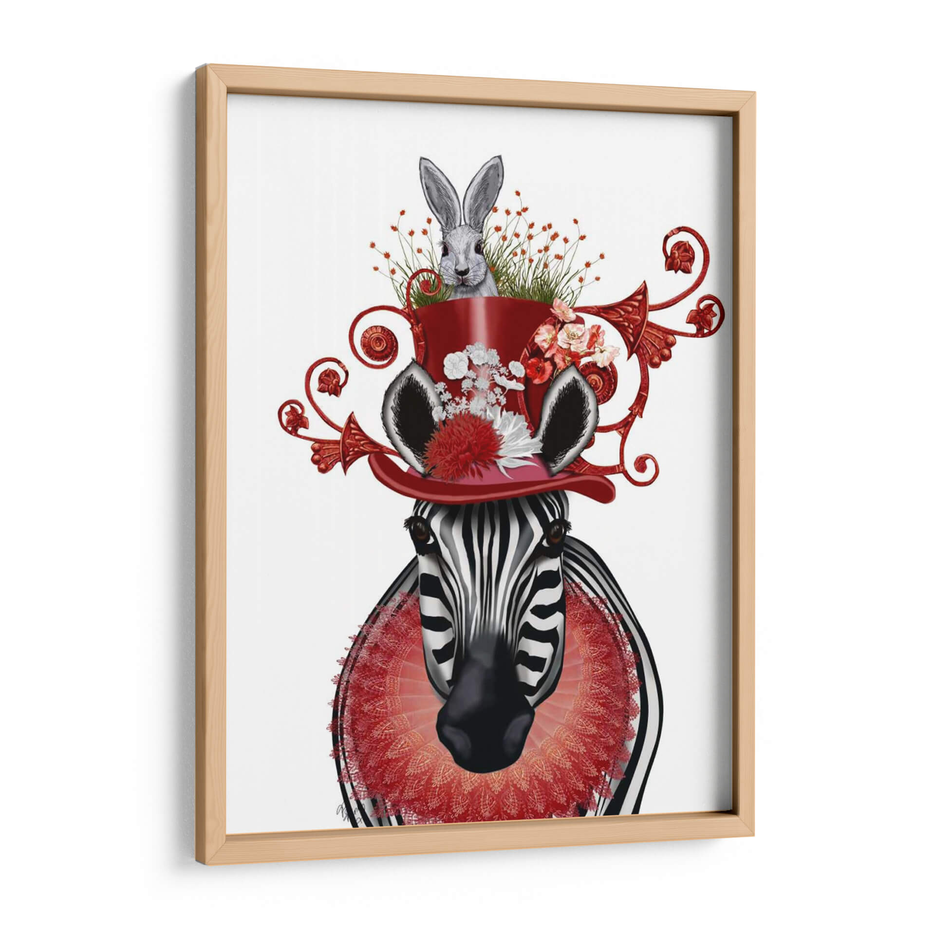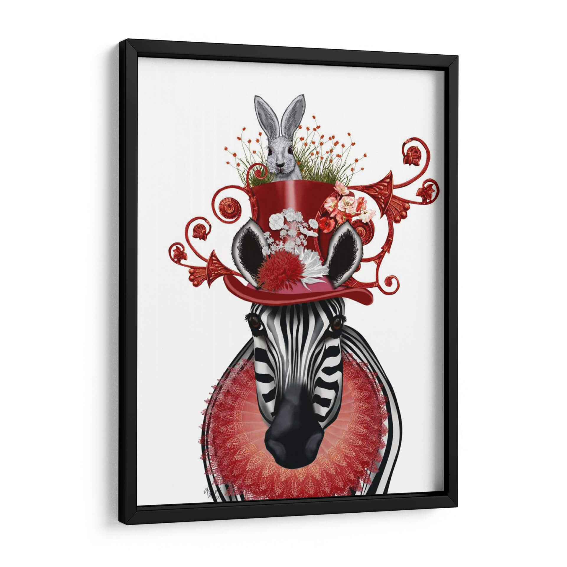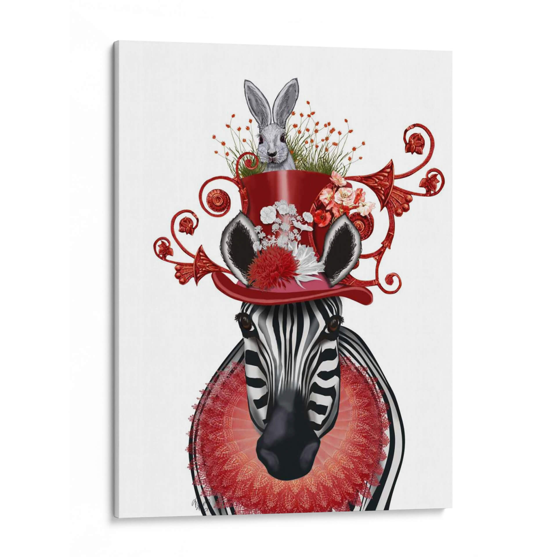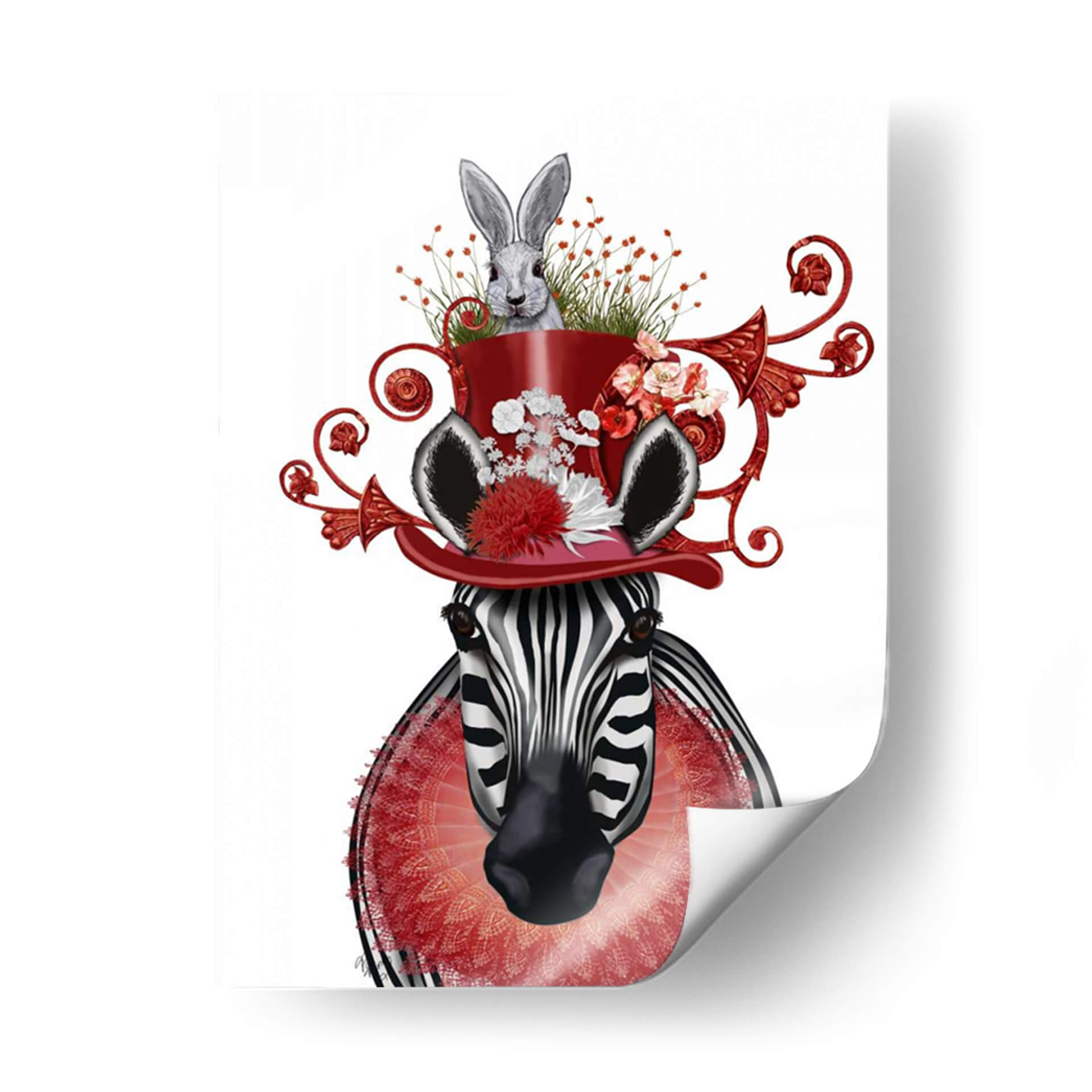 Sumérgete en un mundo de fantasía y estilo con este cautivador cuadro decorativo, "Sombrero De Cebra Y Conejito", del artista Fab Funky. Esta obra maestra digital presenta una cebra de mirada penetrante coronada por un vibrante sombrero rojo, del cual emerge un tierno conejito rodeado de flores y vegetación exuberante. La composición es audaz y surrealista, mezclando elementos de la naturaleza con un toque de elegancia circense. Los colores predominantes, el blanco y negro de la cebra contrastan maravillosamente con el rojo intenso del sombrero y los detalles florales en tonos rosados y blancos, creando una paleta visualmente impactante y alegre. El estilo artístico, una fusión de realismo y fantasía, invita a la contemplación y despierta la imaginación, haciendo de este cuadro una pieza central perfecta para cualquier espacio que busque un toque de originalidad y sofisticación. Ideal para salas de estar modernas, estudios creativos o dormitorios que deseen expresar personalidad y un sentido del humor refinado, este cuadro decorativo "Sombrero De Cebra Y Conejito" es más que una simple decoración; es una declaración de estilo y un portal a un universo de ensueño.