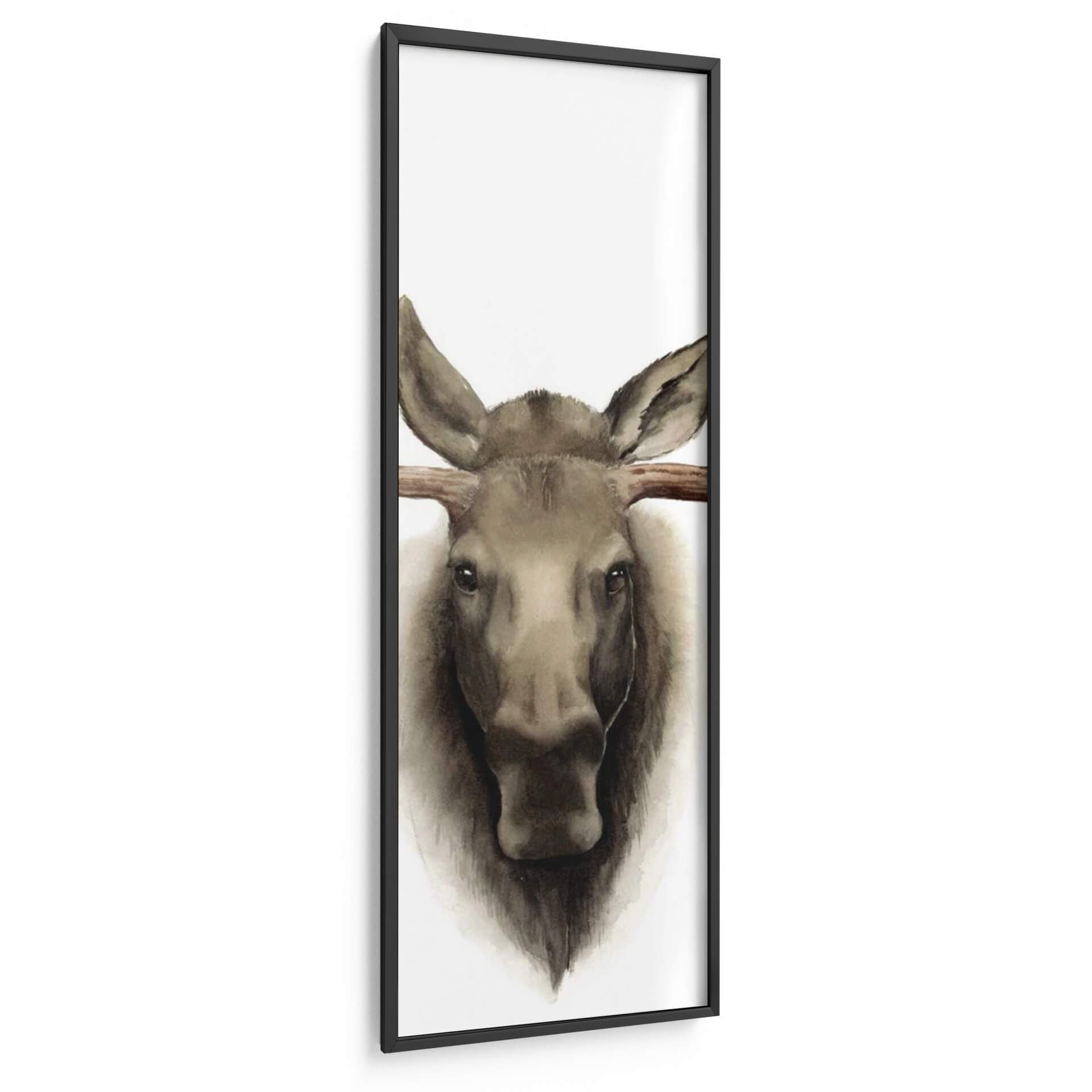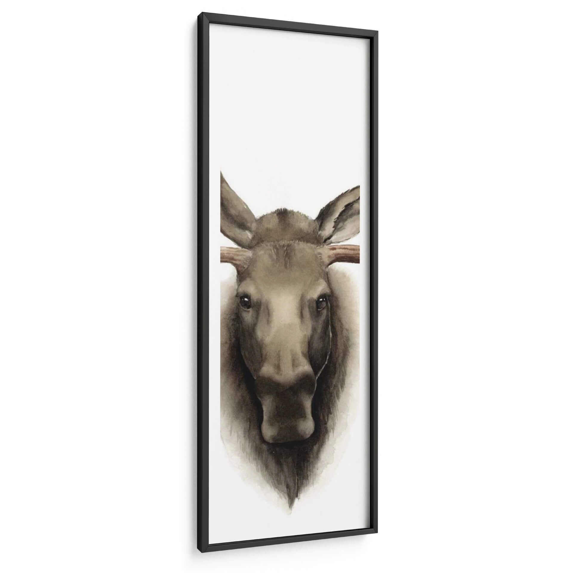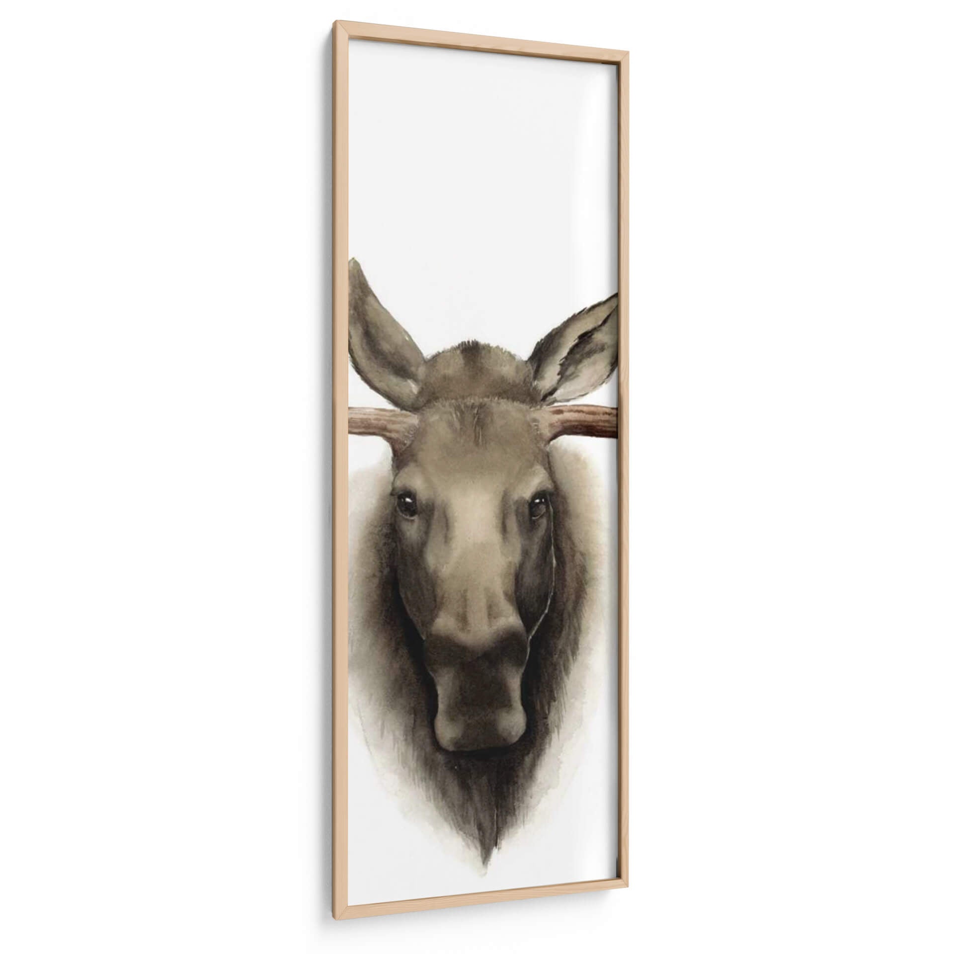 Atrae la majestuosidad de la naturaleza a tu hogar con este cautivador cuadro decorativo de un alce, "Tríptico Alce II" de Grace Popp. Esta obra de arte, ejecutada con una delicada técnica de acuarela, presenta un primer plano del rostro de un imponente alce, capturando su mirada penetrante y la textura de su pelaje con pinceladas suaves y fluidas. La paleta de colores se centra en tonos tierra, marrones y grises, creando una atmósfera serena y natural que evoca la tranquilidad de los bosques. La composición vertical y minimalista, con un fondo blanco o de muy baja saturación, permite que el sujeto principal sea el protagonista indiscutible, aportando un toque de elegancia rústica a cualquier espacio. Ideal para salones, estudios o dormitorios, este tríptico decorativo es perfecto para quienes buscan infundir sus ambientes con la fuerza serena de la vida silvestre y un estilo contemporáneo. Añade una pieza de arte única que conecte con la esencia salvaje y aporta sofisticación a tu decoración.