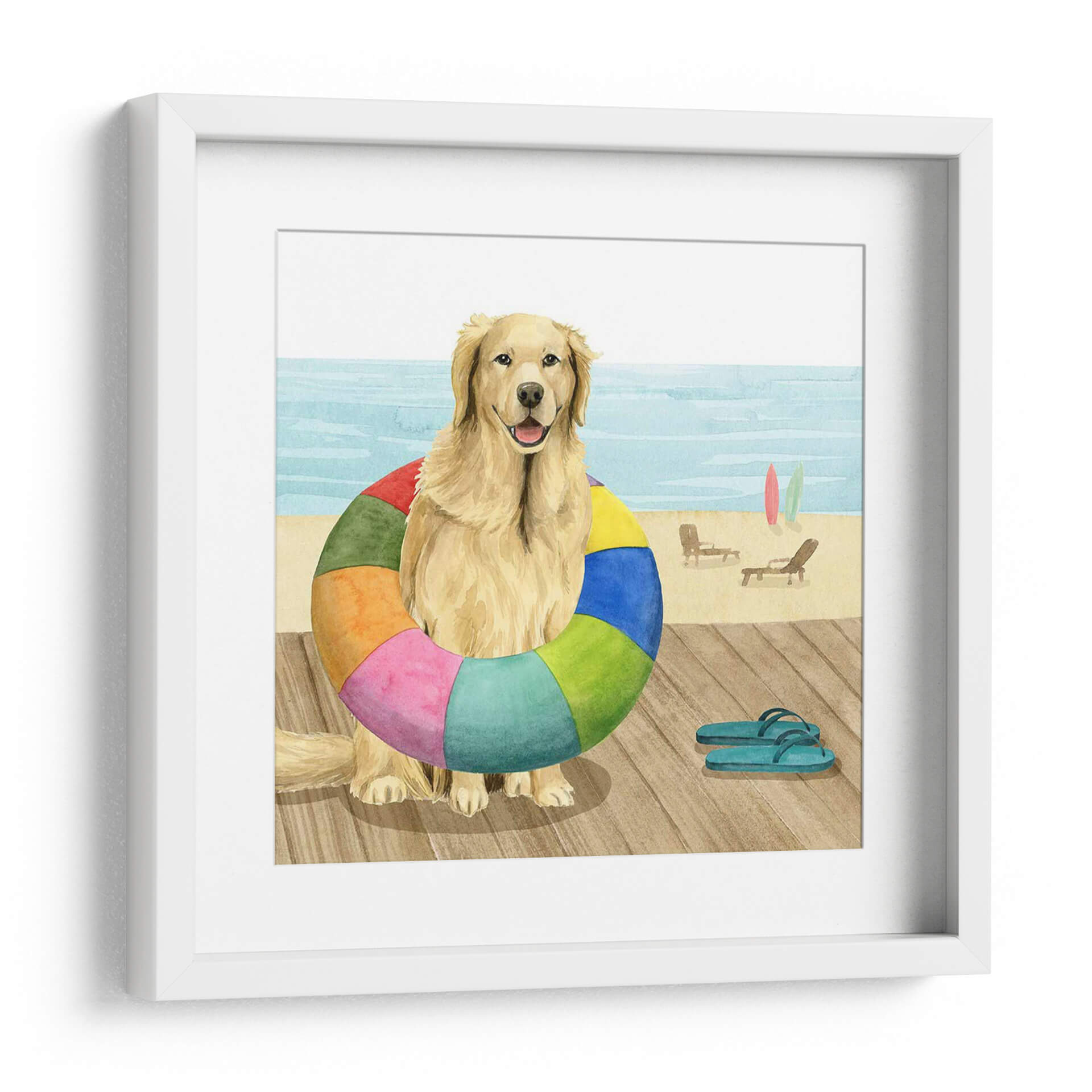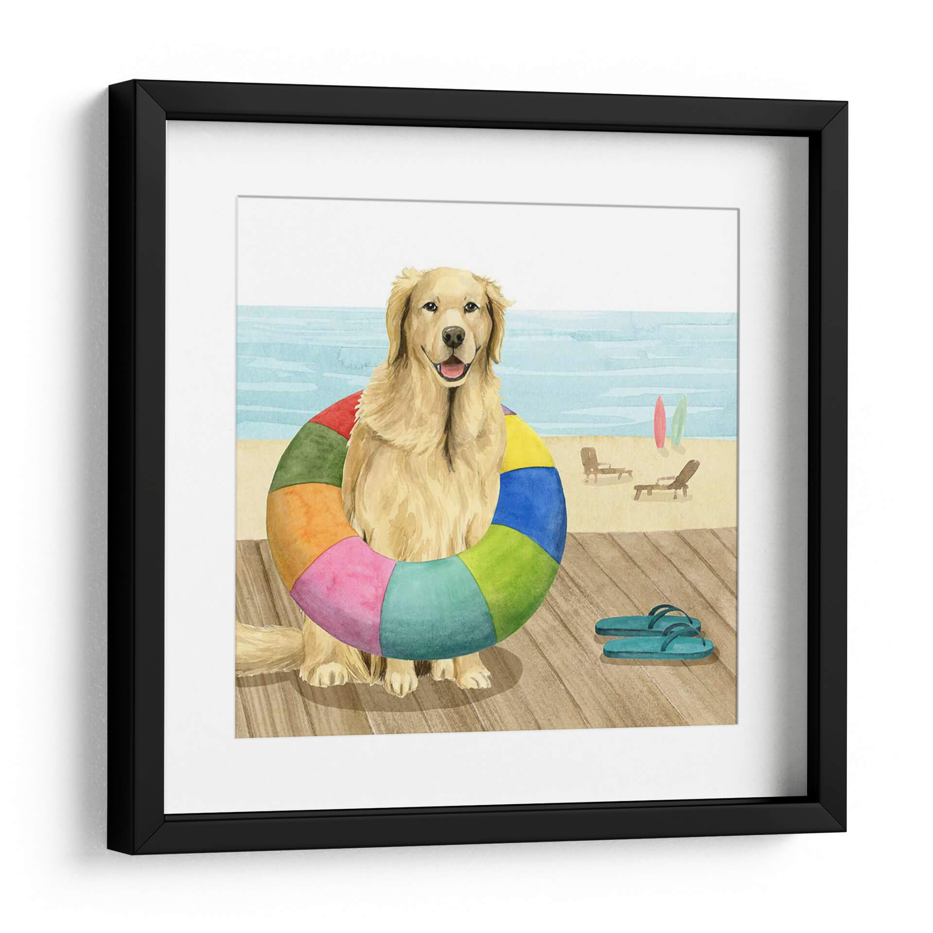 Celebra la alegría del verano y la compañía incondicional con "Vamos Por Un Paseo Marítimo III", una encantadora obra de arte de Grace Popp. Esta pieza captura la esencia de un día perfecto en la playa, protagonizada por un adorable Golden Retriever sentado con un salvavidas multicolor alrededor de su cuello. El estilo de acuarela suave evoca una sensación de nostalgia y calidez, mientras que la paleta de colores vibrantes, que incluye azules celestes del océano, arenas doradas y los alegres tonos del salvavidas, inyecta vitalidad y optimismo en cualquier espacio. La composición, que presenta al perro mirando directamente al espectador con una expresión amigable, crea una conexión inmediata. El fondo sutilmente sugerido de una playa con tumbonas y tablas de surf añade contexto sin distraer del sujeto principal. Este cuadro decorativo es perfecto para añadir un toque de diversión y serenidad a salones, dormitorios, estudios o incluso espacios infantiles. Ideal para amantes de los perros, entusiastas de la playa y cualquiera que busque una pieza de arte alegre y llena de personalidad. Su estilo contemporáneo con un toque acuarela lo hace versátil para una variedad de decoraciones interiores, desde la costera hasta la moderna.