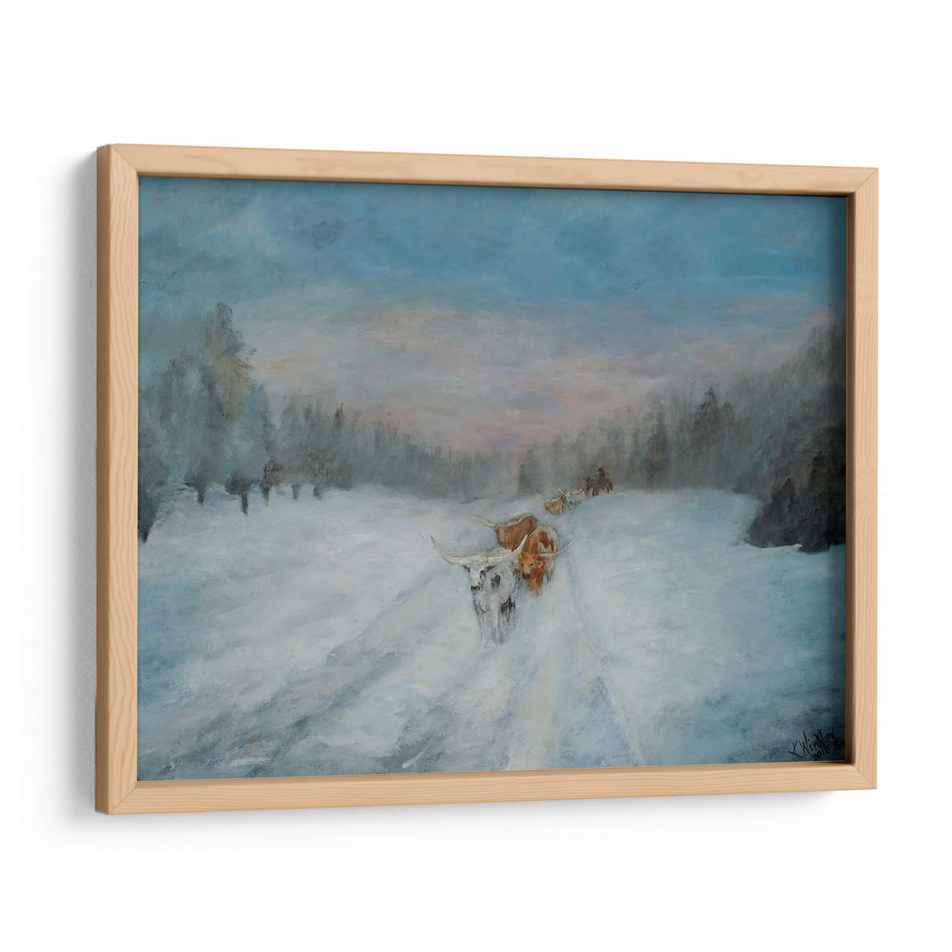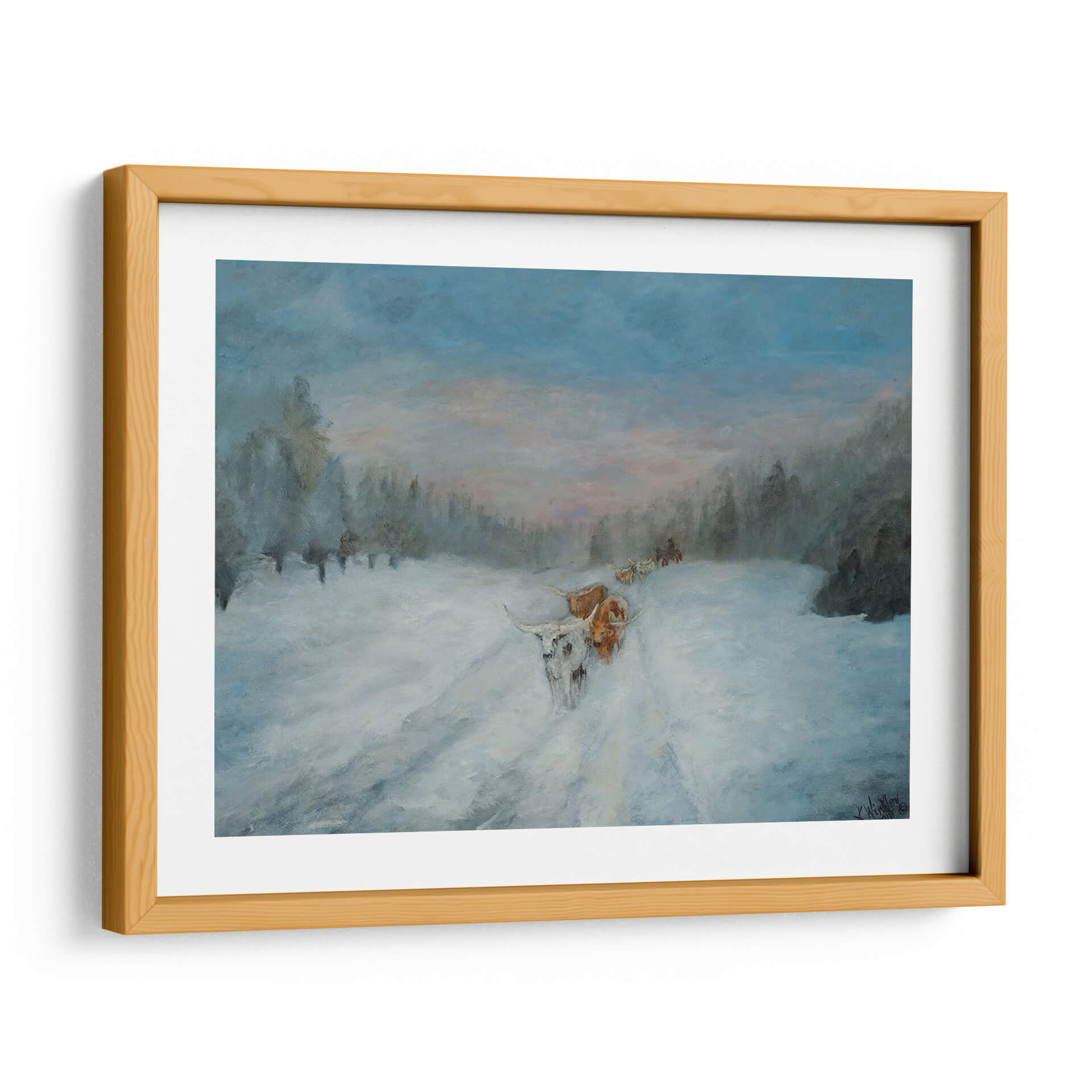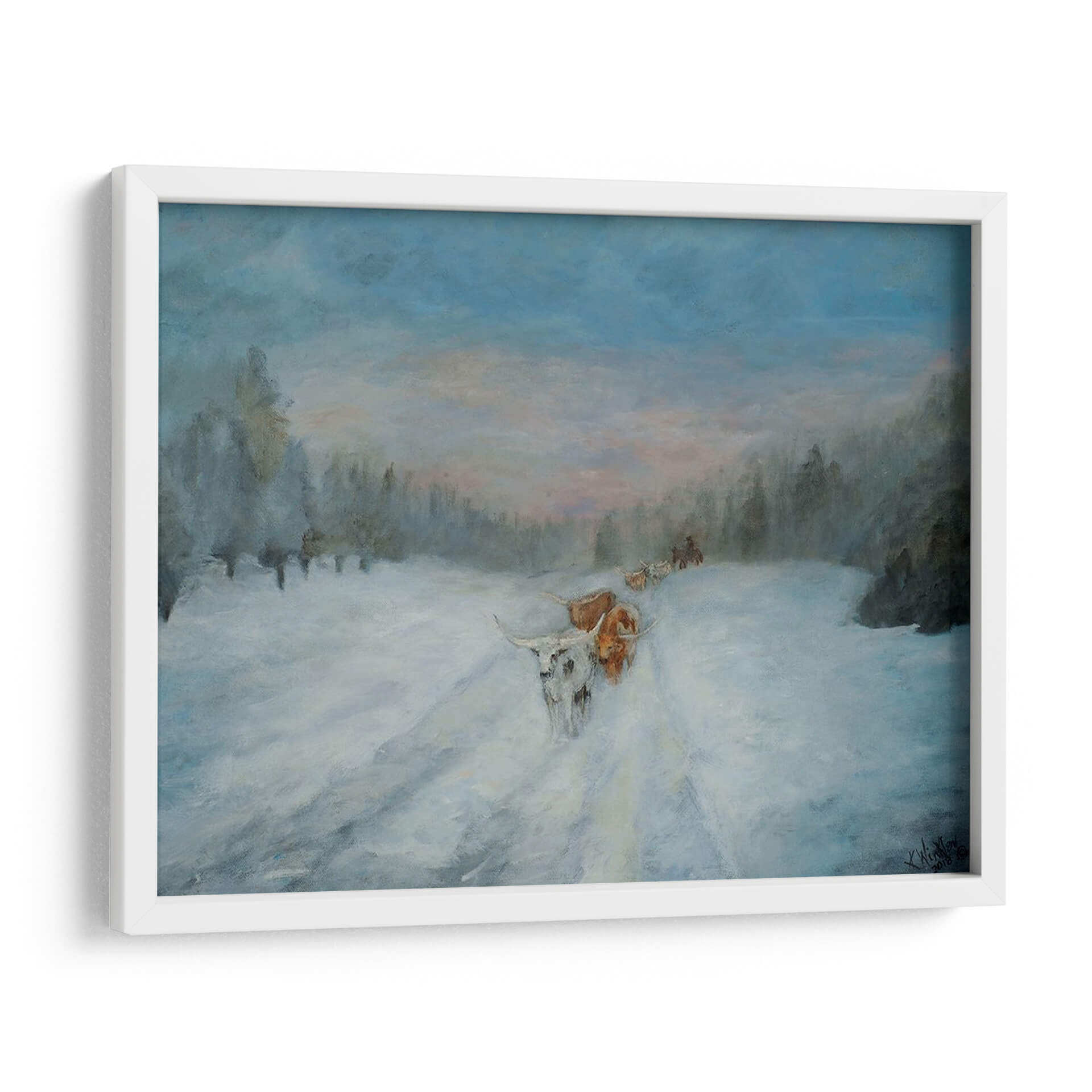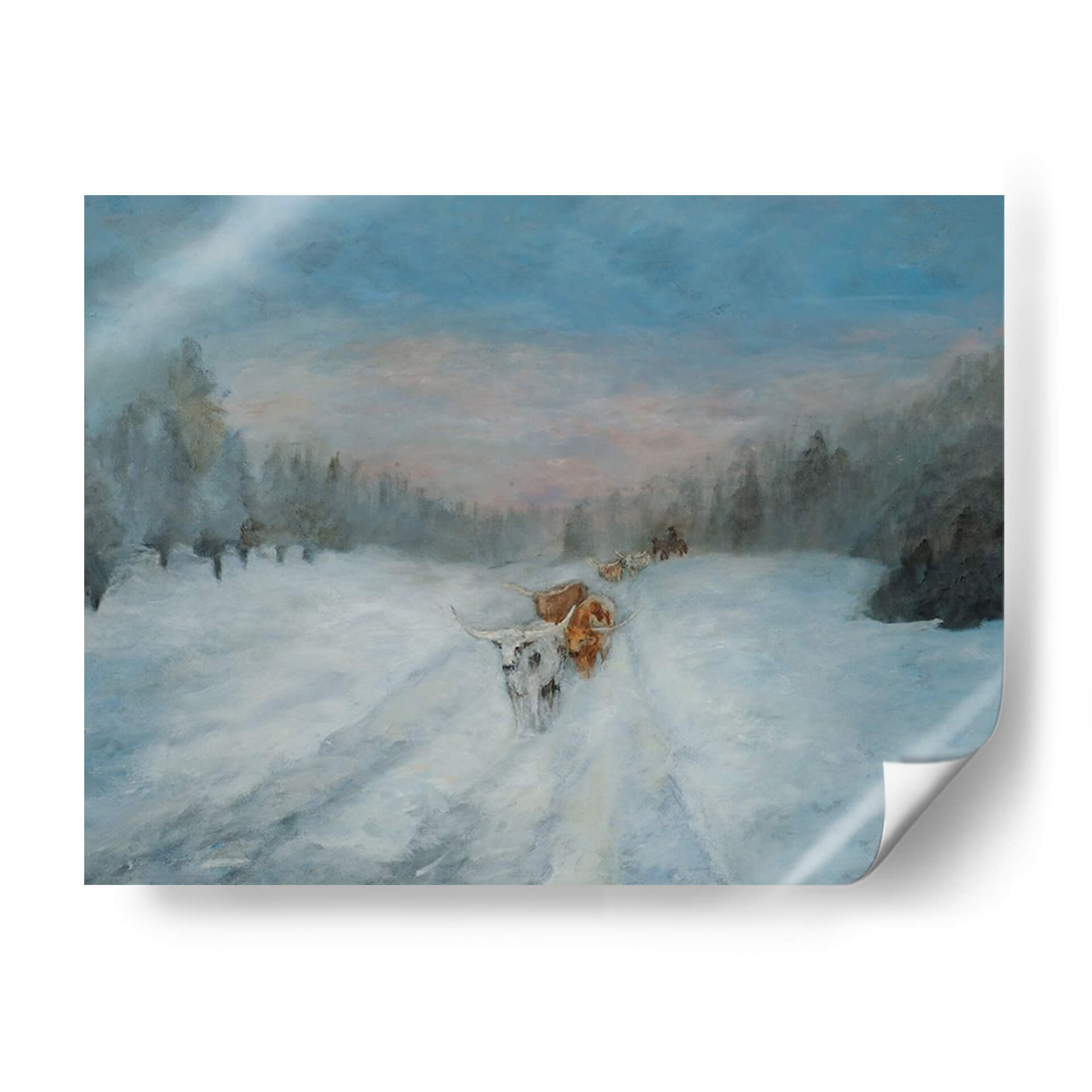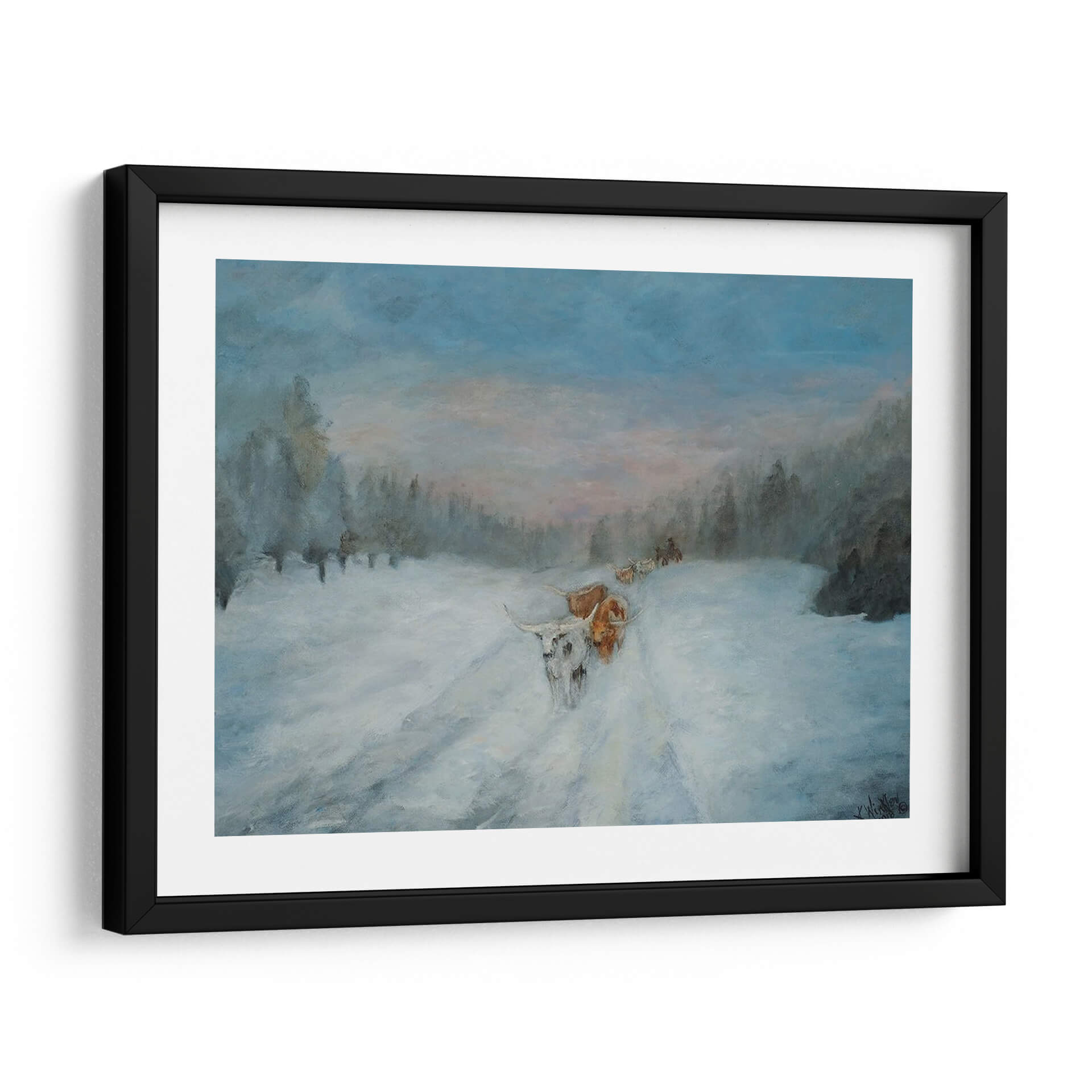 Sumérgete en la serena belleza del invierno con "Viaje a Través de la Nieve IV", una cautivadora obra de arte de Kathy Winkler. Esta pieza evoca la majestuosidad de un paisaje nevado, donde la luz tenue del amanecer o el atardecer baña el escena con tonos pastel que contrastan suavemente con el azul profundo del cielo y la blancura inmaculada de la nieve. La pintura presenta una caravana de animales, posiblemente ganado de cuernos largos, abriéndose camino a través de un camino cubierto de nieve, rodeados por la silueta de árboles invernales. La técnica de Winkler, con pinceladas que sugieren movimiento y atmósfera, dota a la obra de una calidad casi etérea, transmitiendo una sensación de calma, perseverancia y la profunda conexión entre la naturaleza y sus habitantes. Ideal para quienes buscan añadir un toque de tranquilidad y narrativa a su hogar u oficina, este cuadro decorativo es perfecto para espacios que requieren un ambiente de paz y contemplación. Su paleta de colores fríos y terrosos lo convierte en un complemento versátil para una decoración rústica, moderna o contemporánea, invitando a la reflexión sobre la resistencia y la belleza de los paisajes invernales.