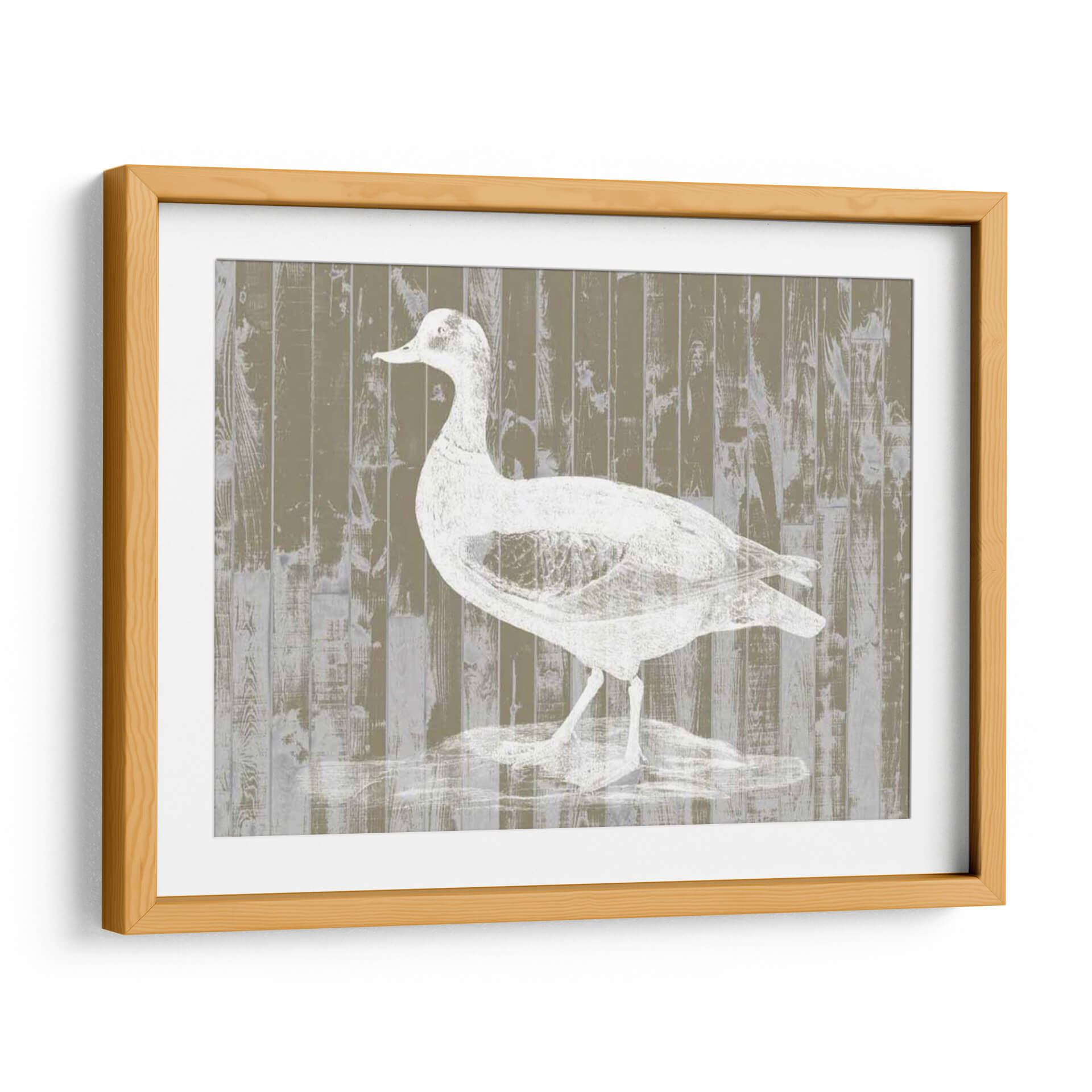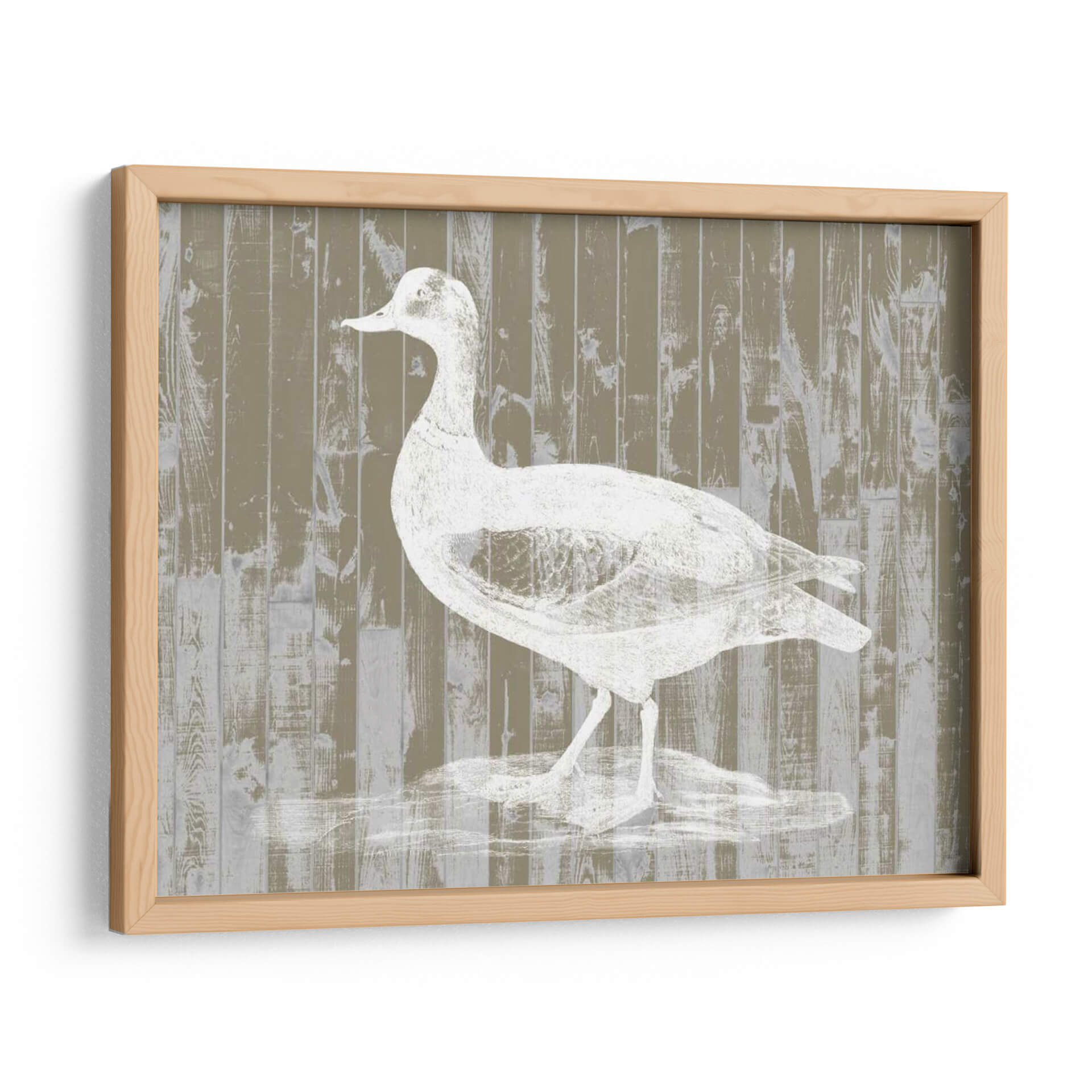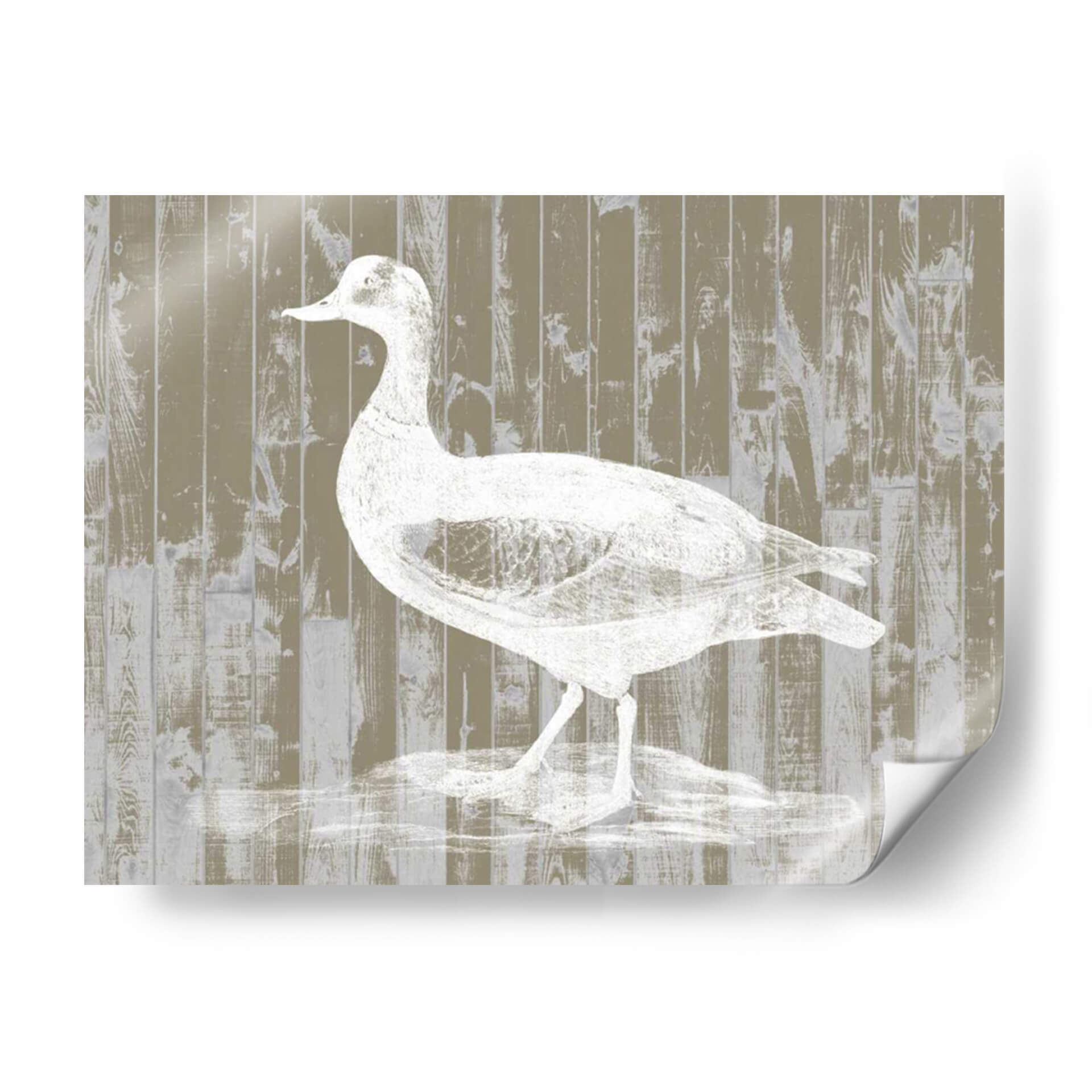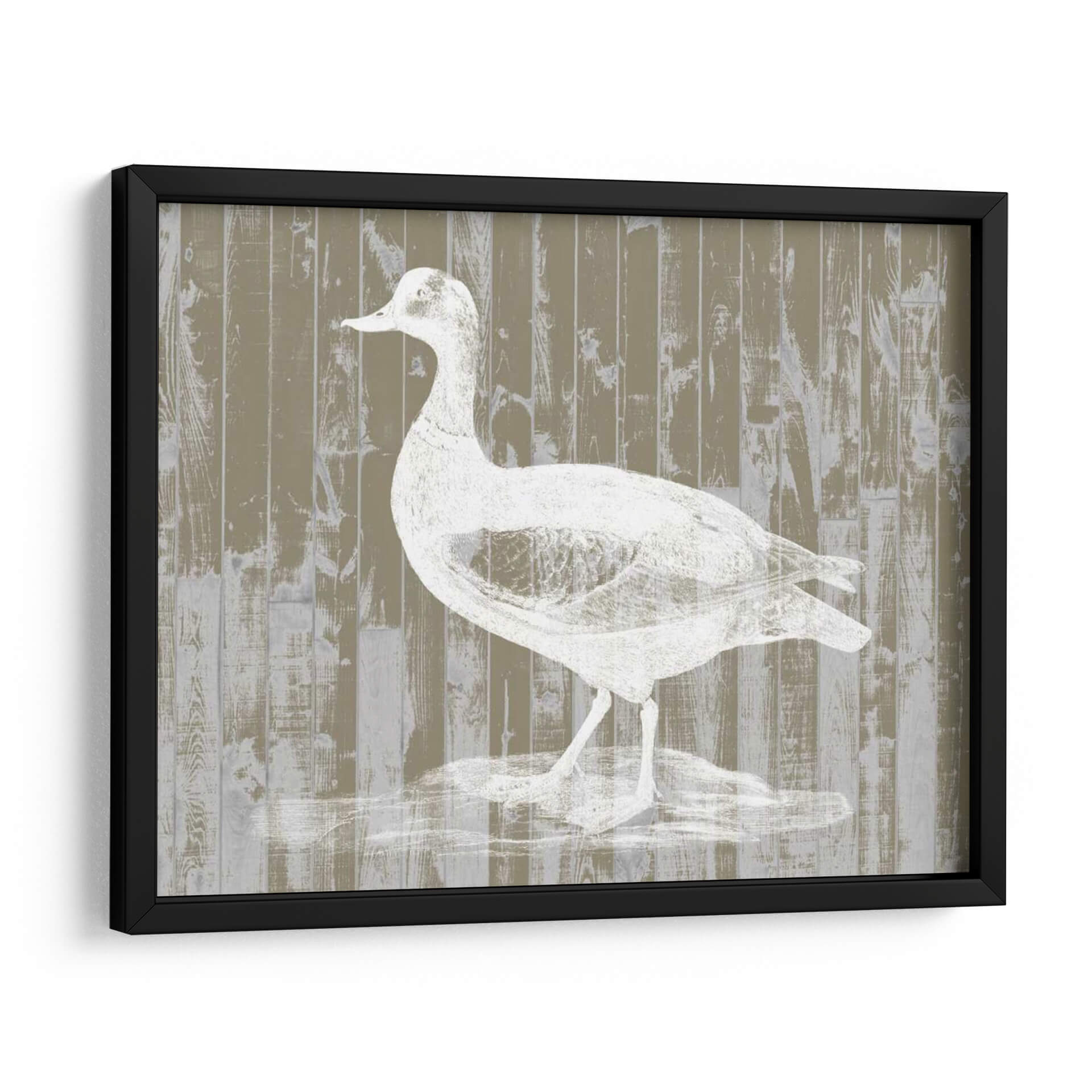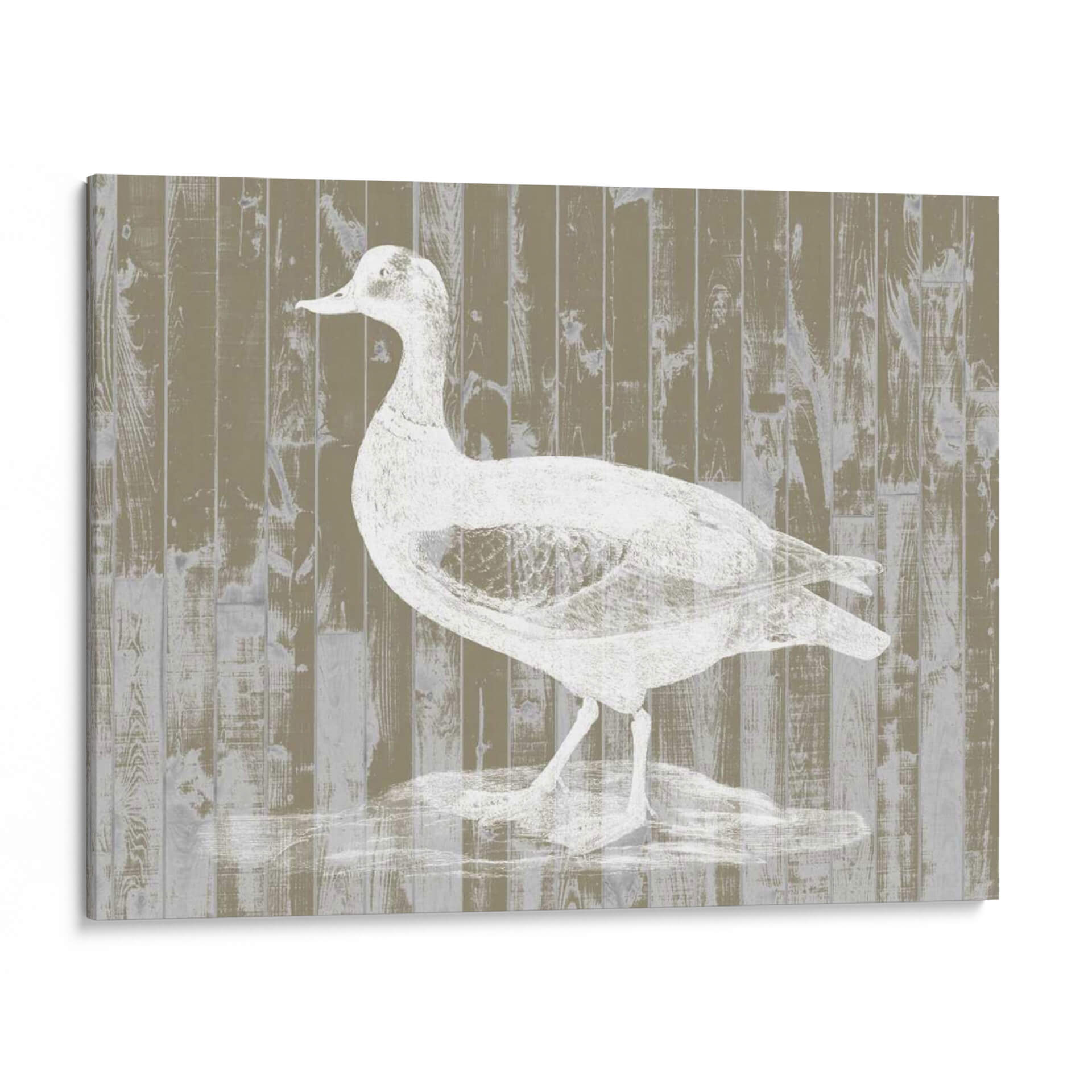 Sumérgete en la serenidad rústica con "Woodgrain Fowl Ii", una obra de arte de Jennifer Goldberger que captura la esencia de la naturaleza con un estilo distintivo. Esta pieza presenta una detallada ilustración de un ave, probablemente un pato, dibujada en un tono blanquecino que contrasta sutilmente con un fondo texturizado de tablones de madera desgastada. La paleta de colores se centra en tonos tierra y grises apagados, creando una atmósfera tranquila y orgánica que evoca la paz del campo y la belleza atemporal de la fauna. La composición, centrada en el ave de perfil, ofrece una visión clara y elegante, mientras que la textura simulada de madera añade profundidad y un carácter artesanal. "Woodgrain Fowl Ii" es ideal para quienes buscan añadir un toque de encanto campestre o un elemento naturalista a su hogar u oficina. Este cuadro decorativo funciona a la perfección en salones, dormitorios o estudios, aportando una sensación de calma y conexión con el entorno natural. Su estilo versátil lo hace un complemento perfecto para decoraciones rústicas, modernas o de inspiración escandinava, convirtiéndose en un punto focal que invita a la contemplación y la admiración.