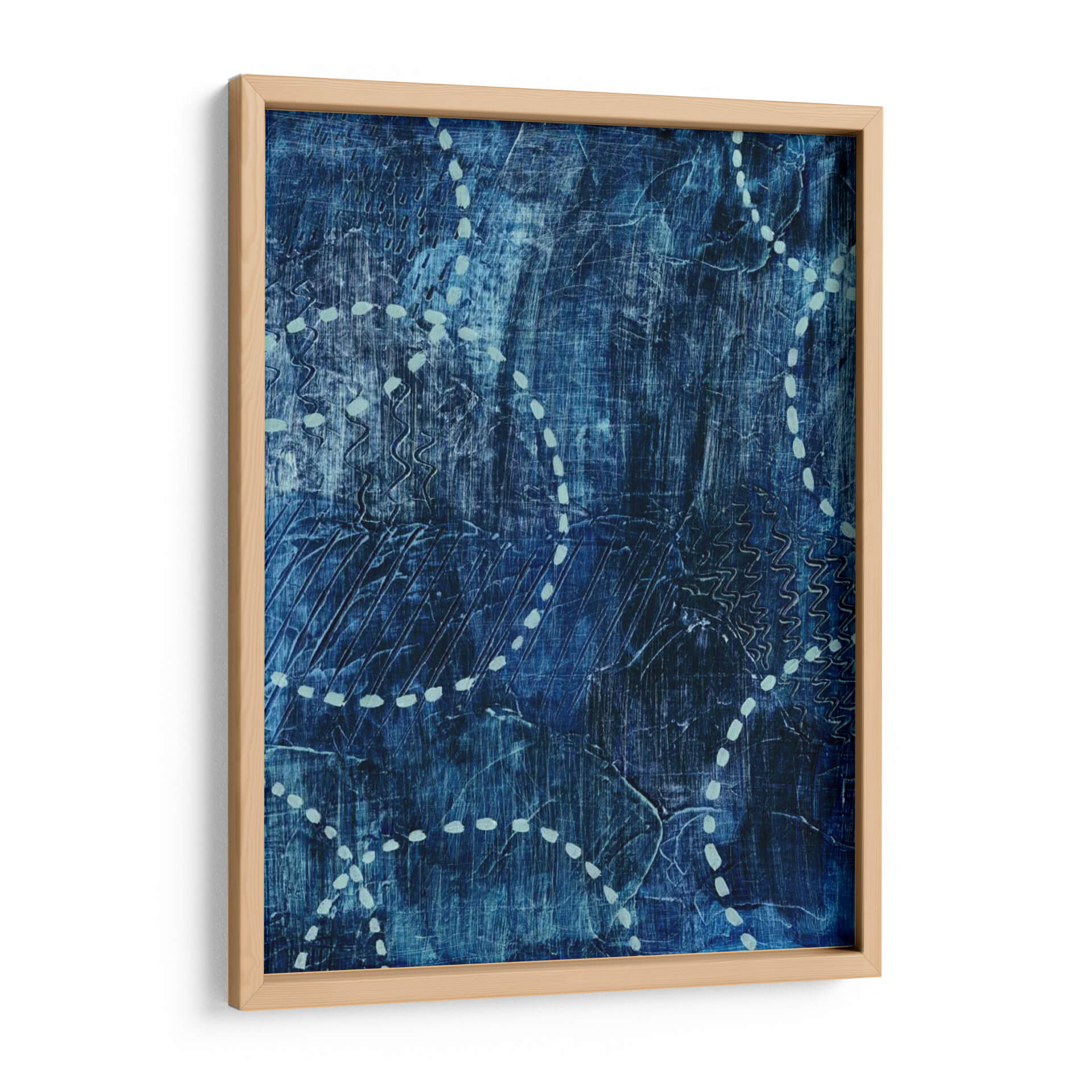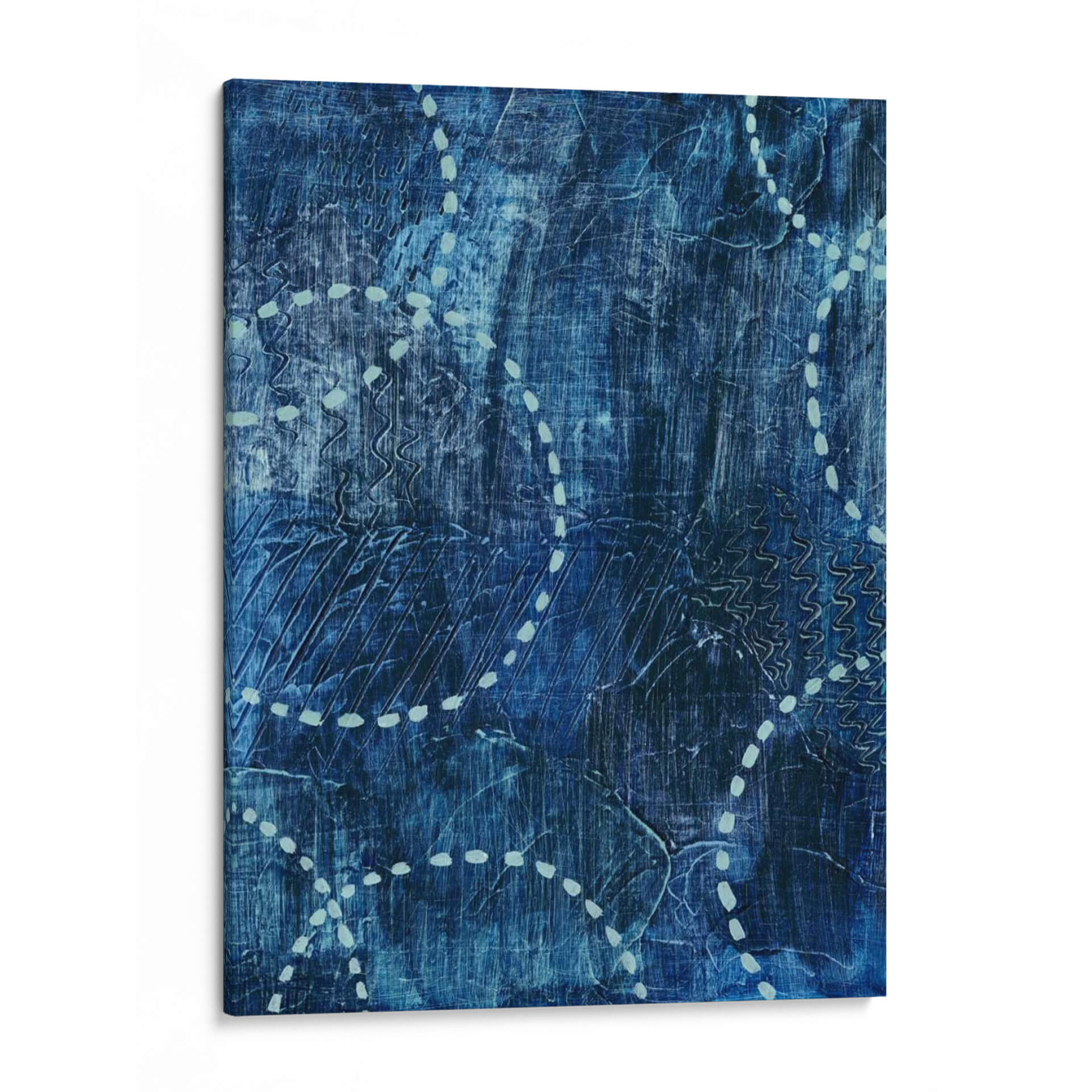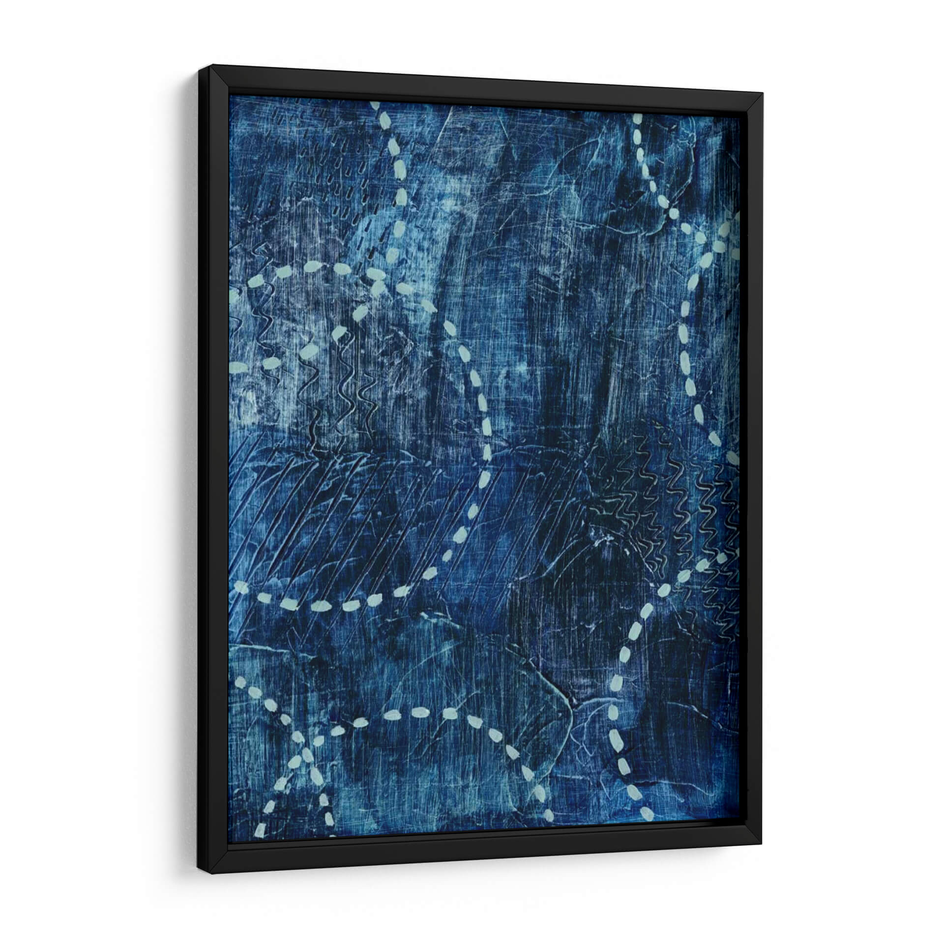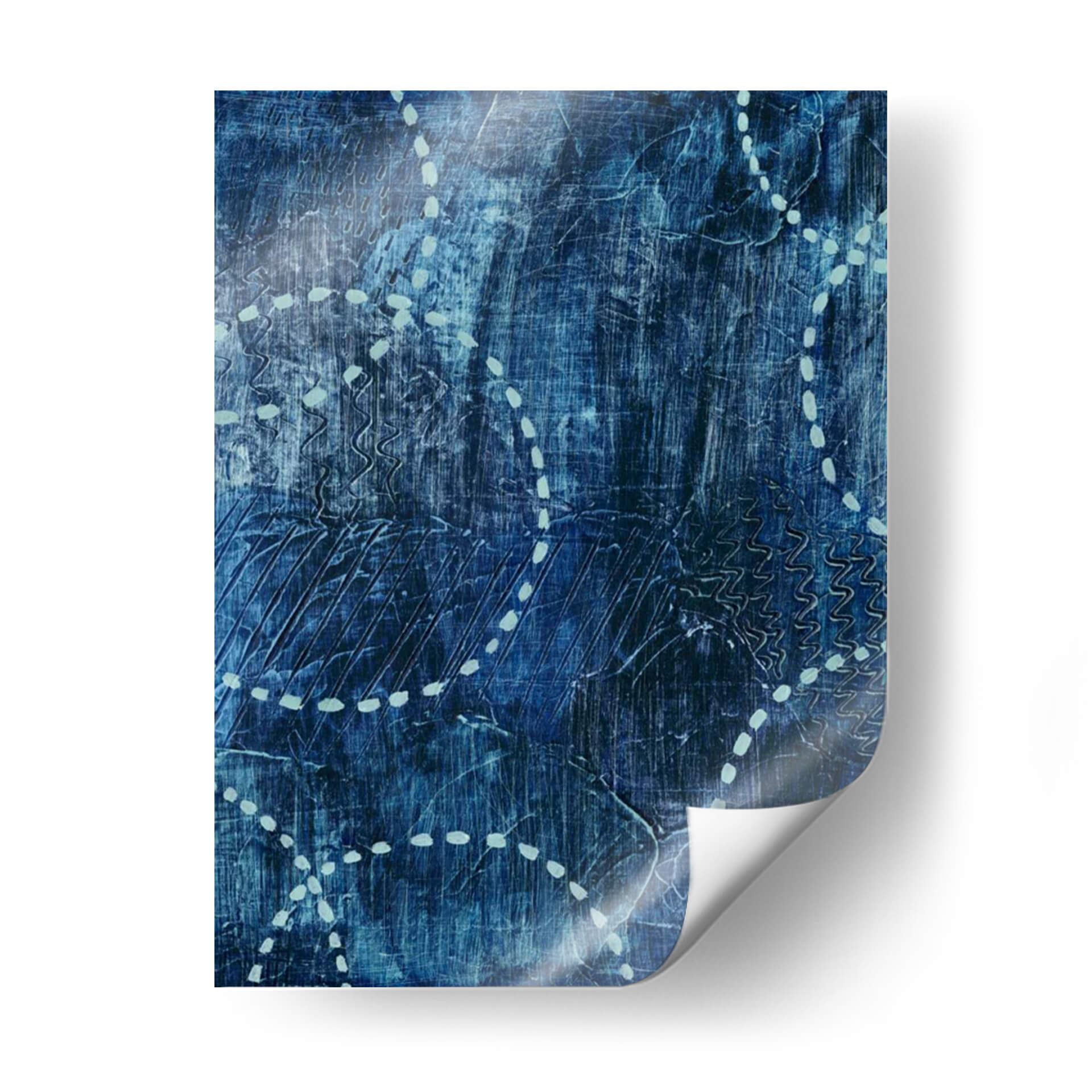 Sumérgete en la serena profundidad del cuadro decorativo "A La Deriva I" de Grace Popp, una obra que evoca la tranquilidad del océano y la introspección. Esta pieza abstracta se caracteriza por su rica paleta de azules intensos, que varían desde tonos índigo profundos hasta matices aguamarina sutiles, creando una atmósfera de calma y misterio. La textura visual es notable, con pinceladas y marcas lineales que sugieren movimiento y profundidad, como las olas rompiendo o las corrientes marinas fluyendo. Elementos gráficos en un tono más claro, como puntos y líneas onduladas, rompen la monotonía del fondo azul, añadiendo un toque de dinamismo y guiando la mirada a través de la composición. "A La Deriva I" es ideal para espacios que buscan un aire de sofisticación y paz, como un dormitorio, un estudio o una sala de estar donde se desee crear un ambiente relajante y contemplativo. Su estilo abstracto contemporáneo permite una gran versatilidad decorativa, complementando tanto interiores modernos como más tradicionales. Cada detalle de esta obra invita a la reflexión, convirtiéndola en una adición significativa a cualquier colección de arte de pared.