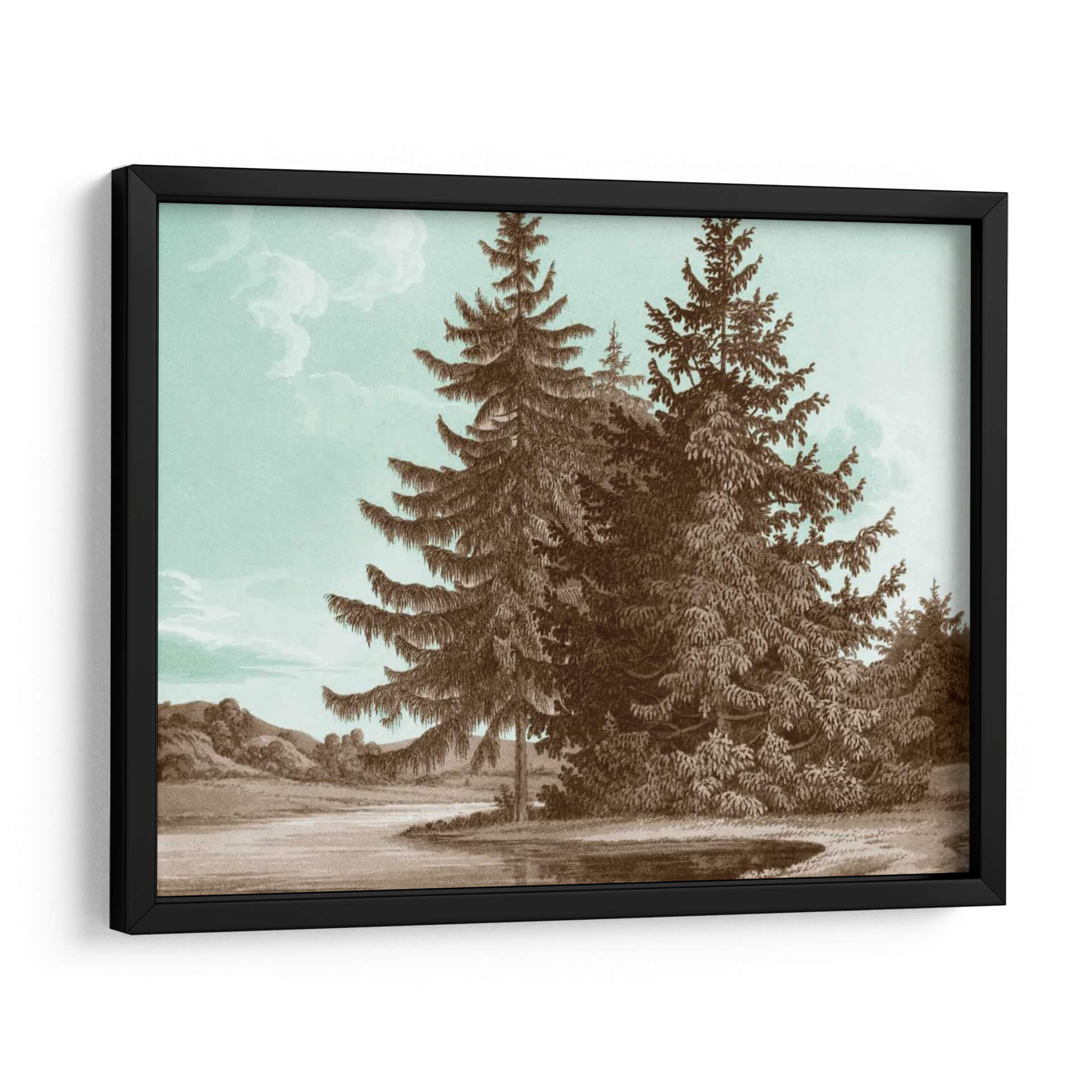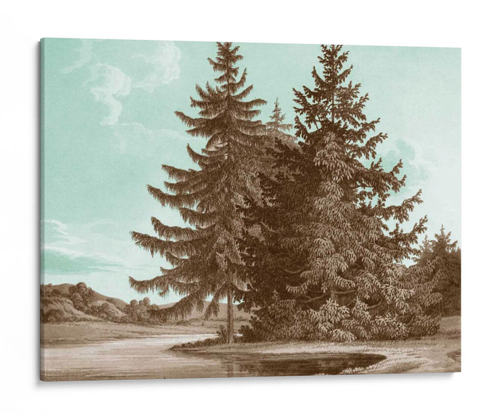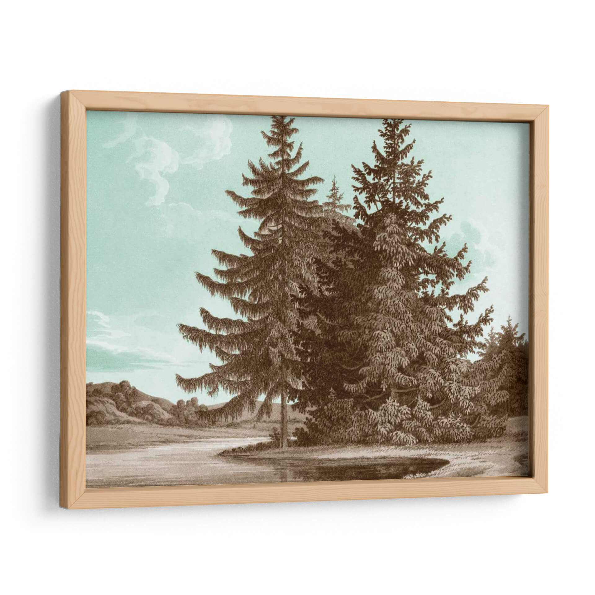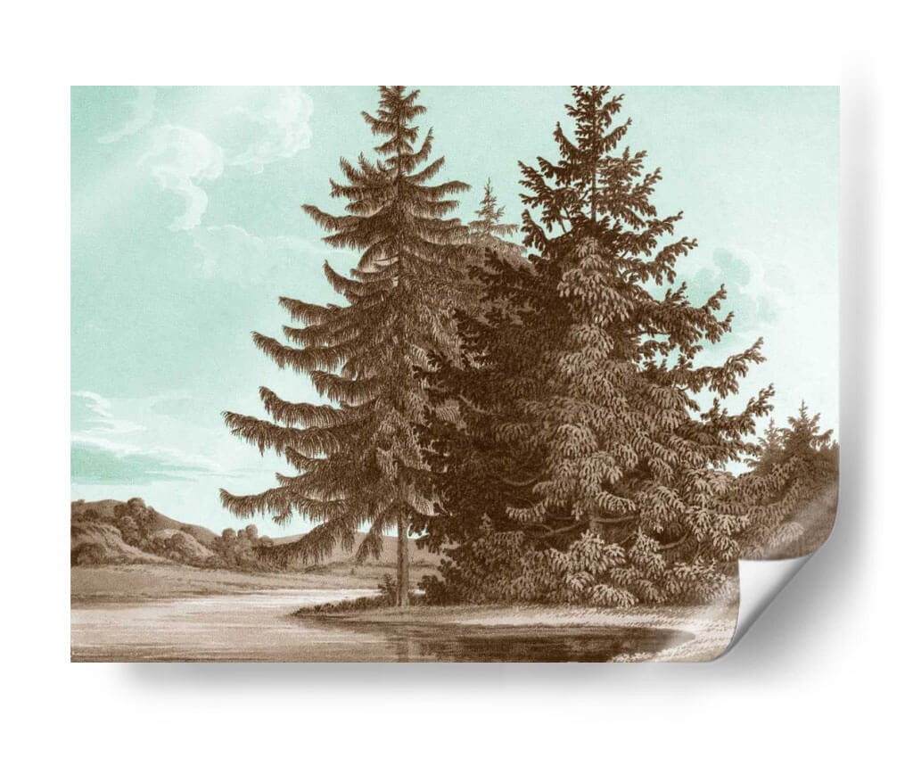 Sumérgete en la tranquilidad del bosque con 'Árboles Serenos III', una obra de Edward Kennion que captura la majestuosidad de la naturaleza. Este cuadro decorativo presenta un paisaje boscoso dominado por imponentes árboles de coníferas, cuyas frondosas ramas se alzan hacia un cielo sereno de tonos turquesa pálido. La paleta de colores, centrada en marrones terrosos y un azul aguamarina suave, crea una atmósfera de calma y reflexión, evocando la paz que se encuentra en los entornos naturales. La técnica, que recuerda a grabados clásicos o ilustraciones botánicas detalladas, aporta un toque de elegancia atemporal a la pieza. La composición, con el primer plano de los árboles destacando sobre un sereno lago y colinas ondulantes en el fondo, invita a la contemplación y al sosiego. Este cuadro es ideal para transformar cualquier espacio en un santuario de paz, aportando una conexión con la naturaleza y un toque sofisticado a salones, dormitorios u oficinas. Añade una pincelada de serenidad natural a tu hogar con esta pieza artística única, perfecta para quienes buscan arte de pared que inspire calma y belleza.