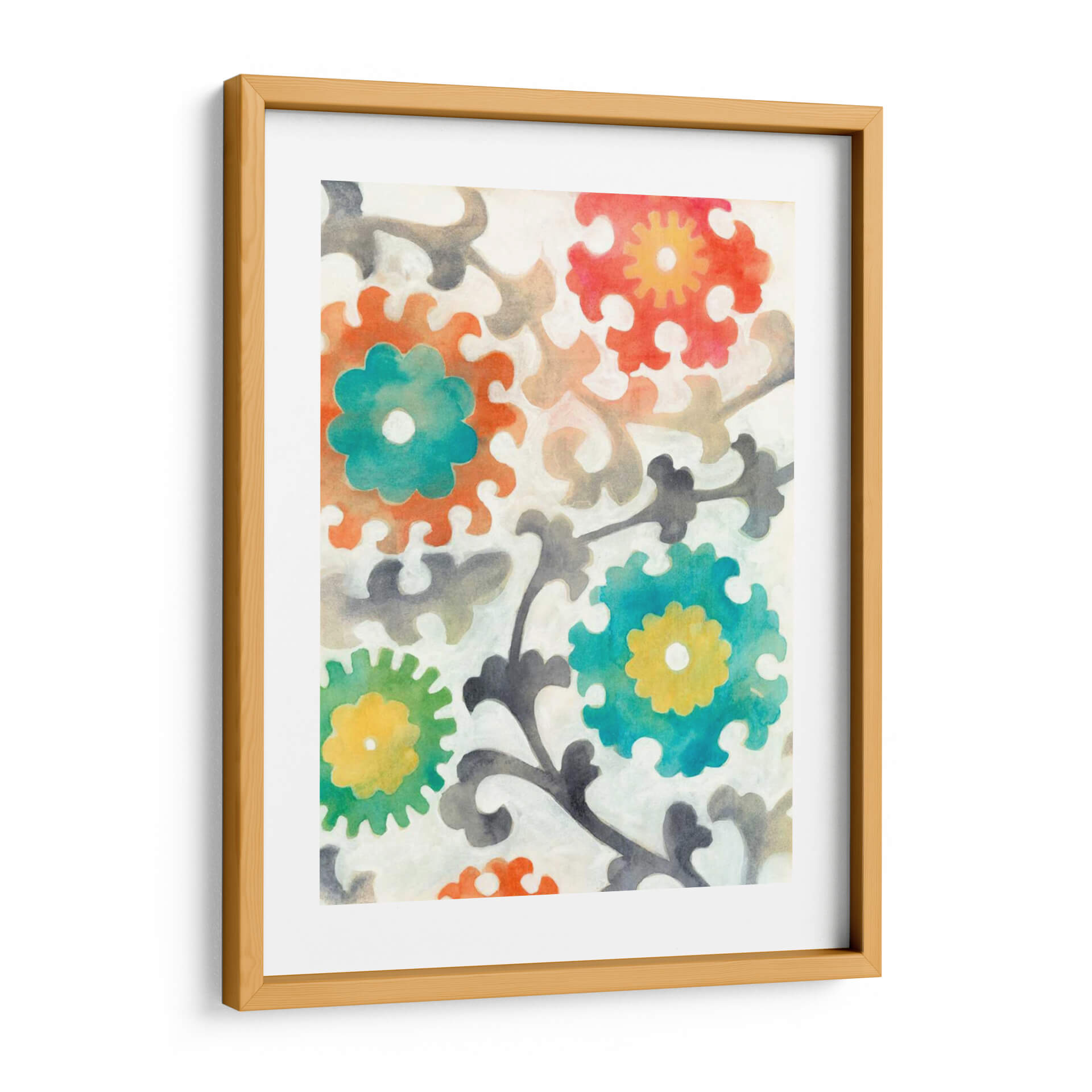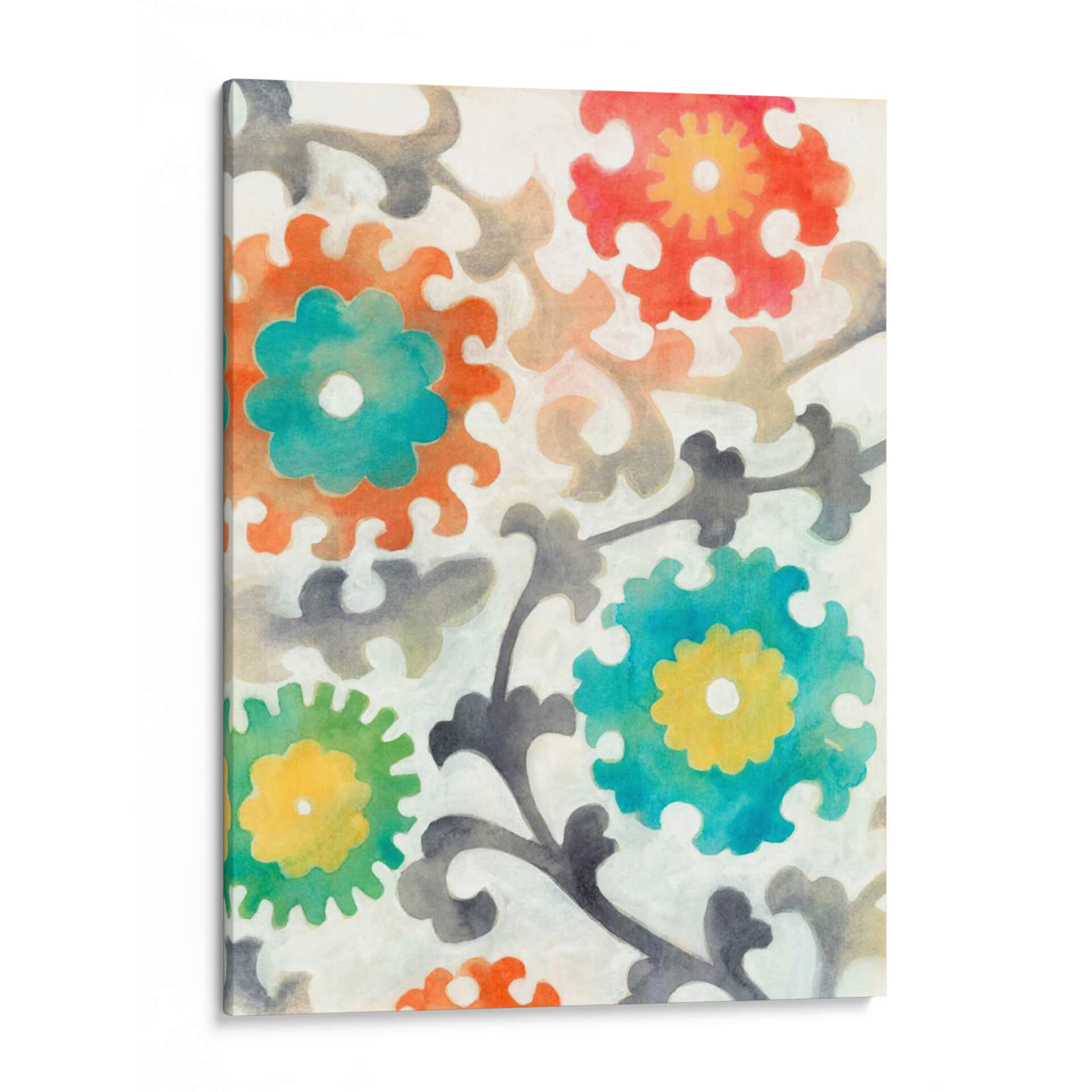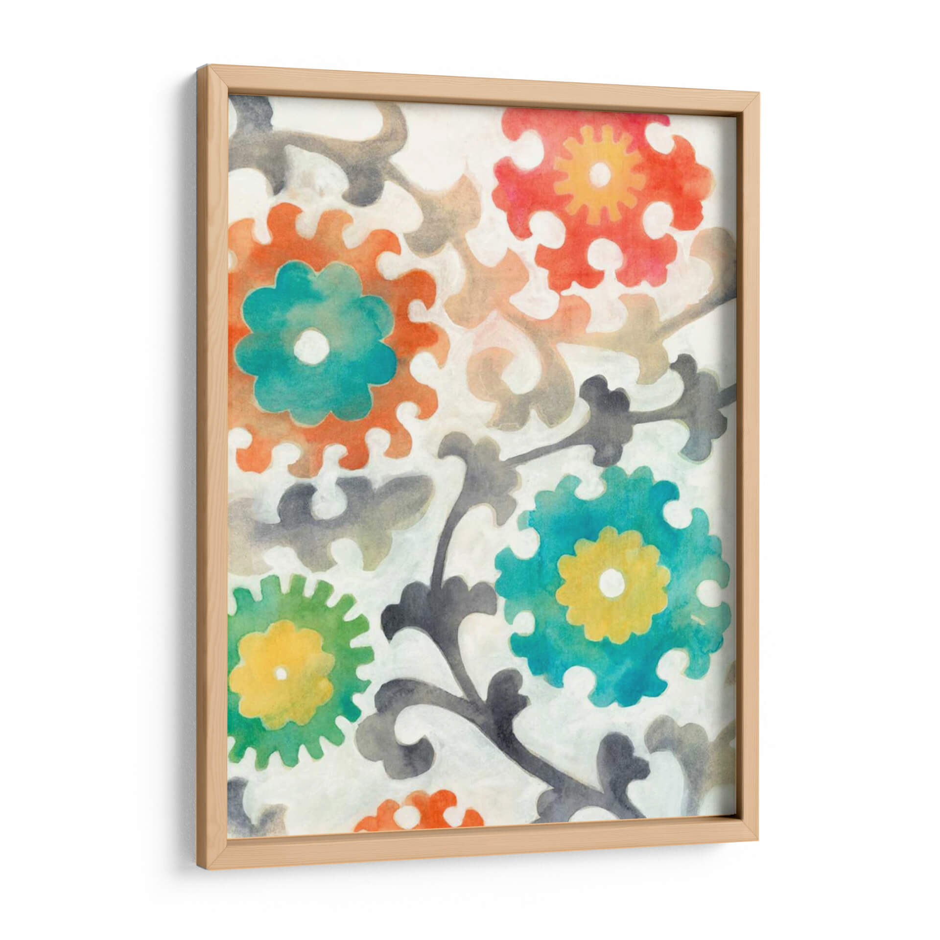 Embellece tu hogar con "Batik Suzani I", una obra de arte contemporáneo de Chariklia Zarris que irradia vitalidad y un toque de encanto étnico. Esta pieza se caracteriza por su vibrante paleta de colores, donde los tonos anaranjados, turquesas y verdes se entrelazan con delicados motivos florales y elementos orgánicos en tonos grises y tierra. La técnica de acuarela o similar utilizada, con sus sutiles transparencias y bordes difuminados, confiere a la obra una textura etérea y una profundidad visual cautivadora. Los patrones repetitivos y la composición fluida invitan a la contemplación, evocando una sensación de armonía y un espíritu bohemio-chic. Este cuadro decorativo es ideal para añadir un punto focal de color y estilo a cualquier estancia, desde una sala de estar moderna hasta un dormitorio acogedor o una oficina creativa. Su diseño versátil lo convierte en el complemento perfecto para decoraciones eclécticas, bohemias o contemporáneas. Descubre cómo "Batik Suzani I" puede transformar tus espacios, aportando un aire de sofisticación artística y una conexión con la belleza de las formas naturales reinterpretadas.