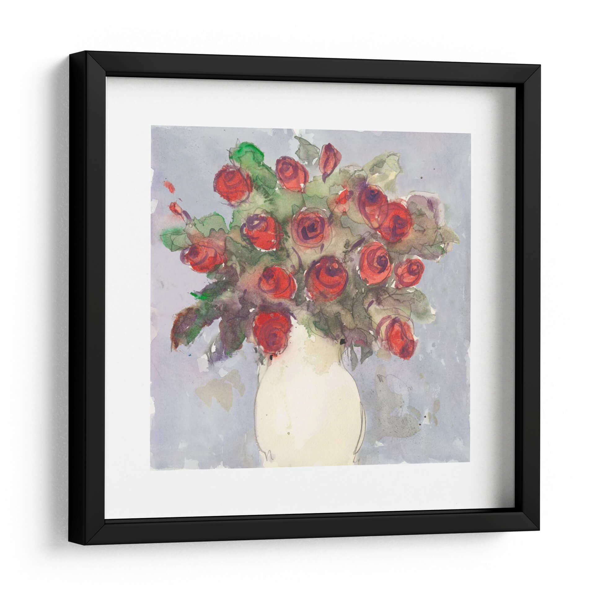 Sumérgete en la delicadeza y el encanto de "Bouquet De Acuarela I", una obra de arte que captura la efímera belleza de las flores con una técnica de acuarela vibrante y expresiva. Samuel Dixon nos presenta un arreglo floral donde las rosas rojas estallan con vida sobre un fondo sutil y texturizado en tonos grises y lavanda. Las pinceladas sueltas y las transparencias propias de la acuarela otorgan a la pieza una cualidad etérea y soñadora, invitando a la contemplación. Cada pétalo, delineado con trazos seguros pero a la vez ligeros, sugiere movimiento y frescura, como si el bouquet hubiera sido pintado en el instante mismo de su máximo esplendor. La paleta de colores, dominada por el contraste entre los intensos rojos de las flores y los matices suaves del fondo, crea una atmósfera de serena elegancia. Este cuadro decorativo es perfecto para añadir un toque de color y sofisticación a cualquier espacio, desde una sala de estar moderna hasta un dormitorio acogedor o una oficina que busque inspiración. "Bouquet De Acuarela I" no es solo una imagen, sino una ventana a un jardín interior que evoca sentimientos de alegría, romanticismo y la belleza perdurable de la naturaleza.
