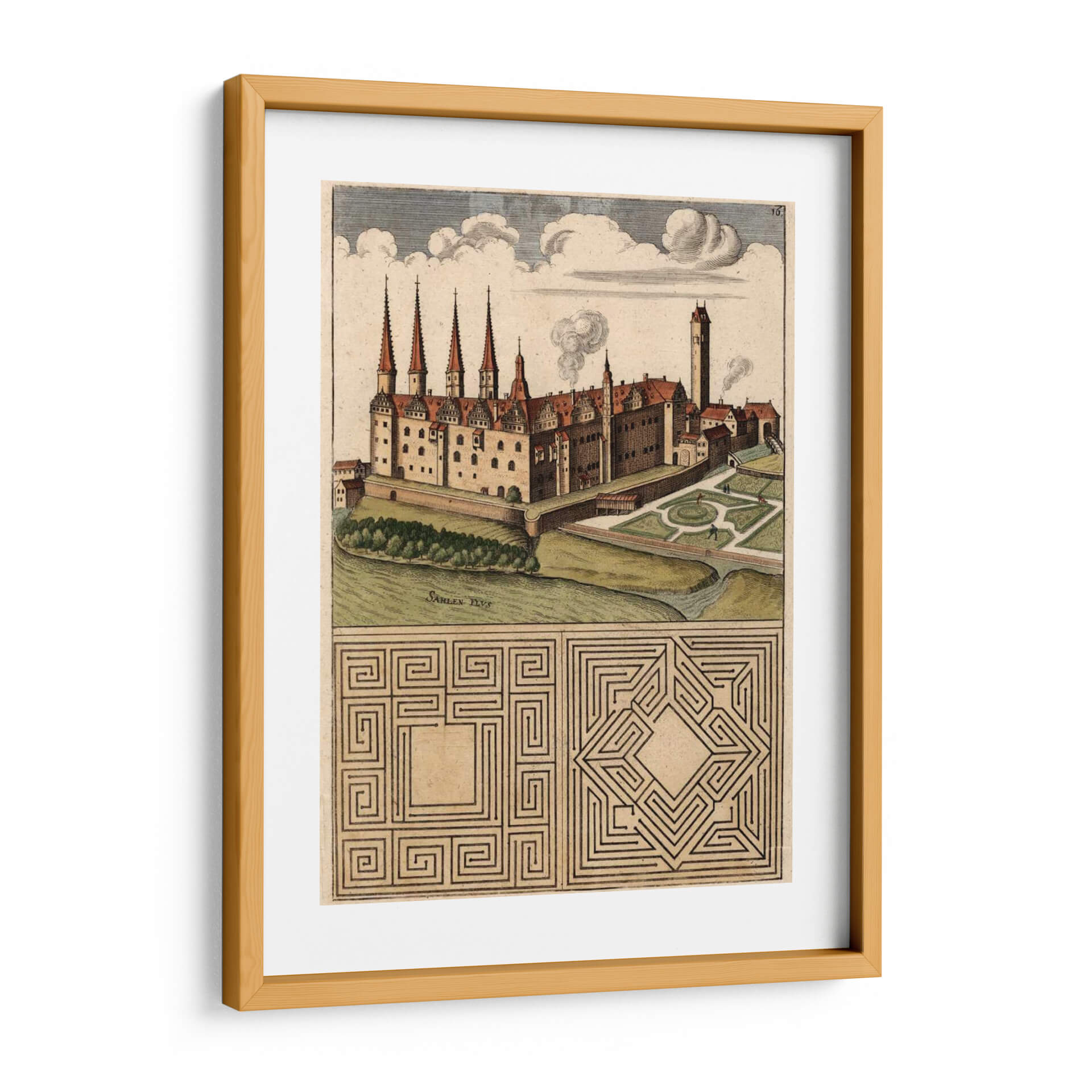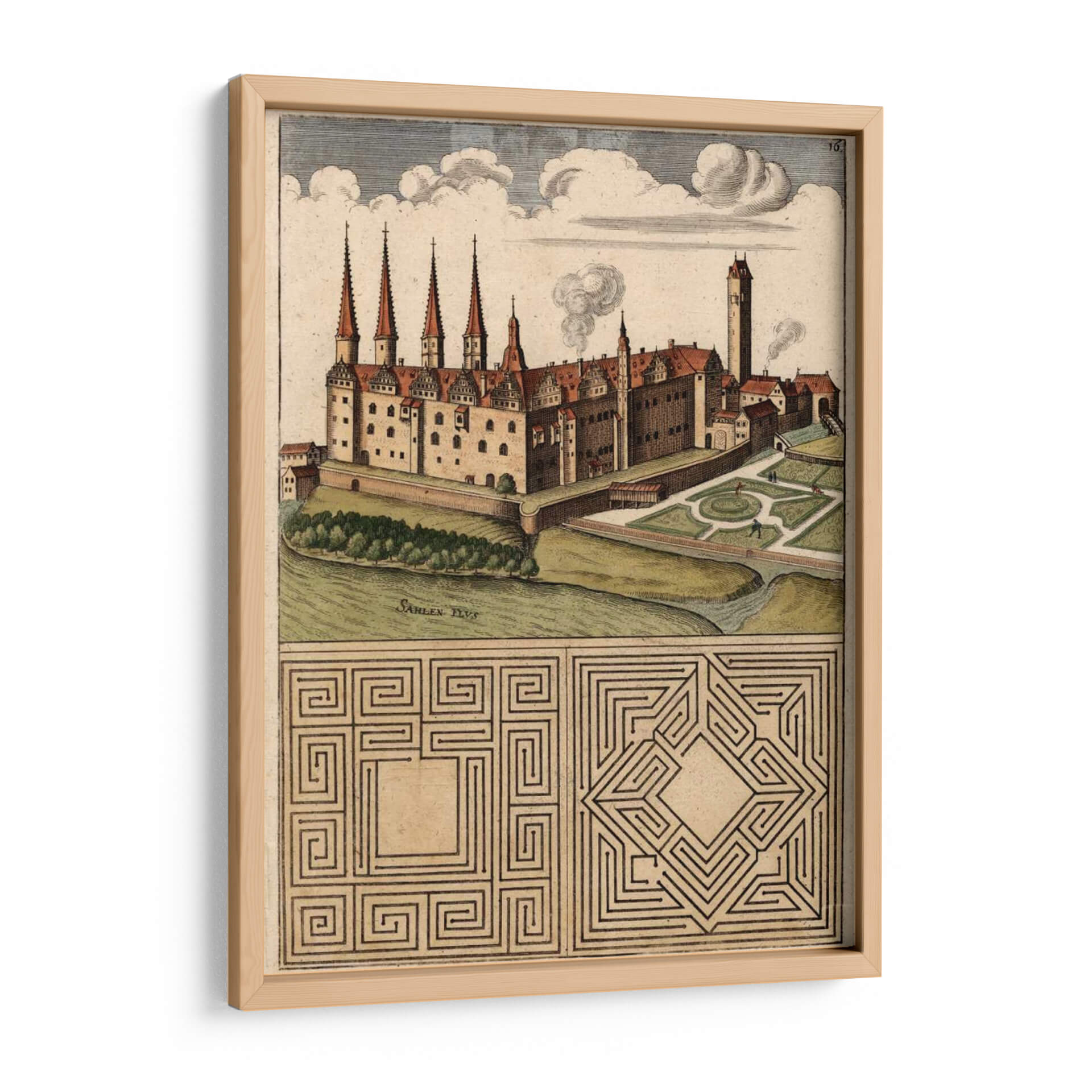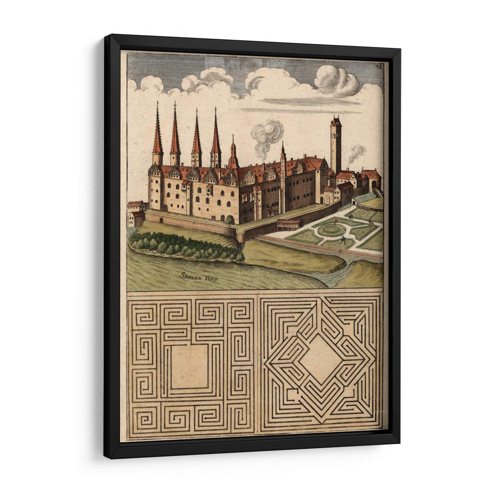Sumérgete en la intriga arquitectónica y el encanto histórico con el cuadro decorativo "Castillo Y Laberinto I". Esta obra evoca una sensación de misterio y exploración, presentando un detallado grabado de un imponente castillo con múltiples torres y una muralla protectora. A sus pies, se despliega un jardín geométrico con senderos intrincados que invitan a la contemplación. La paleta de colores, dominada por tonos tierra, ocres y sutiles toques de azul cielo, confiere a la pieza una atmósfera atemporal y serena. La composición, dividida entre la majestuosidad del castillo y la complejidad de los laberintos inferiores, crea un contraste fascinante entre lo construido y lo diseñado. Ideal para añadir un toque de carácter y sofisticación a estudios, bibliotecas o salones que busquen inspiración en la arquitectura clásica y la simbología del laberinto. Este cuadro decorativo es perfecto para aquellos que aprecian la historia, la arquitectura y el arte con un aire de enigma. Su diseño detallado y su temática única lo convierten en una pieza de conversación, aportando profundidad y un sentido de aventura a cualquier espacio de tu hogar u oficina, invitando a la reflexión sobre los caminos de la vida y la complejidad de las estructuras.