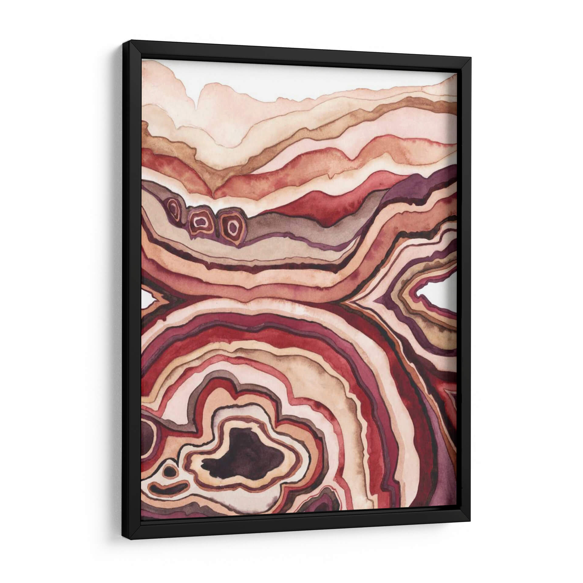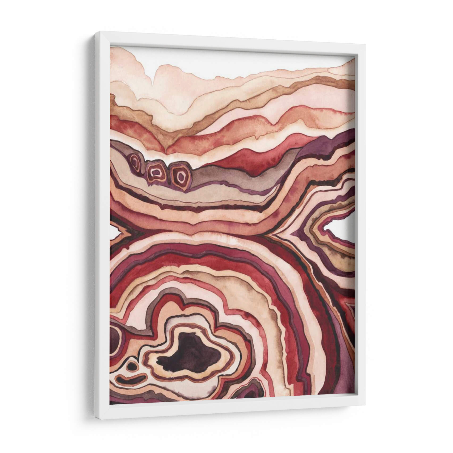 Sumérgete en la cautivadora belleza del cuadro decorativo 'Cuarzo Lore Iii', una obra de arte abstracto que evoca la profundidad y las formaciones naturales de una geoda. Las líneas fluidas y concéntricas, ejecutadas con una delicada técnica de acuarela, crean un patrón hipnótico que recuerda las capas de cuarzo o ágata. La paleta de colores, dominada por tonos cálidos de terracota, rojos profundos, marrones terrosos y toques de púrpura, aporta una sensación de calidez terrenal y sofisticación a cualquier espacio. Cada trazo revela una textura sutil y una profundidad que invita a la contemplación. Este cuadro decorativo es ideal para añadir un toque orgánico y moderno a tu sala de estar, un acento de color y serenidad a tu dormitorio o un punto focal intrigante en tu oficina. Su estilo abstracto y orgánico lo convierte en una pieza versátil, perfecta para complementar una decoración contemporánea, bohemia o incluso minimalista. 'Cuarzo Lore Iii' no es solo una pieza decorativa, es una invitación a conectar con la belleza intrínseca de la naturaleza, transformada en arte para tu hogar. Descubre la elegancia de las formaciones geológicas en una interpretación artística única que transformará tus paredes.