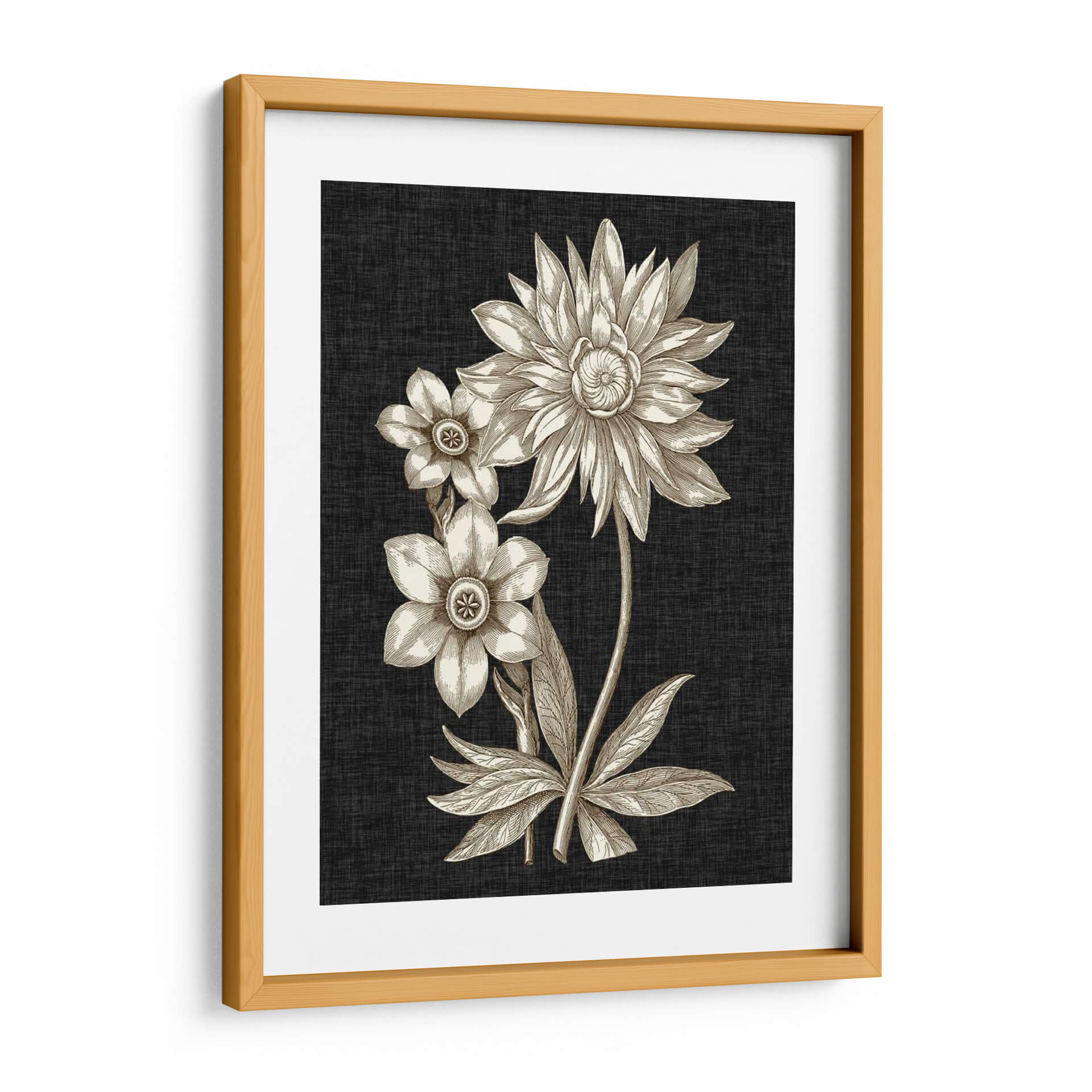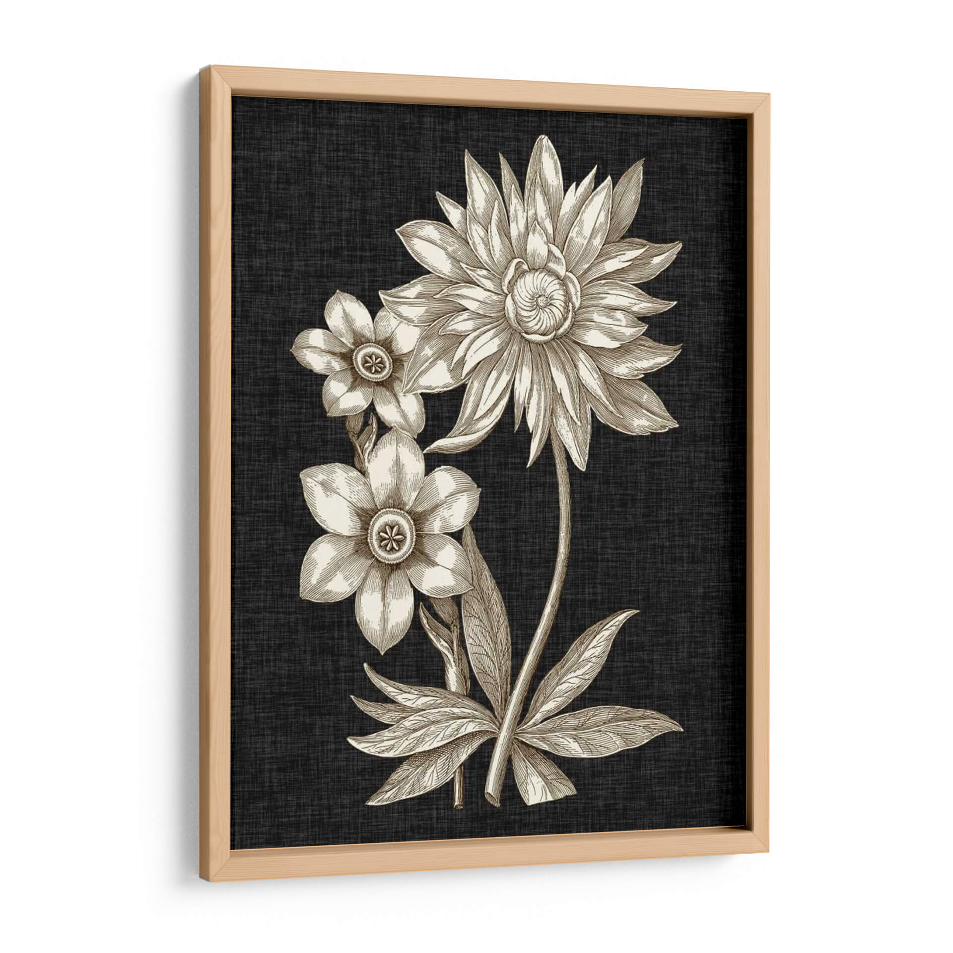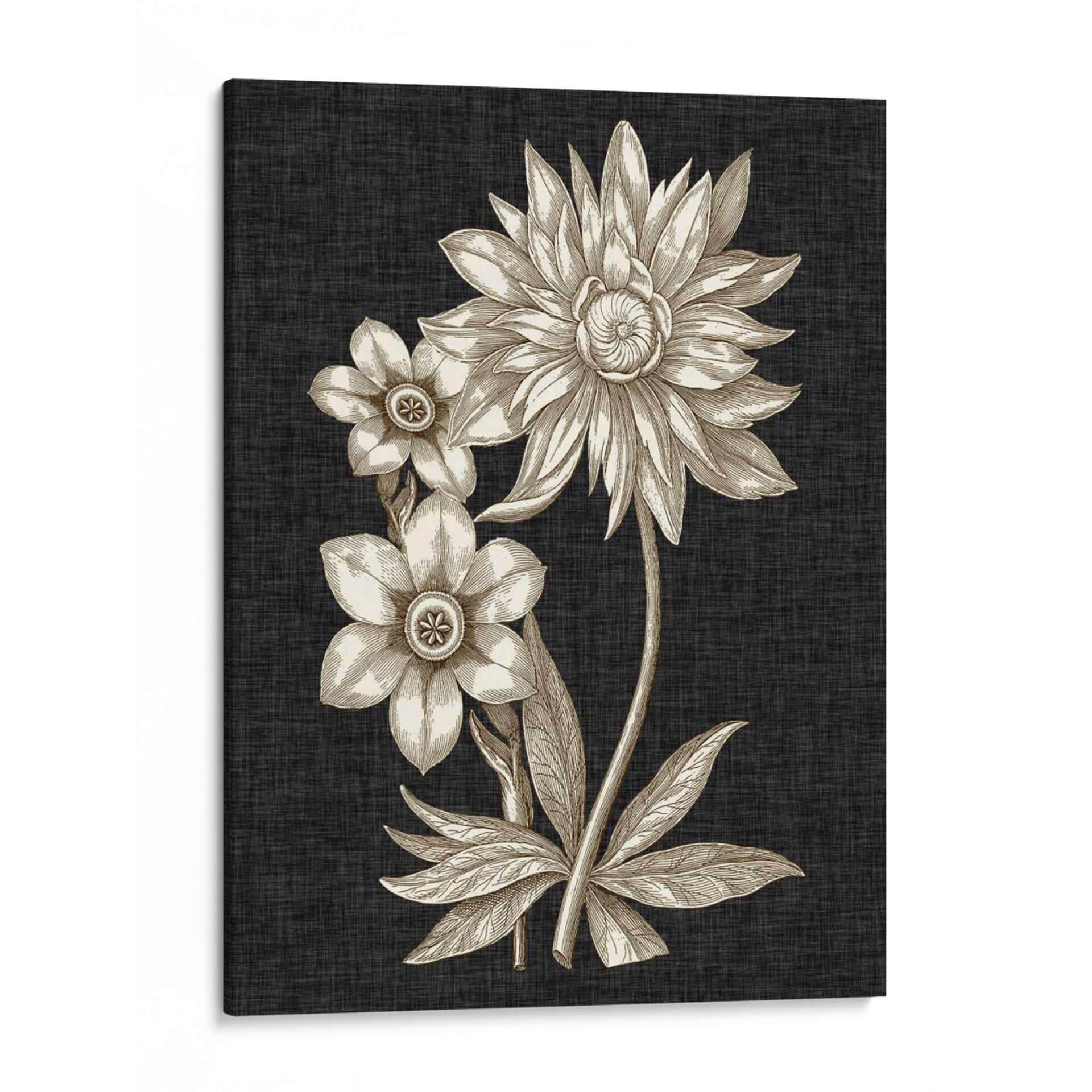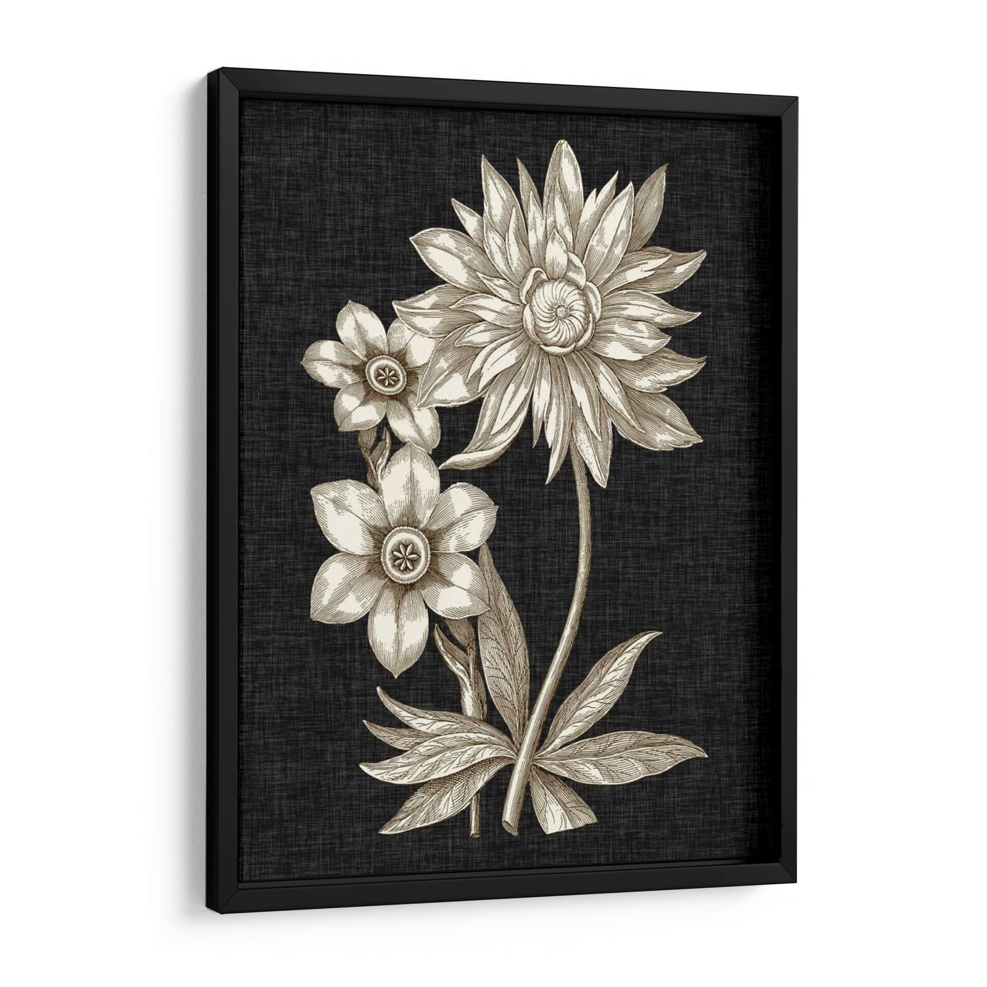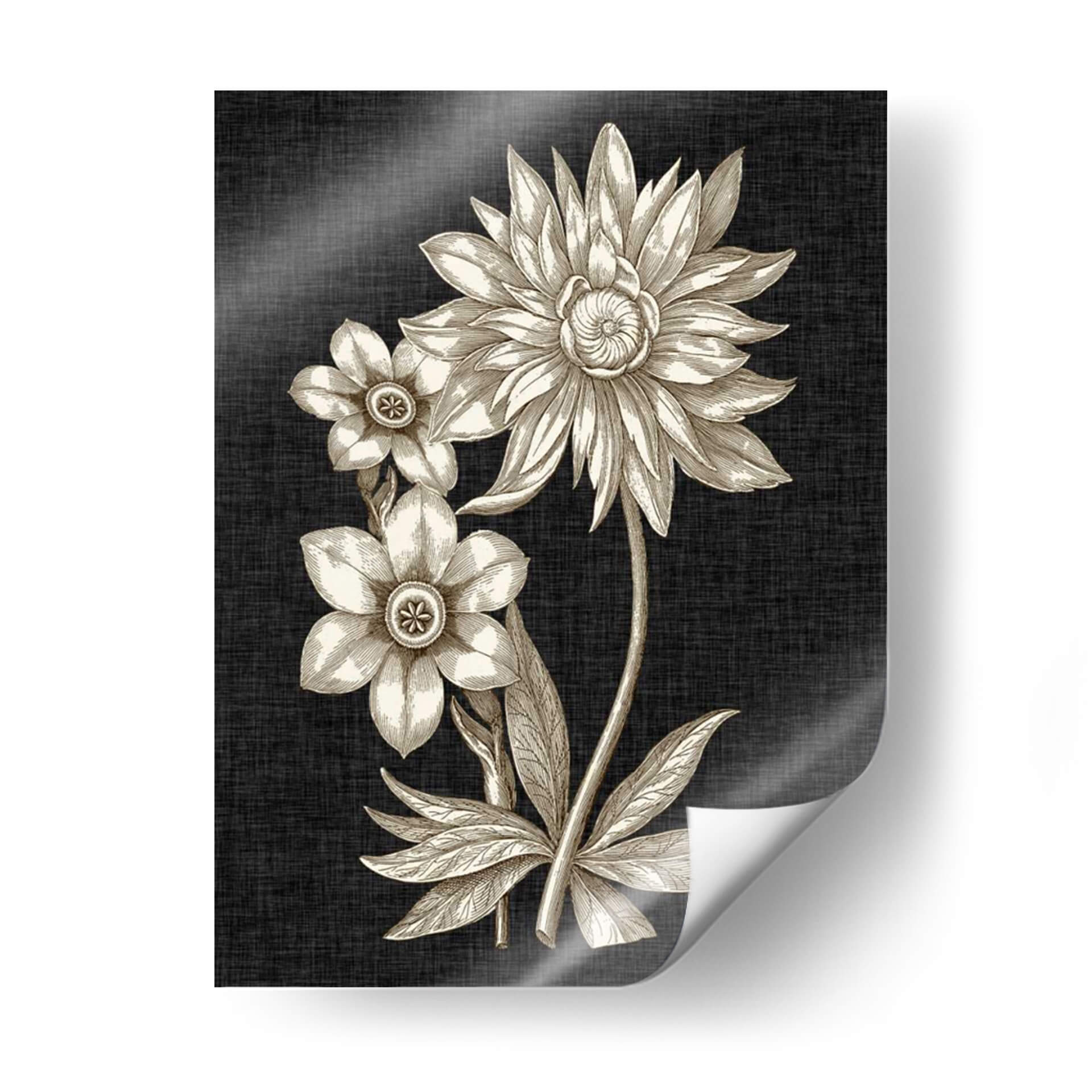 Sumérgete en la elegancia atemporal de "Dramático Chintz I", una obra de arte que captura la esencia de la naturaleza con un toque de sofisticación. Este cuadro decorativo presenta un detallado estudio botánico de flores en tonos sepia, destacando la delicadeza de sus pétalos y la intrincada formación de sus centros. El contraste entre los delicados bocetos florales en beige y dorado y el fondo texturizado de color carbón crea una atmósfera de profundidad y misterio, perfecta para añadir un punto focal de interés a cualquier estancia. La composición vertical, con una flor principal grande y dos más pequeñas, evoca una sensación de equilibrio y armonía. Ideal para salones modernos, estudios o incluso como pieza central en un comedor, "Dramático Chintz I" aporta un aire de refinamiento clásico y un toque artístico que inspira calma y admiración. Transforma tu espacio con esta pieza que fusiona la belleza botánica con un diseño contemporáneo, invitando a la contemplación y al aprecio por los detalles sutiles de la naturaleza. Una elección perfecta para quienes buscan arte de pared que combine un diseño distintivo con una estética serena.