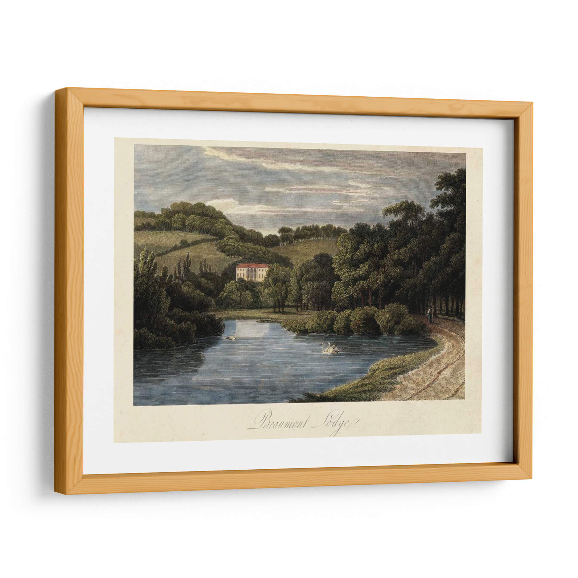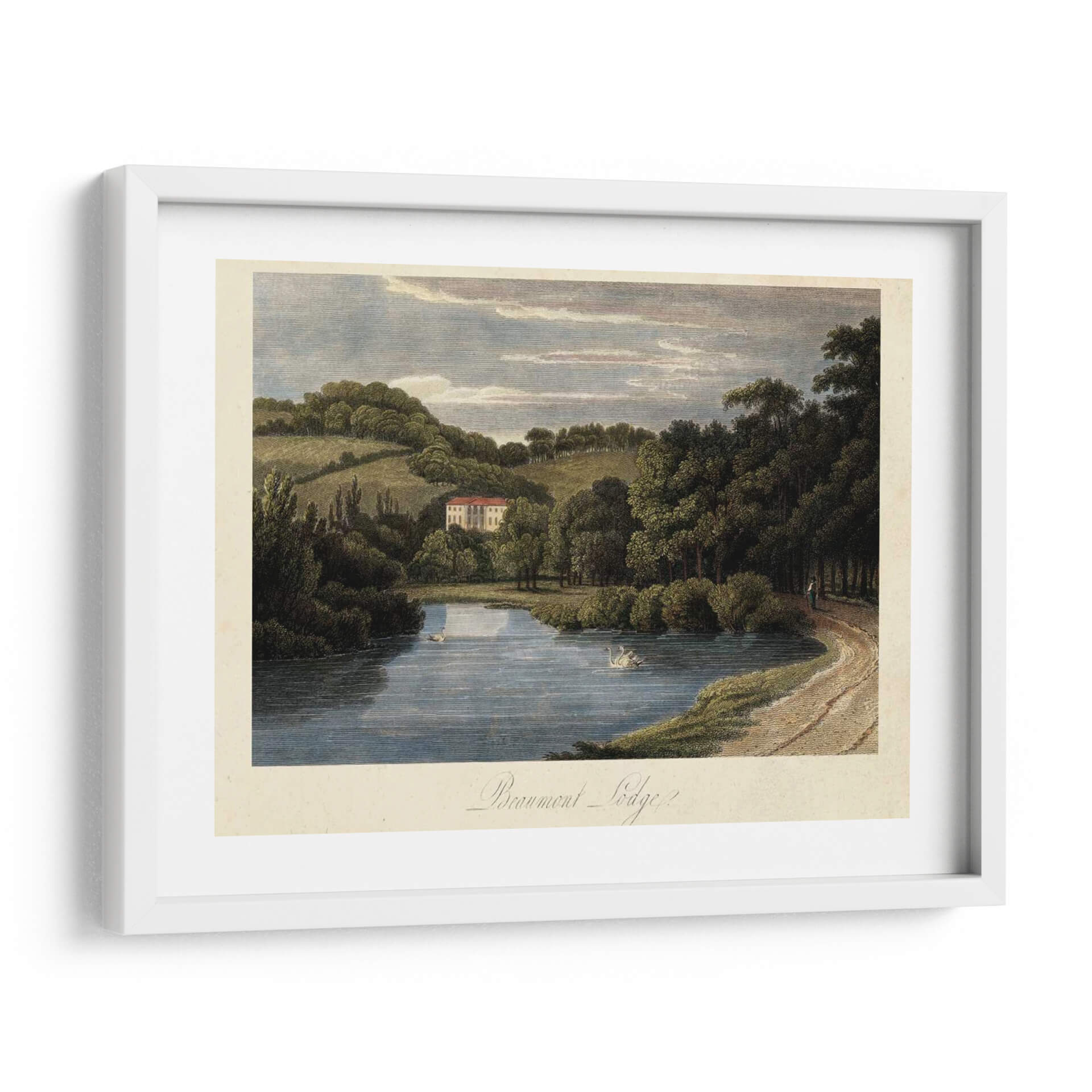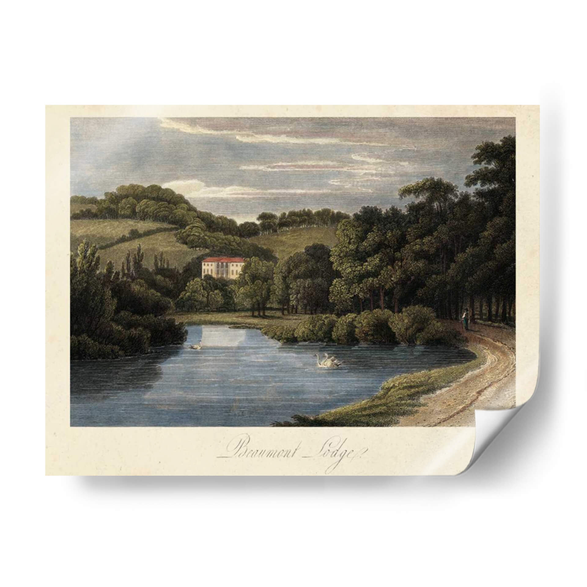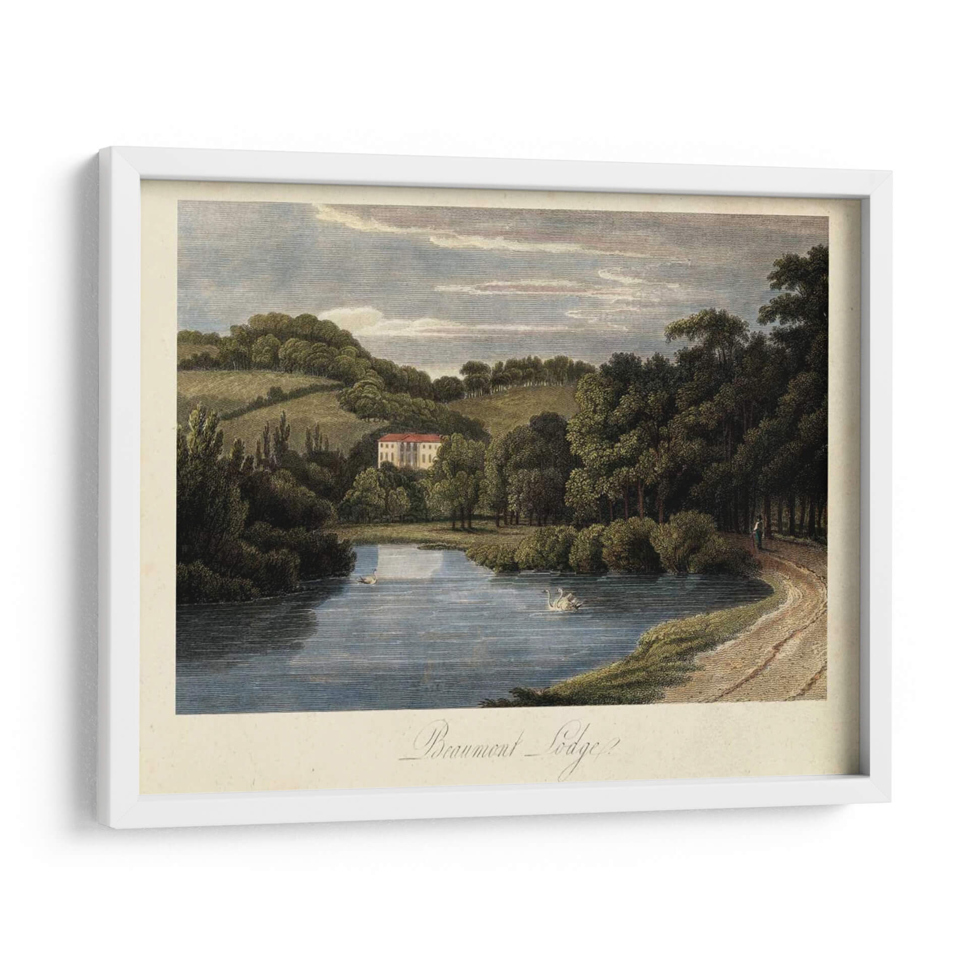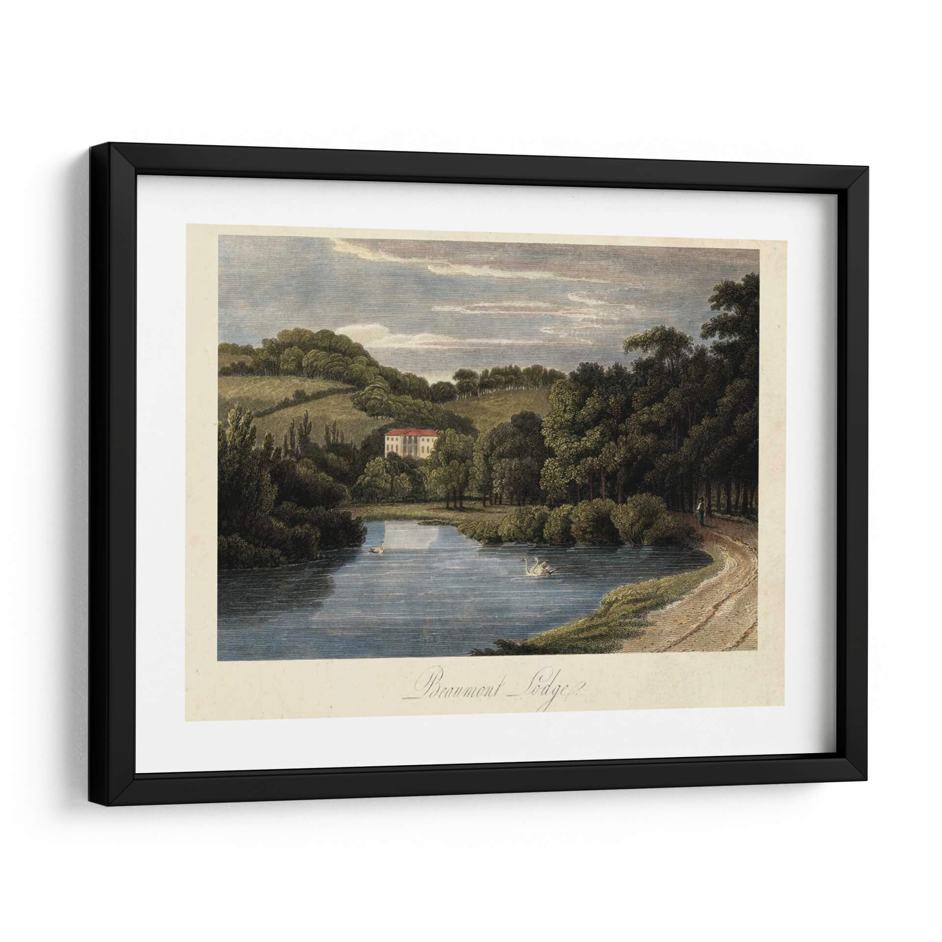Sumérjase en la serenidad del campo inglés con 'El Campo Inglés III', una obra de arte que captura la esencia de un paisaje idílico. Esta pieza evoca una profunda sensación de paz y tranquilidad, transportando al espectador a un entorno natural exuberante. La obra presenta un lago de aguas serenas donde nadan elegantes cisnes, reflejando el cielo azul y las nubes pasajeras. Al fondo, una majestuosa casa con tejado rojo se alza entre colinas verdes y densos bosques, creando una composición armónica y equilibrada. La paleta de colores, dominada por tonos tierra, verdes profundos y azules celestes, contribuye a la atmósfera relajante y atemporal. El estilo, que recuerda a las grabados clásicos o a la pintura paisajista del siglo XIX, ofrece un toque de sofisticación y nostalgia. Este cuadro decorativo es ideal para añadir un elemento de calma y belleza natural a cualquier sala de estar, estudio u oficina, convirtiéndose en un punto focal que invita a la contemplación y al disfrute de la naturaleza. Su delicadeza y detalle invitan a ser admirado una y otra vez, aportando un aire de distinción y buen gusto a su hogar.
