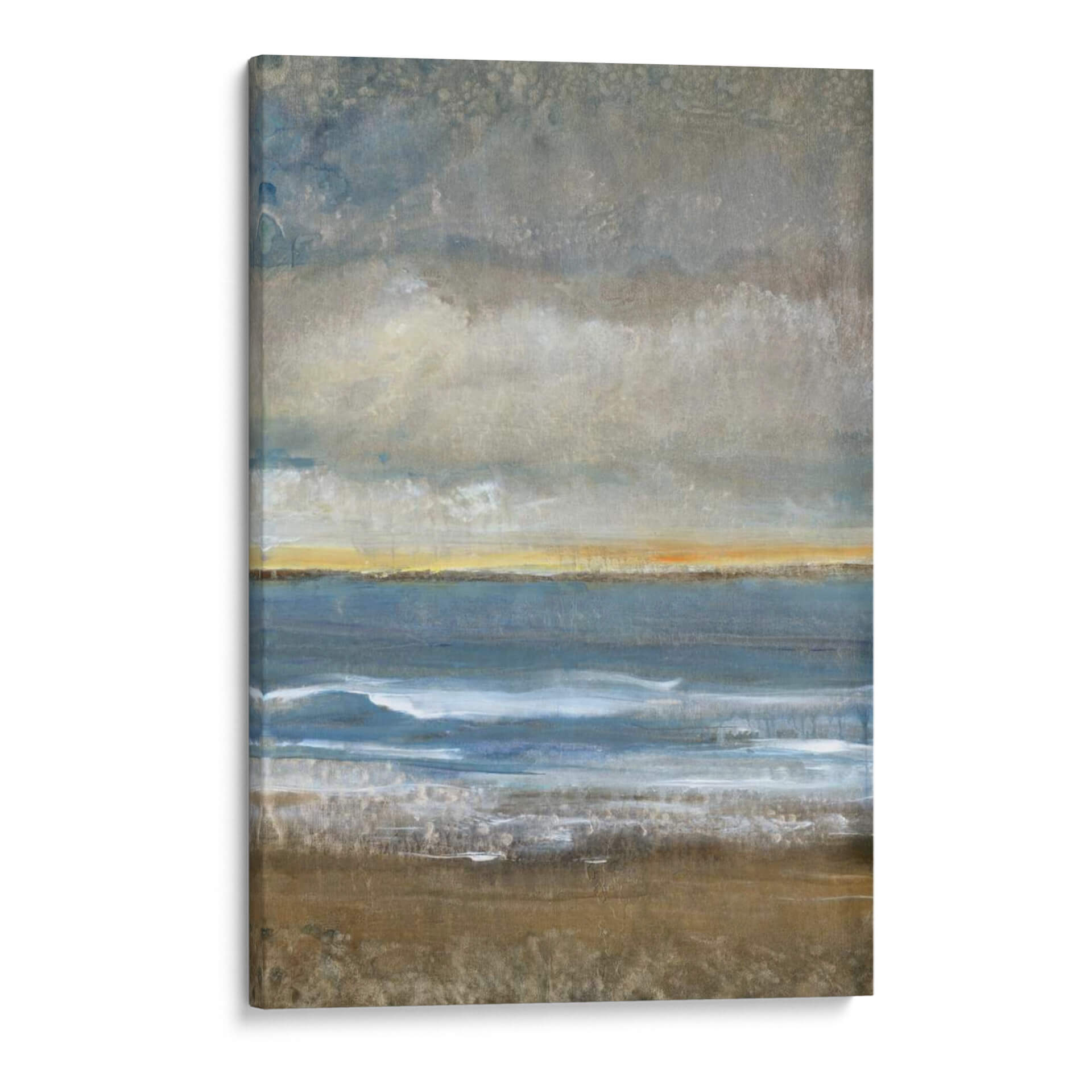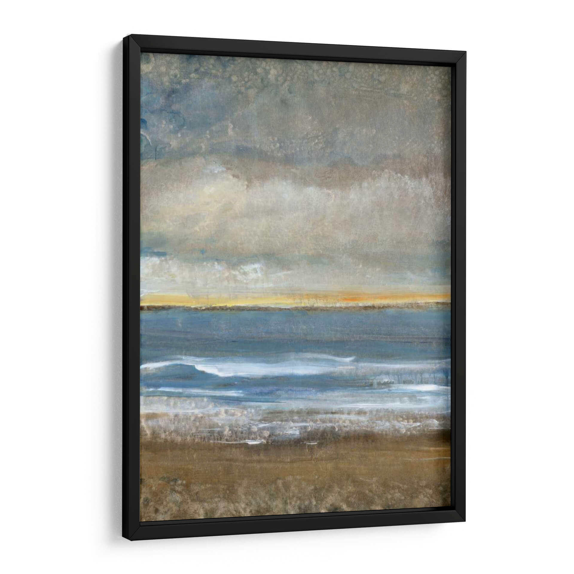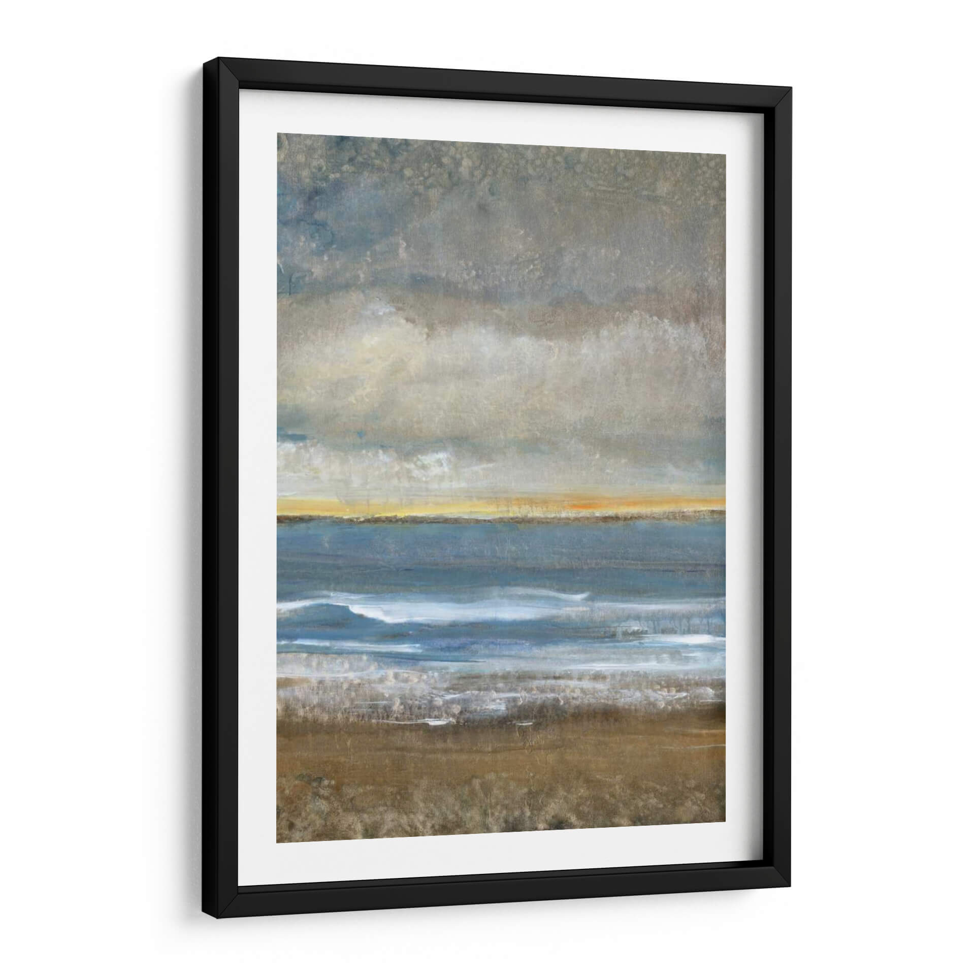 Sumérgete en la serena belleza de "Entre Tierra Y Mar I", una obra de arte contemporáneo que evoca la majestuosidad de la costa. El artista Tim O'Toole captura magistralmente la transición entre la solidez de la tierra y la fluidez del océano, creando una composición visualmente cautivadora. Los tonos tierra del primer plano, ricos y texturizados, contrastan sutilmente con las profundas tonalidades azules del mar, mientras que una franja de luz dorada en el horizonte sugiere la promesa de un nuevo día o el resplandor del atardecer. Las nubes grises y texturizadas en la parte superior añaden una atmósfera contemplativa y un toque de misterio. Esta pieza abstracta, con su paleta de colores equilibrada y su composición evocadora, es ideal para aportar una sensación de calma y conexión con la naturaleza a cualquier espacio. Perfecto para salones, dormitorios o estudios que buscan un toque de sofisticación y tranquilidad. "Entre Tierra Y Mar I" no es solo un cuadro decorativo, es una invitación a la introspección y a la apreciación de los paisajes interiores y exteriores. Añade esta impresionante obra a tu colección y transforma tu hogar u oficina en un santuario de paz y belleza.