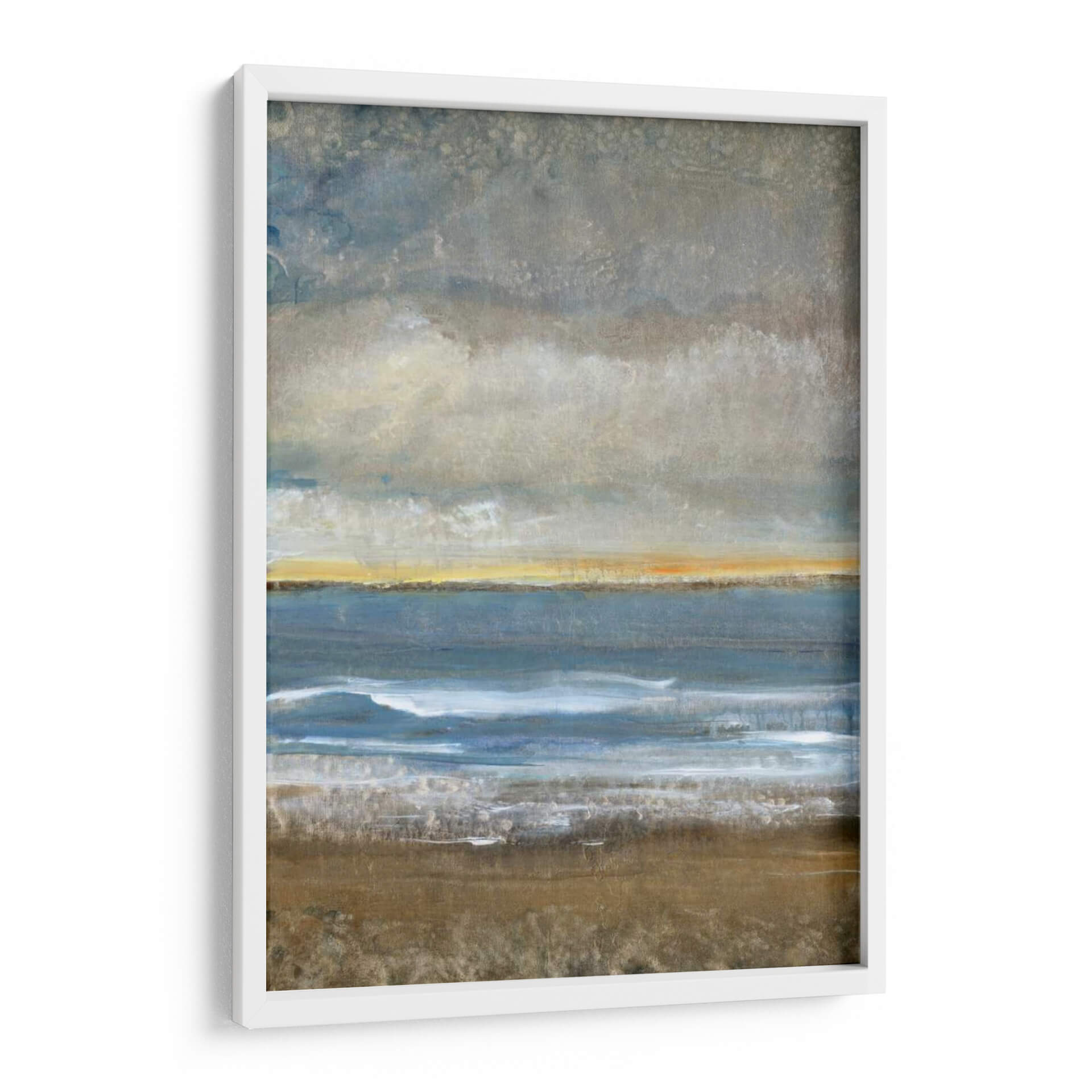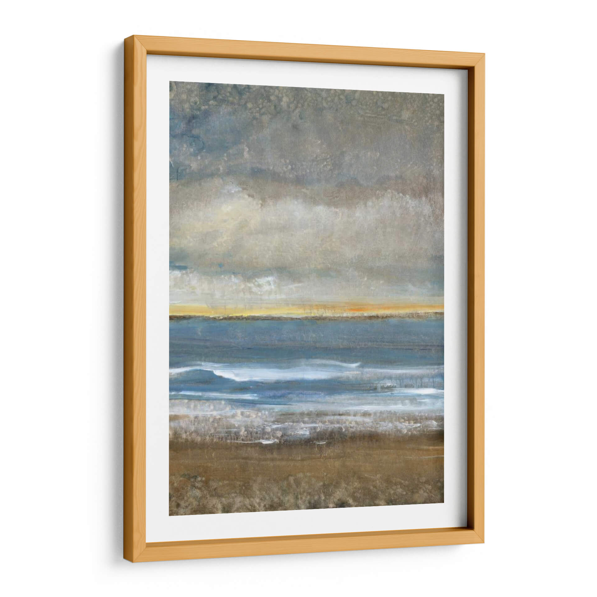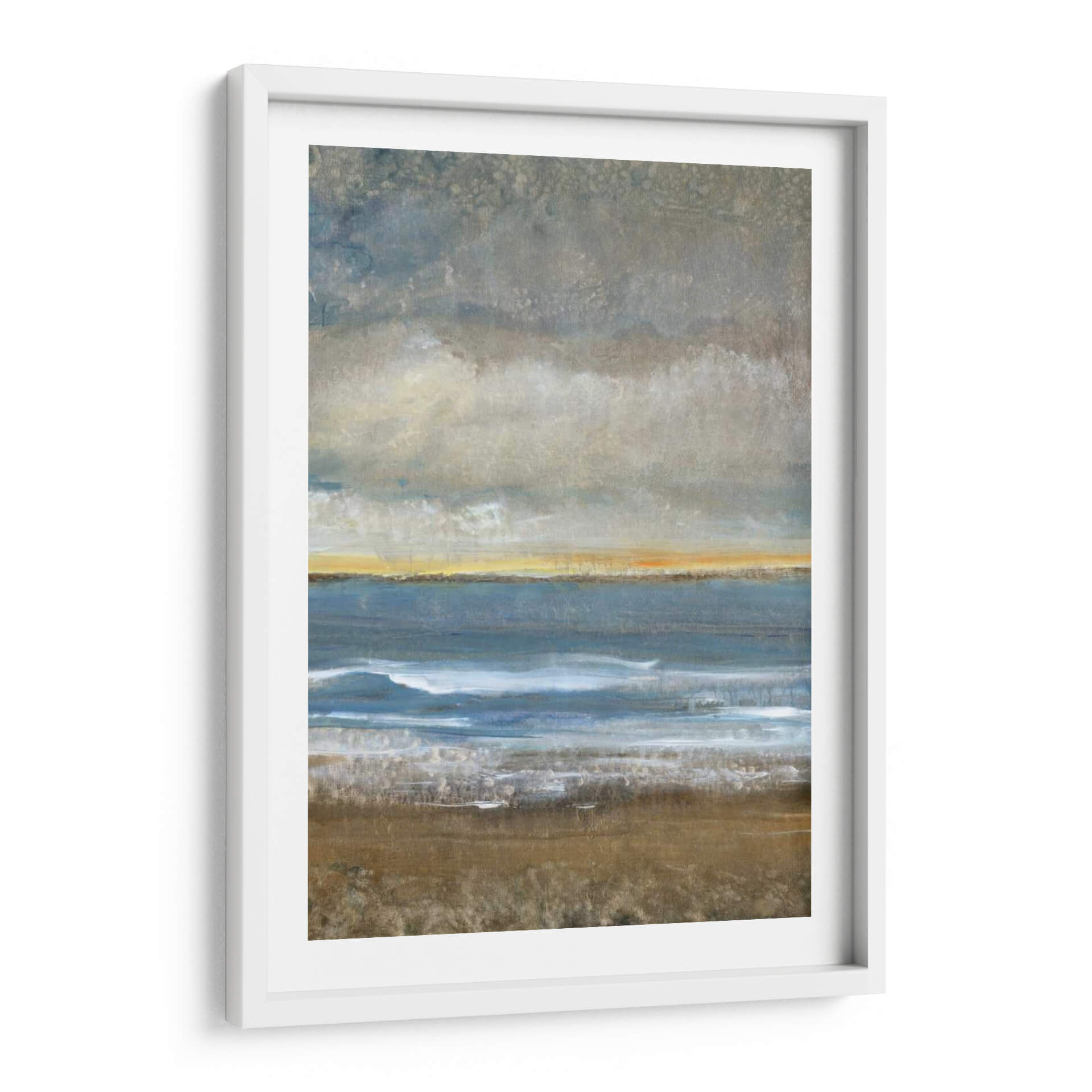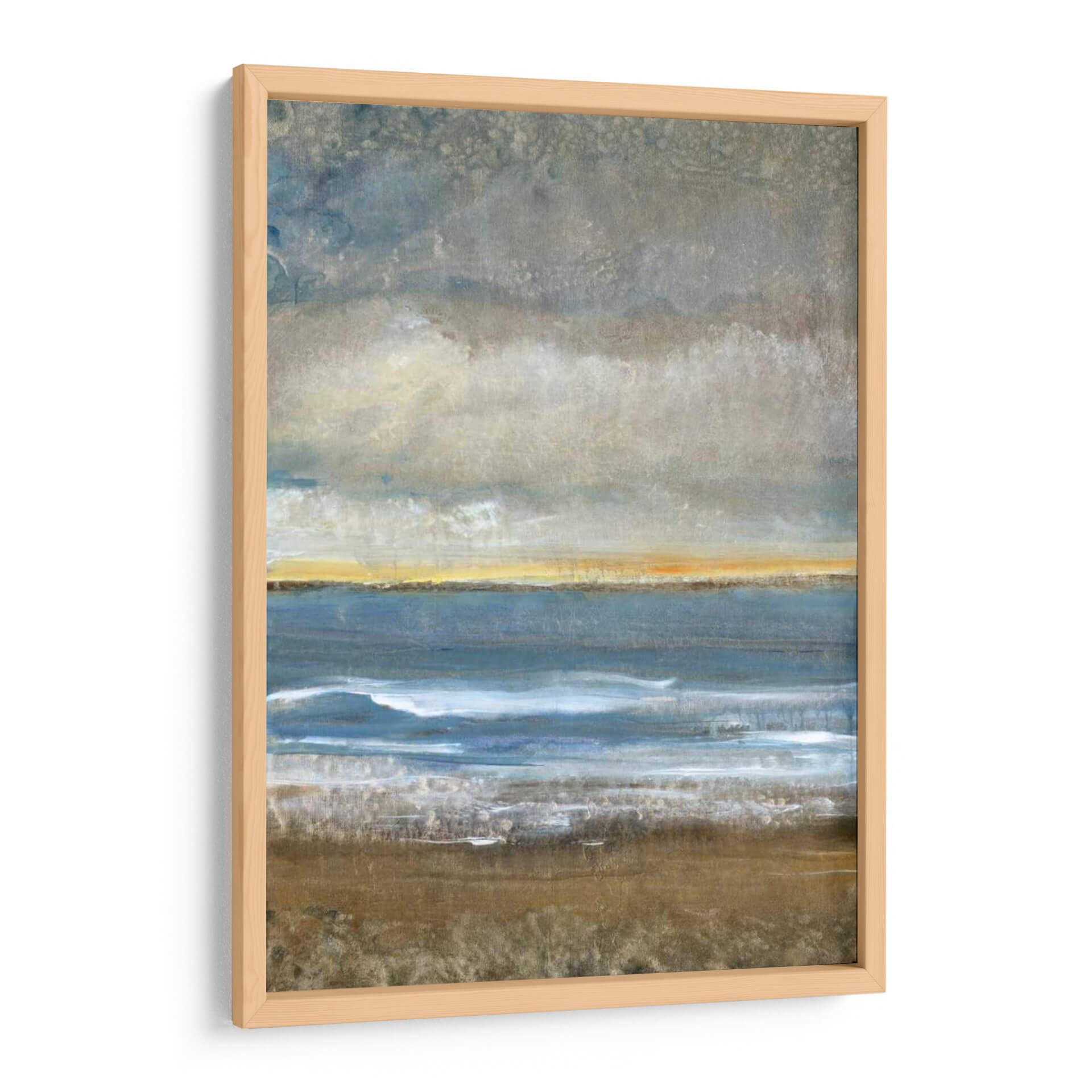 Sumérgete en la serena belleza de "Entre Tierra Y Mar I", una obra de arte contemporáneo que evoca la majestuosidad de la costa. El artista Tim O'Toole captura magistralmente la transición entre la solidez de la tierra y la fluidez del océano, creando una composición visualmente cautivadora. Los tonos tierra del primer plano, ricos y texturizados, contrastan sutilmente con las profundas tonalidades azules del mar, mientras que una franja de luz dorada en el horizonte sugiere la promesa de un nuevo día o el resplandor del atardecer. Las nubes grises y texturizadas en la parte superior añaden una atmósfera contemplativa y un toque de misterio. Esta pieza abstracta, con su paleta de colores equilibrada y su composición evocadora, es ideal para aportar una sensación de calma y conexión con la naturaleza a cualquier espacio. Perfecto para salones, dormitorios o estudios que buscan un toque de sofisticación y tranquilidad. "Entre Tierra Y Mar I" no es solo un cuadro decorativo, es una invitación a la introspección y a la apreciación de los paisajes interiores y exteriores. Añade esta impresionante obra a tu colección y transforma tu hogar u oficina en un santuario de paz y belleza.