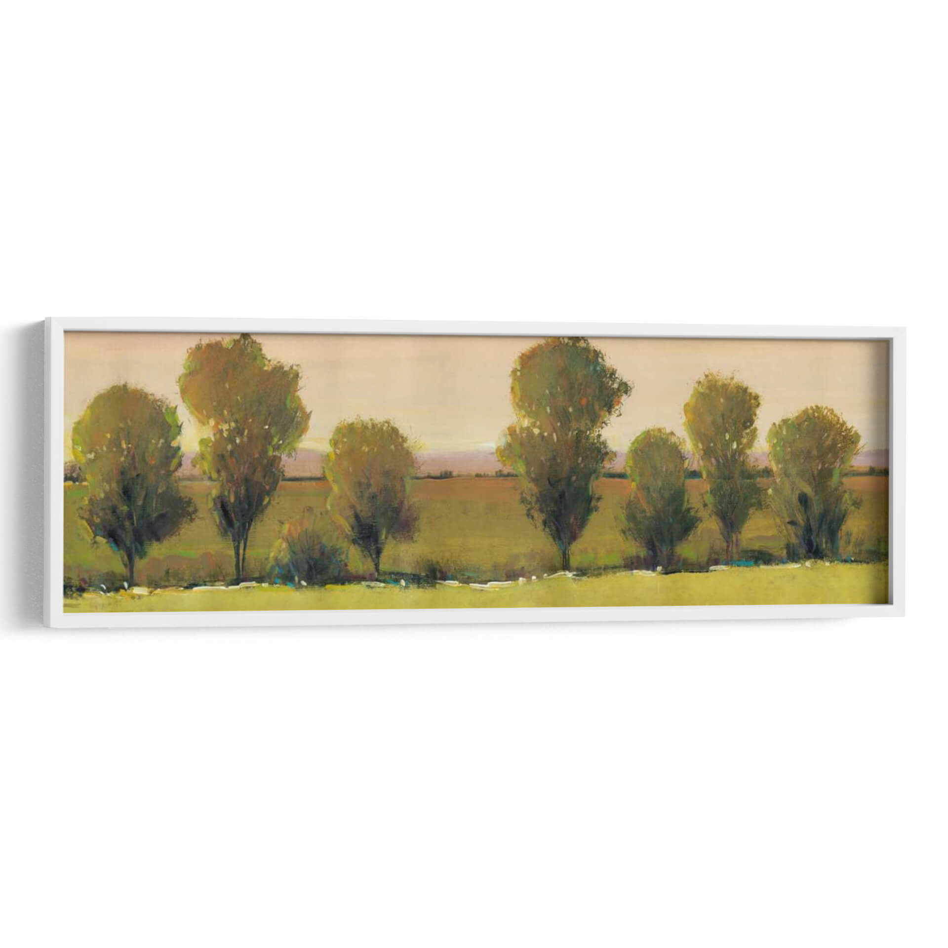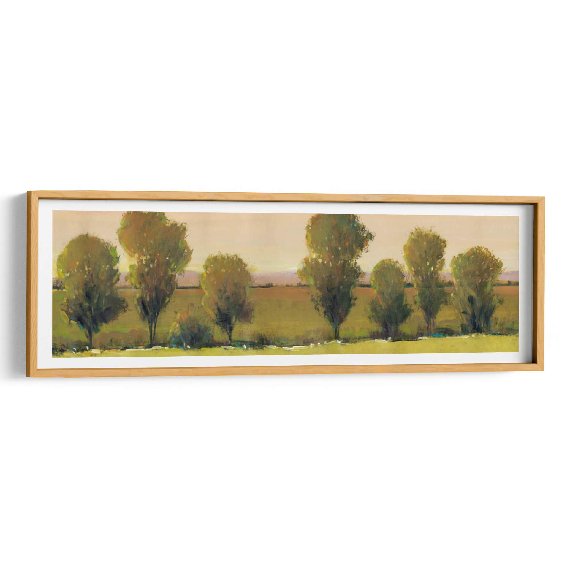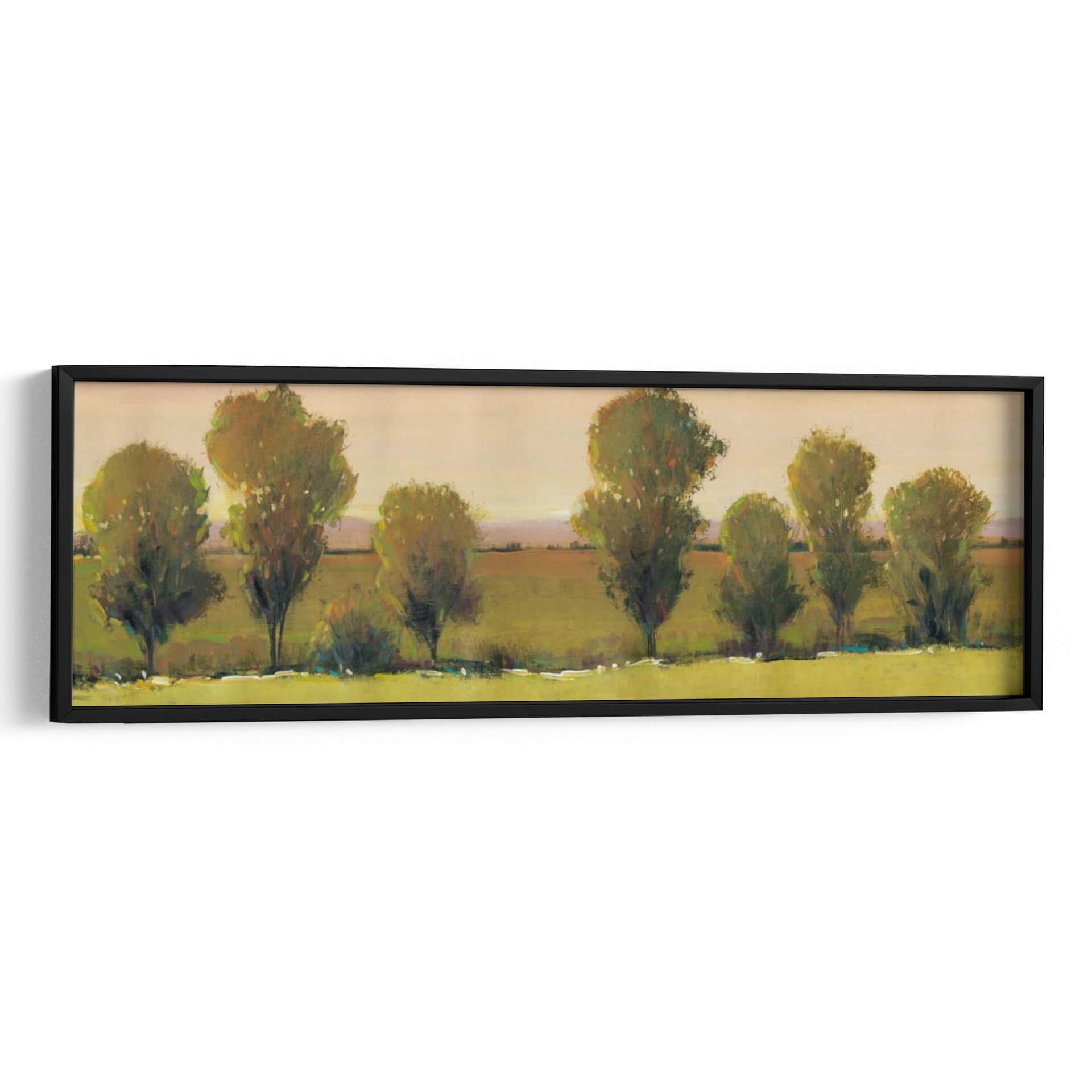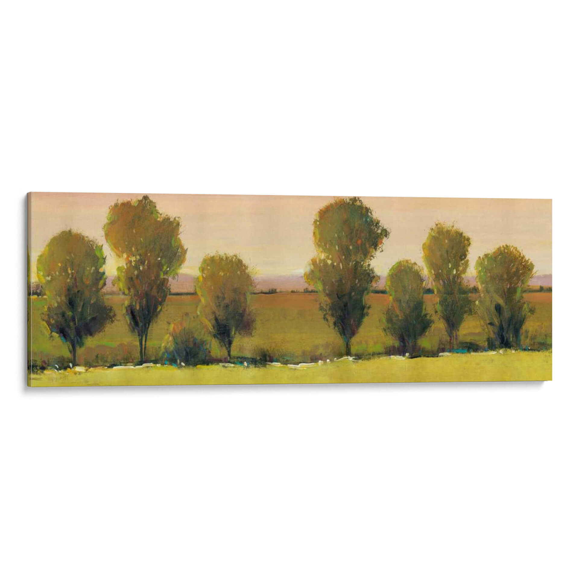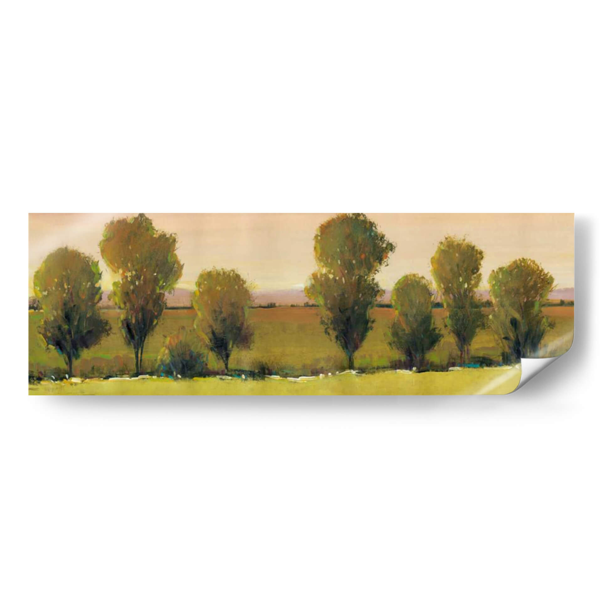 Sumérgete en la serenidad de "Esperando Yo", una obra de arte de Tim O'Toole que captura la esencia de un paisaje apacible al atardecer. Este cuadro decorativo presenta una hilera de árboles estilizados, cuyas copas frondosas se bañan en la luz dorada de un sol poniente, insinuando una atmósfera de calma y contemplación. La paleta de colores, dominada por tonos tierra, verdes musgo y toques de ocre y melocotón en el cielo, crea una sensación de calidez y conexión con la naturaleza. El estilo semi-abstracto de O'Toole permite que la imaginación del espectador se adentre en el escena, invitando a la reflexión sobre la espera y la quietud. Con una composición horizontal que evoca una sensación de amplitud y paz, "Esperando Yo" es ideal para añadir un toque de sofisticación natural a tu sala de estar, comedor o incluso a un espacio de oficina que busque inspiración y tranquilidad. Este cuadro decorativo no es solo una pieza visual, sino una invitación a un momento de paz interior, transformando cualquier ambiente en un santuario de serenidad y belleza artística contemporánea.
