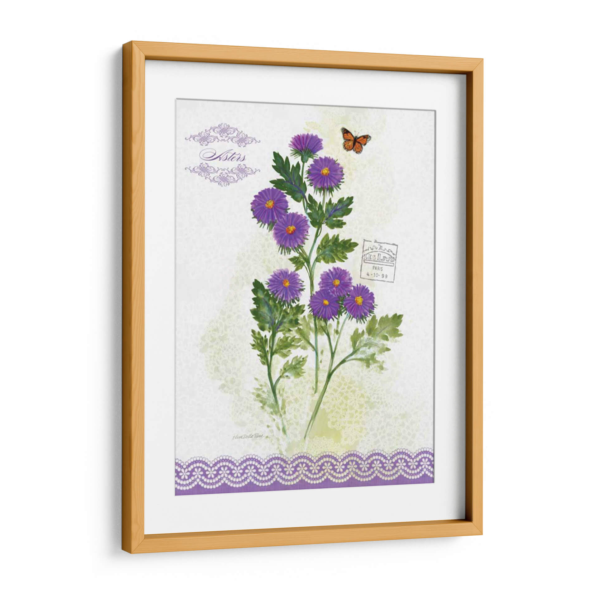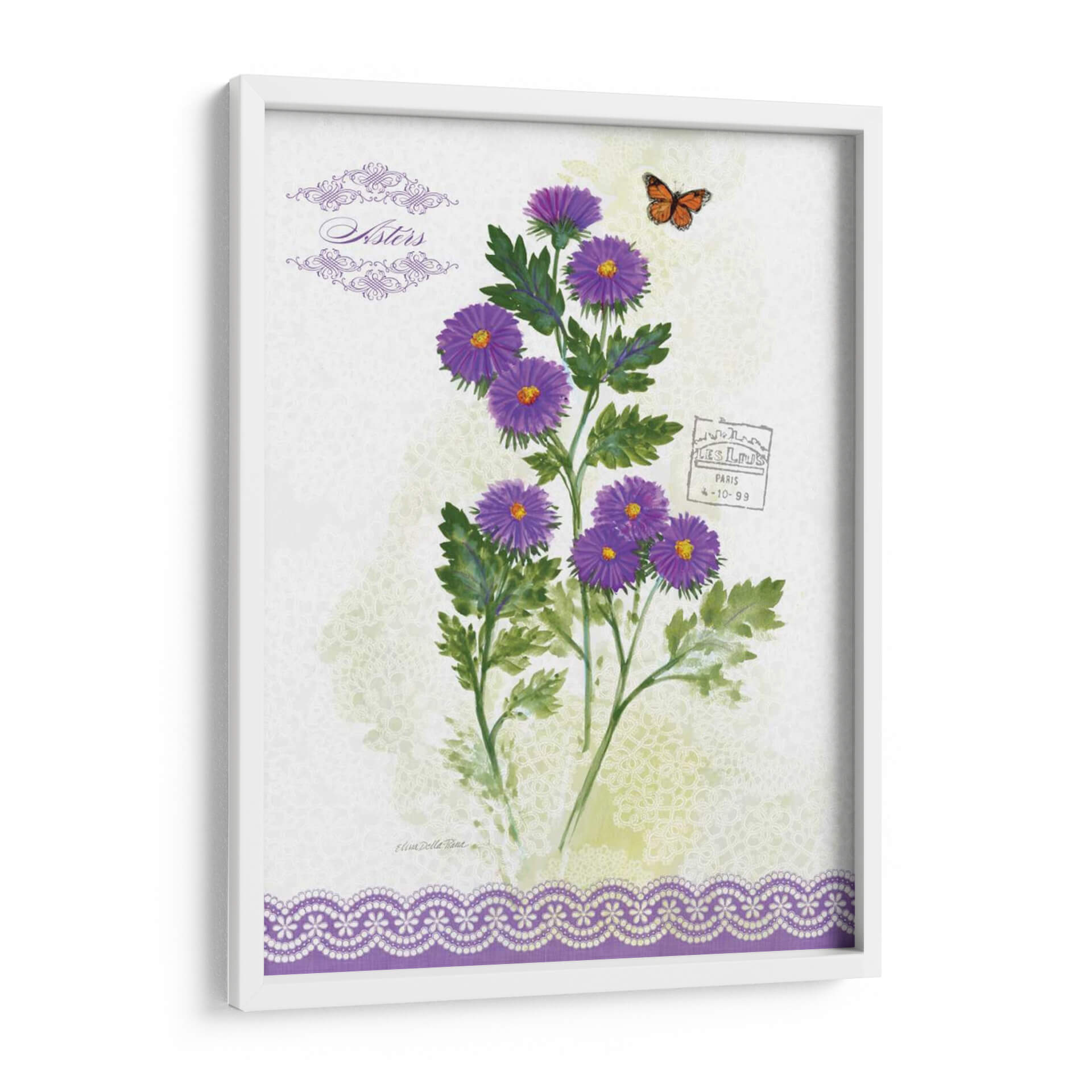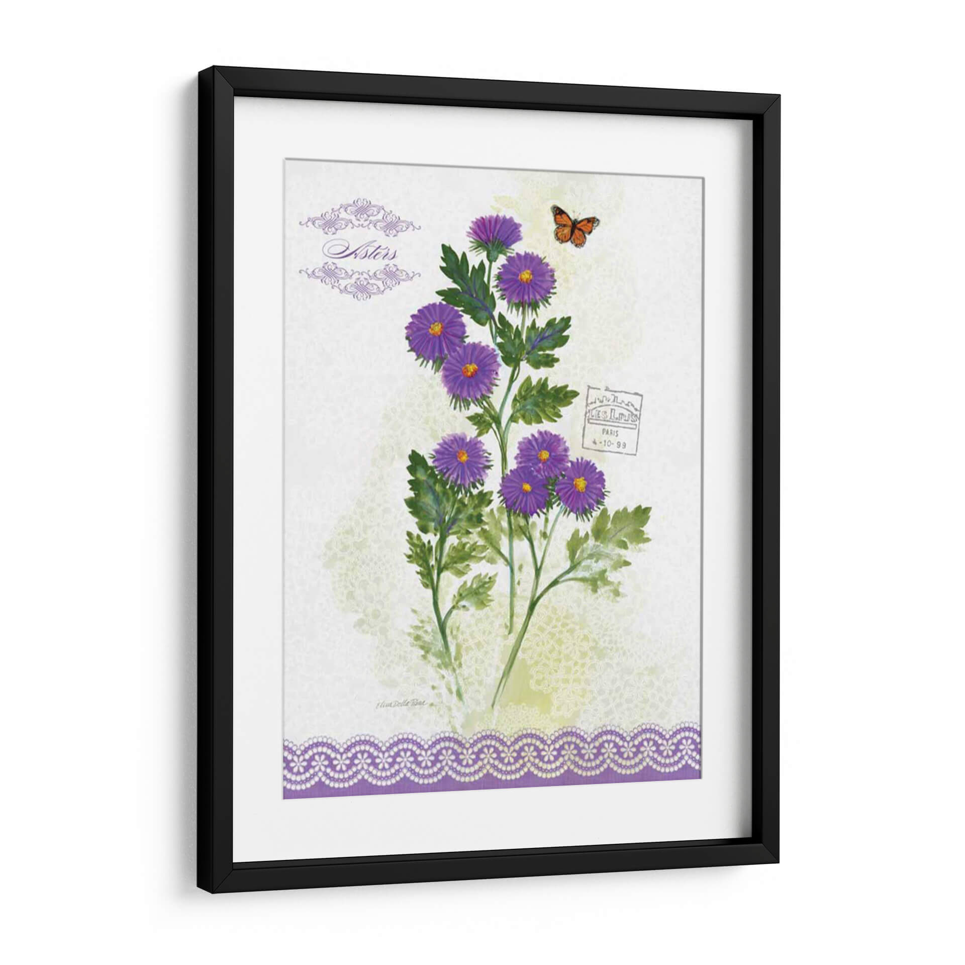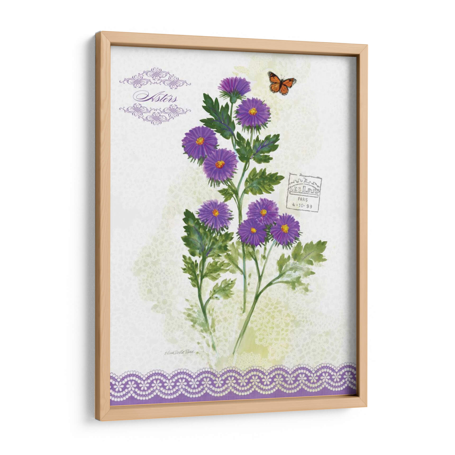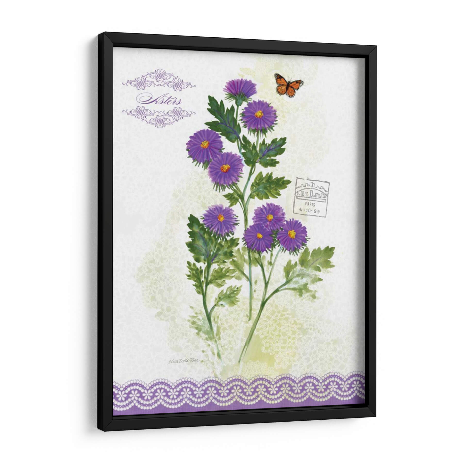 Emb r ec r c i e n d a t u r a l y c s i en t i m e n t al . El cuadro decorativo "Estudio De Flores En El Encaje Ii" de Elissa Della-Piana es una obra delicada y evocadora que captura la belleza de las flores de aster en pleno esplendor. La composición presenta un vibrante ramo de flores púrpuras con centros amarillos brillantes, rodeadas de exuberantes hojas verdes, creando un contraste visual armonioso. El fondo texturizado con sutiles motivos de encaje y una cenefa decorativa inferior añade un toque de elegancia y romanticismo. La presencia de una mariposa anaranjada revoloteando cerca de las flores, junto a un sello postal vintage, aporta un aire de nostalgia y encanto. La paleta de colores, dominada por púrpuras intensos, verdes profundos y toques de naranja, infunde una sensación de vitalidad y alegría natural. Este cuadro es perfecto para quienes buscan añadir un toque de naturaleza y sofisticación a sus espacios, siendo ideal para salones, dormitorios o incluso como un elemento inspirador en una oficina. Su estilo detallado y la atmósfera serena lo convierten en una pieza de arte de pared que aporta serenidad y belleza a cualquier rincón.