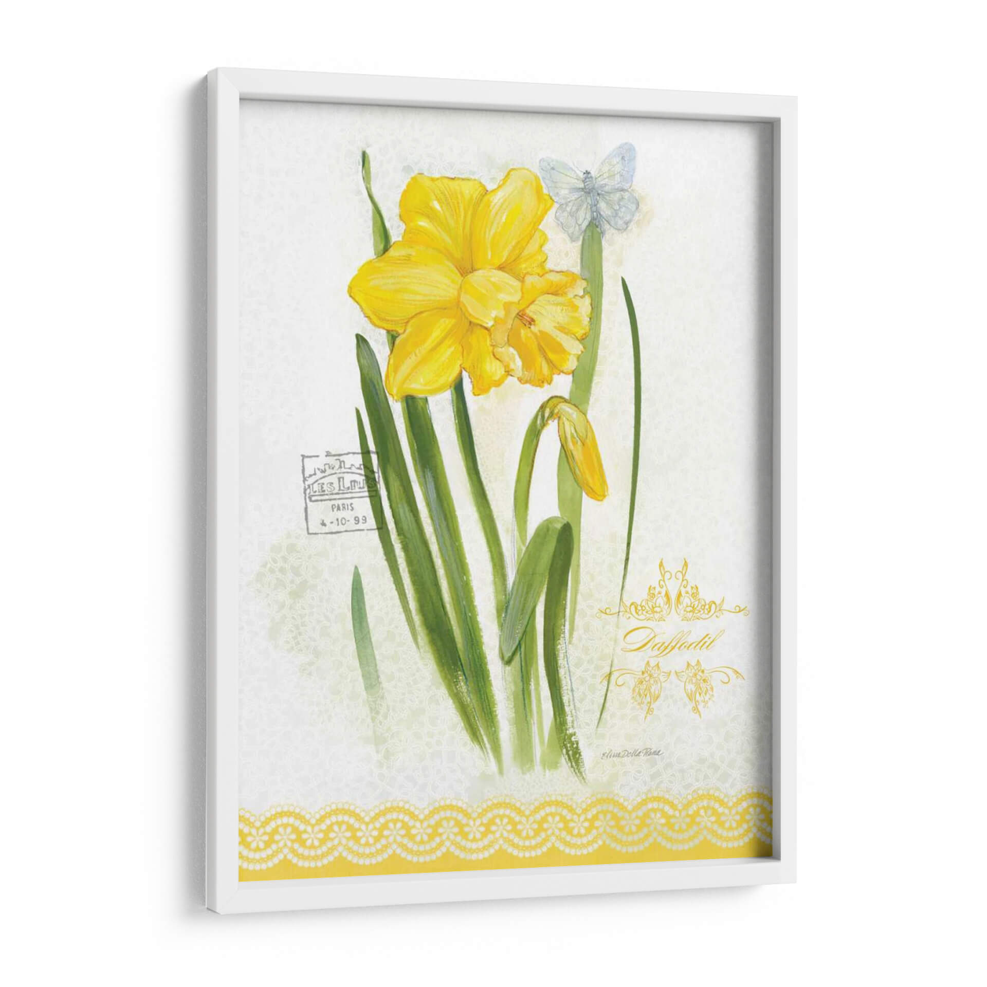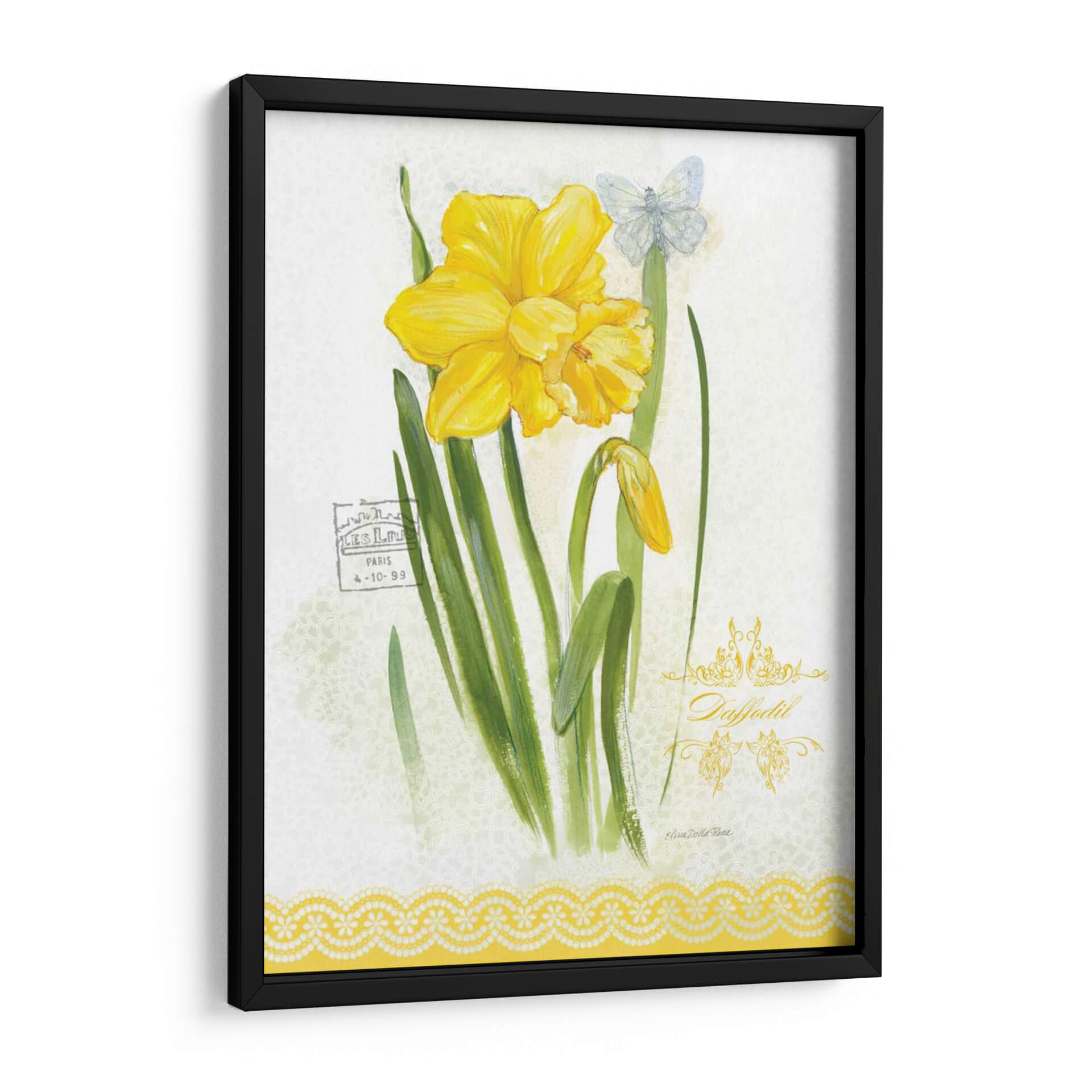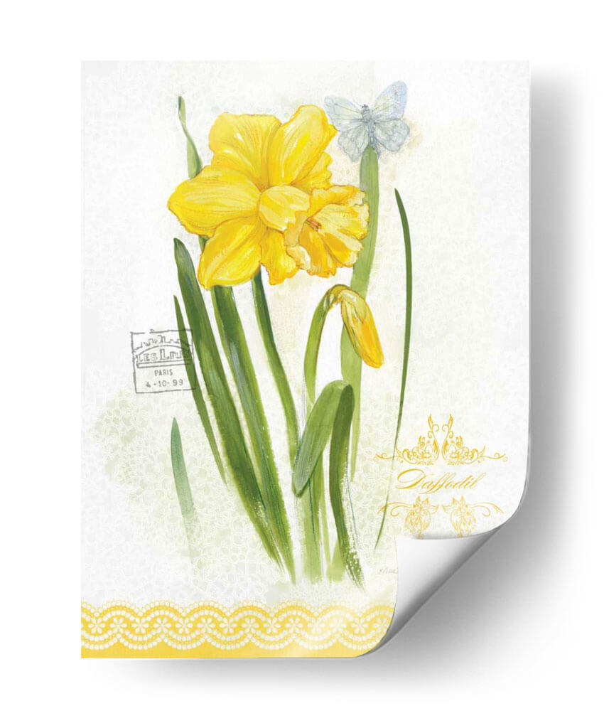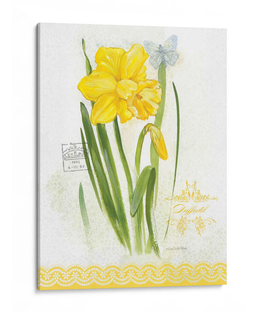 Embellece tu espacio con la delicadeza y el encanto de "Estudio De Flores En El Encaje V", una obra de arte que captura la esencia de la primavera y la sutileza botánica. Este cuadro decorativo presenta un vibrante narciso amarillo en plena floración, acompañado de un capullo emergente y un etéreo mariposa azul pálido, todo sobre un fondo texturizado que evoca encaje delicado. La paleta de colores, dominada por alegres amarillos y verdes naturales, aporta luminosidad y frescura a cualquier ambiente. La acuarela, con toques sutiles de estilo vintage, transmite una sensación de calma y elegancia atemporal. Ideal para quienes buscan añadir un toque de serenidad y belleza natural a su hogar u oficina, este cuadro es perfecto para salas de estar, dormitorios o incluso como una pieza central en un rincón de lectura. Su composición equilibrada y su temática floral lo convierten en una elección versátil para diversos estilos decorativos, desde el rústico hasta el contemporáneo.