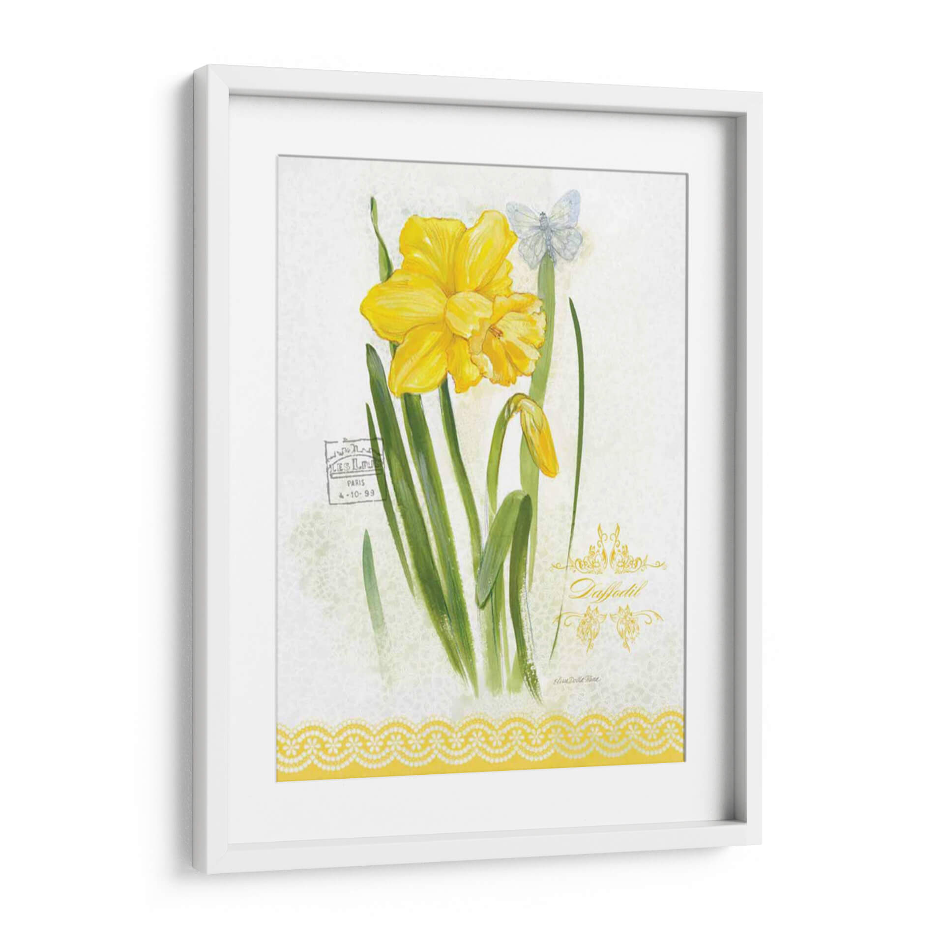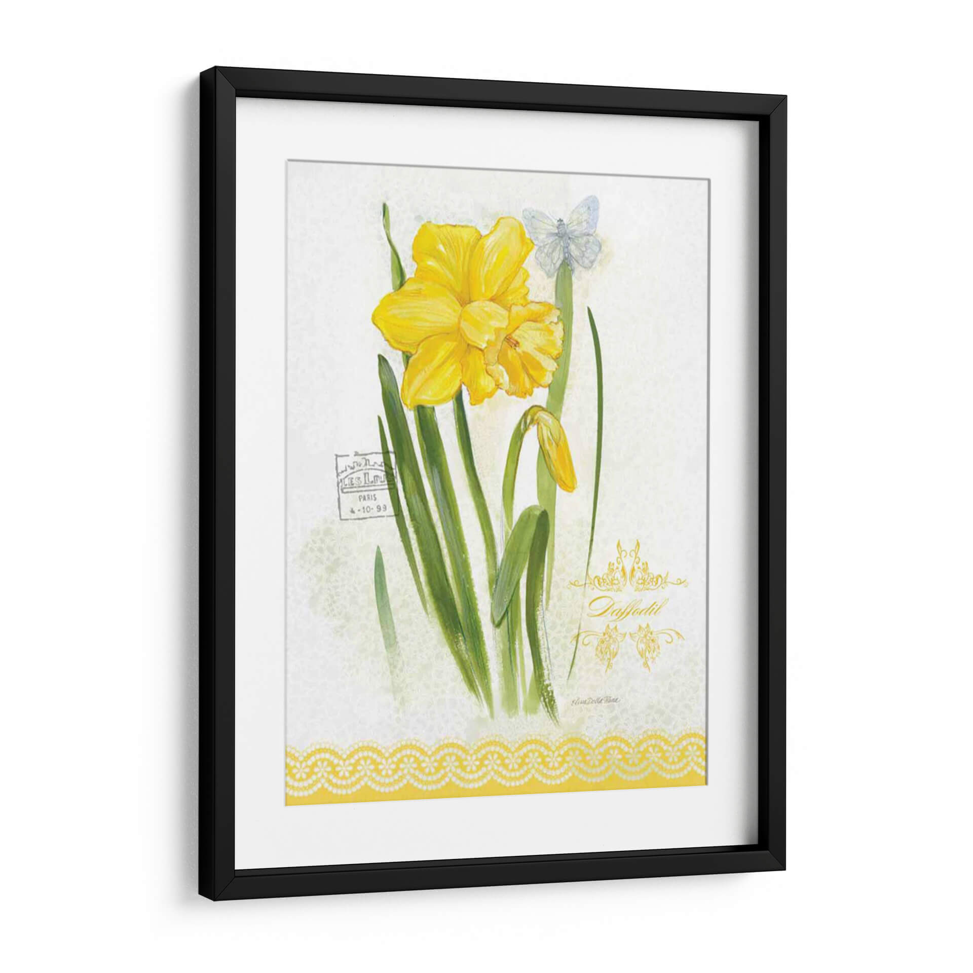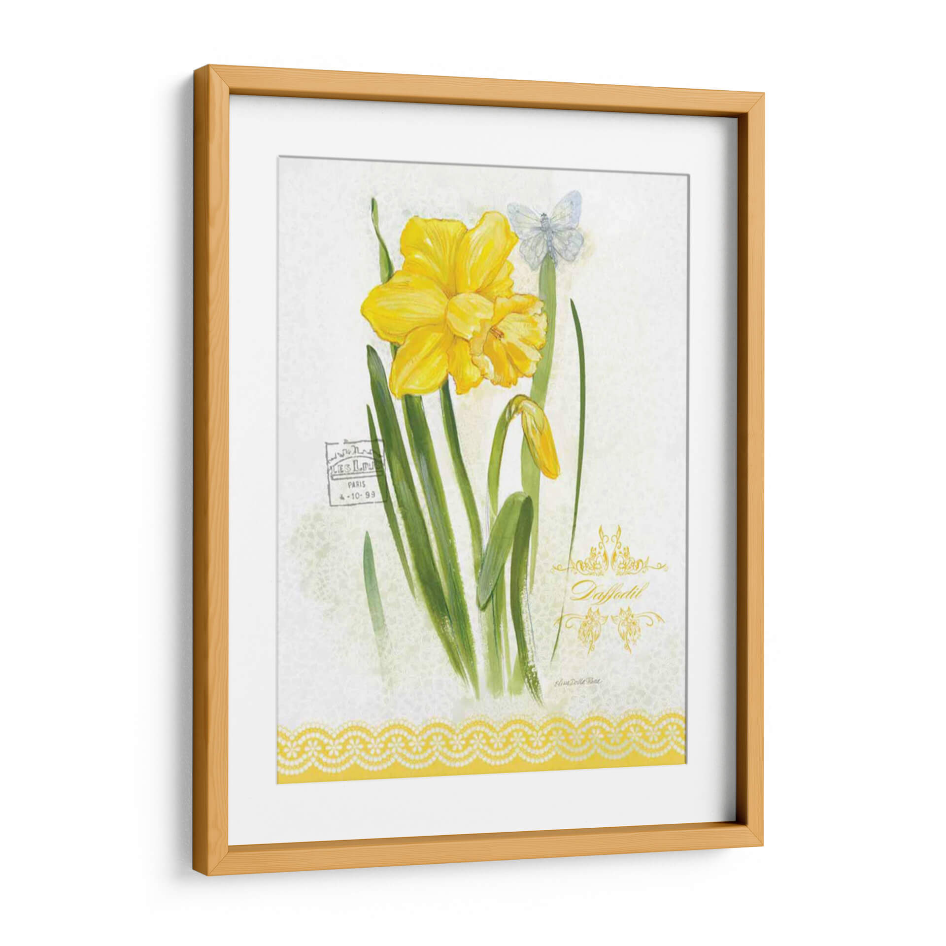 Embellece tu espacio con la delicadeza y el encanto de "Estudio De Flores En El Encaje V", una obra de arte que captura la esencia de la primavera y la sutileza botánica. Este cuadro decorativo presenta un vibrante narciso amarillo en plena floración, acompañado de un capullo emergente y un etéreo mariposa azul pálido, todo sobre un fondo texturizado que evoca encaje delicado. La paleta de colores, dominada por alegres amarillos y verdes naturales, aporta luminosidad y frescura a cualquier ambiente. La acuarela, con toques sutiles de estilo vintage, transmite una sensación de calma y elegancia atemporal. Ideal para quienes buscan añadir un toque de serenidad y belleza natural a su hogar u oficina, este cuadro es perfecto para salas de estar, dormitorios o incluso como una pieza central en un rincón de lectura. Su composición equilibrada y su temática floral lo convierten en una elección versátil para diversos estilos decorativos, desde el rústico hasta el contemporáneo.
