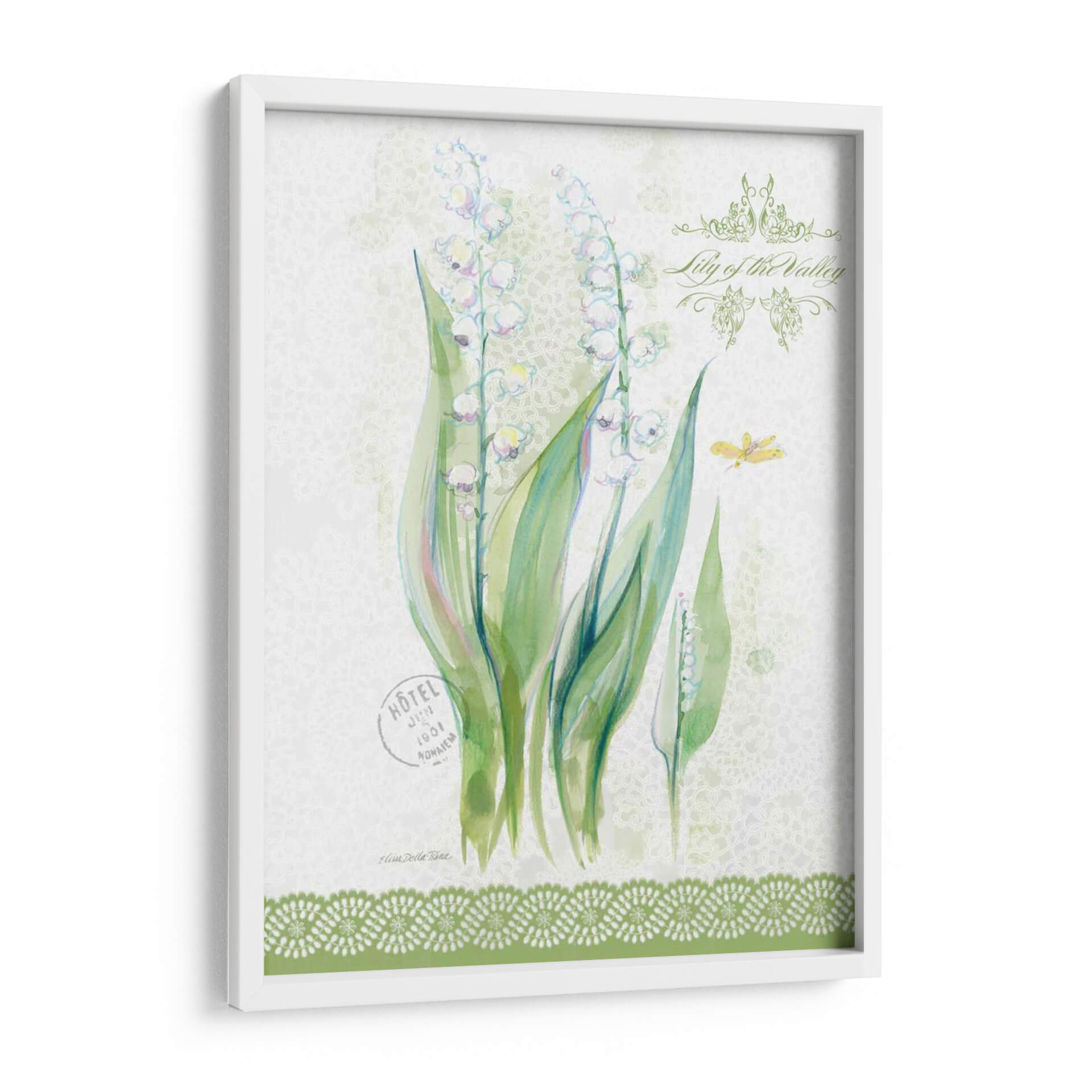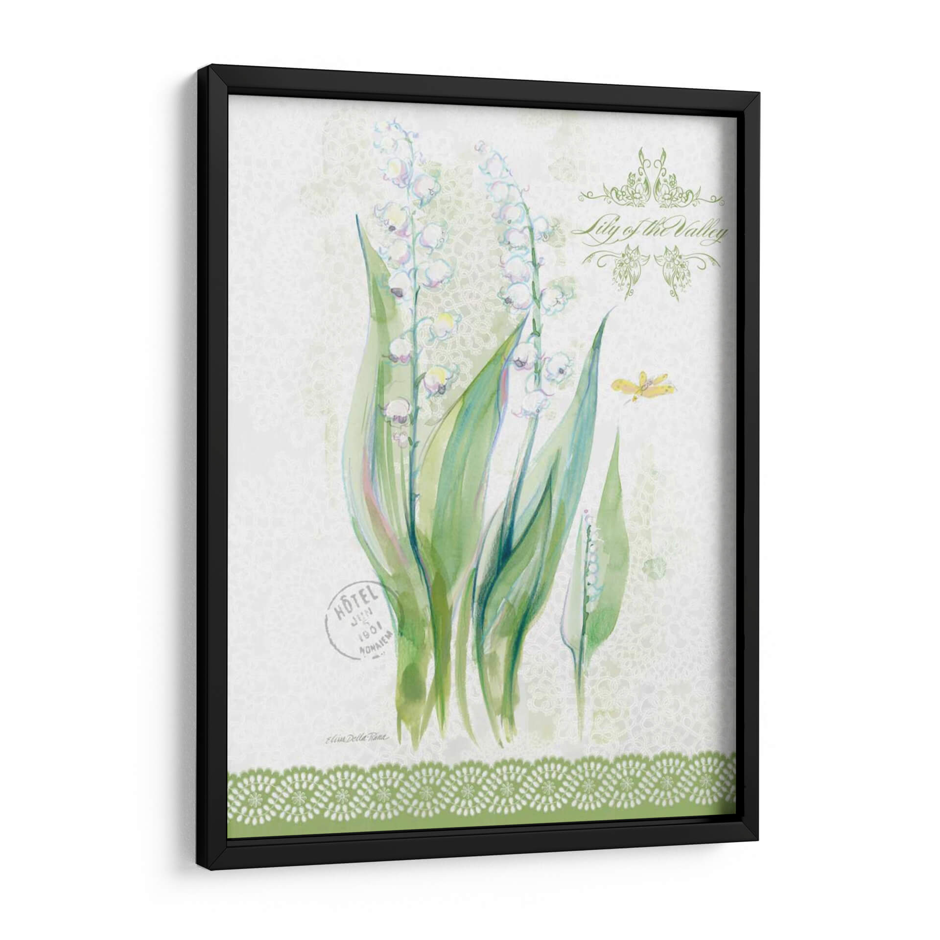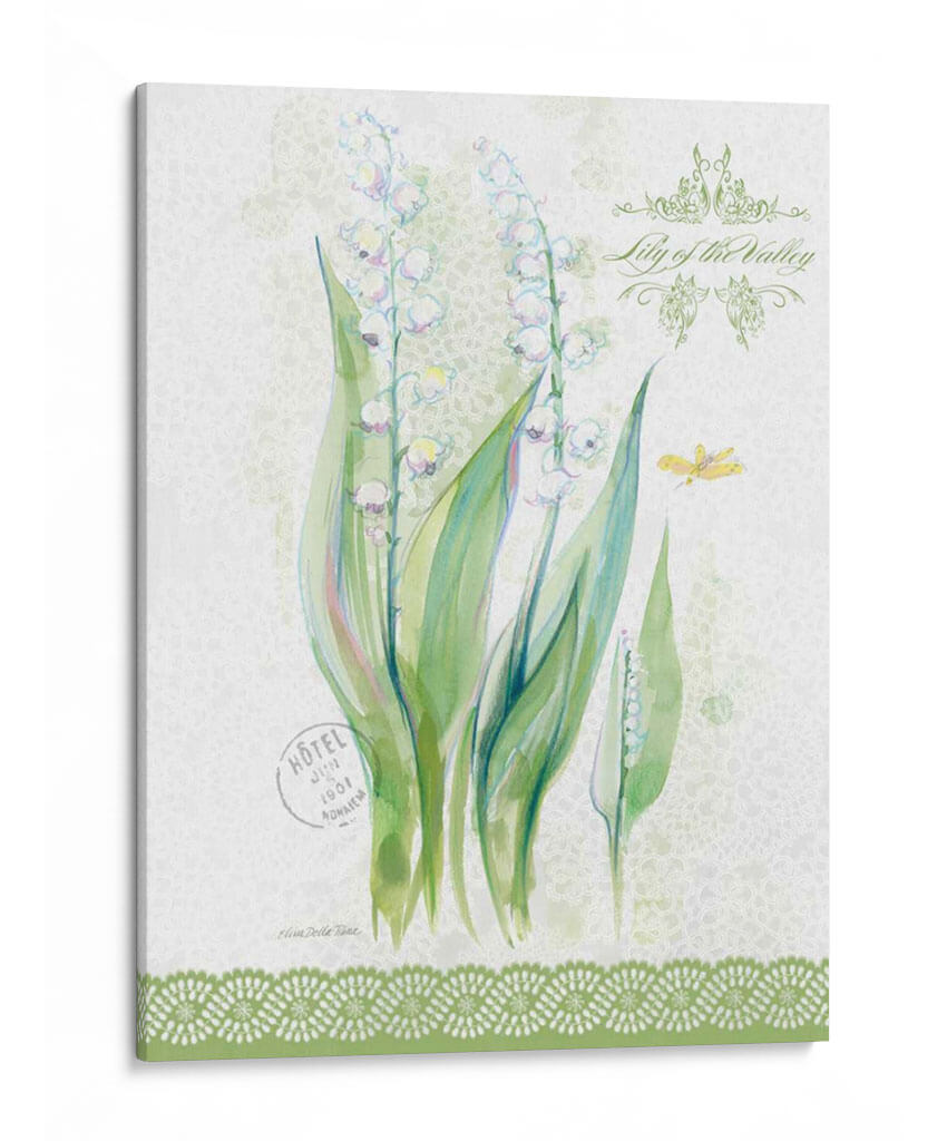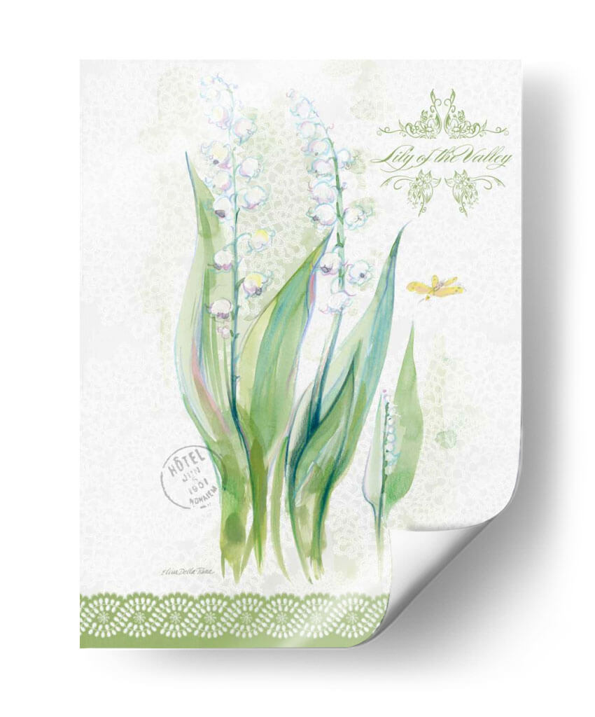 Sumérgete en la delicadeza primaveral con nuestro cuadro decorativo 'Estudio De Flores En Lace Ix', una obra maestra de Elissa Della-Piana que captura la esencia efímera del lirio de los valles. Esta pieza evoca una sensación de frescura y pureza, con delicadas flores blancas suspendidas en tallos verdes vibrantes, contrastando sobre un sutil fondo texturizado que recuerda a encaje fino. La paleta de colores suaves, dominada por verdes y blancos con toques de rosa pálido y azul, crea una atmósfera serena y etérea, perfecta para infundir tranquilidad en cualquier espacio. La composición se enriquece con detalles sutiles como una mariposa y elementos gráficos vintage, añadiendo una capa de encanto y nostalgia. Ideal para aquellos que buscan añadir un toque de elegancia natural y un susurro de primavera a su hogar u oficina, este cuadro decorativo es una invitación a la contemplación y la belleza. Su estilo, que fusiona lo botánico con toques de acuarela y texturas delicadas, lo convierte en una adición versátil que complementará tanto decoraciones clásicas como contemporáneas, aportando un aire de sofisticación y serenidad.