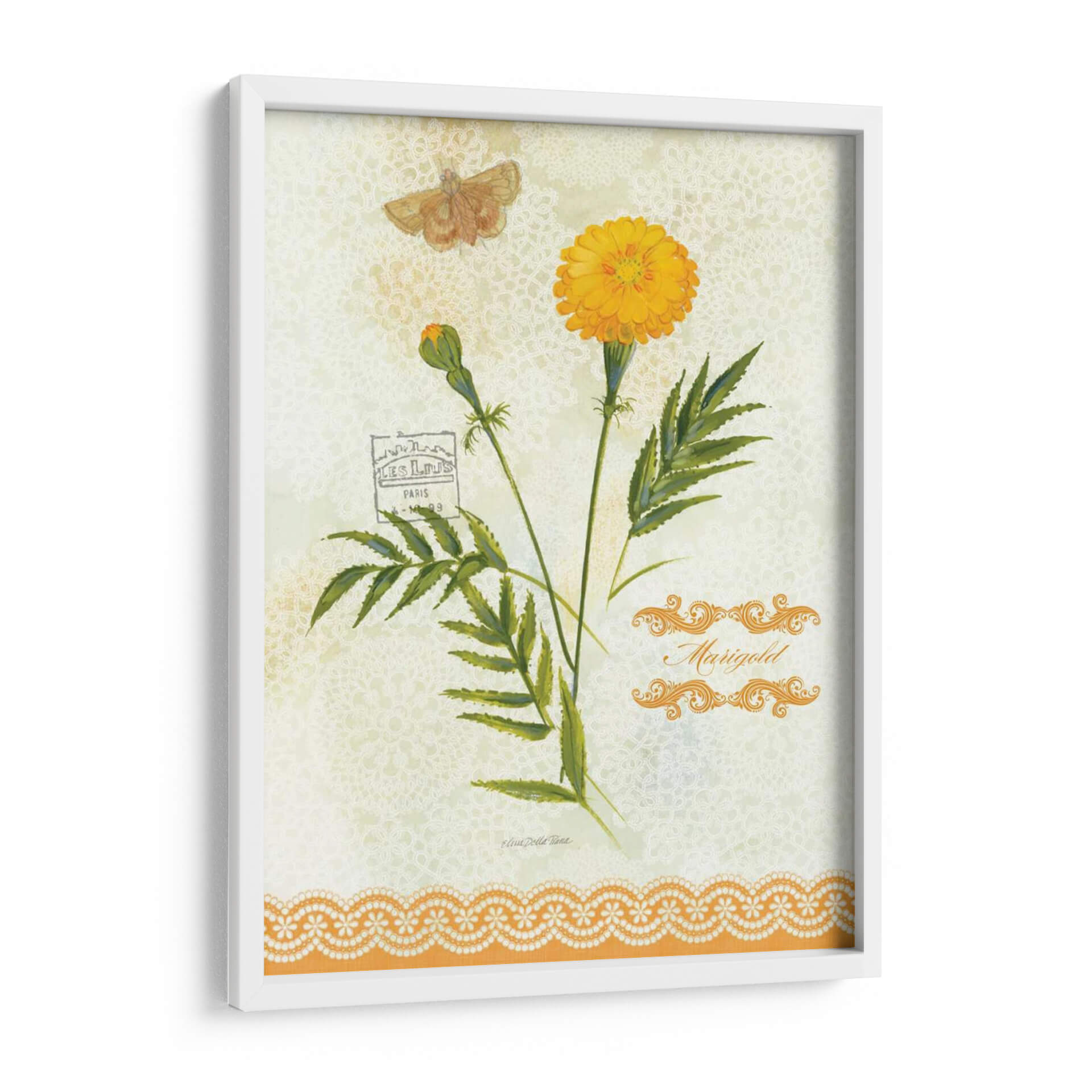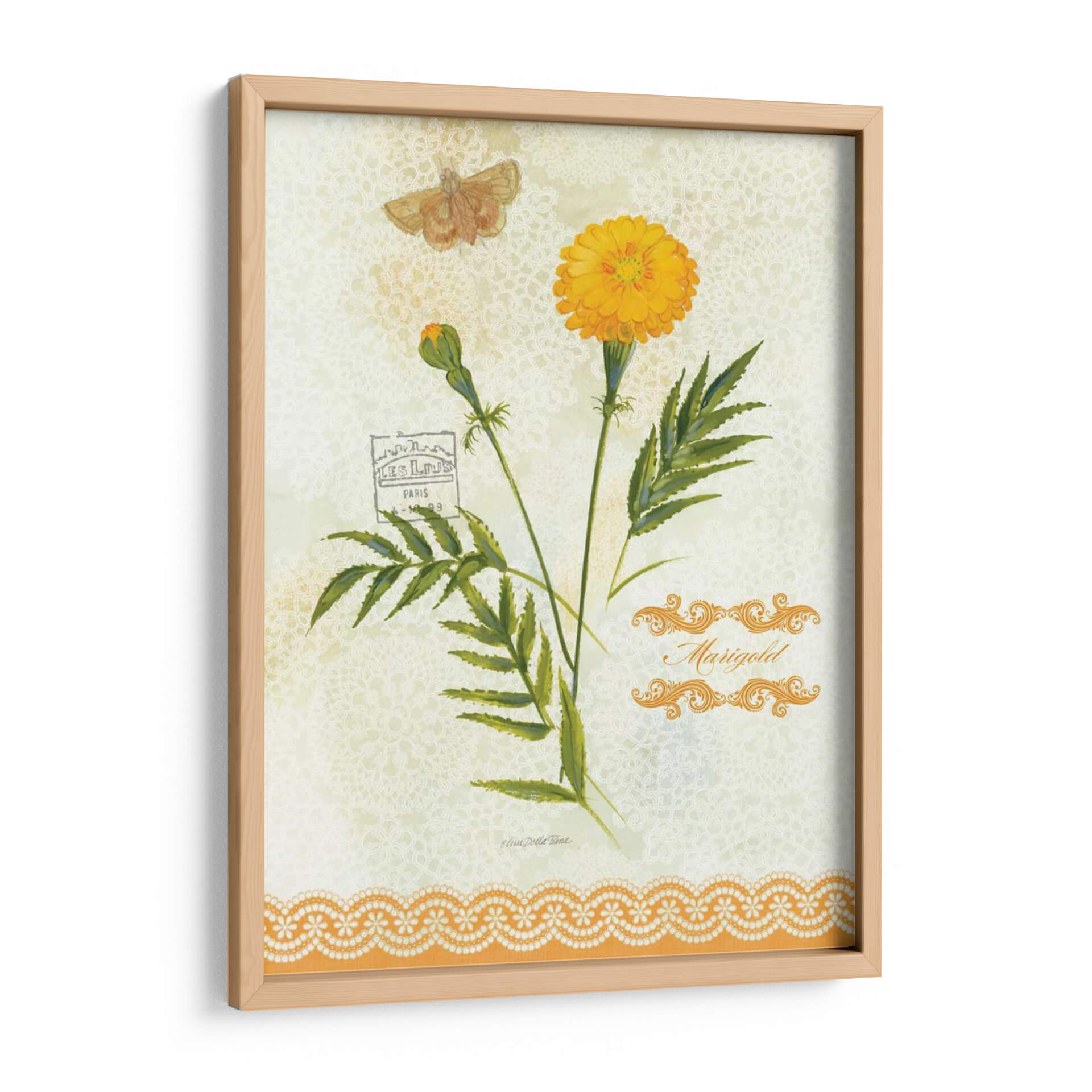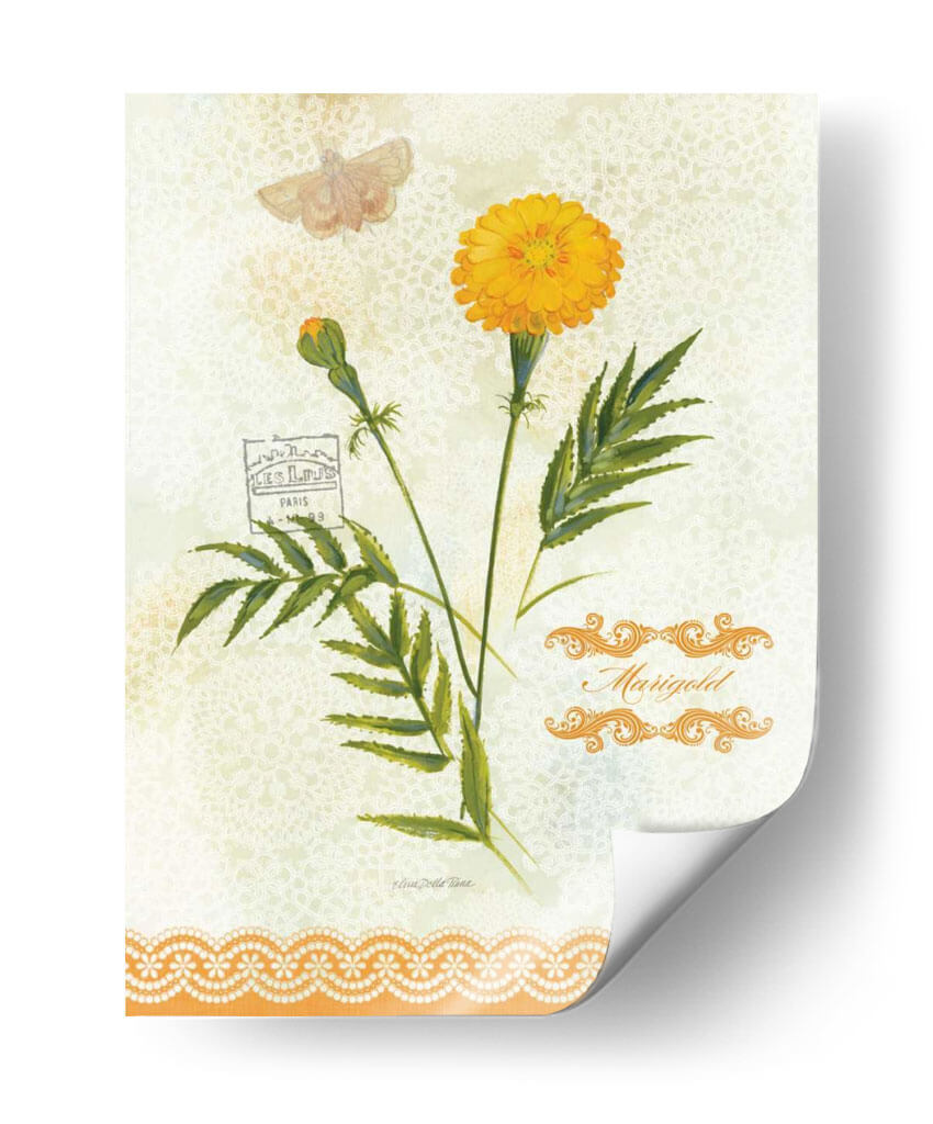Sumérgete en la delicadeza botánica con este encantador cuadro decorativo, "Estudio De Flores En Lace Xi", de Elissa Della-Piana. La obra captura la esencia de una flor de caléndula en plena floración, junto a un capullo a punto de abrirse, todo rodeado de un intrincado patrón de encaje que evoca una sensación de nostalgia y elegancia. La paleta de colores se centra en tonos cálidos y naturales, con el vibrante amarillo de la flor contrastando suavemente con los verdes profundos de las hojas y el suave fondo crema. Un delicado detalle de una mariposa añade un toque de vida y movimiento a la composición, mientras que sellos postales estilizados y la palabra "Marigold" en una elegante tipografía refuerzan la temática botánica y un aire de recuerdo parisino. Este cuadro es perfecto para añadir un toque de encanto vintage y serenidad a cualquier espacio, desde una acogedora sala de estar hasta un tranquilo dormitorio o una oficina inspiradora. La fina pincelada y la atención al detalle invitan a la contemplación, convirtiendo esta pieza en un punto focal que transmite calma y belleza atemporal. Ideal para amantes de la naturaleza, el estilo shabby chic o aquellos que buscan una decoración con un alma.