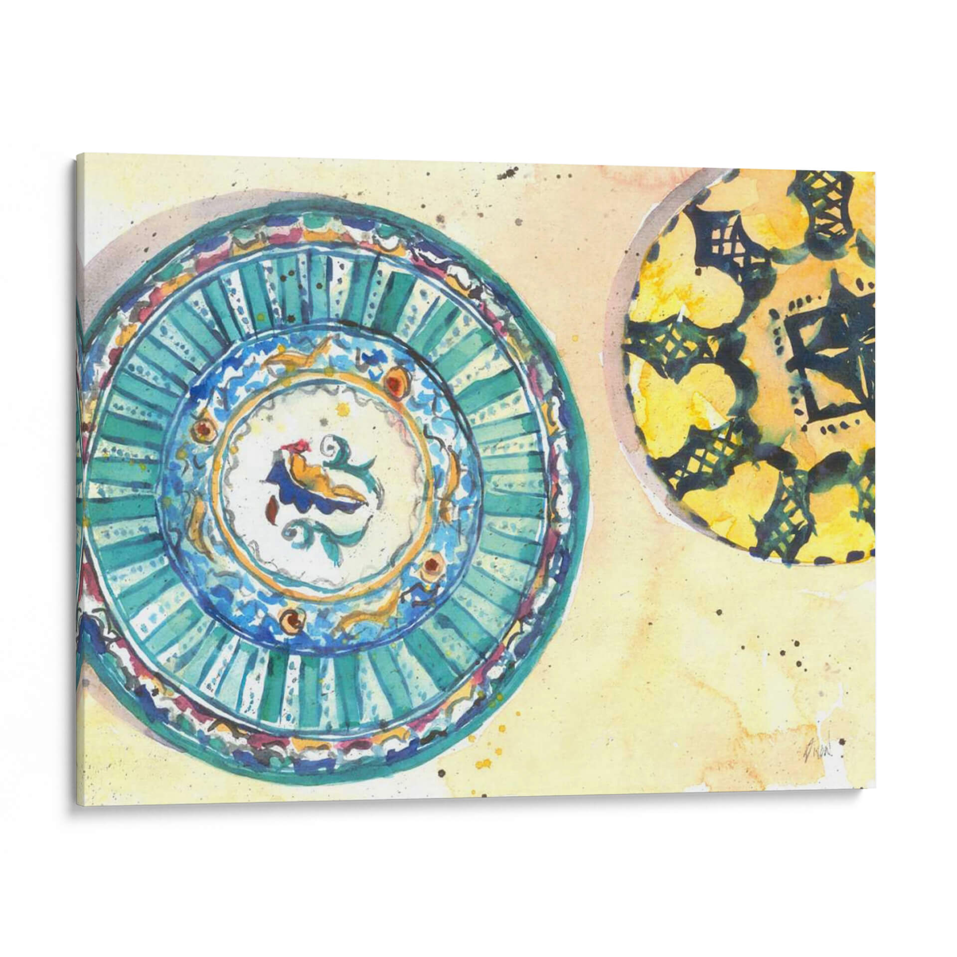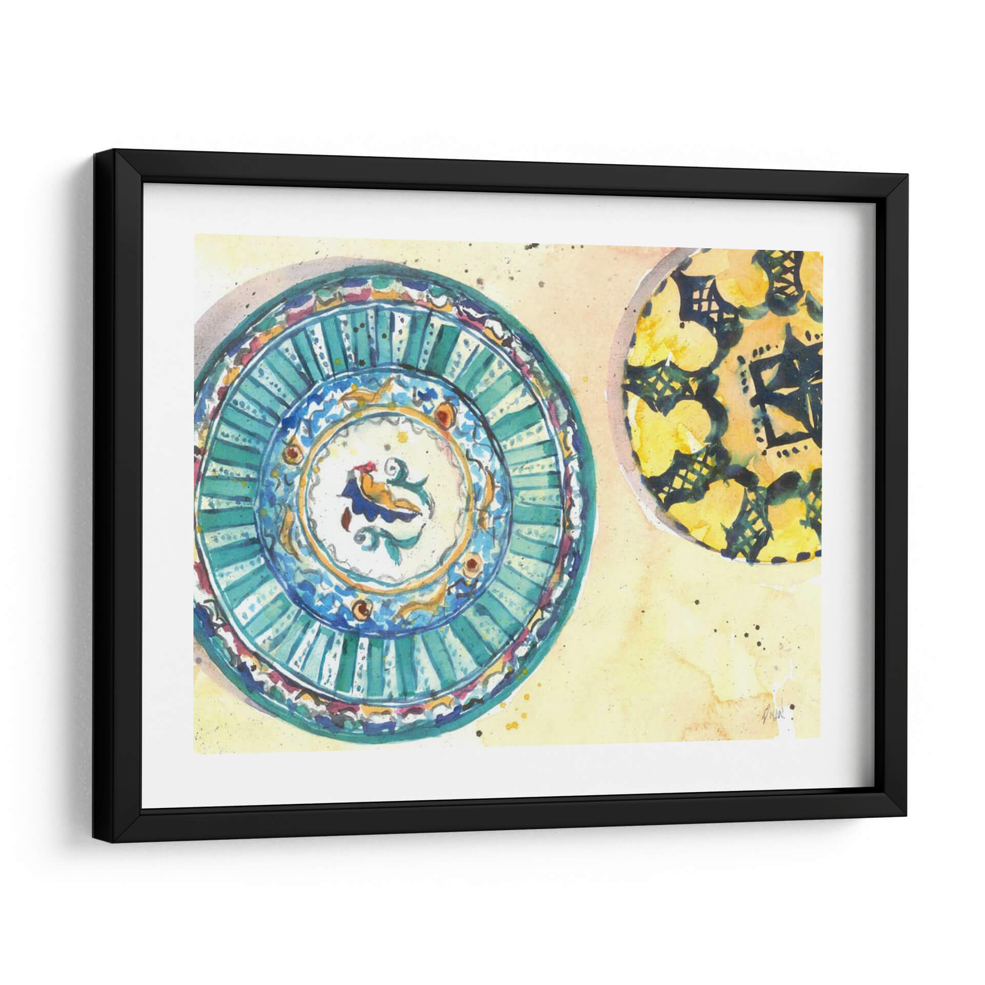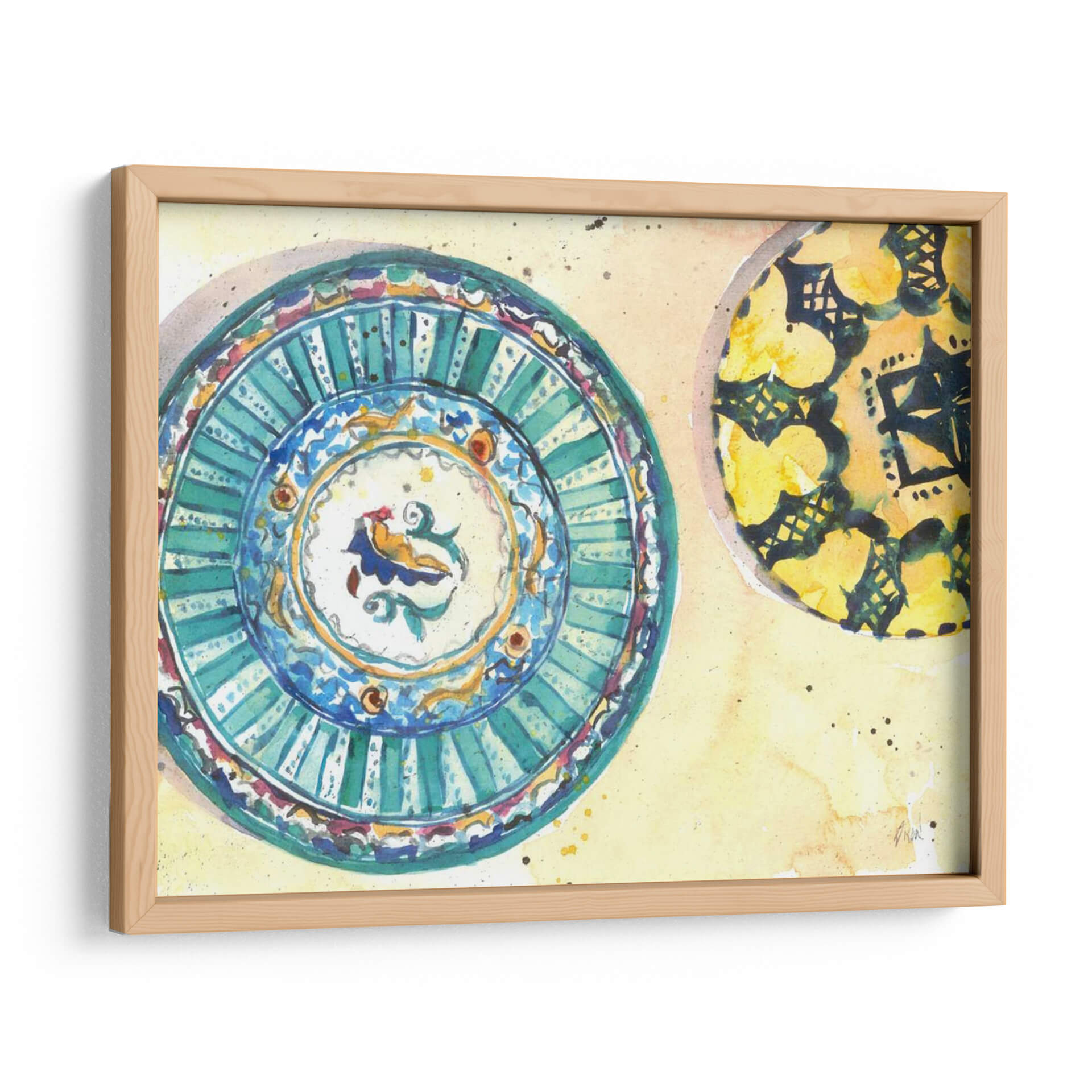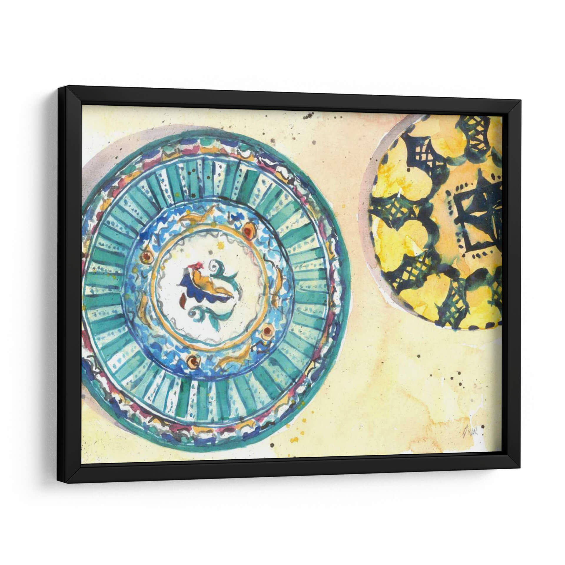 Sumérgete en la vibrante tradición artesanal con "Estudio De Placa I", una obra de arte que captura la esencia de la cerámica decorativa con una técnica de acuarela expresiva. El cuadro presenta dos platos ornamentados sobre un fondo texturizado de tonos tierra, evocando una sensación de calidez y autenticidad. El plato principal, de grandes dimensiones, despliega un intrincado diseño en tonos azules y verdes, con detalles en rojo y amarillo que aportan vitalidad. En su centro, una figura de ave o gallo estilizado irradia un encanto rústico y detallado. El segundo plato, parcialmente visible, contrasta con un patrón más geométrico y audaz en amarillo y negro, sugiriendo una rica diversidad de estilos cerámicos. La acuarela, con sus lavados suaves y salpicaduras sutiles, confiere a la pieza una ligereza etérea y un toque artístico único. Esta obra es perfecta para añadir un acento de color y un aire de sofisticación bohemia a cualquier estancia, desde una cocina acogedora hasta un salón moderno que busque un punto focal lleno de carácter y herencia cultural.