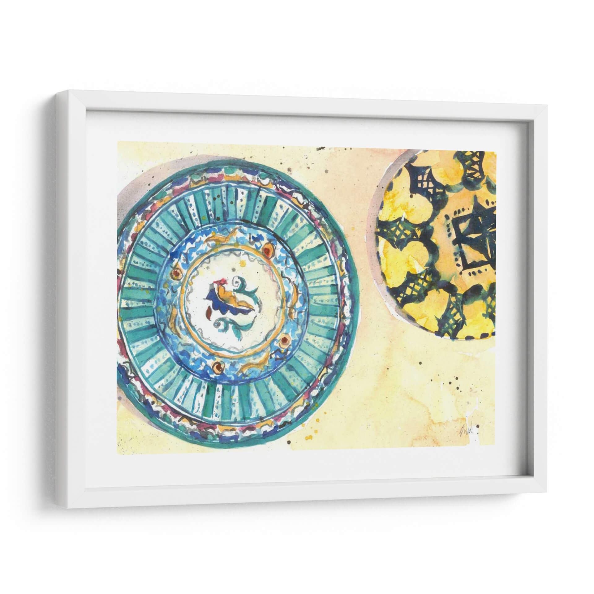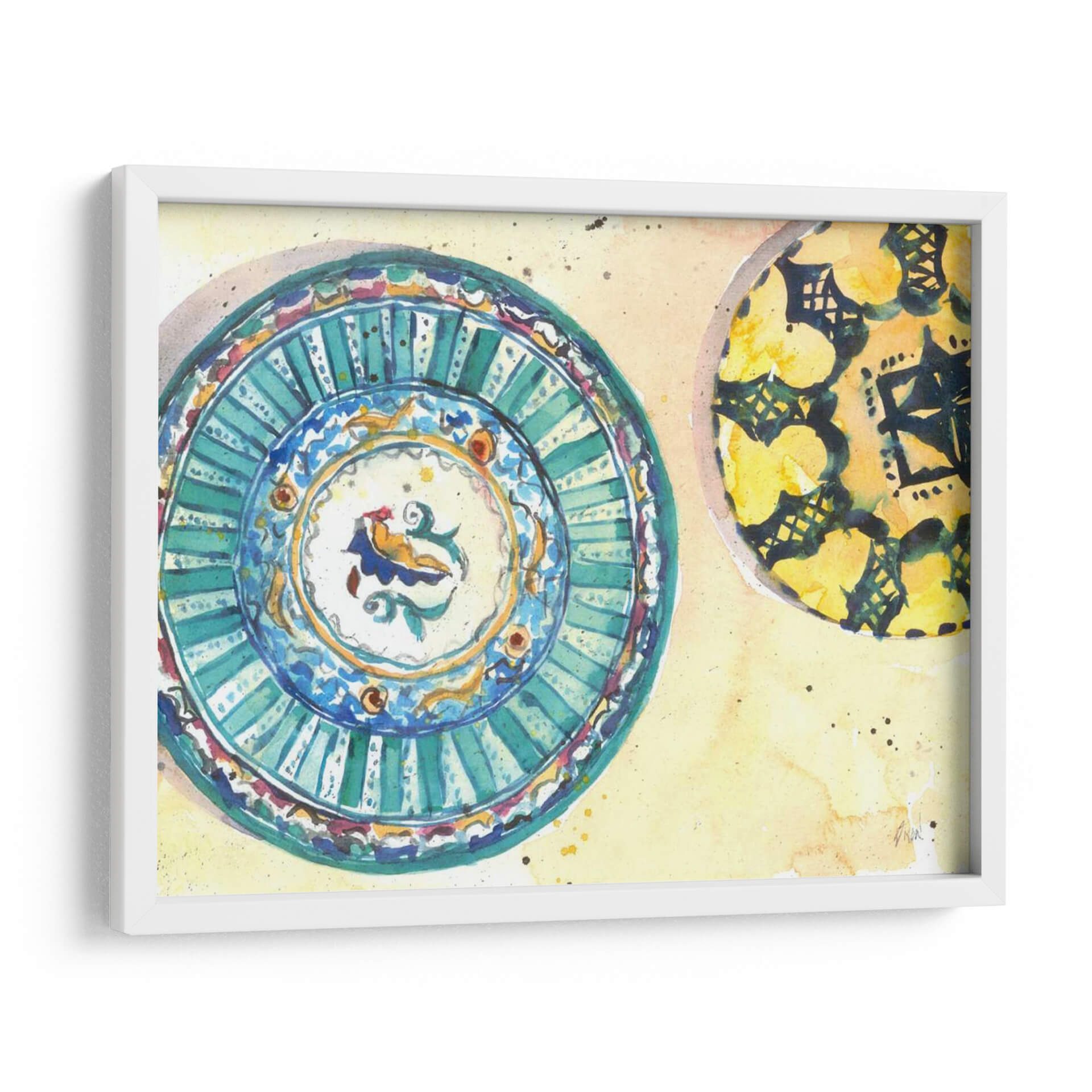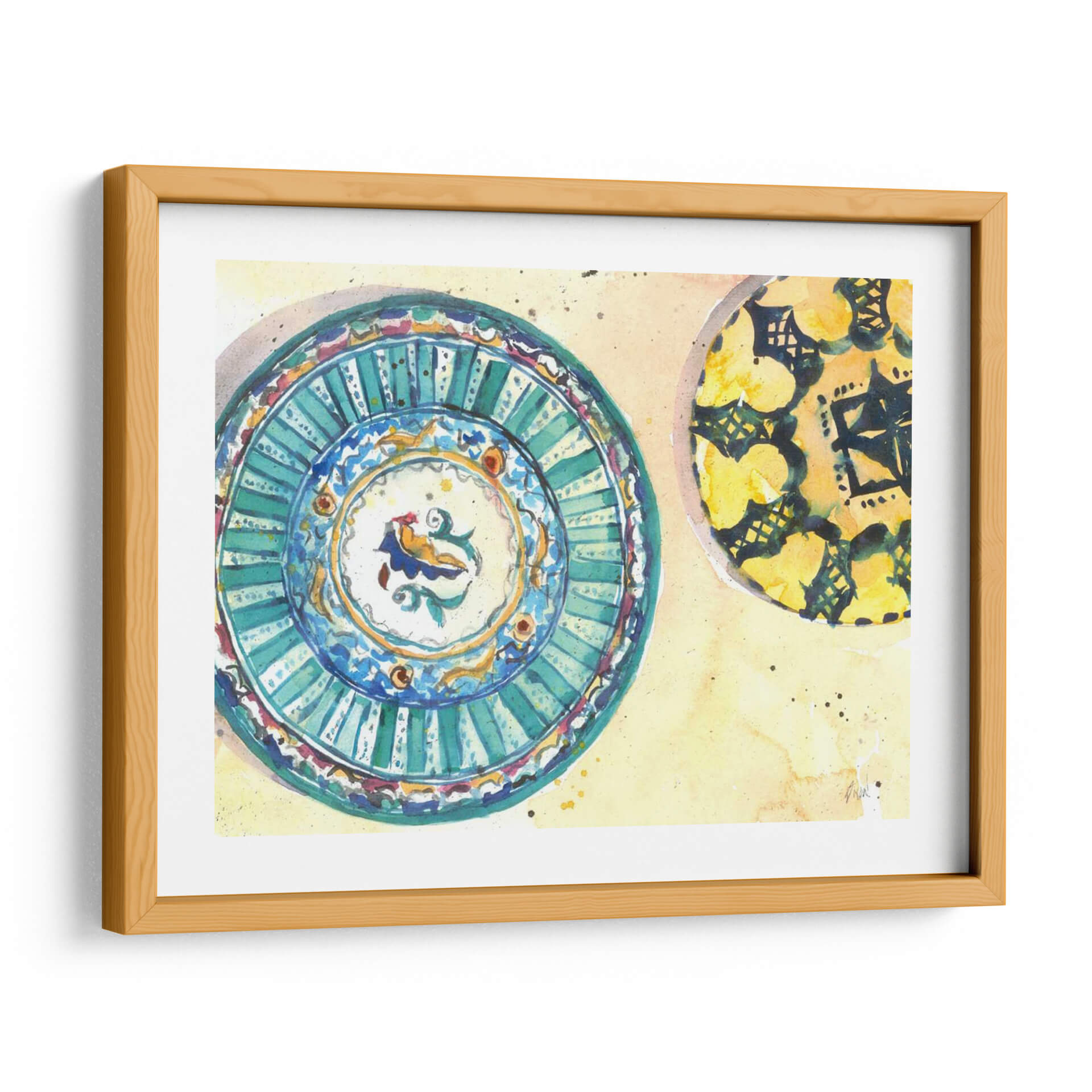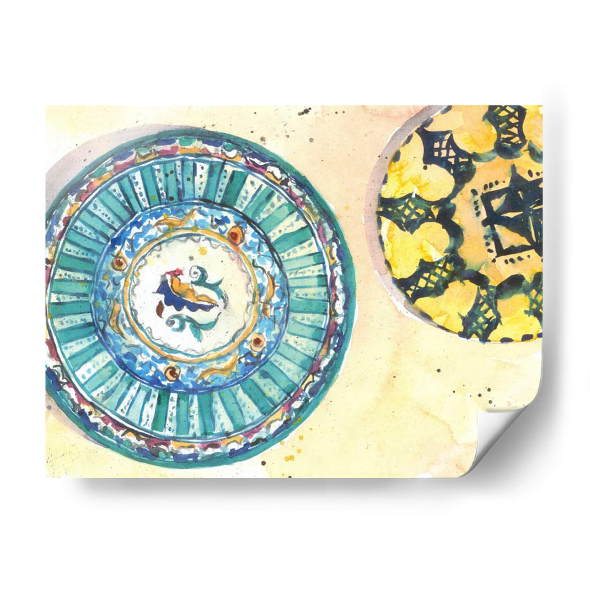 Sumérgete en la vibrante tradición artesanal con "Estudio De Placa I", una obra de arte que captura la esencia de la cerámica decorativa con una técnica de acuarela expresiva. El cuadro presenta dos platos ornamentados sobre un fondo texturizado de tonos tierra, evocando una sensación de calidez y autenticidad. El plato principal, de grandes dimensiones, despliega un intrincado diseño en tonos azules y verdes, con detalles en rojo y amarillo que aportan vitalidad. En su centro, una figura de ave o gallo estilizado irradia un encanto rústico y detallado. El segundo plato, parcialmente visible, contrasta con un patrón más geométrico y audaz en amarillo y negro, sugiriendo una rica diversidad de estilos cerámicos. La acuarela, con sus lavados suaves y salpicaduras sutiles, confiere a la pieza una ligereza etérea y un toque artístico único. Esta obra es perfecta para añadir un acento de color y un aire de sofisticación bohemia a cualquier estancia, desde una cocina acogedora hasta un salón moderno que busque un punto focal lleno de carácter y herencia cultural.
