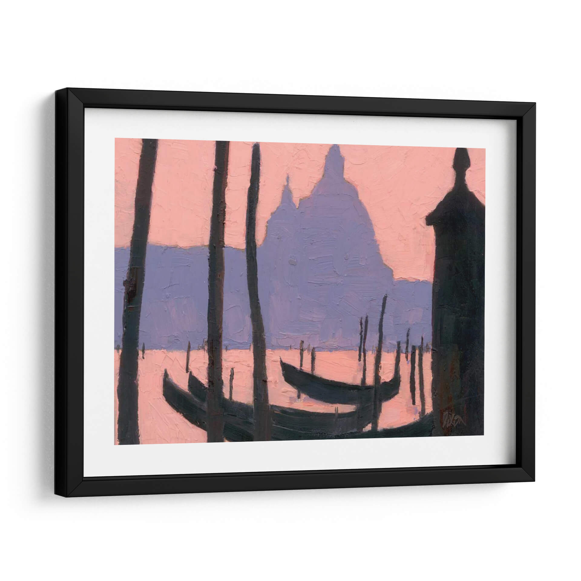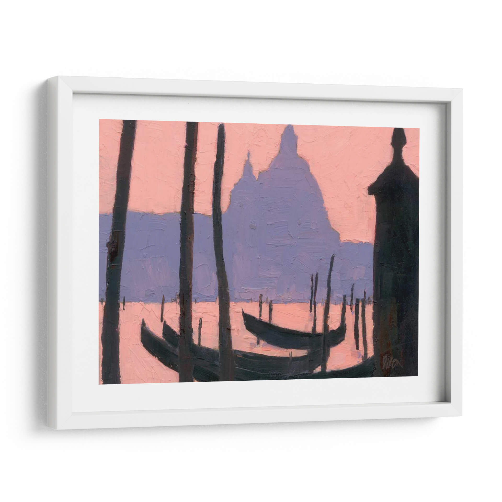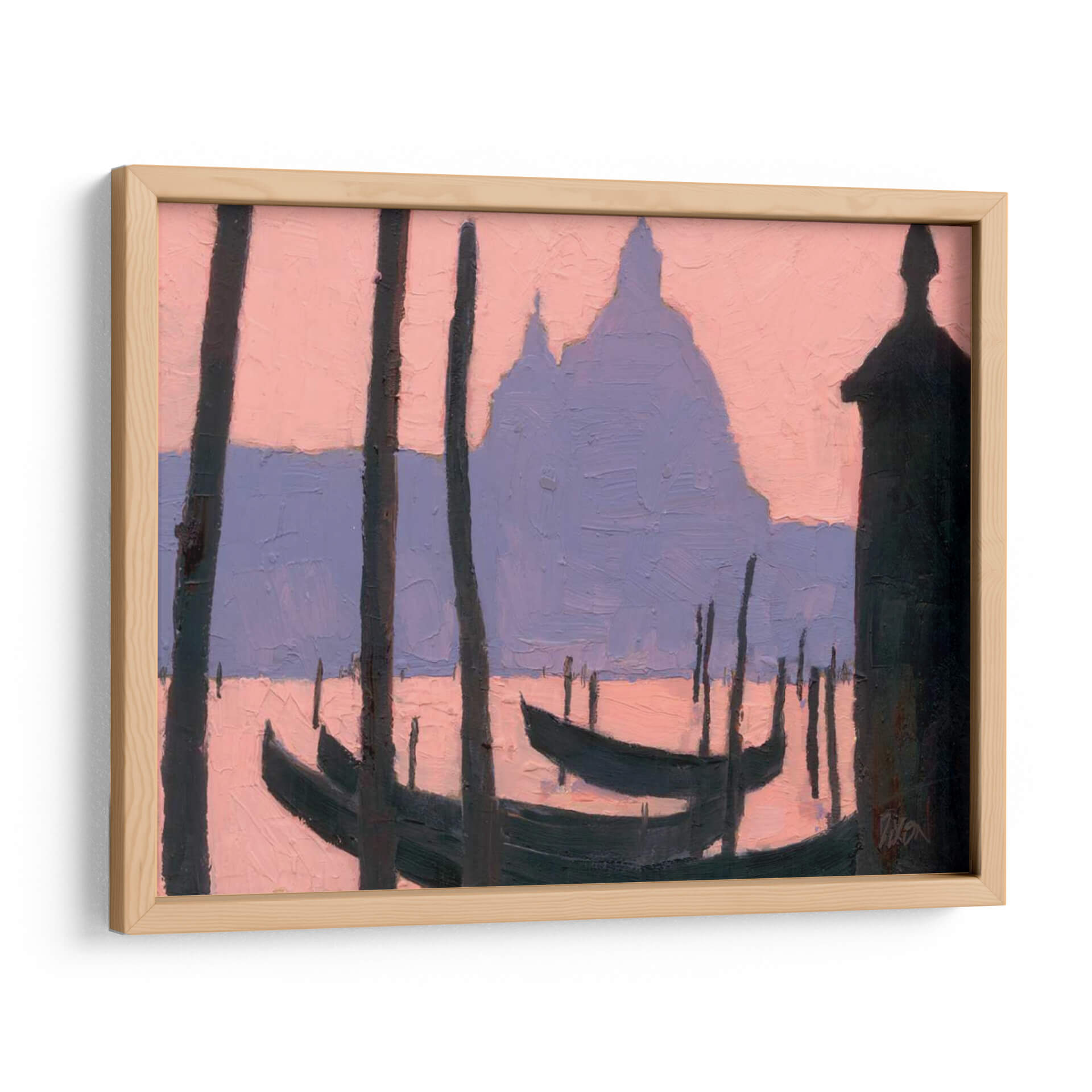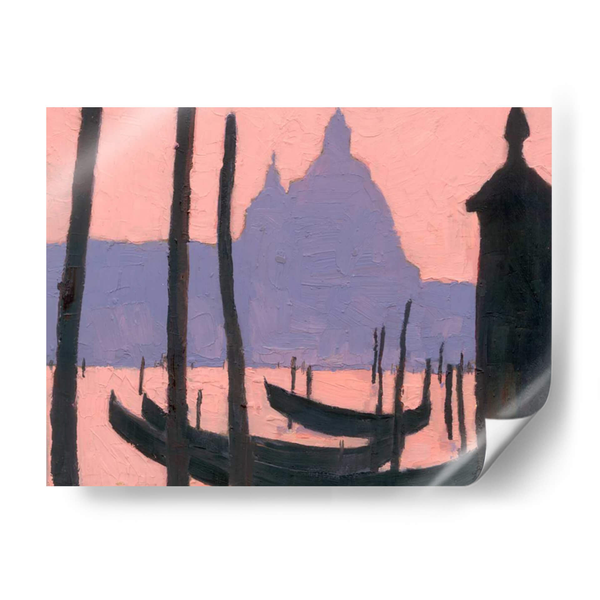 Sumérjase en la serena belleza de "Estudio De Venecia V", una obra de arte contemporáneo que captura la esencia romántica de la icónica ciudad italiana con un toque moderno. Este cuadro decorativo presenta una paleta de colores suaves y evocadores, donde los tonos rosados del amanecer o atardecer se funden con los púrpuras sutiles, creando una atmósfera de ensueño. Las siluetas oscuras de los postes y las góndolas se recortan contra el cielo etéreo y las formas arquitectónicas a lo lejos, sugiriendo la majestuosidad de Venecia sin necesidad de detalles explícitos. El estilo pictórico, con pinceladas visibles y una composición que juega con las formas abstractas, invita a la contemplación y añade profundidad a la pieza. "Estudio De Venecia V" es ideal para añadir un toque de sofisticación y calma a cualquier espacio, ya sea una sala de estar, un dormitorio o una oficina, transformando el ambiente con su elegancia discreta y su evocación de viajes y tranquilidad. Este cuadro decorativo es una invitación a soñar con los canales venecianos y a traer un pedazo de esa magia a su hogar.