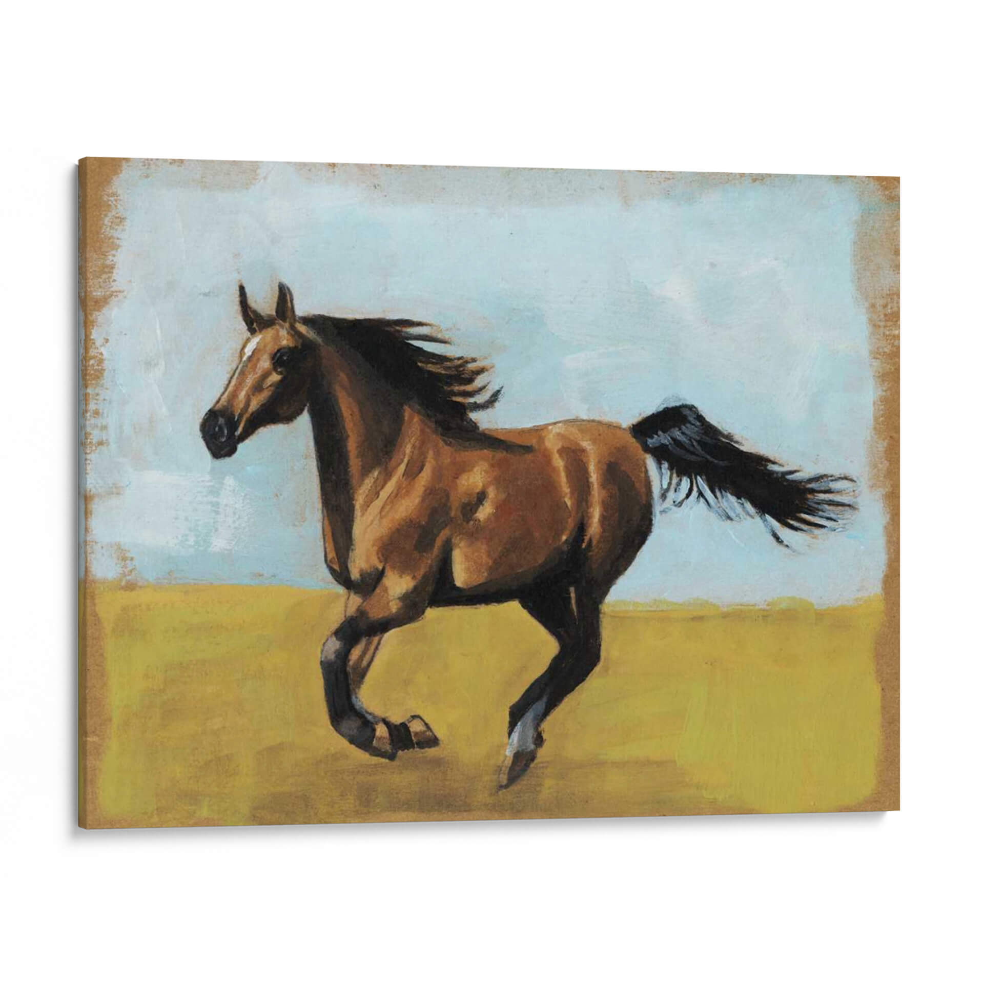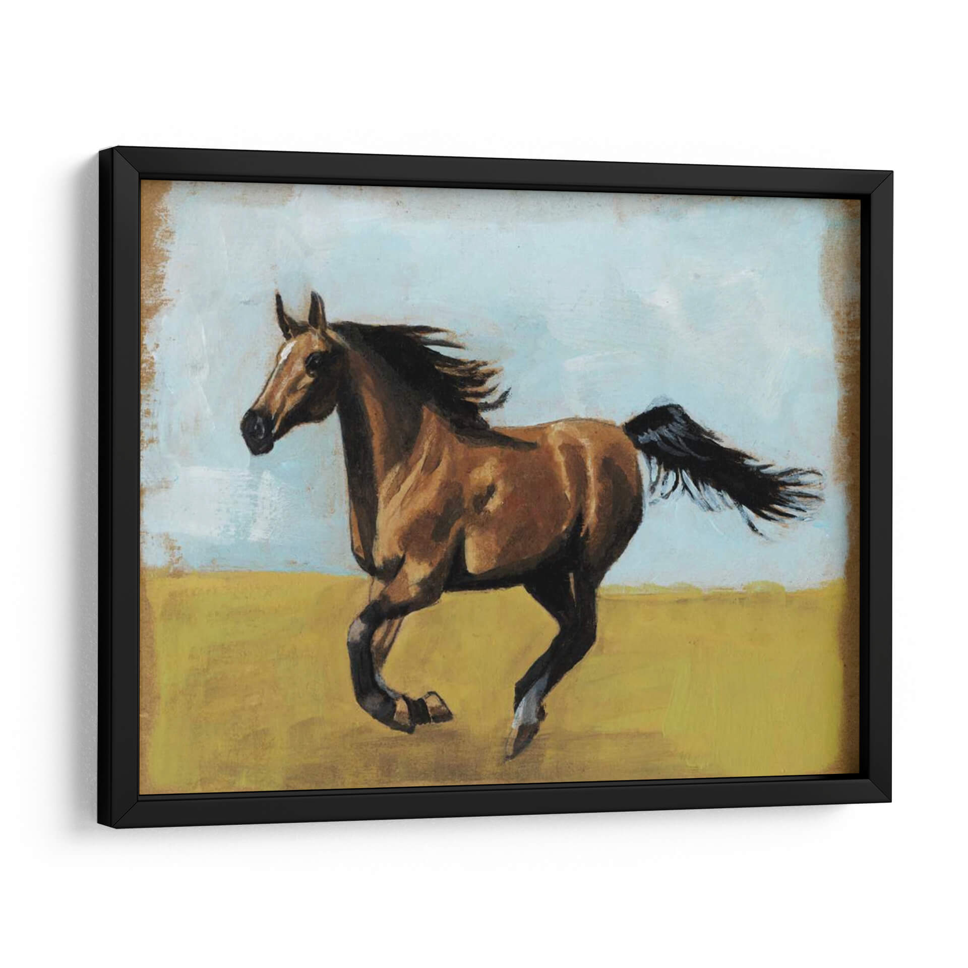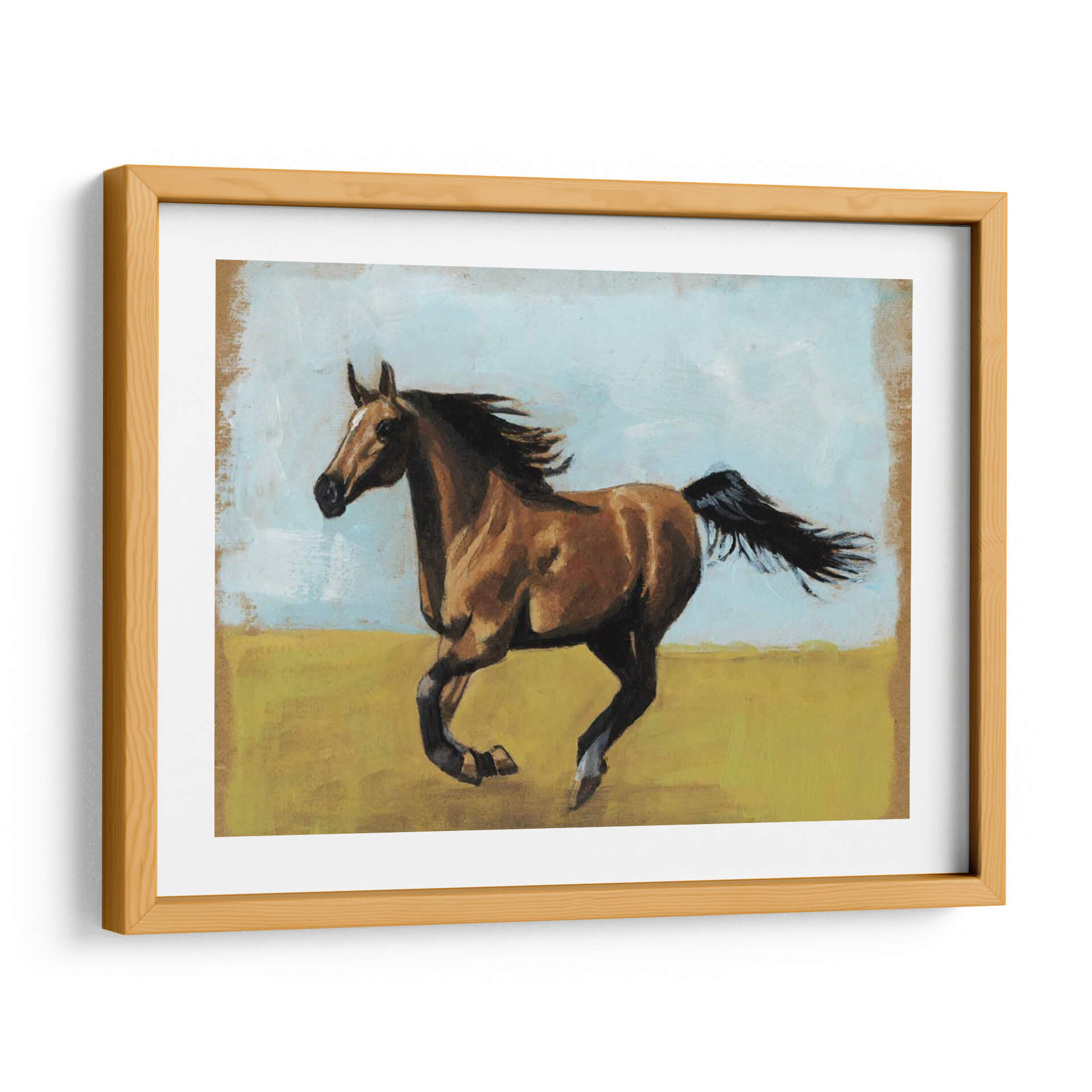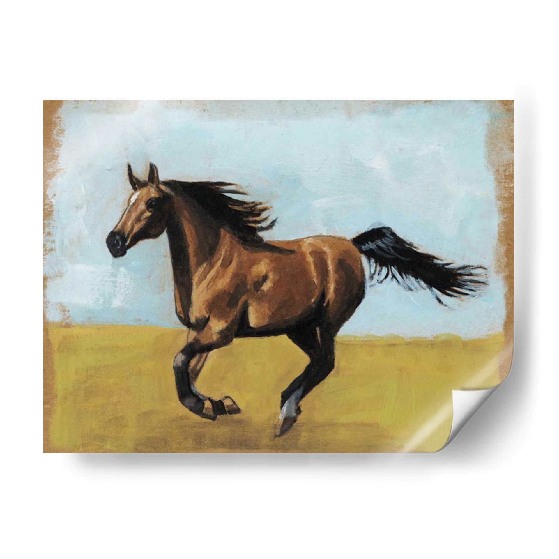 Captura la majestuosidad y la fuerza indómita de la naturaleza con "Estudios Ecuestres II" de Naomi McCavitt, un cuadro decorativo que evoca la libertad del movimiento. Esta obra maestra presenta un caballo de color marrón profundo en pleno galope, con su crin y cola ondeando al viento, transmitiendo una sensación de energía y vitalidad. El artista utiliza pinceladas audaces y texturizadas para dar vida a la figura equina, resaltando su musculatura y la gracia de su trote. La paleta de colores se centra en tonos tierra cálidos, con un contraste vibrante entre el amarillo ocre del suelo y el azul cielo suave del fondo, creando una atmósfera serena pero dinámica. Los bordes rústicos y la técnica pictórica sugieren una conexión con lo orgánico y lo auténtico. Este cuadro es ideal para añadir un toque de sofisticación y espíritu salvaje a salones modernos, estudios o incluso dormitorios, funcionando como un punto focal cautivador. "Estudios Ecuestres II" no es solo una pieza decorativa, sino una invitación a sentir la potencia y la elegancia del caballo en movimiento, resonando con quienes aprecian el arte figurativo contemporáneo y buscan infundir sus espacios con carácter y emoción. Una adición perfecta para coleccionistas de arte ecuestre o para quienes desean traer la belleza del mundo natural al interior de su hogar.